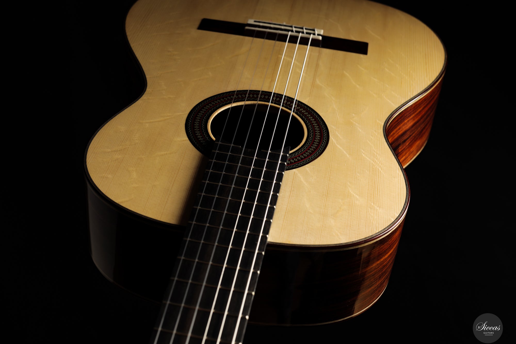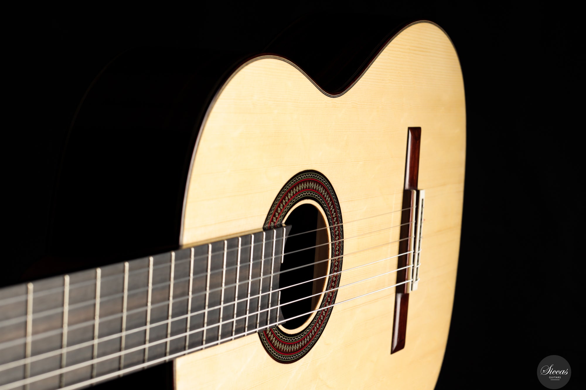 Die klassische Gitarre mit ihren weichen Nylonsaiten und ihrem charakteristischen Timbre ist zum Symbol der Kammermusik, der spanischen Tradition und des Konzertrepertoires geworden. Ihre moderne Form prägte Antonio de Torres im 19. Jahrhundert, indem er den Standard für Korpus, Fächerbeleistung und die 65-Zentimeter-Mensur setzte, die bis heute verwendet werden. Instrumente dieser Kategorie eröffnen eine reiche Palette von den feinen romantischen Miniaturen Tárregas bis zu den majestätischen Konzerten Rodrigos. Hier finden Sie Gitarren, die historische Kontinuität bewahren und zugleich zu neuen Interpretationen anregen.