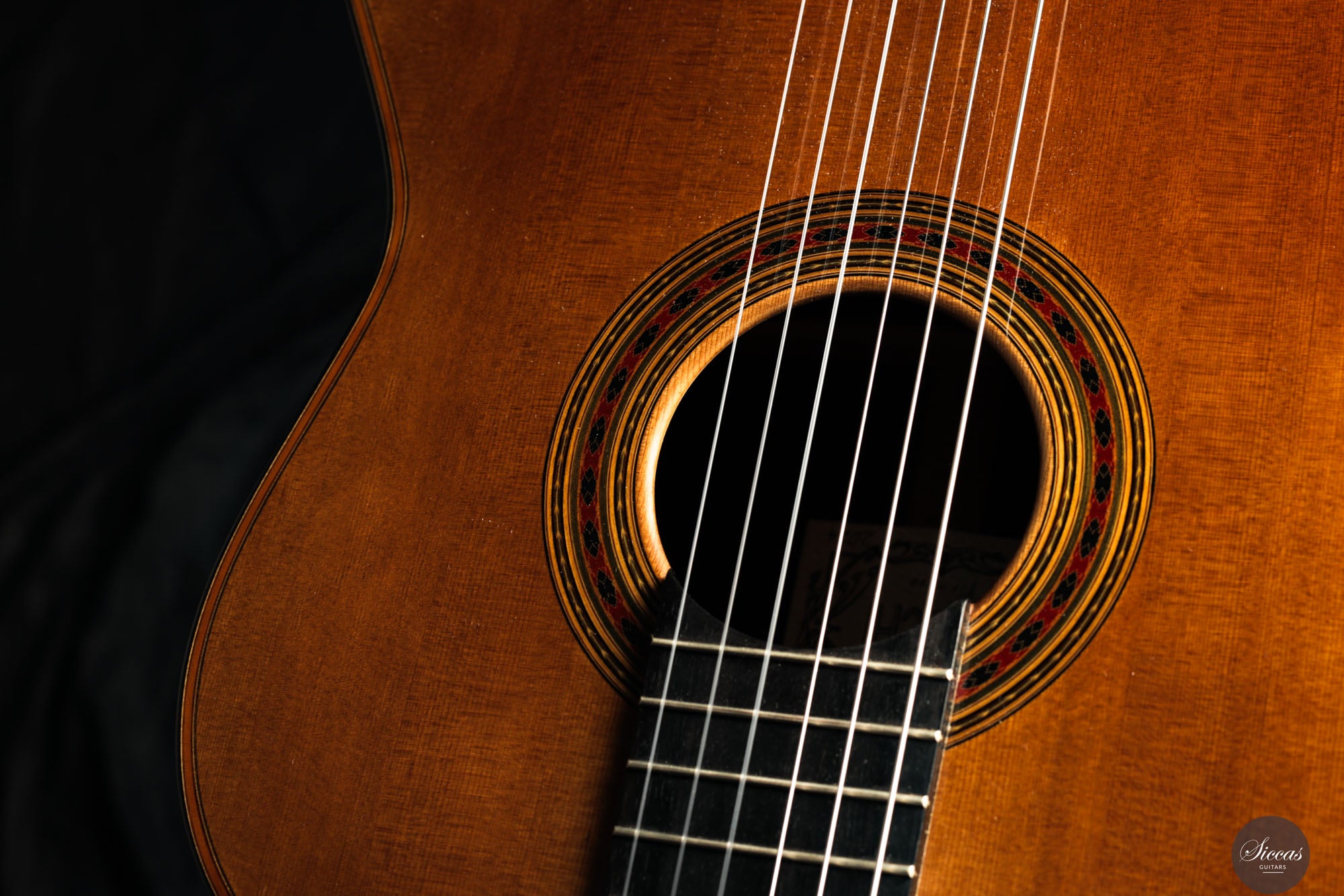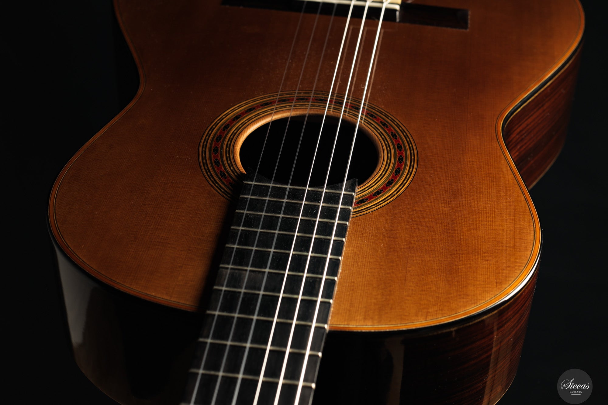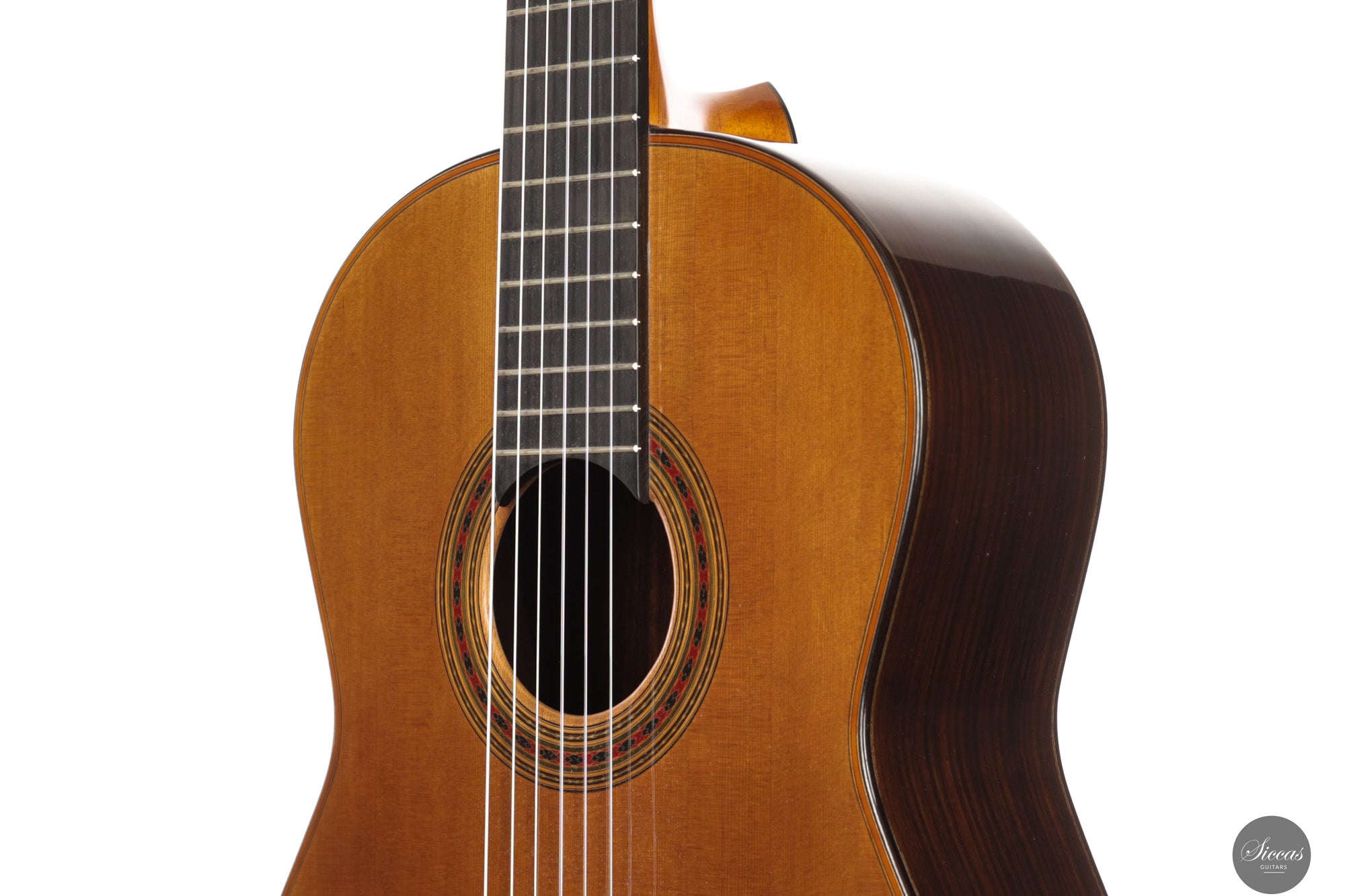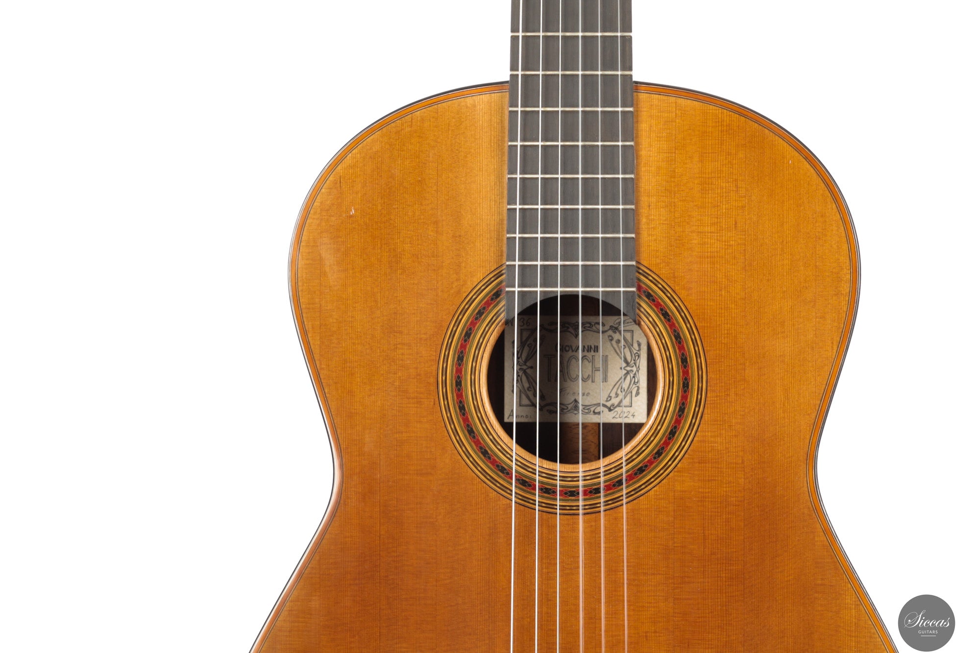 Die 2024 gebaute „Daniel Friederich“ No. 36 ist Ausdruck von Giovanni Tacchis tiefem Verständnis für Friederichs Klangästhetik und seiner Fähigkeit, diese auf eigenständige Weise weiterzuentwickeln. Das Instrument ist traditionell gebaut, mit Zederndecke und Boden sowie Zargen aus indischem Palisander. Die Mensur beträgt 650 mm, der Sattel misst 51,5 mm. Die Oberfläche ist klassisch mit Schellack poliert.