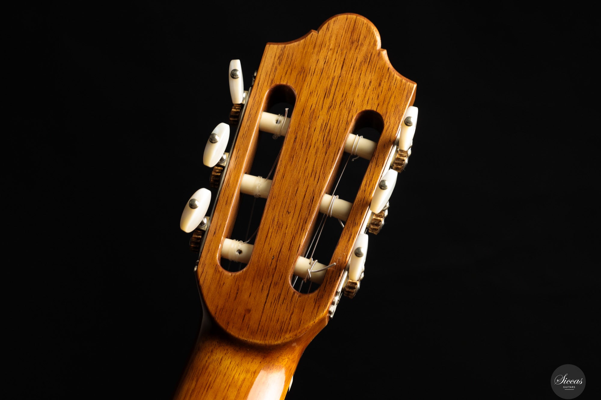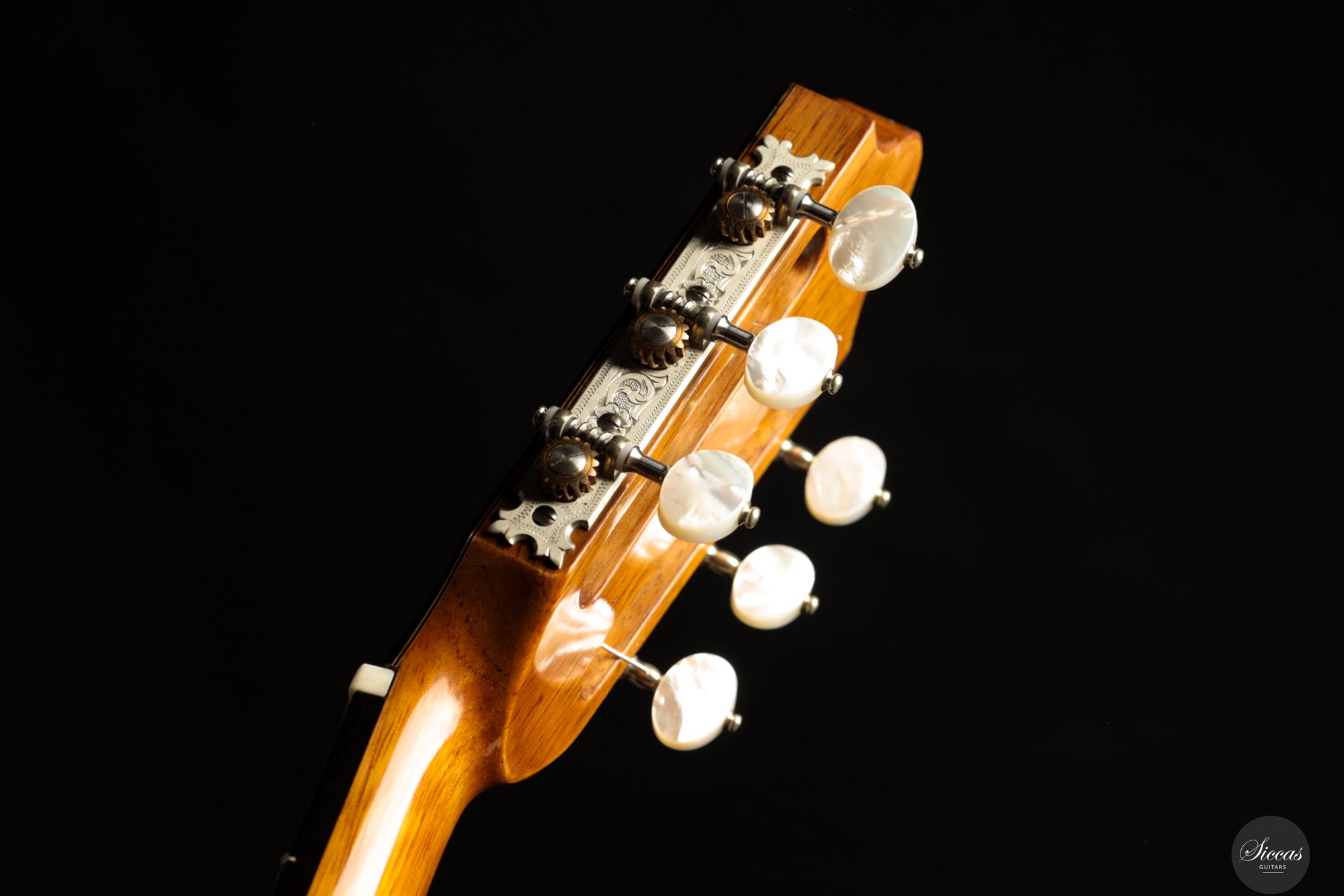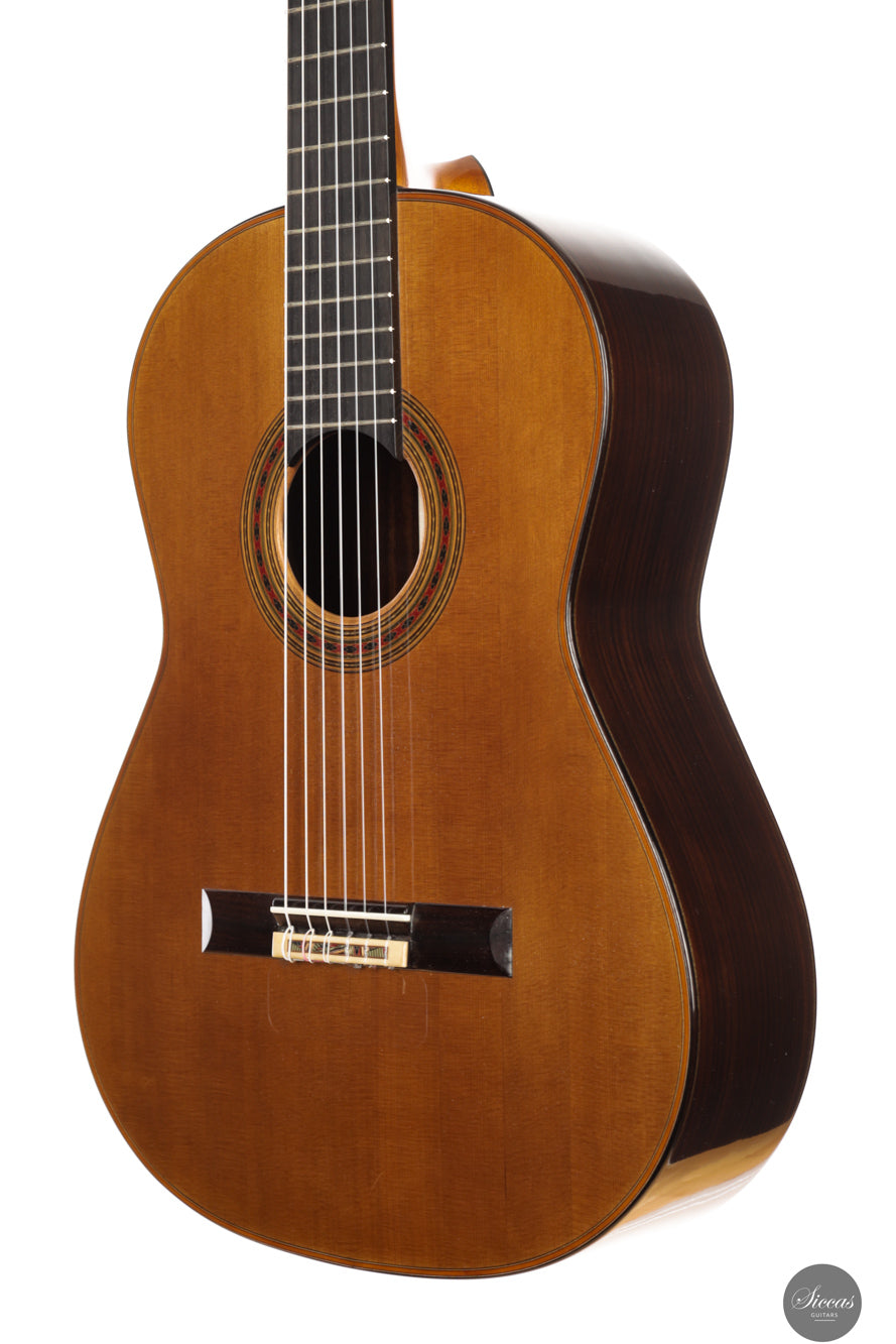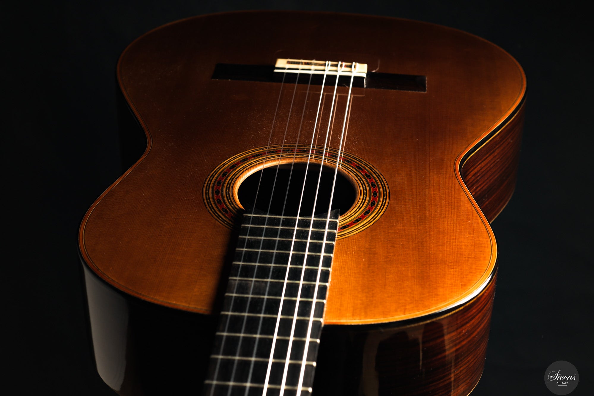 Von der kunstvoll geschnitzten Kopfplatte bis zur feinen Rosette und der sorgfältig ausgeführten Intarsienarbeit am Steg zeugt dieses Instrument von höchstem handwerklichem Niveau. Es verbindet visuelle Eleganz mit einer ausgereiften, tragfähigen Klangarchitektur – eine moderne Konzertgitarre mit klanglicher Tiefe und großer Spielkultur.