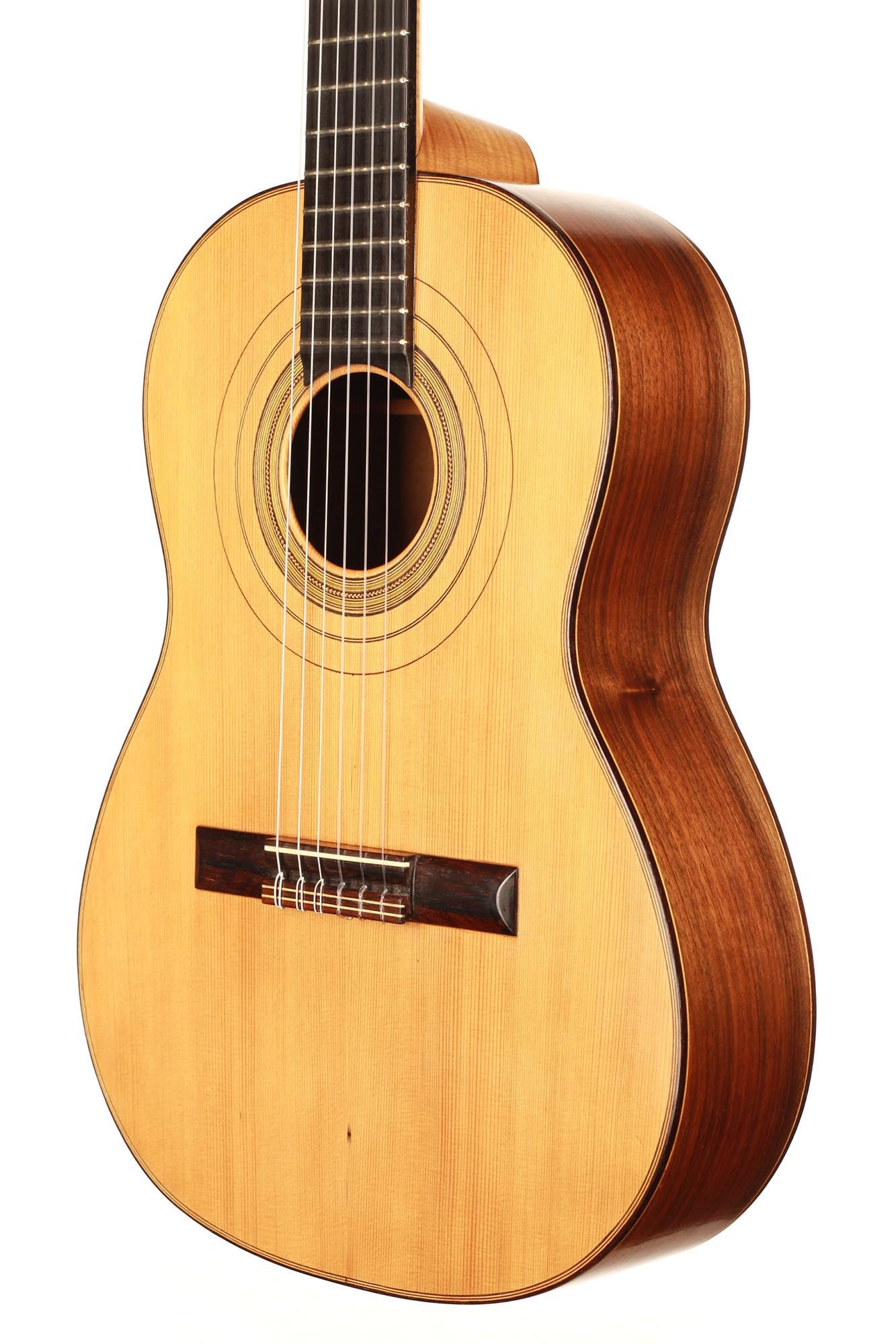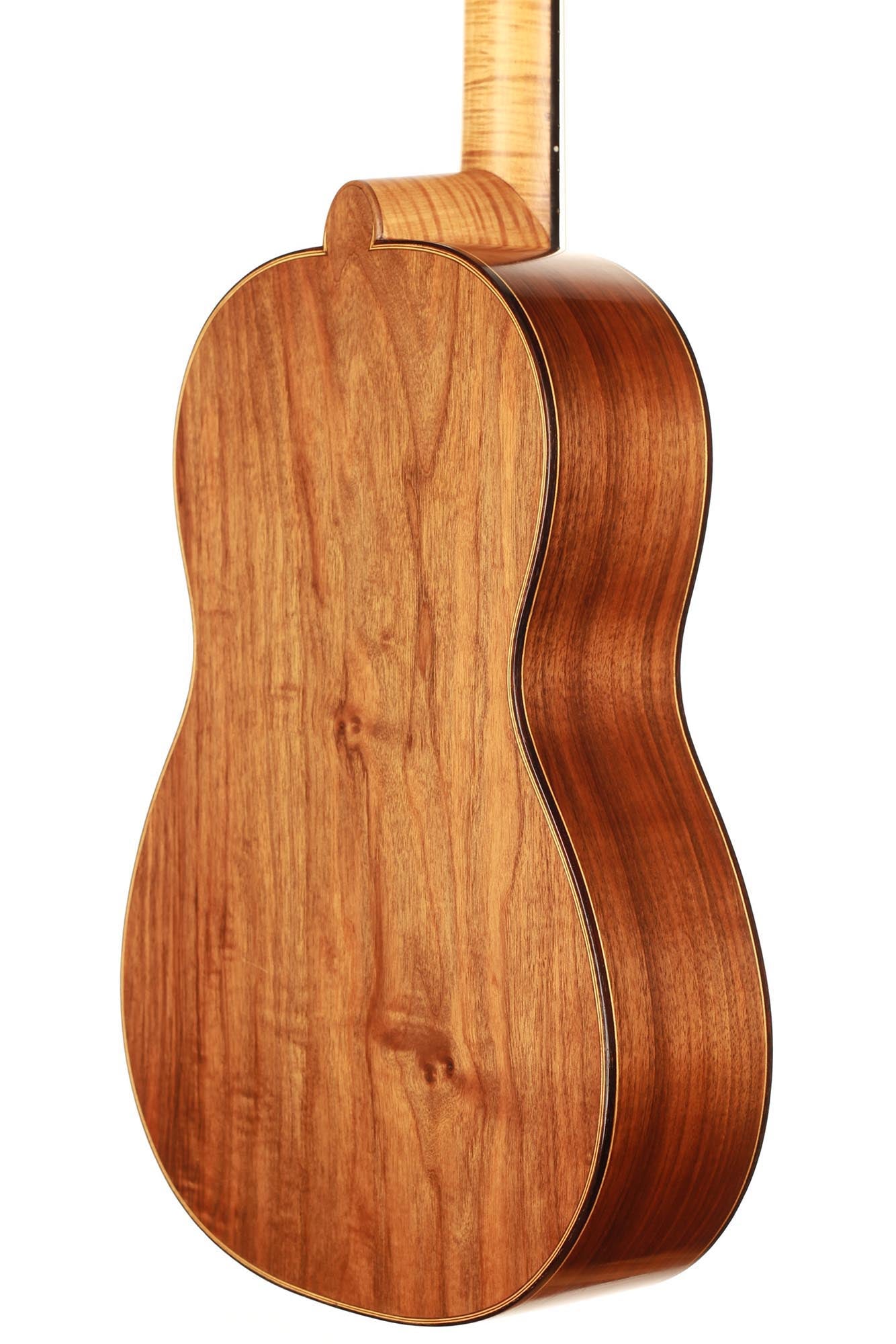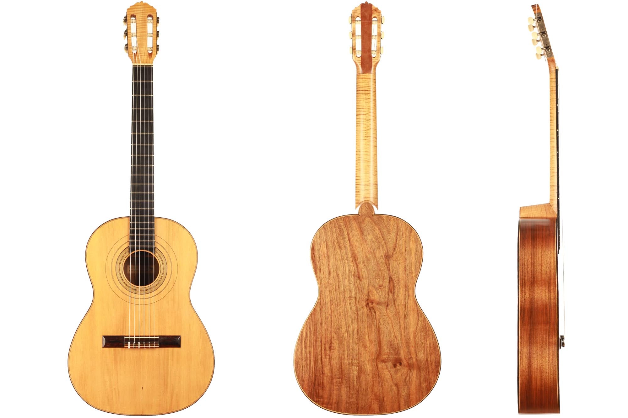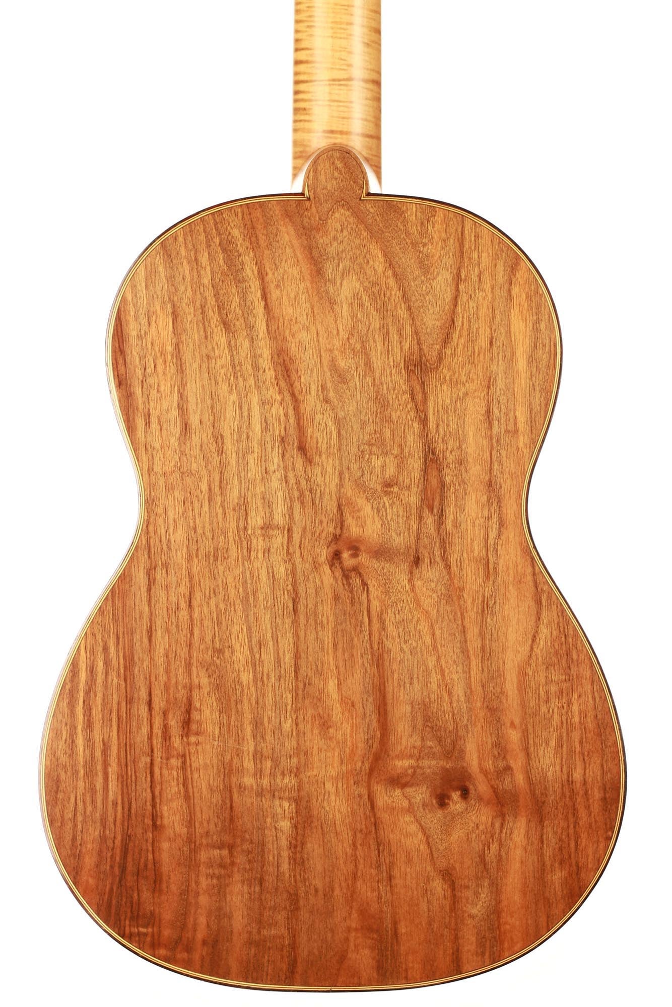 Dieses schöne Instrument aus dem Jahr 1954 ist in einem sehr guten Zustand ohne Risse und Reparaturen. Die für diese Gitarre gewählten Hölzer sind sehr interessant: Der einteilige Nussbaumboden und der Ahornhals waren zu dieser Zeit zwei seltene Merkmale. Außerdem erinnert uns der Ahornhals natürlich an Lecchis Geigenbauausbildung.