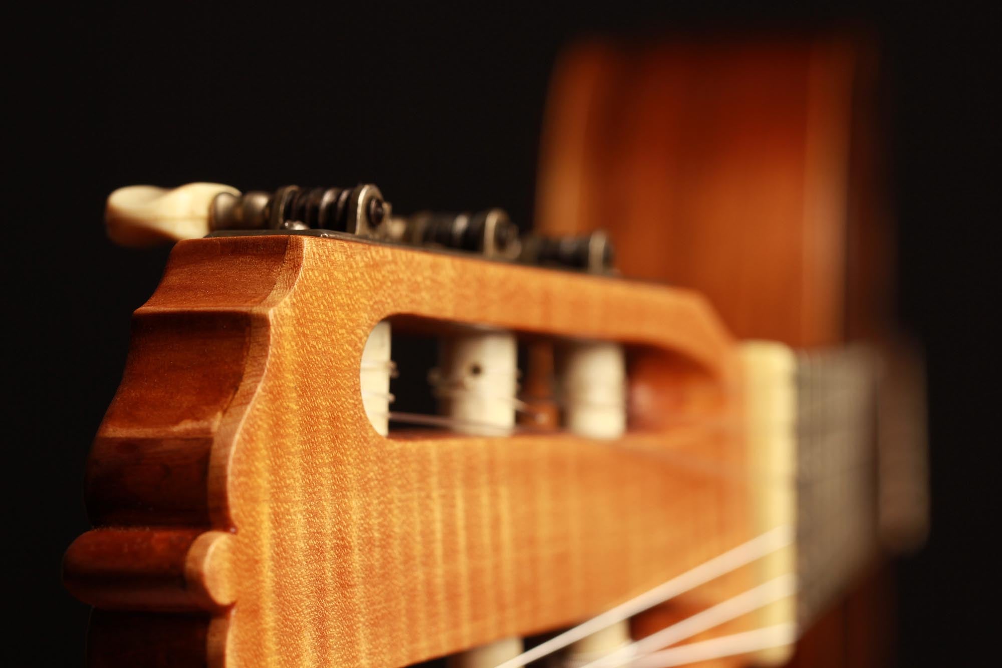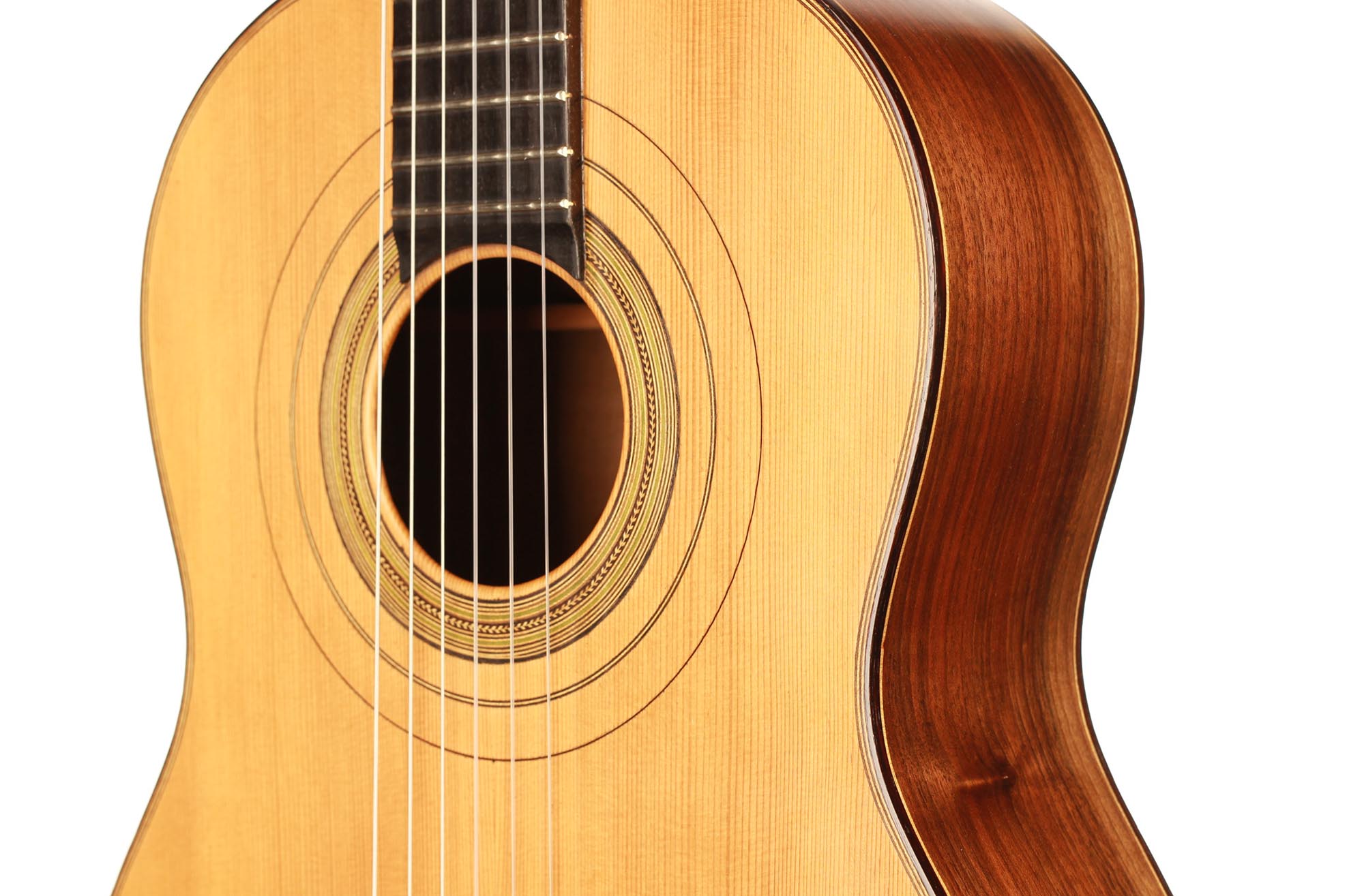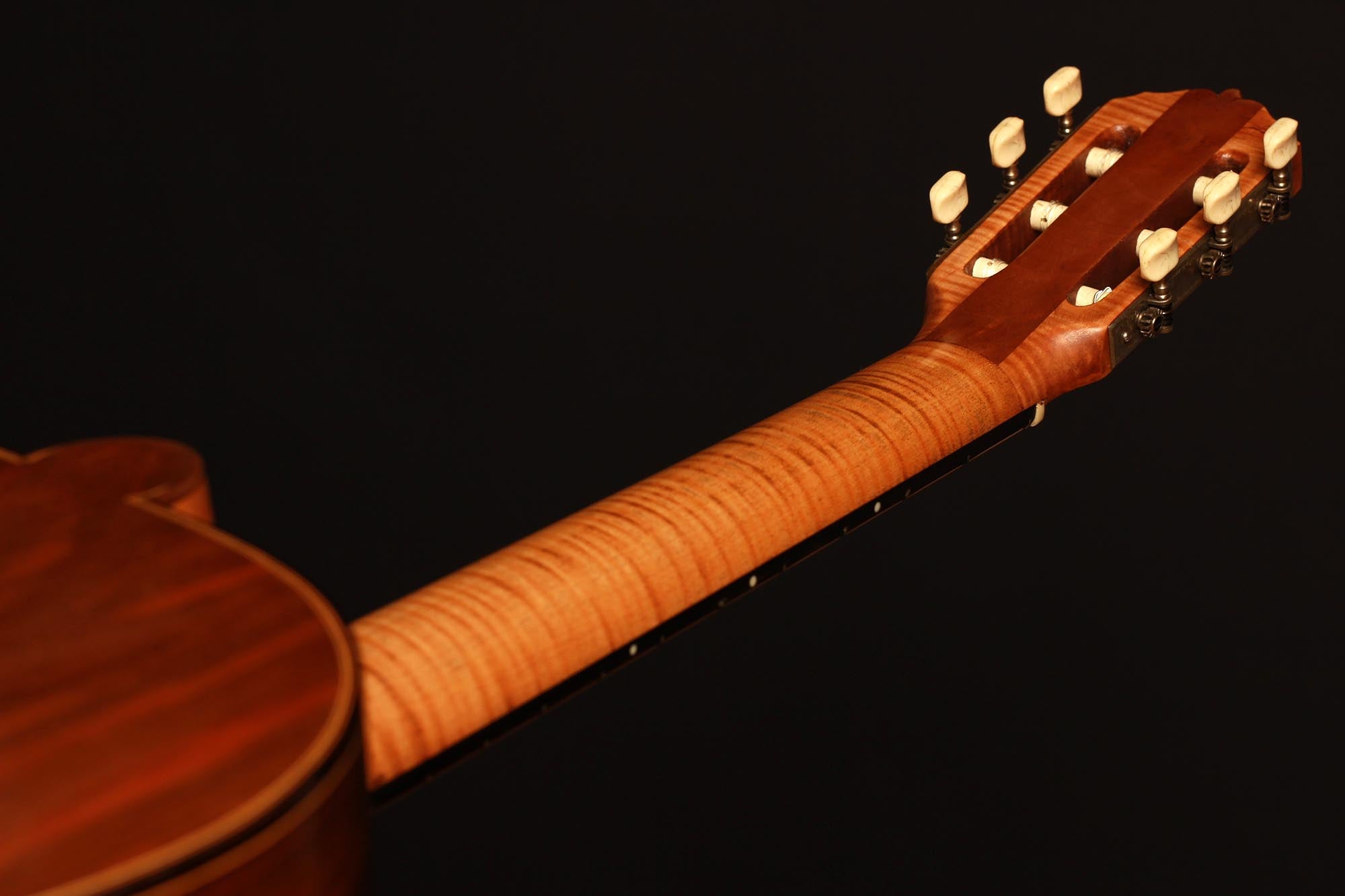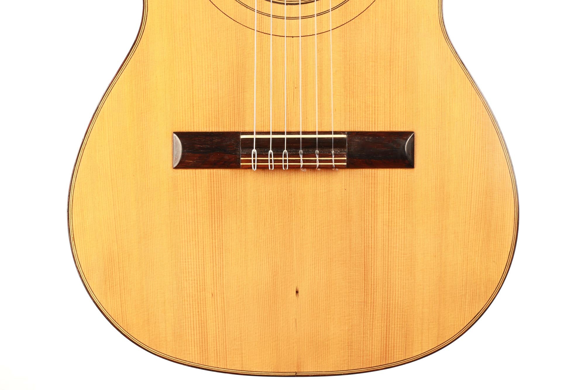 Dieses schöne Instrument aus dem Jahr 1954 ist in einem sehr guten Zustand ohne Risse und Reparaturen. Die für diese Gitarre gewählten Hölzer sind sehr interessant: Der einteilige Nussbaumboden und der Ahornhals waren zu dieser Zeit zwei seltene Merkmale. Außerdem erinnert uns der Ahornhals natürlich an Lecchis Geigenbauausbildung.