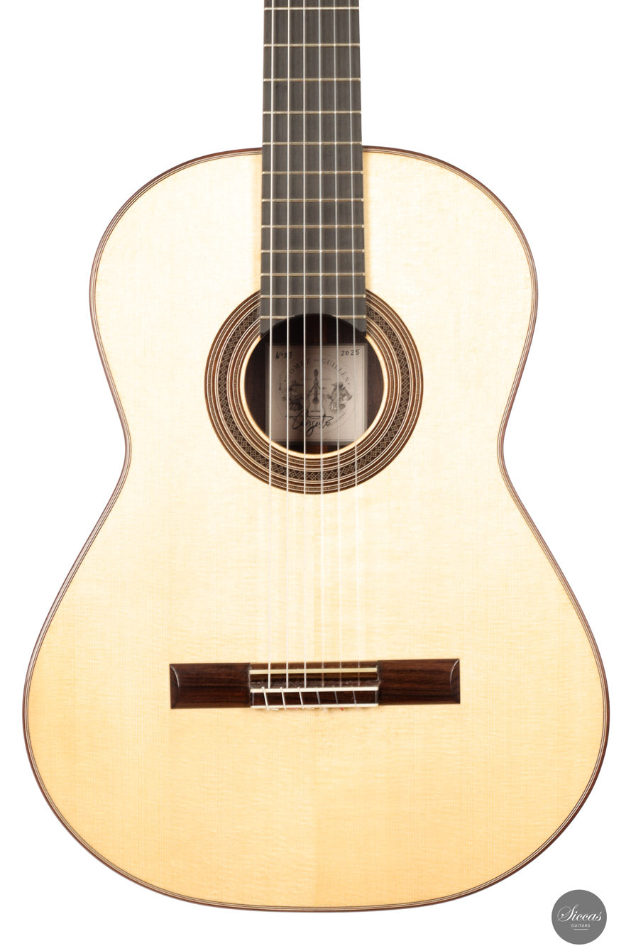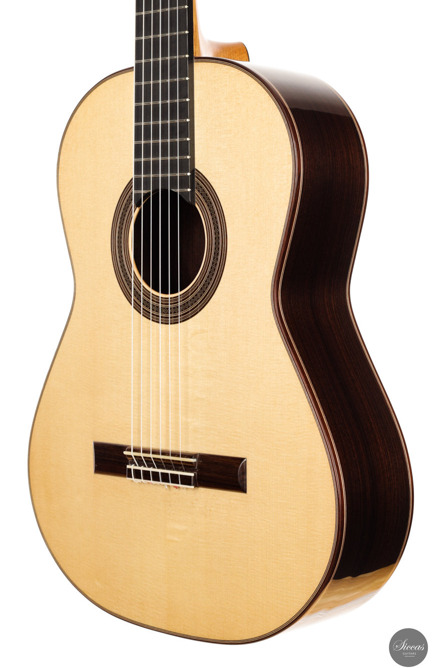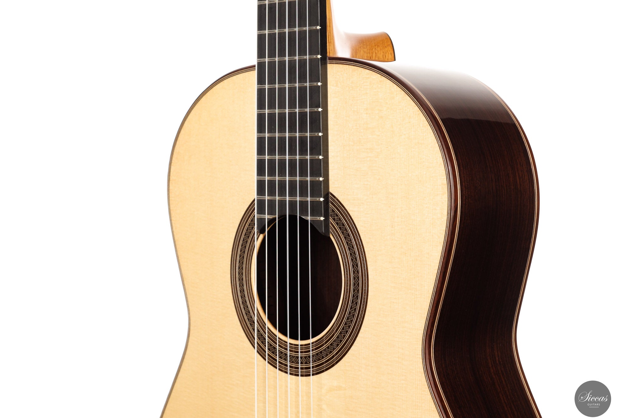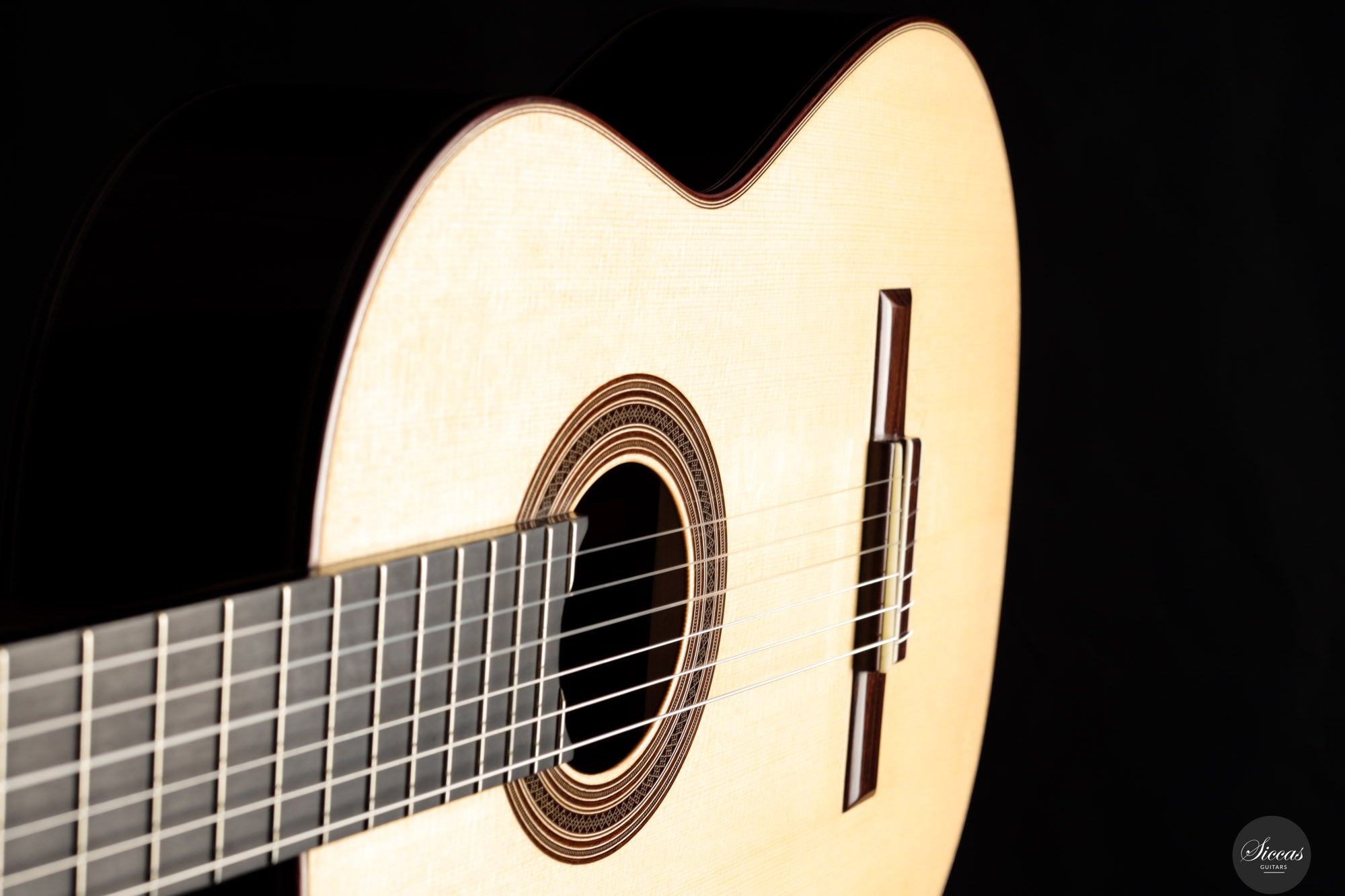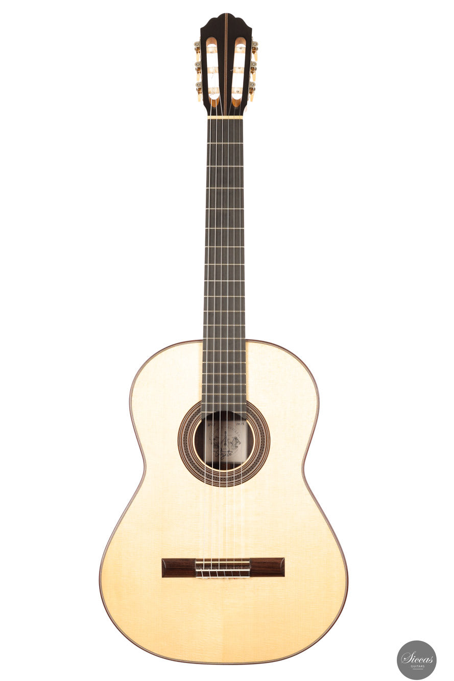 This traditionally built guitar with a spruce top is an amazing instrument that carries the Spanish tradition at its finest level. It is remarkably responsive, offering crystal-clear yet sweet trebles, paired with warm and mature basses. It is an easy-to-play instrument suitable for both professional guitarists and avid enthusiasts. The sense of responsiveness that this guitar provides, along with its sonorous tones, is truly inspiring for the guitarist and allows for fantastic dynamic expression.