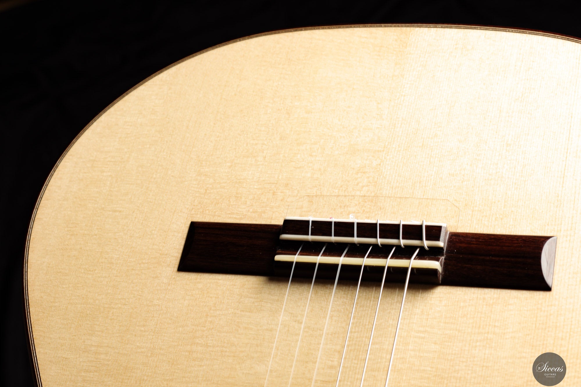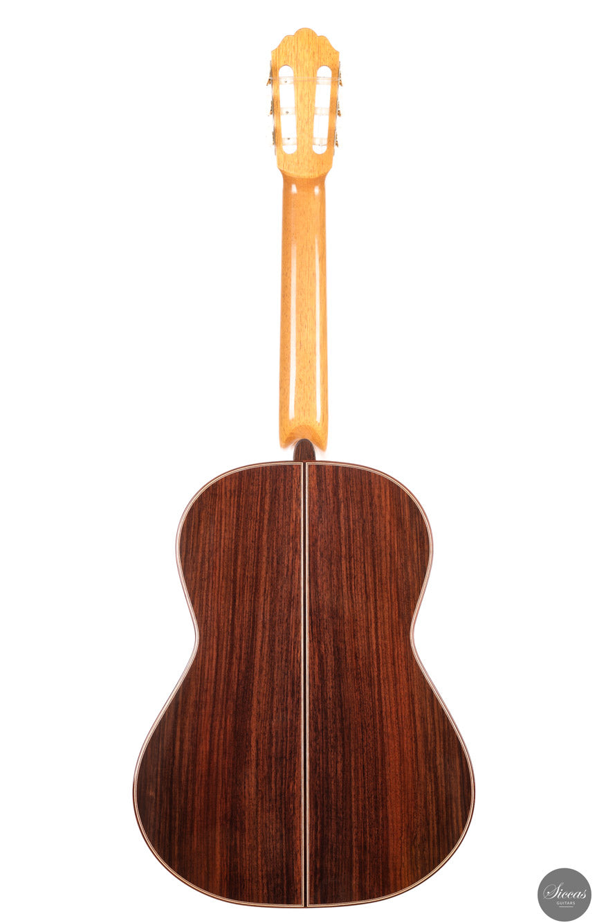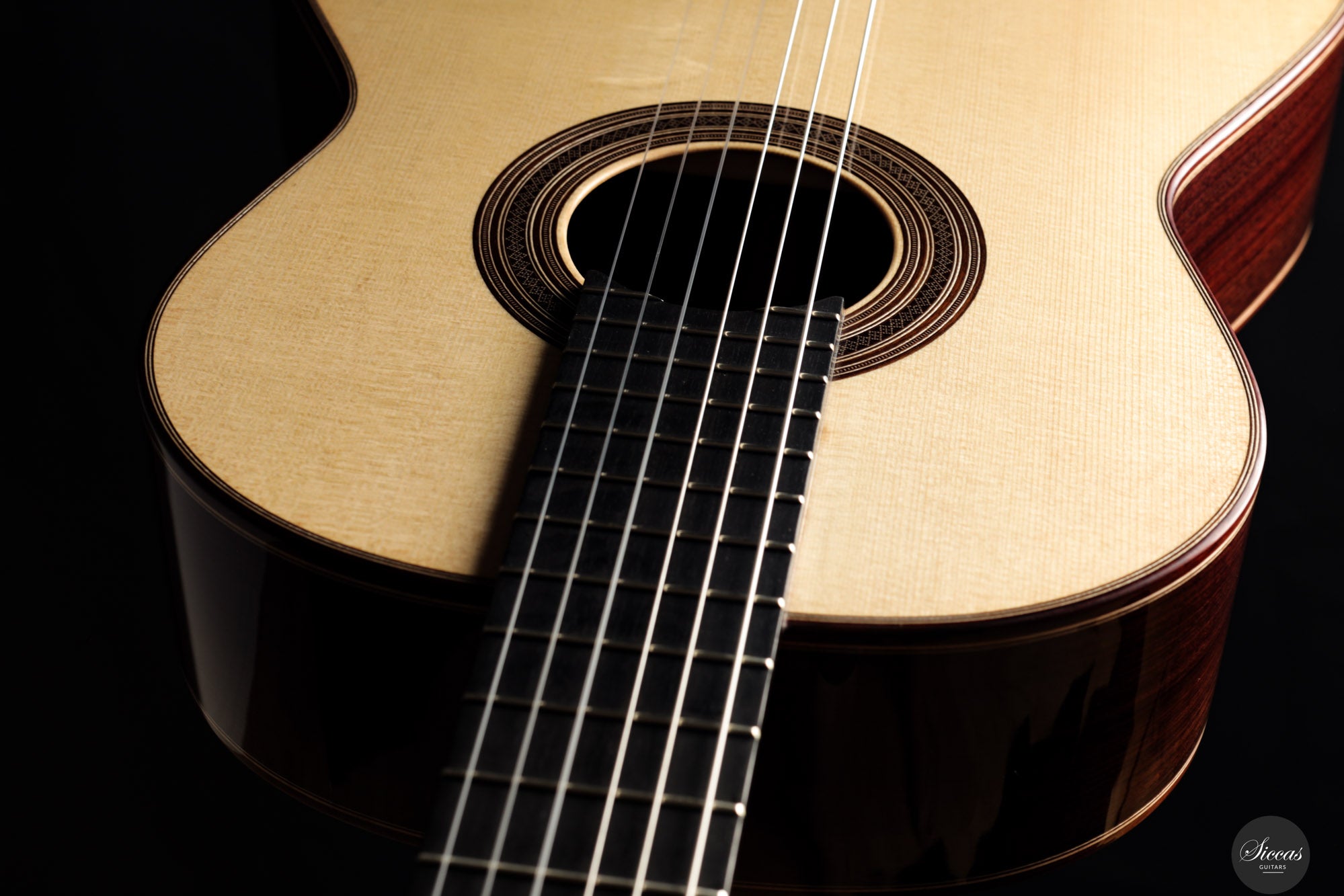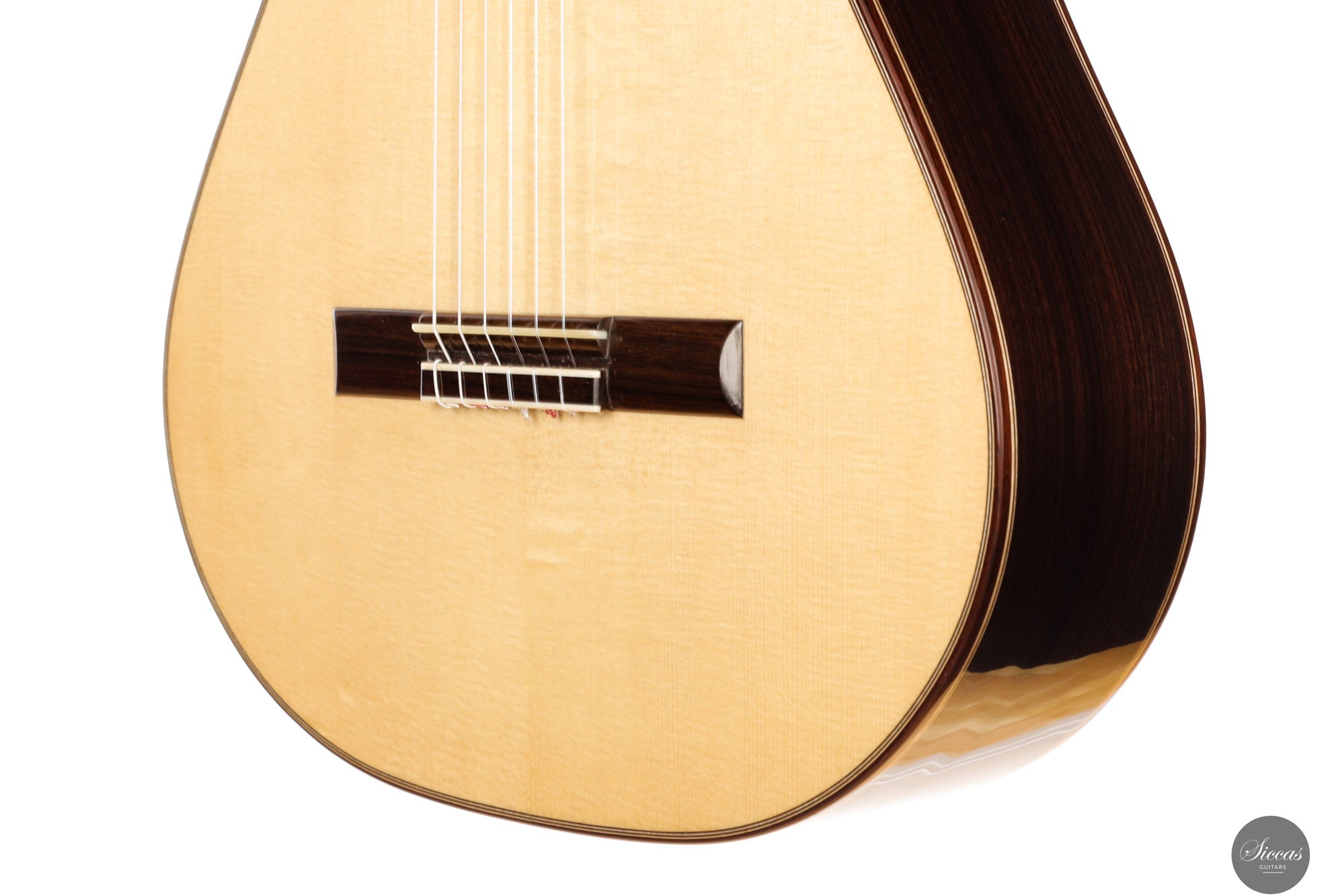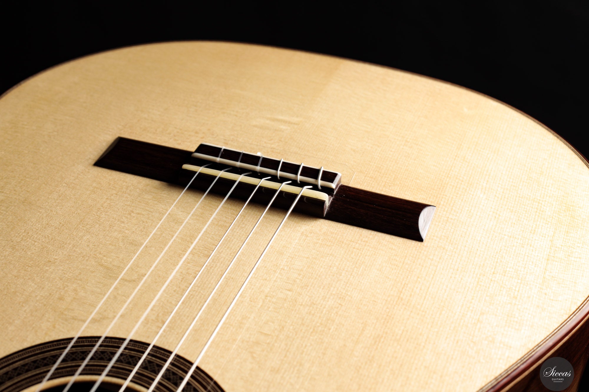 This traditionally built guitar with a spruce top is an amazing instrument that carries the Spanish tradition at its finest level. It is remarkably responsive, offering crystal-clear yet sweet trebles, paired with warm and mature basses. It is an easy-to-play instrument suitable for both professional guitarists and avid enthusiasts. The sense of responsiveness that this guitar provides, along with its sonorous tones, is truly inspiring for the guitarist and allows for fantastic dynamic expression.
