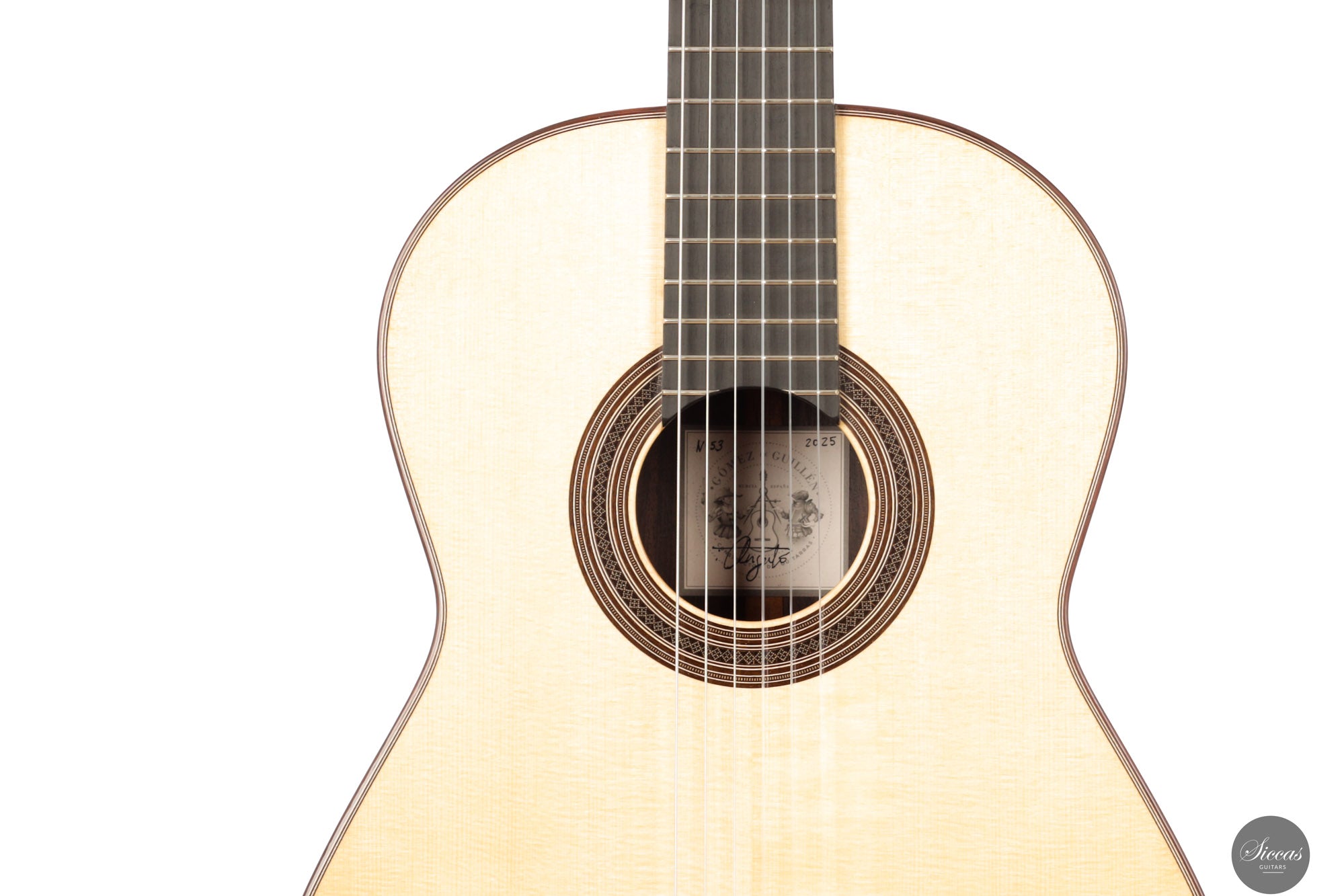 Die Gitarre von Ángel Gómez de Guillén mit Fichtendecke verkörpert die spanische Gitarrenbautradition in reiner Form und bietet ein ausgewogenes Klangbild von großer Klarheit und Tiefe. Kristallklare, süß klingende Höhen verbinden sich mit warmen, reifen Bässen zu einem harmonischen Gesamtklang, der sich durch schnelle Ansprache und bemerkenswertes Volumen auszeichnet. Ihre leichte Spielbarkeit macht sie gleichermaßen attraktiv für professionelle Musiker wie für ambitionierte Liebhaber. Mit ihrer inspirierenden Dynamik und feinen Ausdrucksmöglichkeiten ist sie ein vielseitiges Konzertinstrument, das die Kunst des traditionellen spanischen Gitarrenbaus eindrucksvoll widerspiegelt.