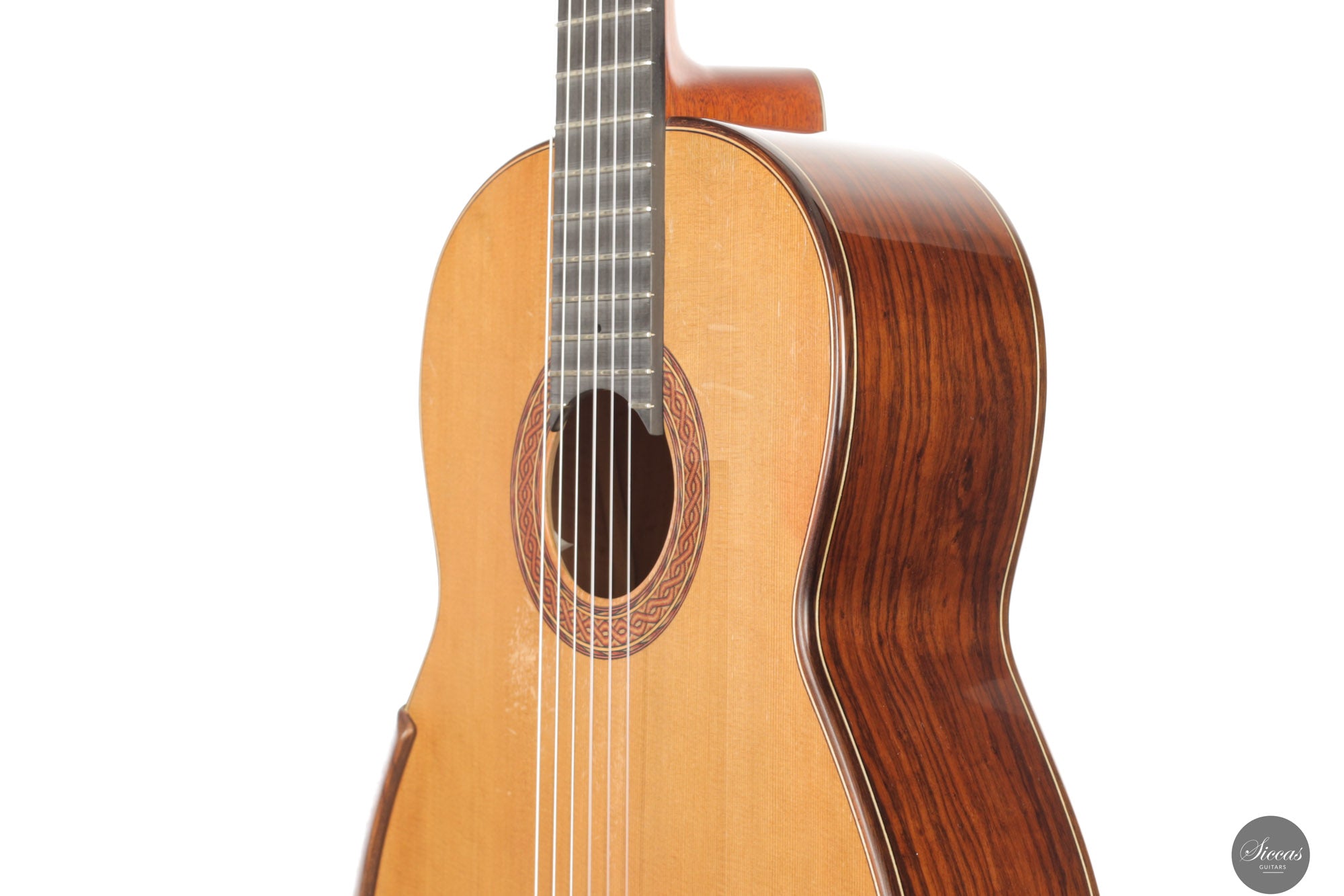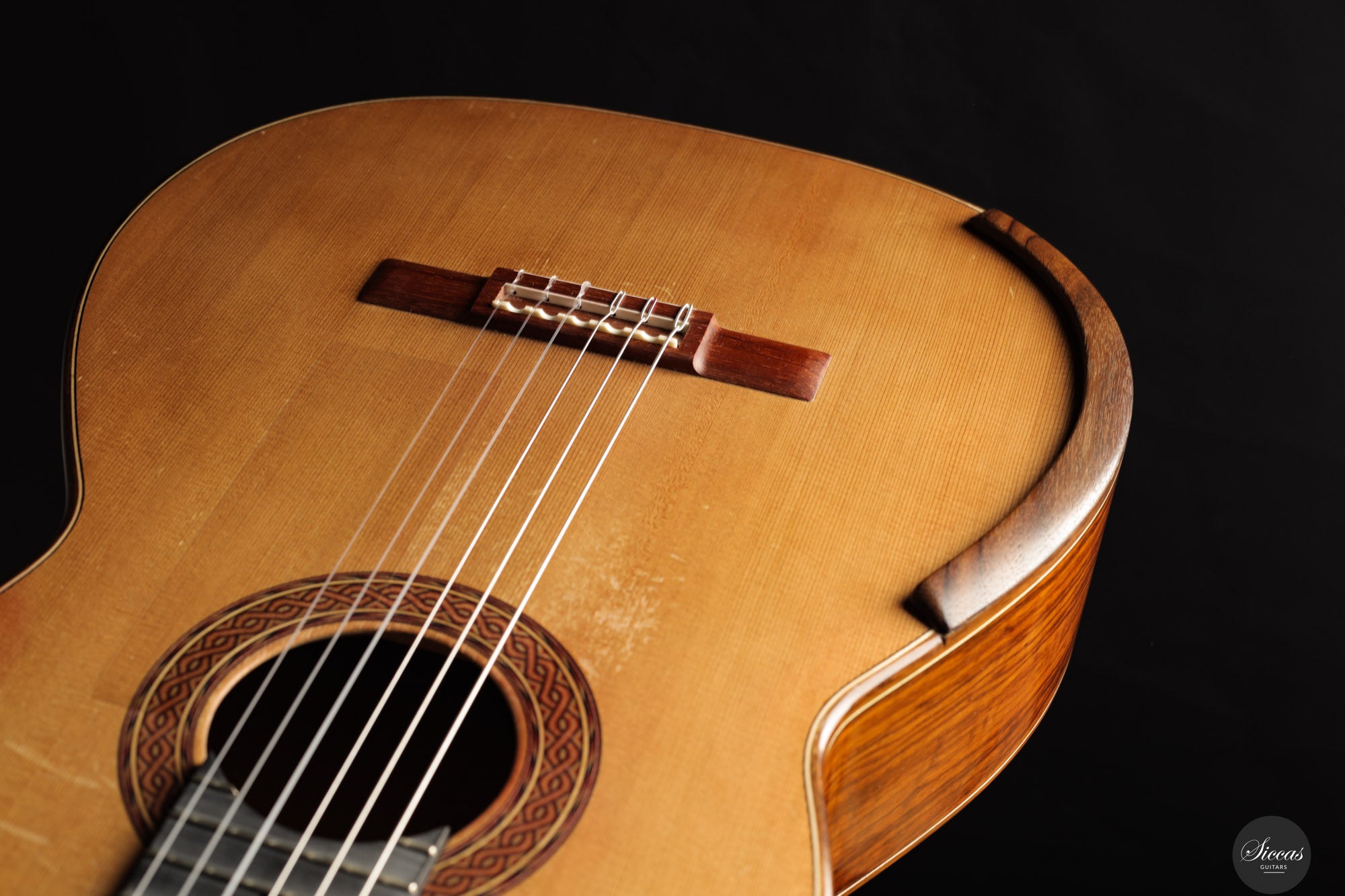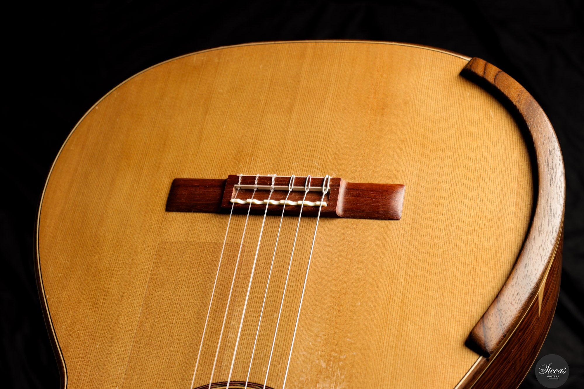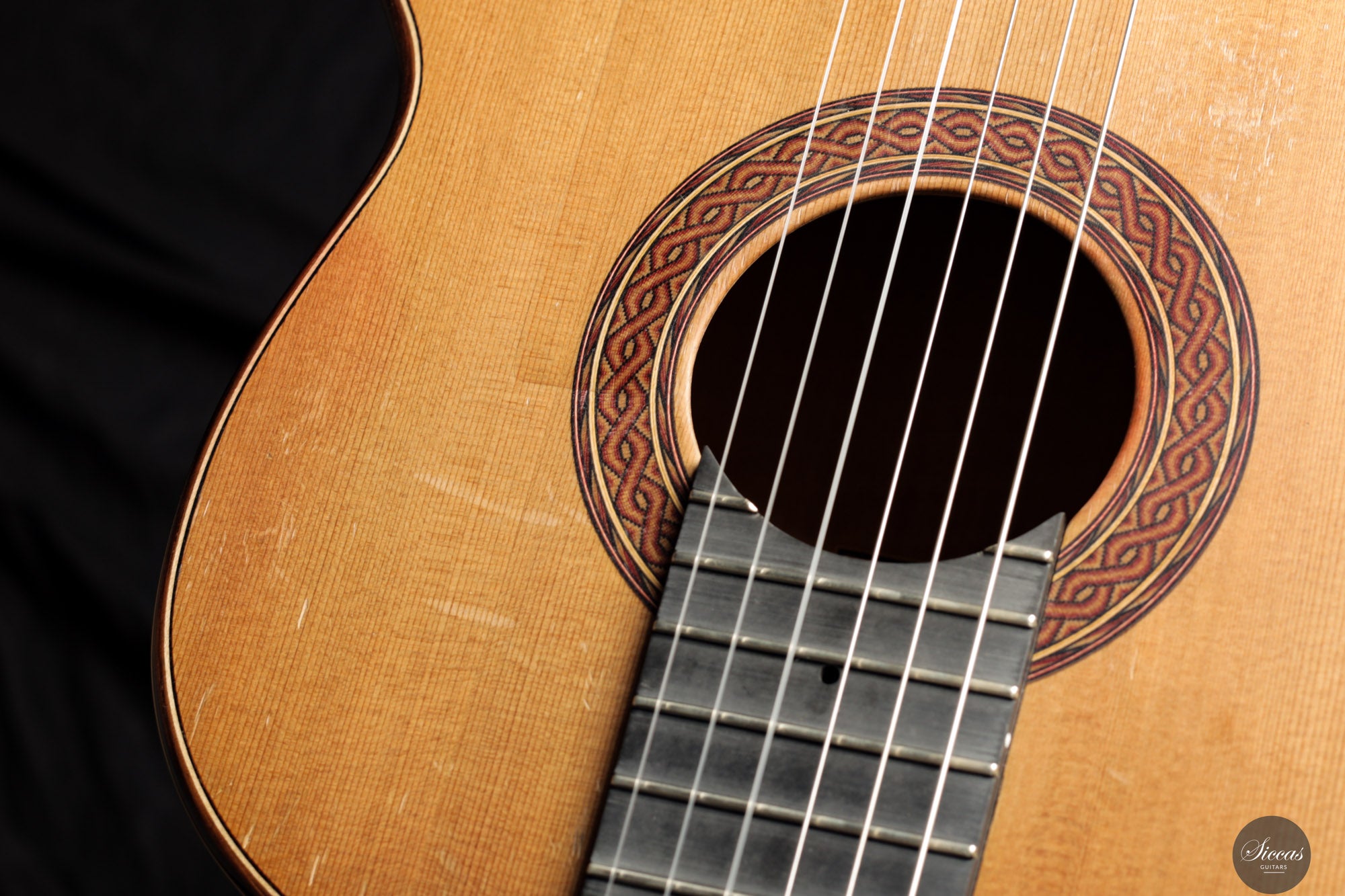 Die Gitarre befindet sich in ausgezeichnetem Zustand ohne Risse oder Reparaturen. Sie weist lediglich altersgemäße Spielspuren auf der Decke auf – typisch für ein Konzertinstrument, das regelmäßig, aber mit Sorgfalt gespielt wurde.