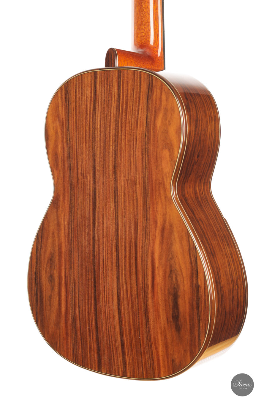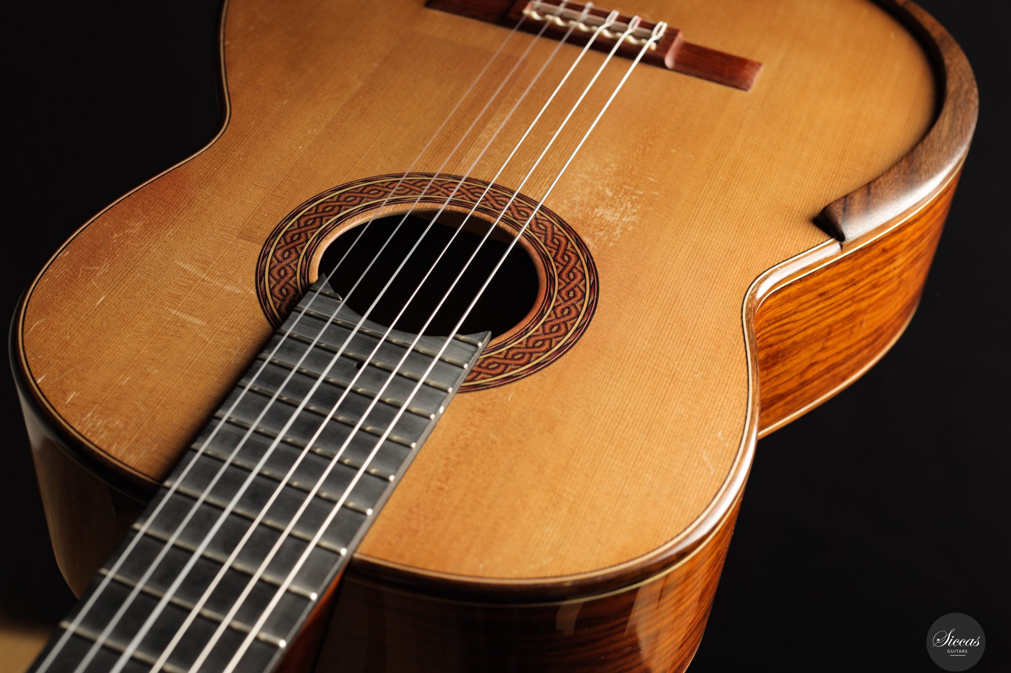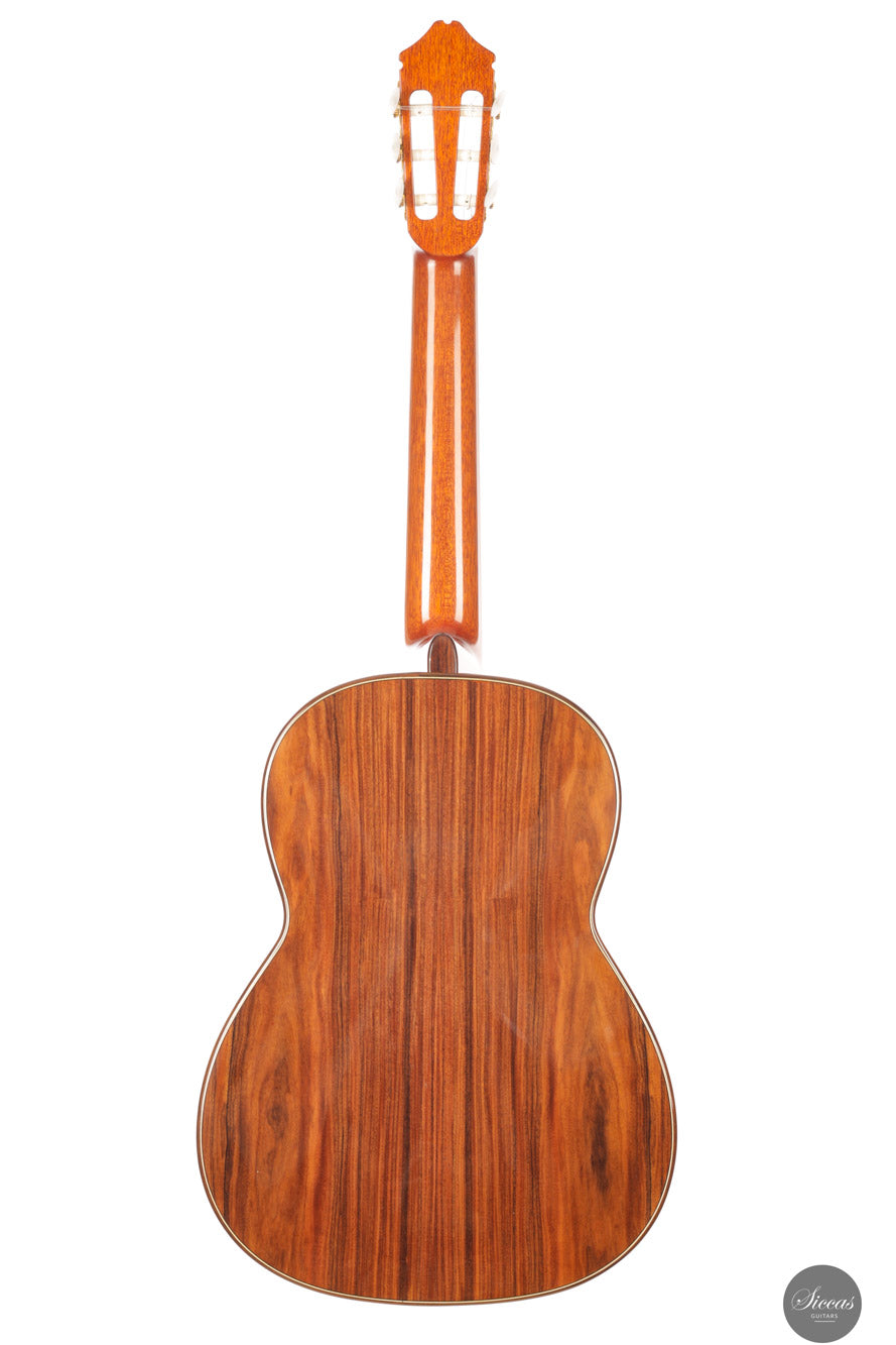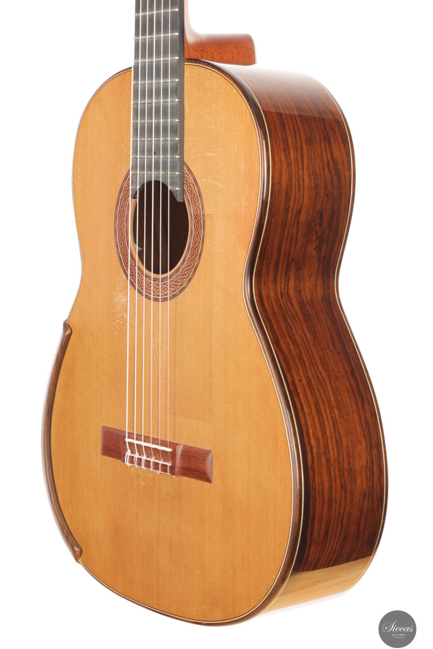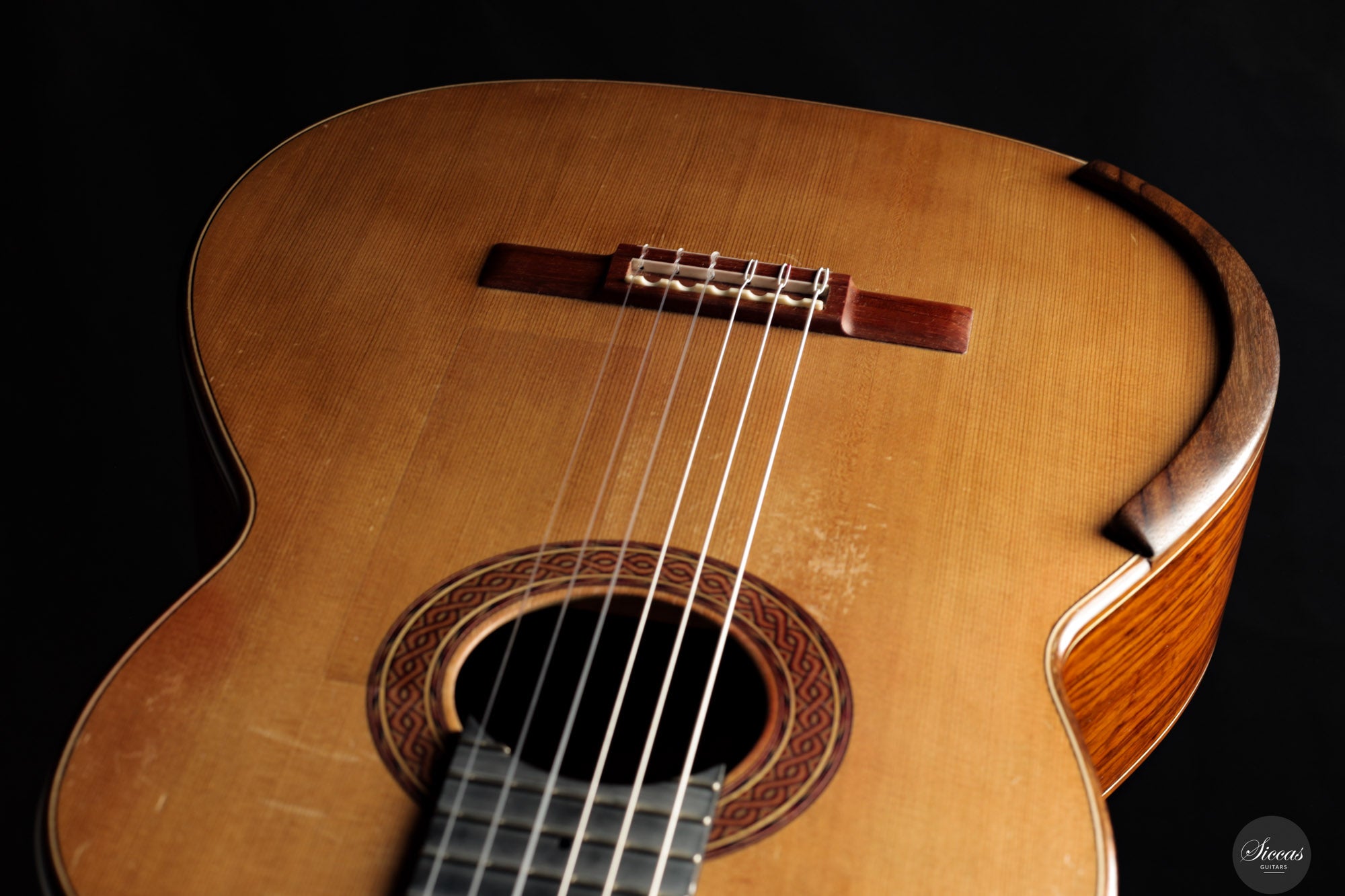 Die Gitarre befindet sich in ausgezeichnetem Zustand ohne Risse oder Reparaturen. Sie weist lediglich altersgemäße Spielspuren auf der Decke auf – typisch für ein Konzertinstrument, das regelmäßig, aber mit Sorgfalt gespielt wurde.