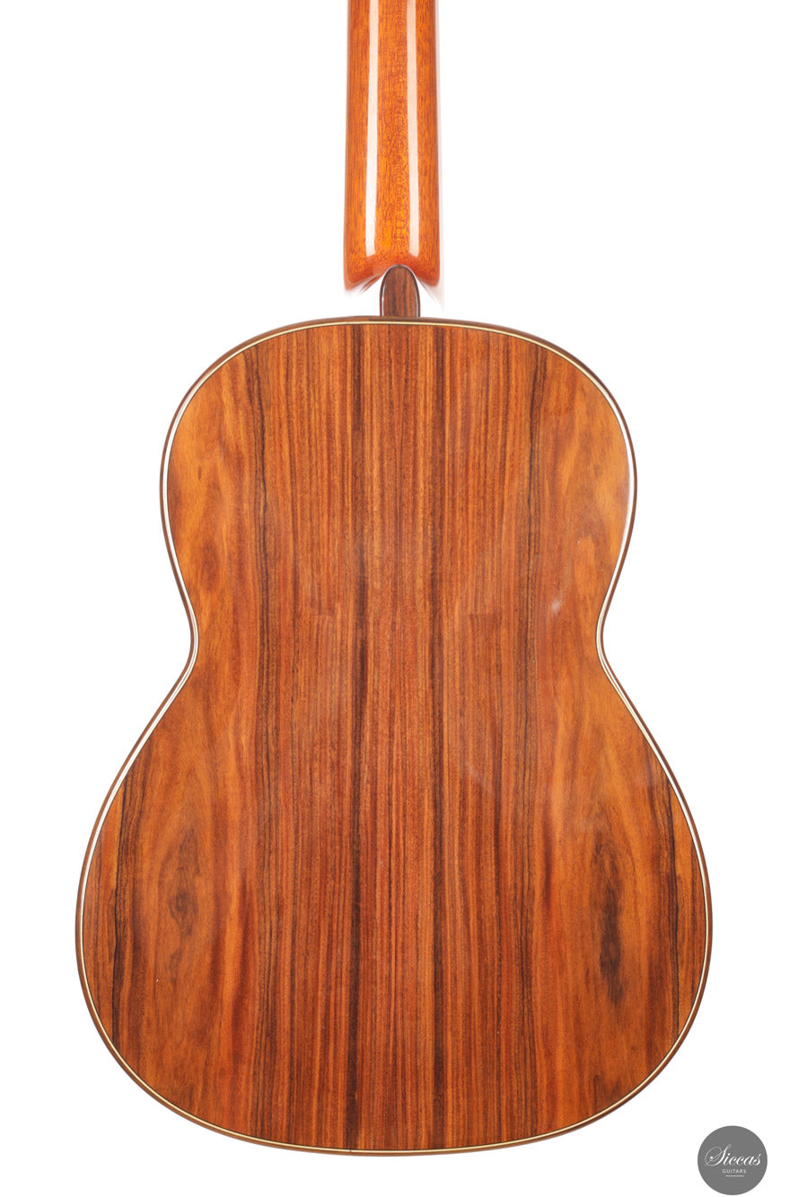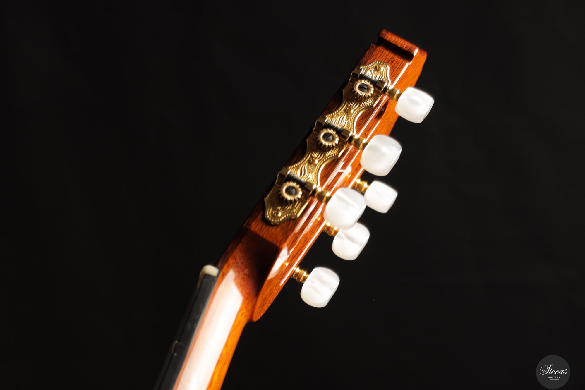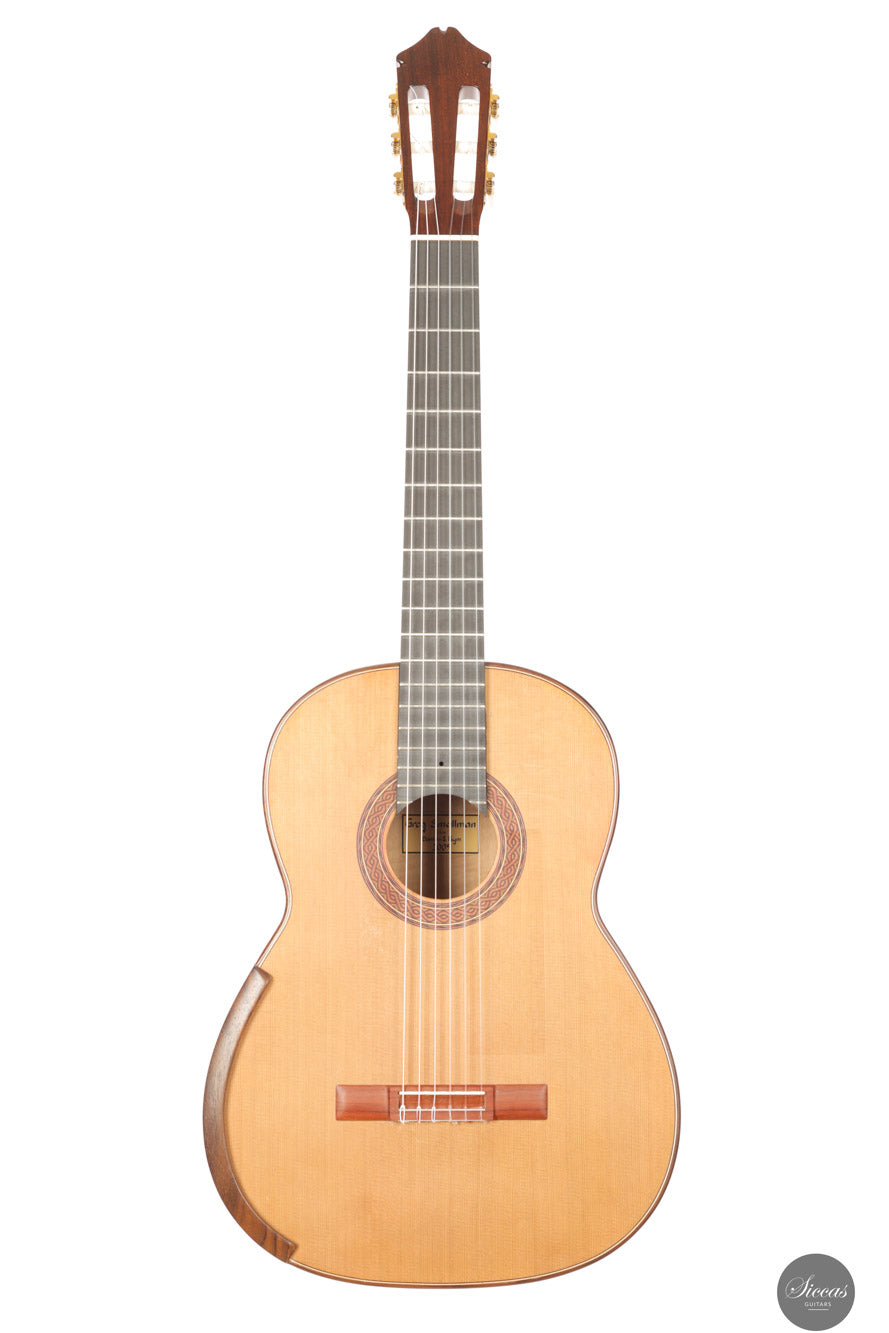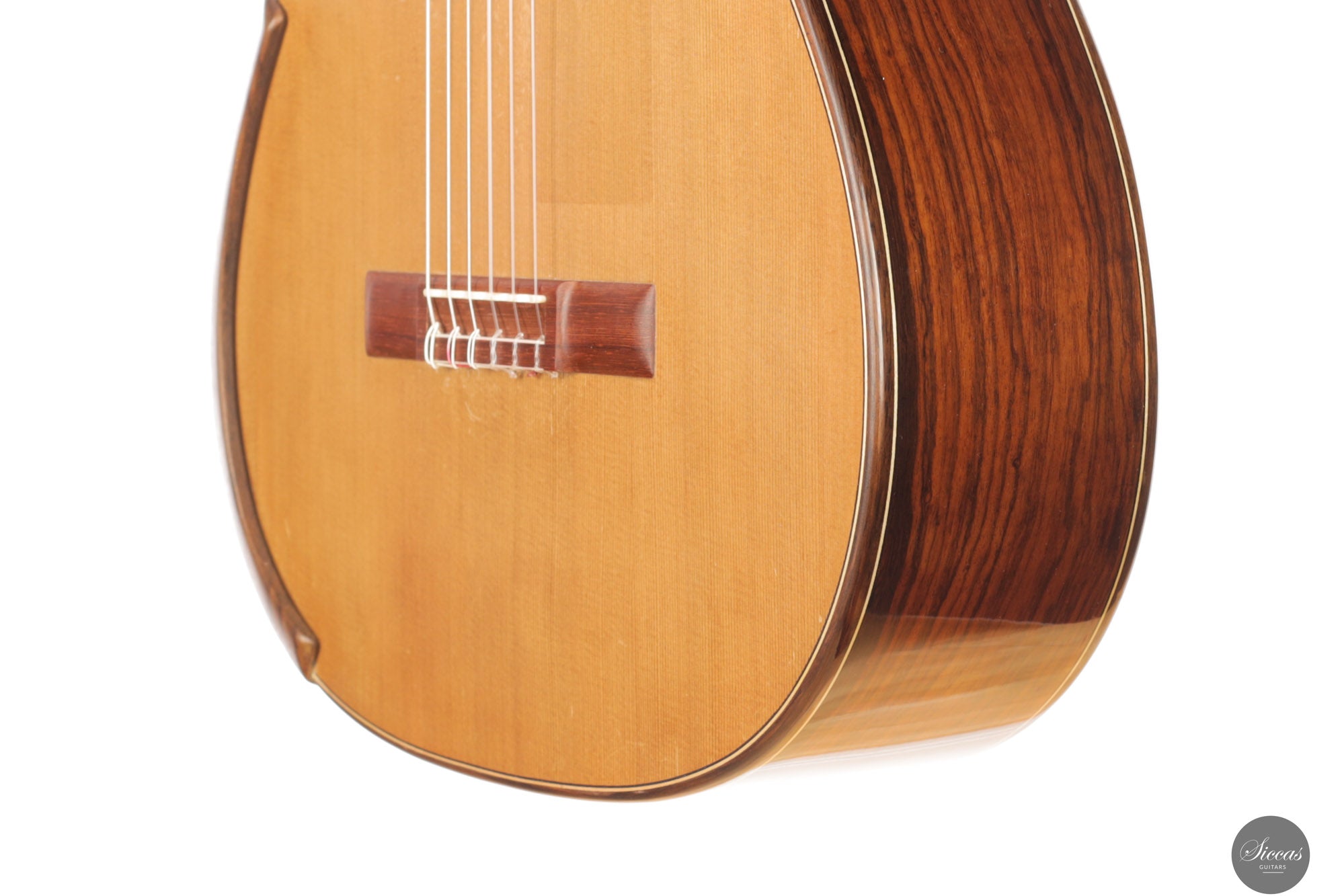 Die Gitarre befindet sich in ausgezeichnetem Zustand ohne Risse oder Reparaturen. Sie weist lediglich altersgemäße Spielspuren auf der Decke auf – typisch für ein Konzertinstrument, das regelmäßig, aber mit Sorgfalt gespielt wurde.