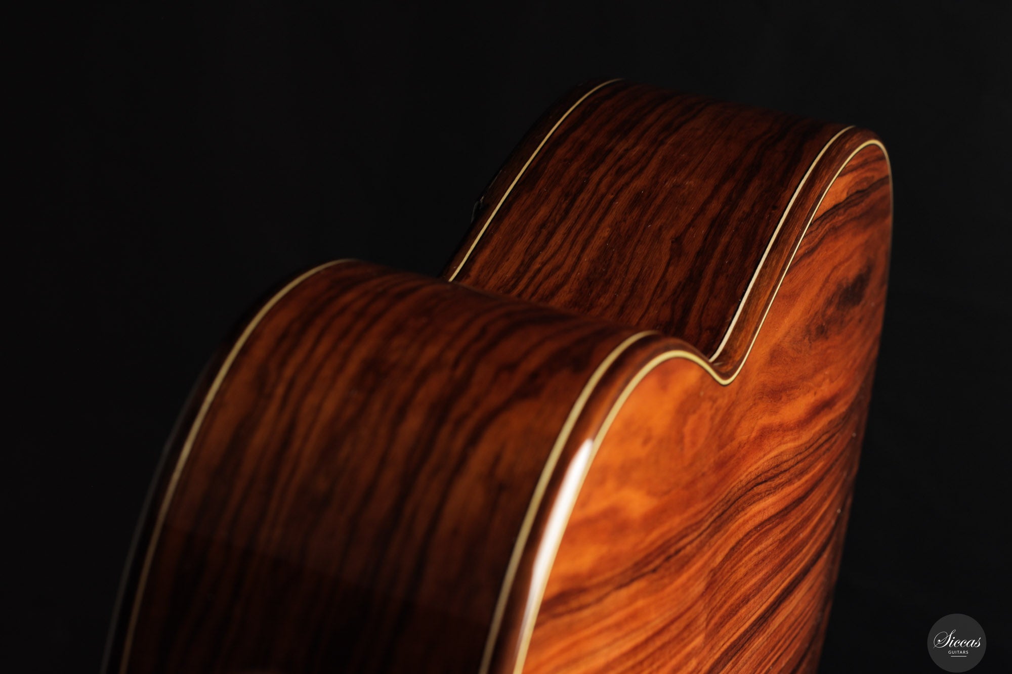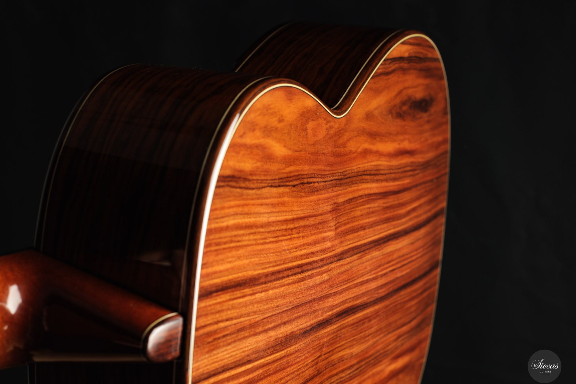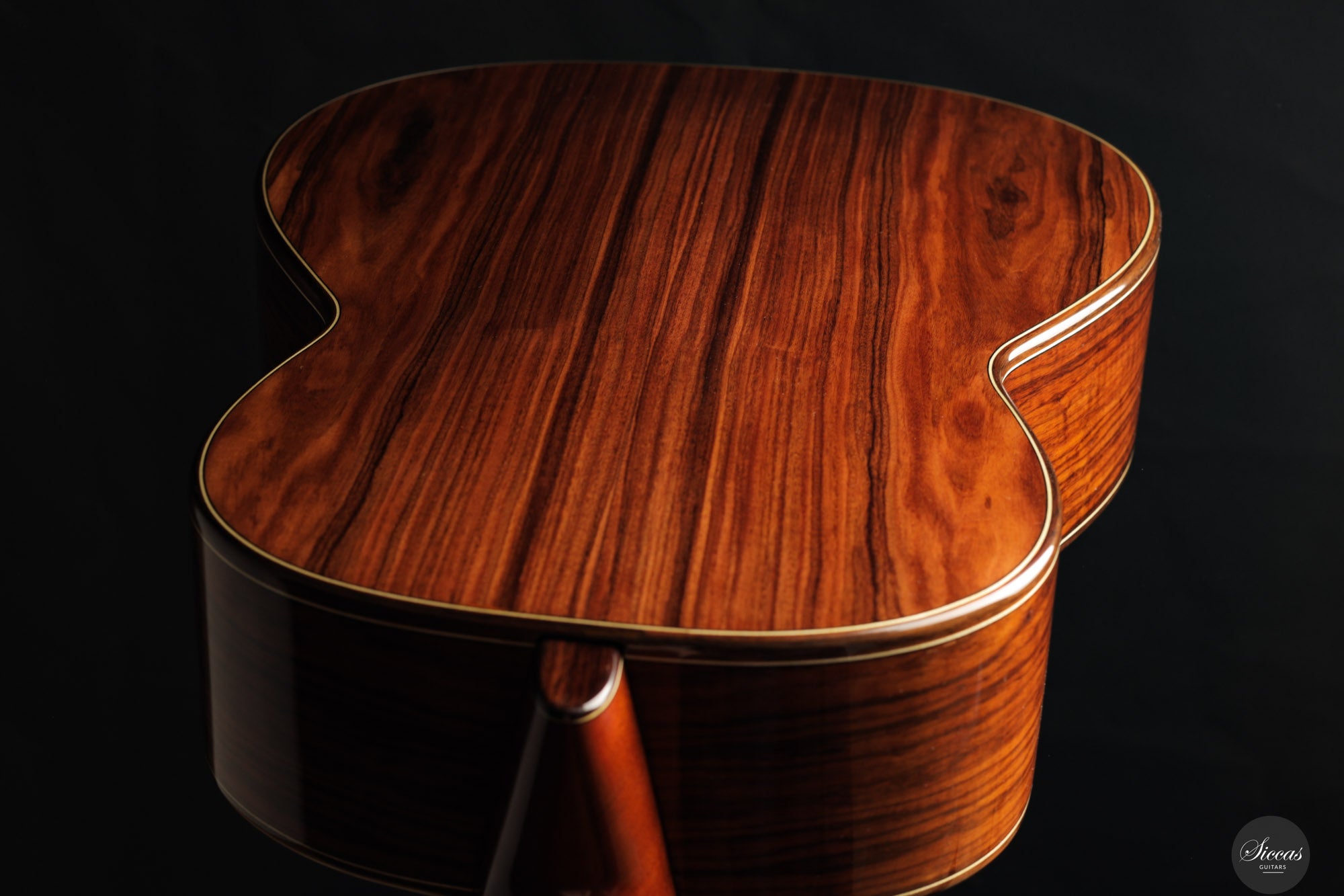 Diese Gitarre wurde 2009 von Greg Smallman & Sons gebaut und ist ein hervorragendes Beispiel für das Vermächtnis dieser Werkstatt. Die Zederndecke ist mit einer karbonverstärkten Lattice-Beleistung versehen und wird von Boden und Zargen aus Palisander ergänzt. Der Korpus ist verdoppelt, was zu einer sehr steifen Struktur führt, die Projektion und Stabilität fördert. Die leichte Decke reagiert bereits auf minimalen Kraftaufwand mit unmittelbarem Ton. Das Lackfinish sorgt für Langlebigkeit und unterstreicht die elegante Erscheinung des Instruments.