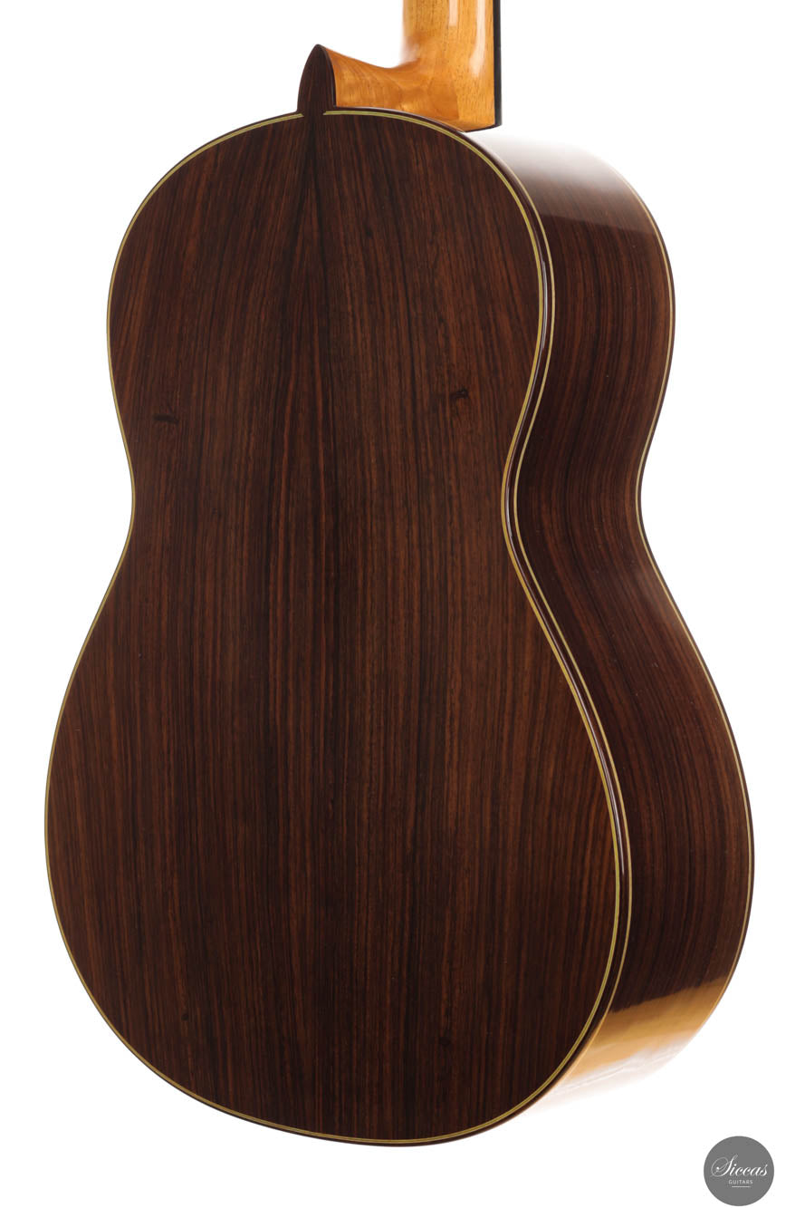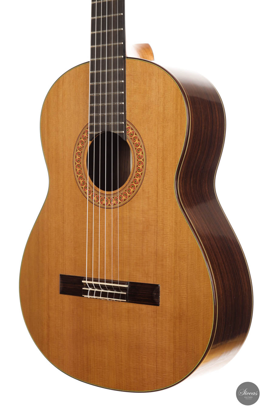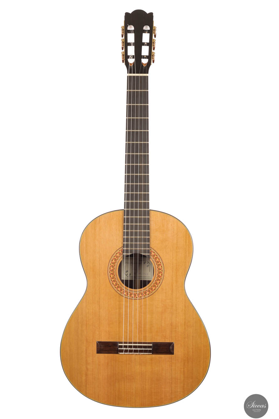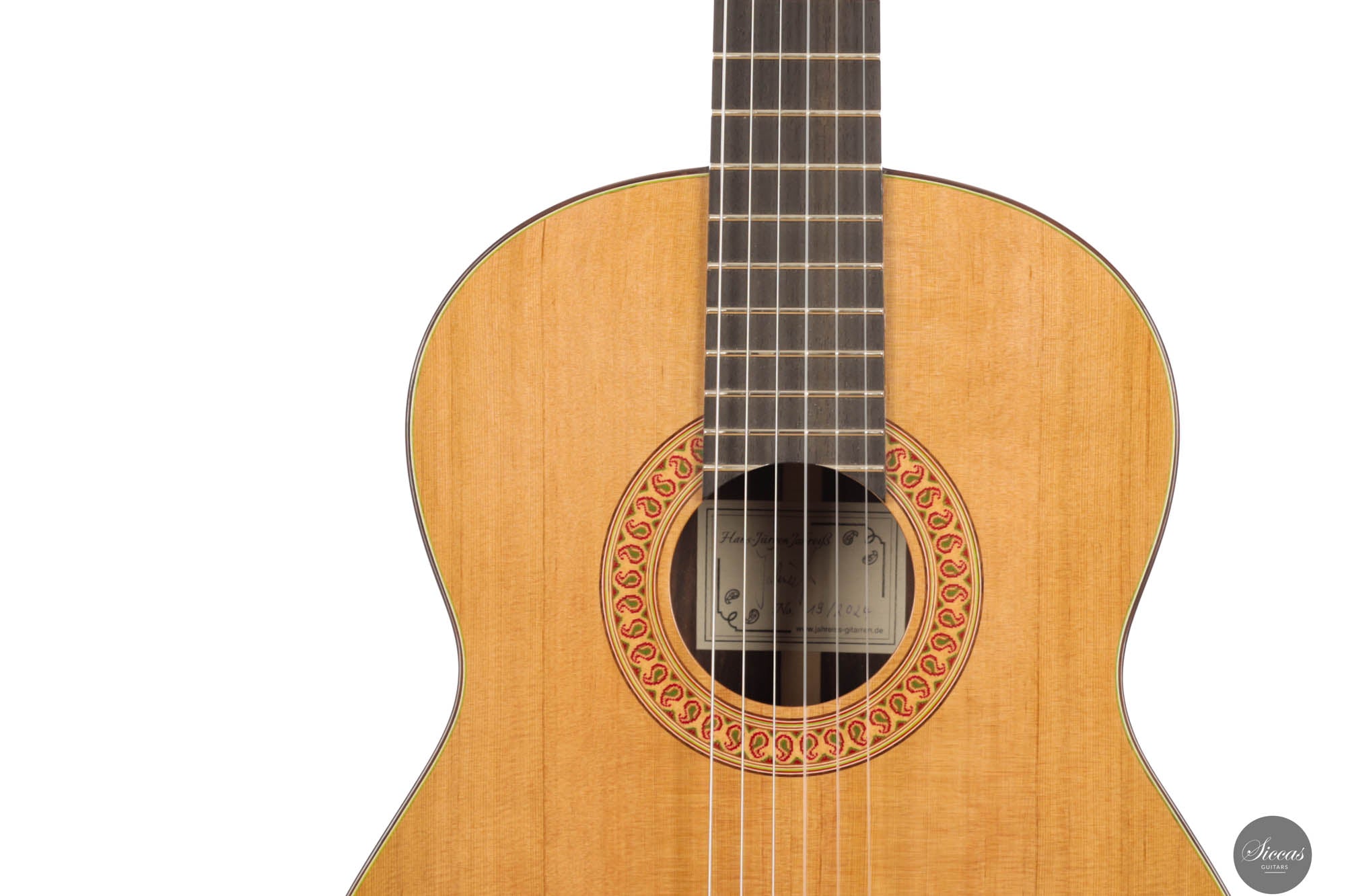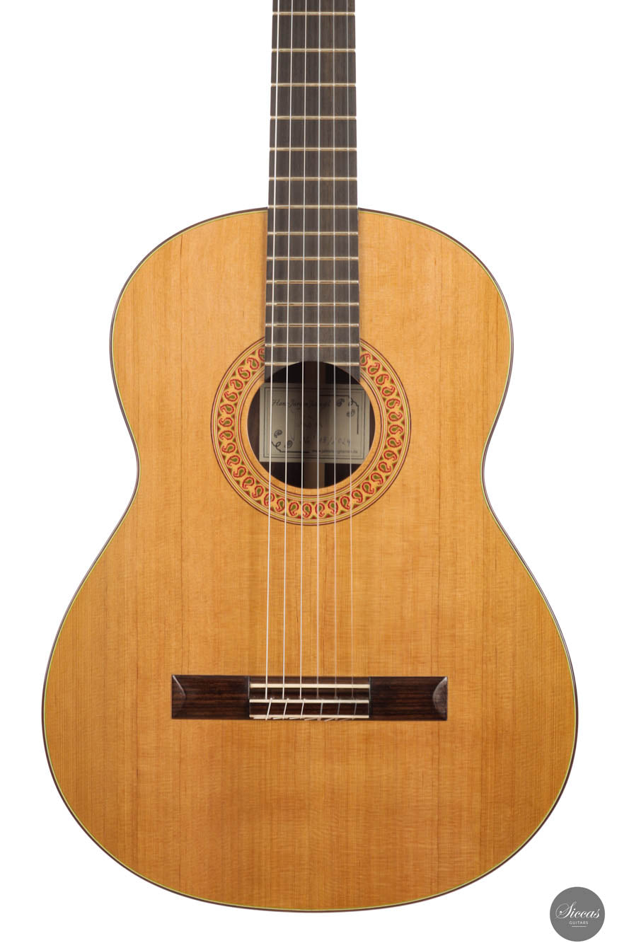 Diese außergewöhnliche neue Gitarre von Hans-Jürgen Jahreiss ist ein bemerkenswertes Beispiel für traditionelle Zedernholzhandwerkskunst und bietet beeindruckende Lautstärke sowie die reichen, resonanten klanglichen Eigenschaften, die für Zedernholzdecken charakteristisch sind. Ihre mühelose Bespielbarkeit macht sie anpassungsfähig für verschiedene Spielstile und Situationen. Ein einzigartiges Merkmal dieses Instruments ist die akribisch handgefertigte Rosette, verziert mit dem persischen "Boteh"-Muster, das Jahreiss' Hingabe und Liebe zum Detail demonstriert. Diese ausgeprägte künstlerische Note erhöht nicht nur die visuelle Anziehungskraft der Gitarre, sondern spiegelt auch das Engagement des Gitarrenbauers wider, ein Instrument zu schaffen, das sowohl ästhetisch als auch klanglich herausragend ist.