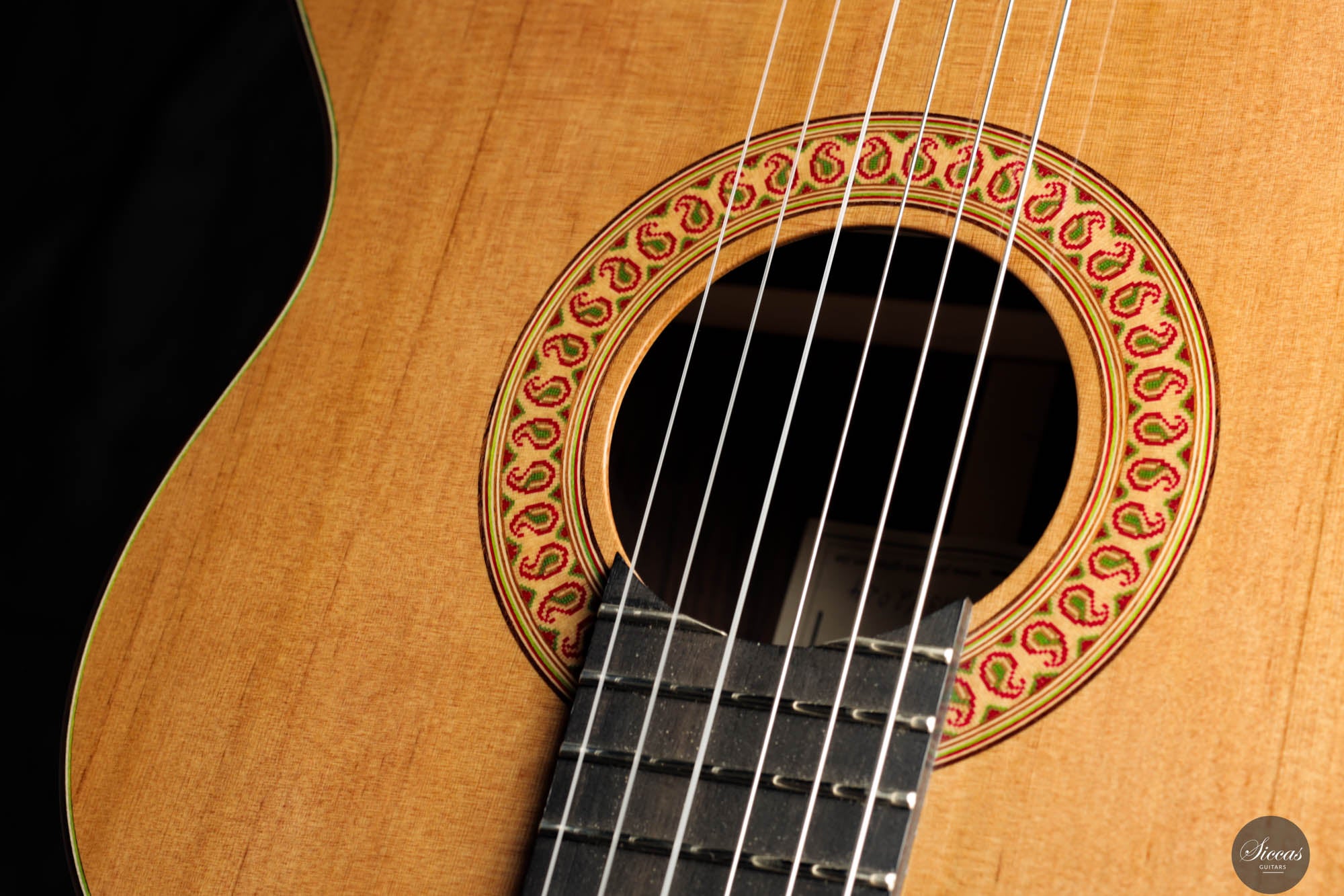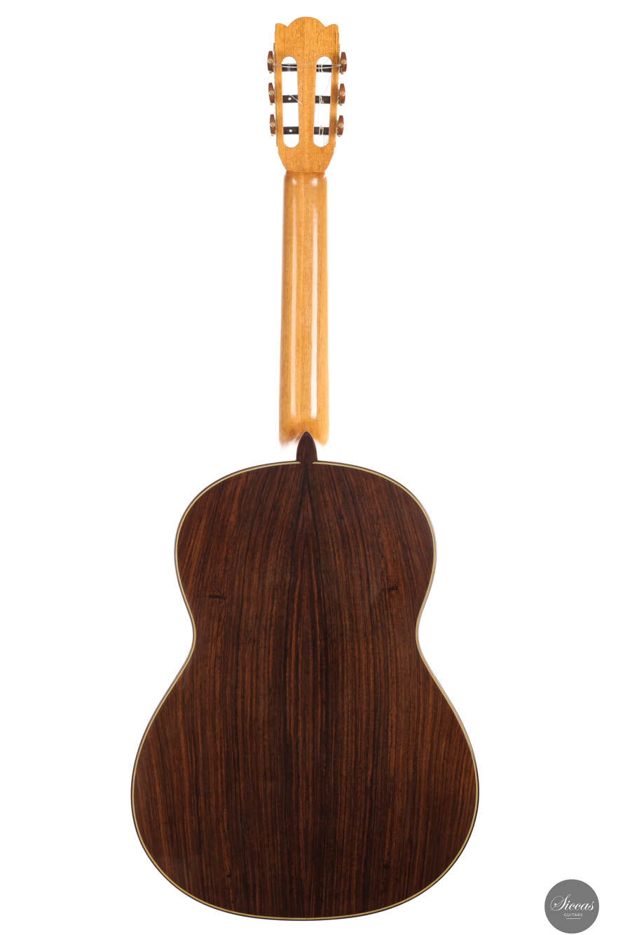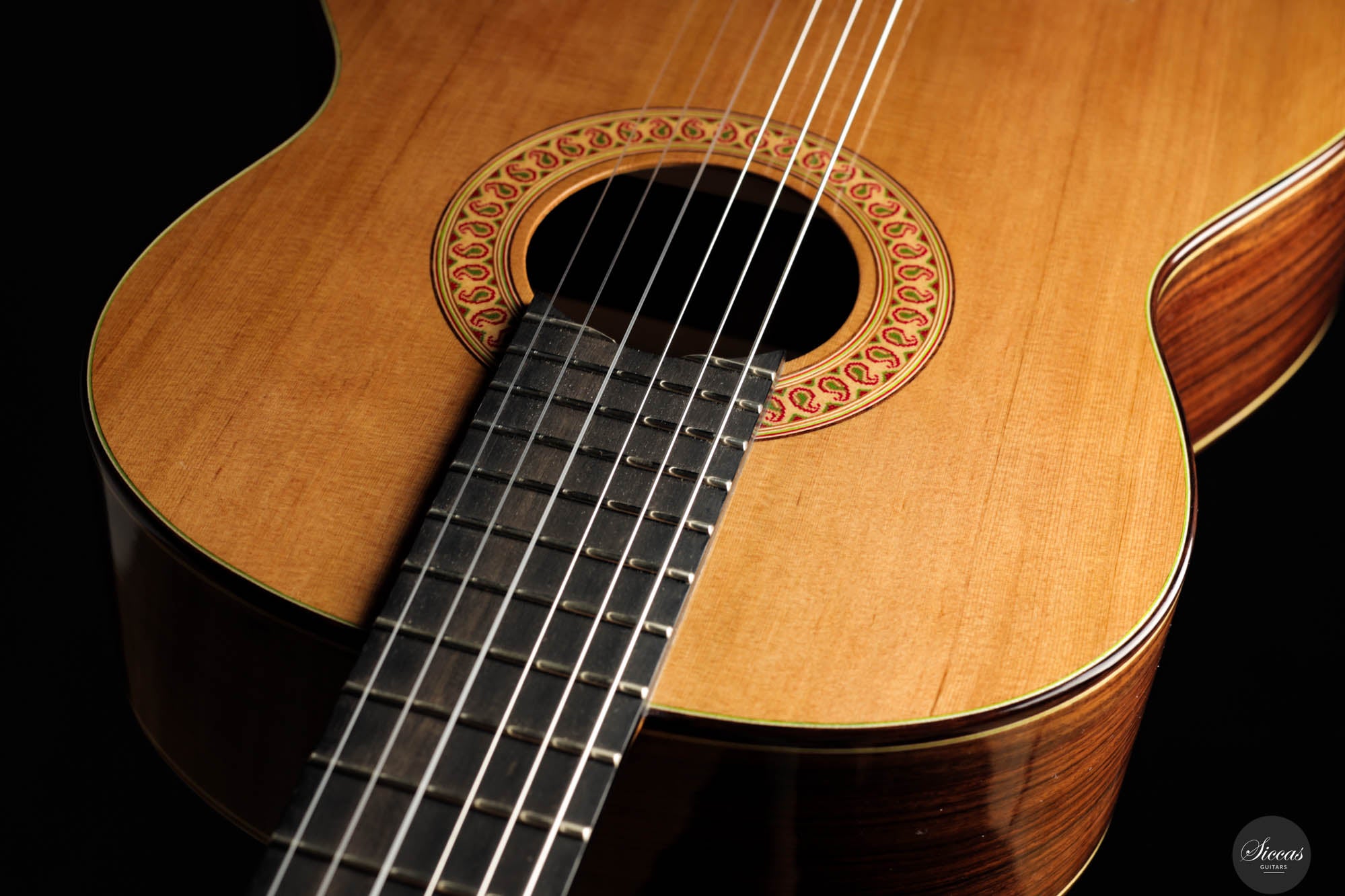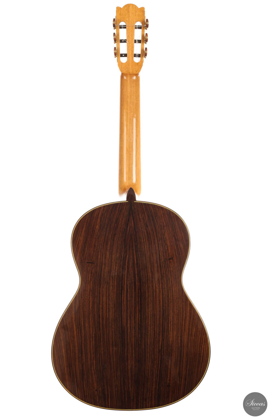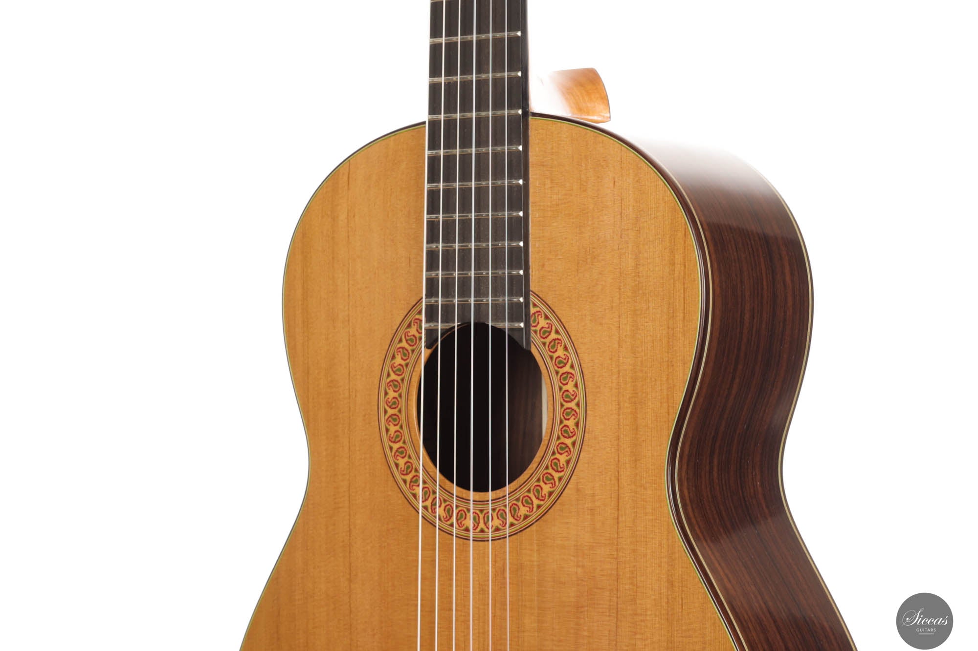 Diese außergewöhnliche neue Gitarre von Hans-Jürgen Jahreiss ist ein bemerkenswertes Beispiel für traditionelle Zedernholzhandwerkskunst und bietet beeindruckende Lautstärke sowie die reichen, resonanten klanglichen Eigenschaften, die für Zedernholzdecken charakteristisch sind. Ihre mühelose Bespielbarkeit macht sie anpassungsfähig für verschiedene Spielstile und Situationen. Ein einzigartiges Merkmal dieses Instruments ist die akribisch handgefertigte Rosette, verziert mit dem persischen "Boteh"-Muster, das Jahreiss' Hingabe und Liebe zum Detail demonstriert. Diese ausgeprägte künstlerische Note erhöht nicht nur die visuelle Anziehungskraft der Gitarre, sondern spiegelt auch das Engagement des Gitarrenbauers wider, ein Instrument zu schaffen, das sowohl ästhetisch als auch klanglich herausragend ist.