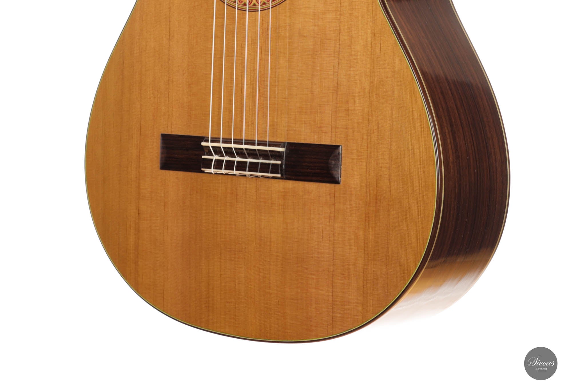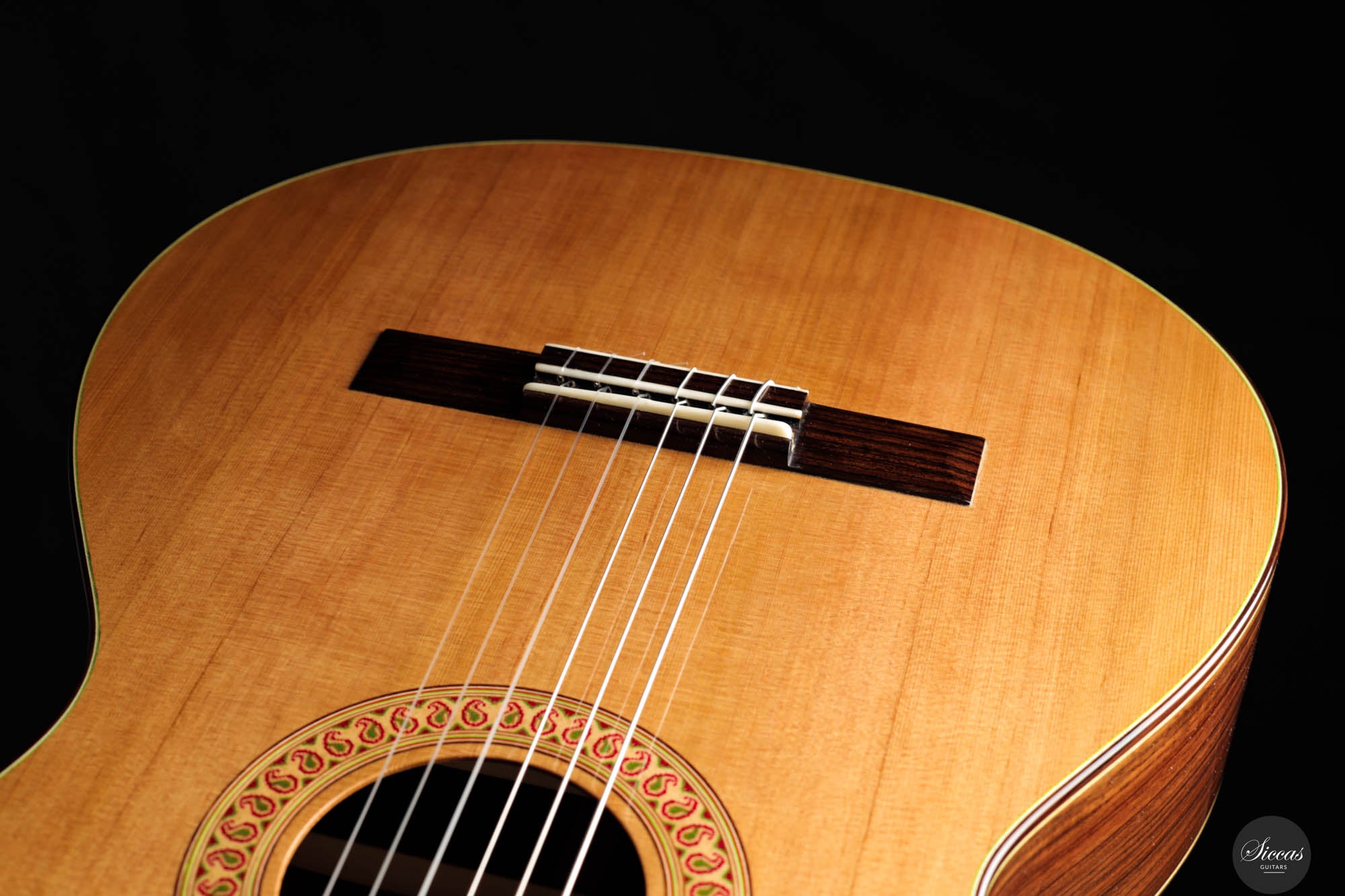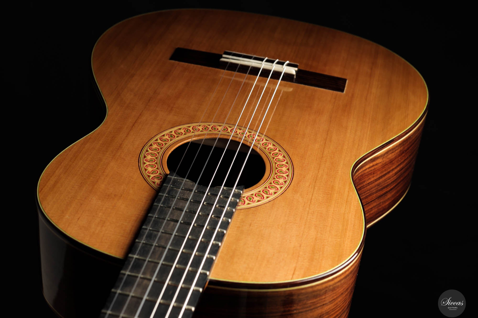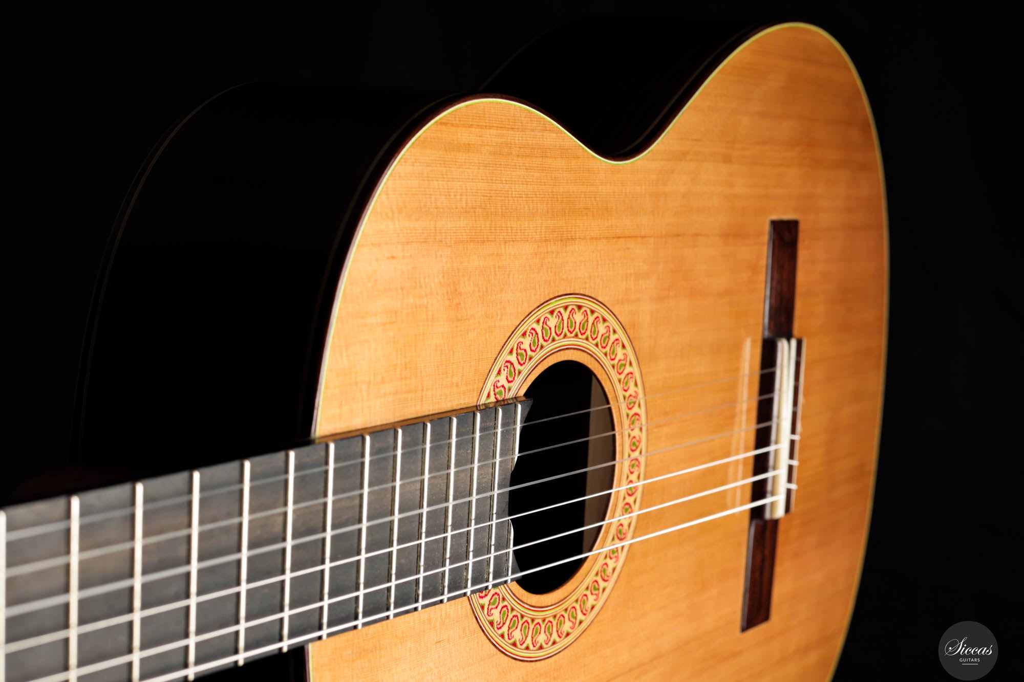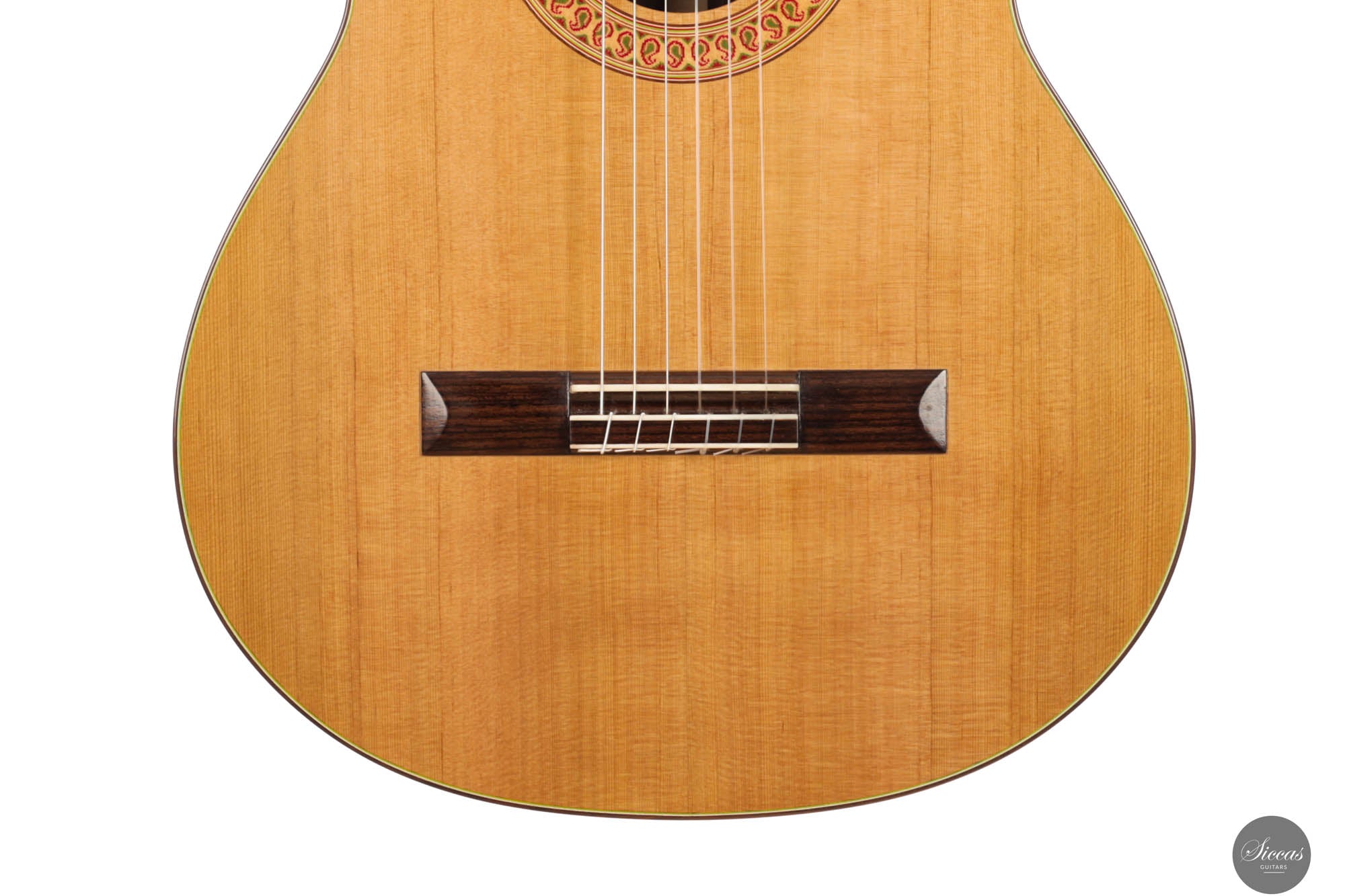 Diese außergewöhnliche neue Gitarre von Hans-Jürgen Jahreiss ist ein bemerkenswertes Beispiel für traditionelle Zedernholzhandwerkskunst und bietet beeindruckende Lautstärke sowie die reichen, resonanten klanglichen Eigenschaften, die für Zedernholzdecken charakteristisch sind. Ihre mühelose Bespielbarkeit macht sie anpassungsfähig für verschiedene Spielstile und Situationen. Ein einzigartiges Merkmal dieses Instruments ist die akribisch handgefertigte Rosette, verziert mit dem persischen "Boteh"-Muster, das Jahreiss' Hingabe und Liebe zum Detail demonstriert. Diese ausgeprägte künstlerische Note erhöht nicht nur die visuelle Anziehungskraft der Gitarre, sondern spiegelt auch das Engagement des Gitarrenbauers wider, ein Instrument zu schaffen, das sowohl ästhetisch als auch klanglich herausragend ist.
