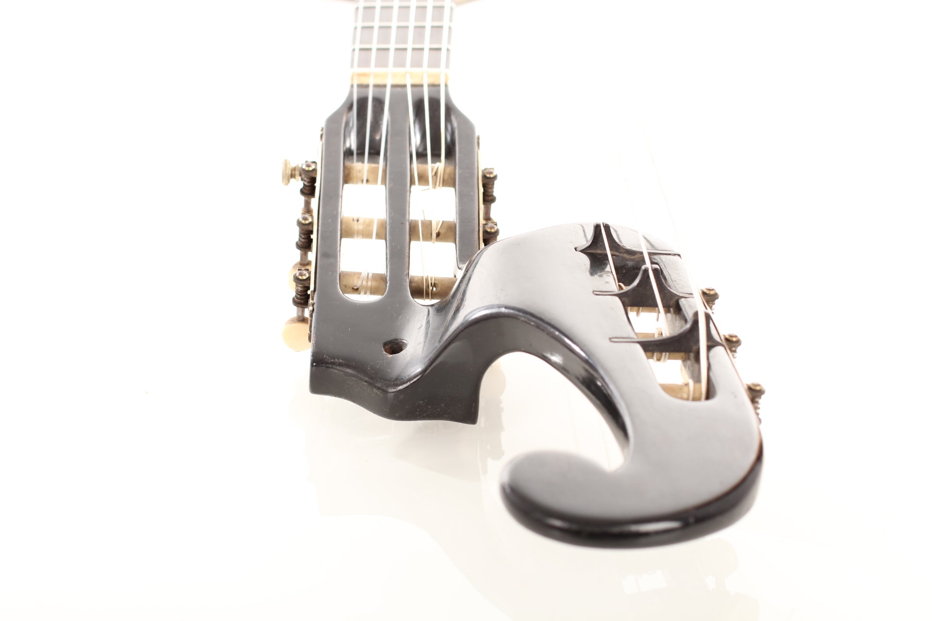 Hans Raab war Vertreter der Münchner Schule und baute diese neunsaitige Wappengitarre im Jahr 1912. Die Decke dieser Gitarre wurde aus Fichte gefertigt und ist mit einem hellen Rand umfasst ebenso wie das Schallloch. Der zweiteilige Boden sowie die Zargen sind aus Palisander. Auf der Decke befinden sich fünf reparierte Risse, die alle stabil sind. Boden und Zargen sind rissfrei. Ein Hartschalenkoffer ist inklusive.
