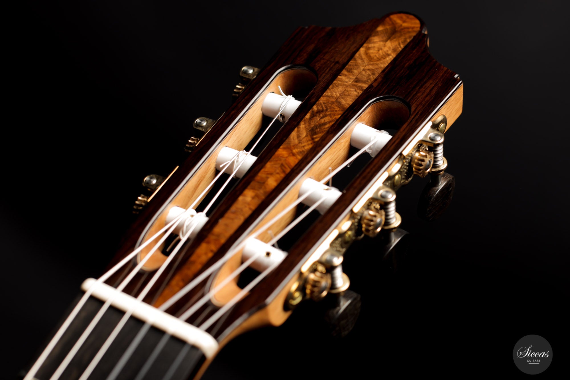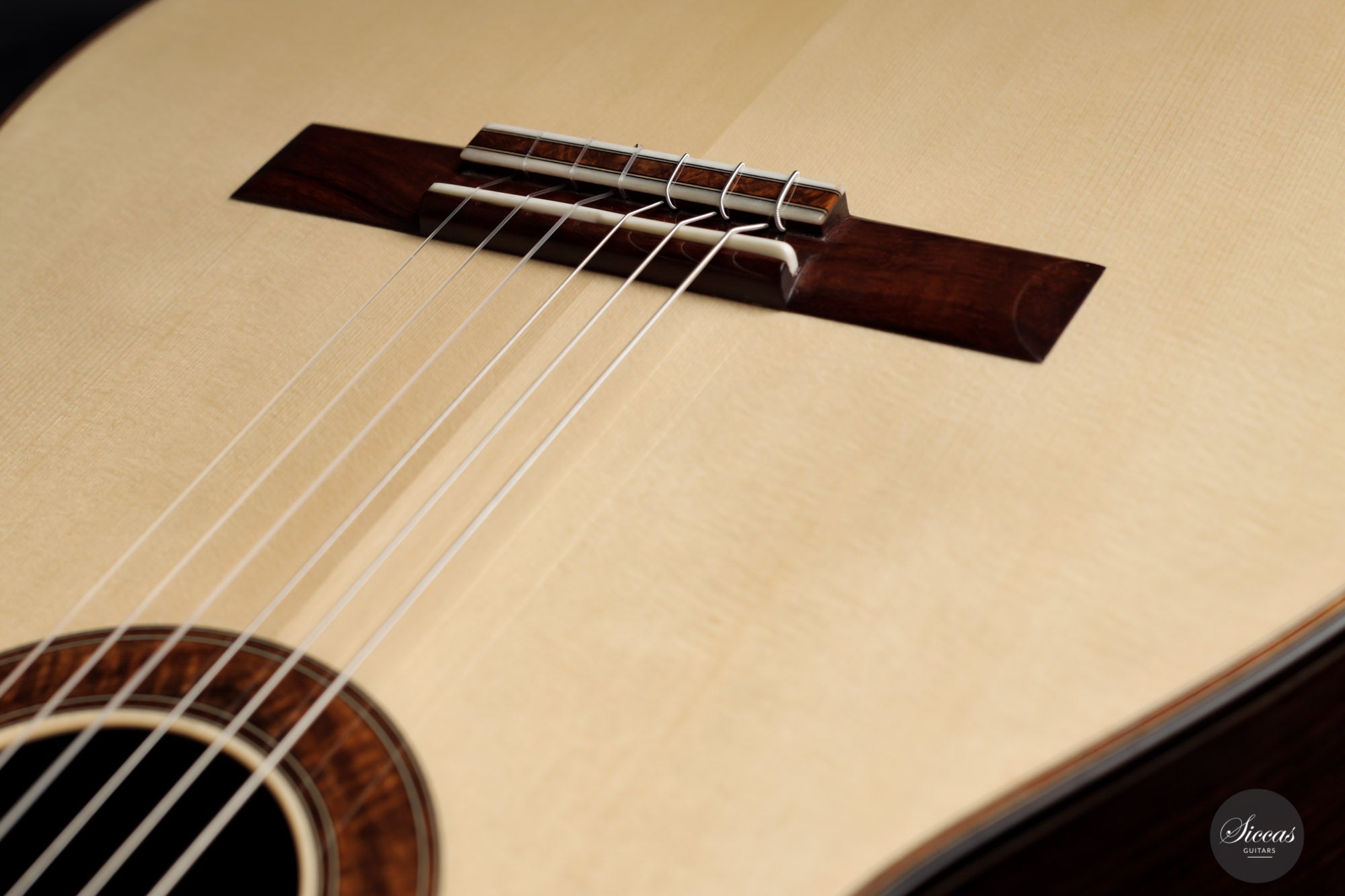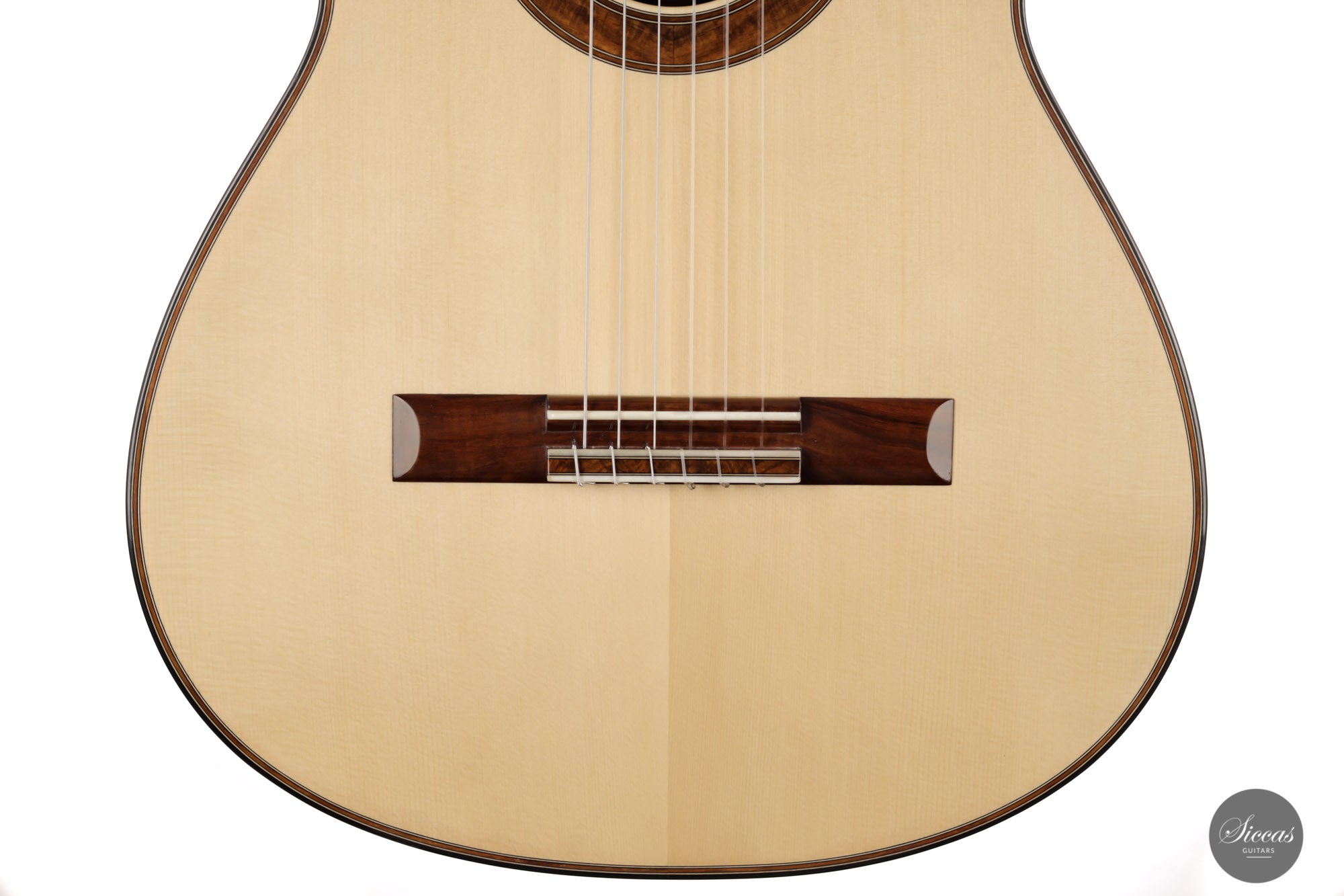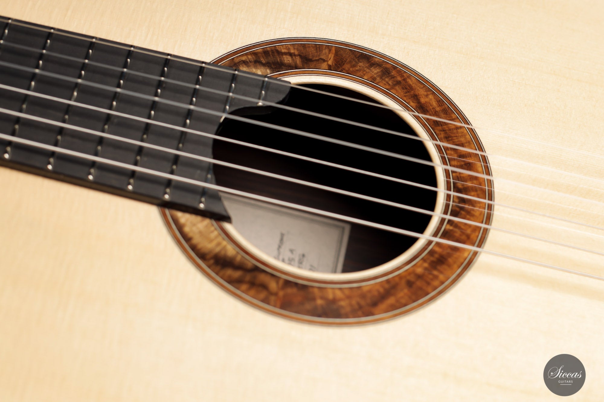 Dieses schöne brandneue "Supreme Double-top"-Modell von Hans ist weltklasse. Die Handwerkskunst ist exquisit, und man bekommt einen Eindruck von Hans' holzverarbeitendem Hintergrund. Mit einer ungewöhnlichen Fichten-/Zedern-Doubletop Decke und einer radialen Beleistung der Decke sticht diese Gitarre in Bezug auf Konstruktion und Klang hervor. Das Volumen ist großzügig, und vor allem ist die Bespielbarkeit außergewöhnlich. Mit ihrem warmen, strukturierten Klang ist diese Gitarre ein exzellenter Double-Top-Pick.