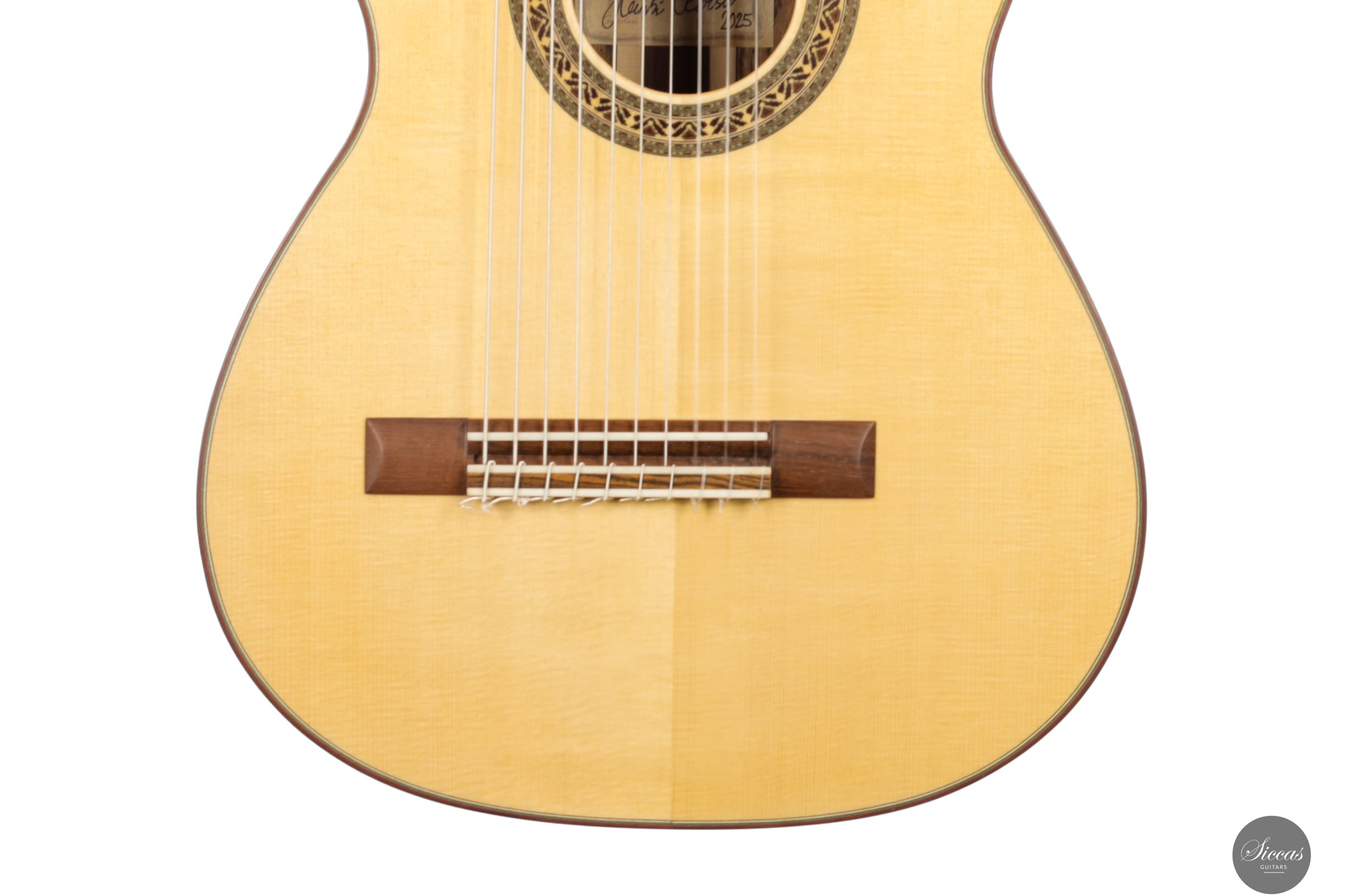 Heikki Rousus 10-saitige Gitarre Nr. 486 (2025) mit Fichtendecke, Zargen aus Bocote und dreiteiligem Boden mit Cocobolo-Mittelstreifen. Der Zedernhals mit geflammtem Ahornstreifen unterstreicht das elegante Erscheinungsbild. Klanglich überzeugt das Instrument mit langer Tonentfaltung, natürlichem Klangbild und klassischer Klarheit.