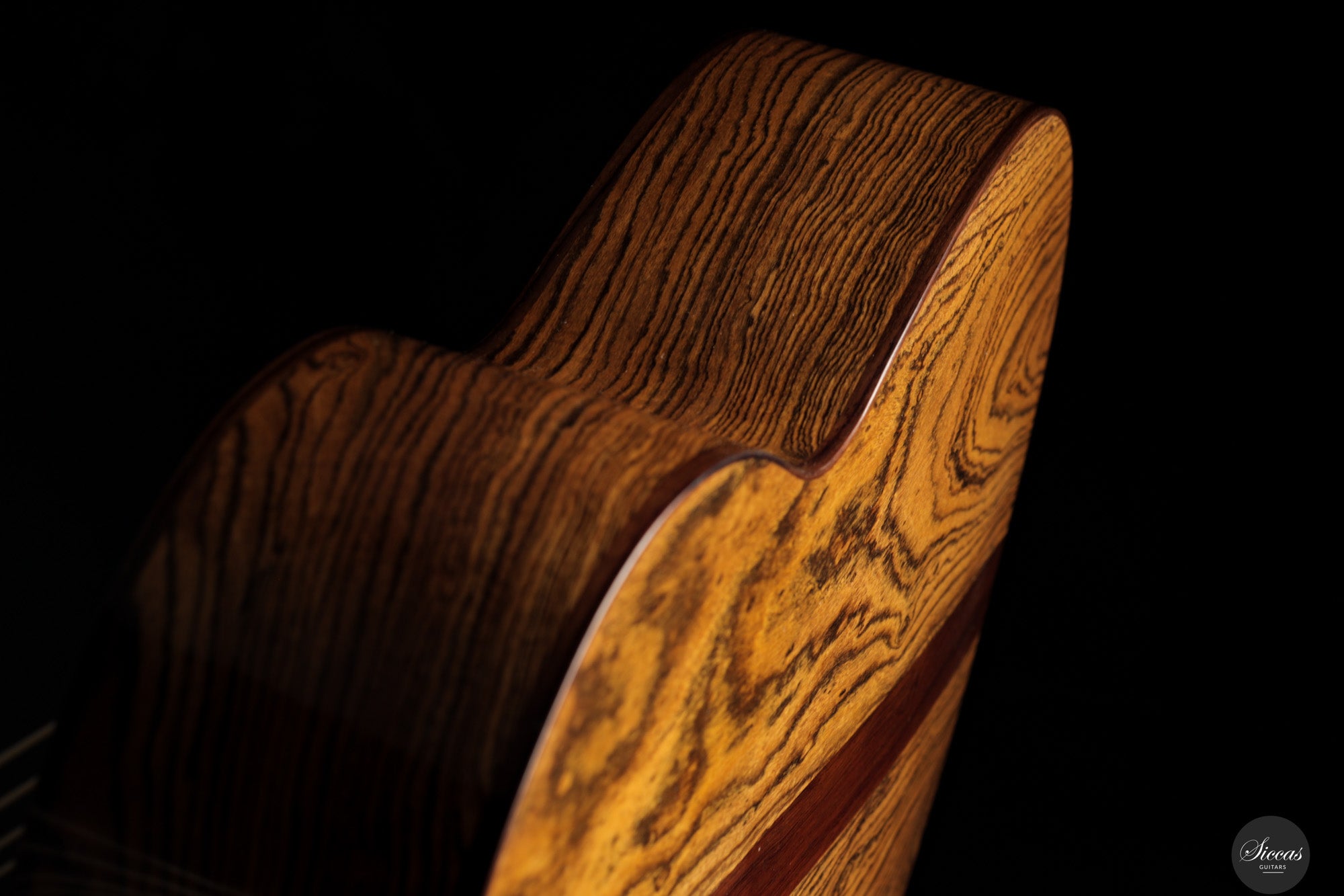 Die Gitarre Nr. 486, vollendet im Jahr 2025, ist ein traditionell gebautes 10-saitiges Modell mit ausdrucksstarker Klangtiefe und visueller Raffinesse. Die Decke besteht aus Fichte, während der Korpus aus Bocote gefertigt ist. Der Boden ist dreiteilig und wird von einem zentralen Cocobolo-Streifen durchzogen – ein gestalterisches Detail, das klanglich Tiefe und visuell Kontrast bringt. Der Hals besteht aus Zedernholz mit einem auffälligen Mittelstreifen aus geflammtem Ahorn – ein Highlight in Struktur und Optik.
