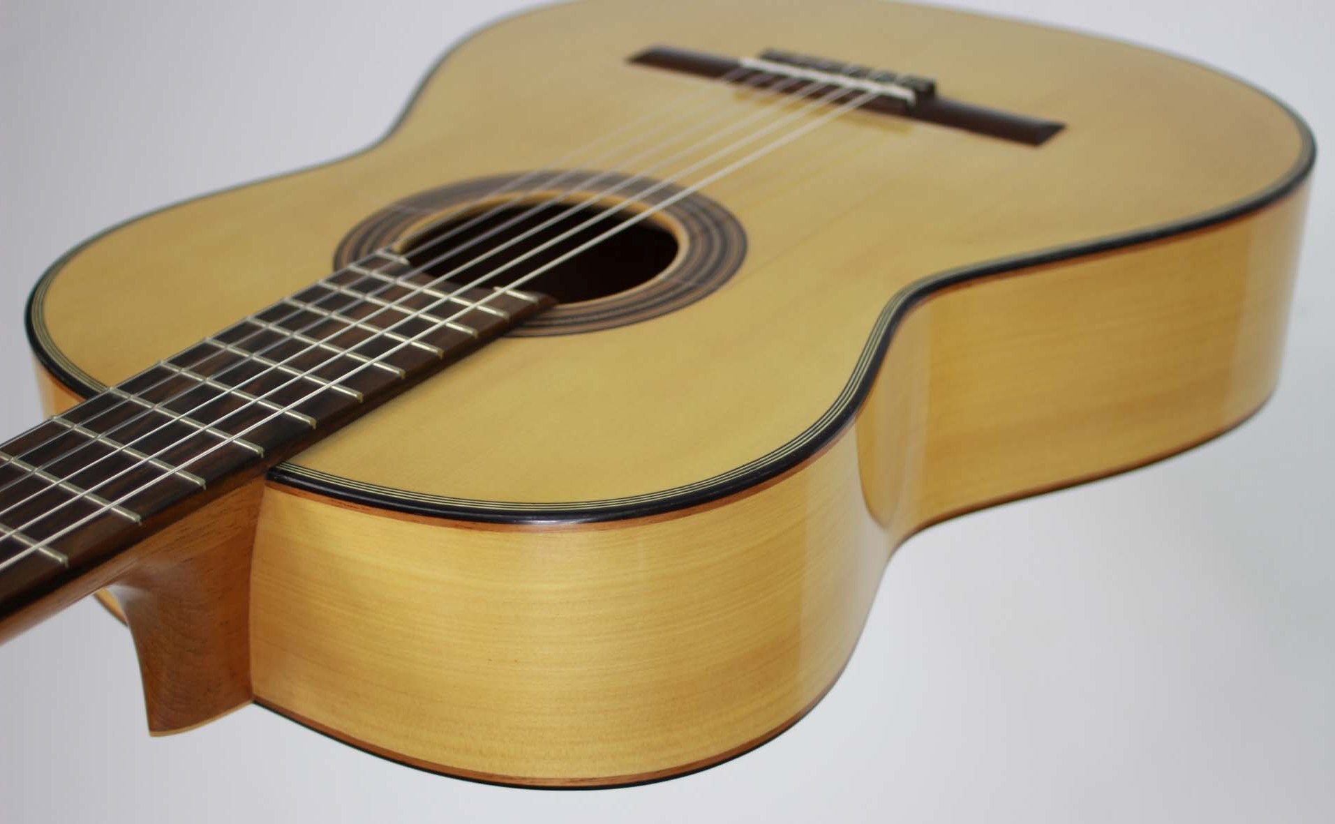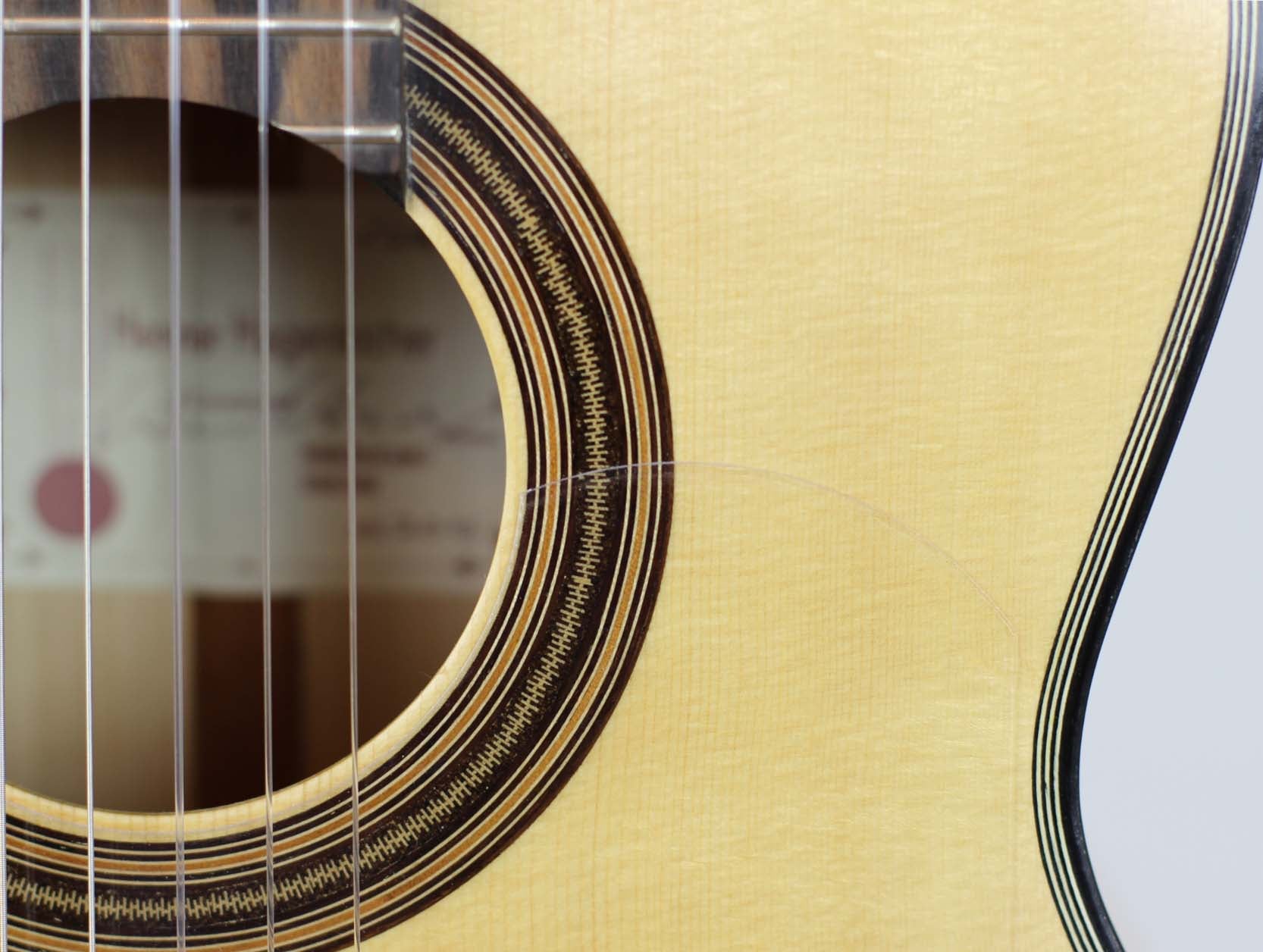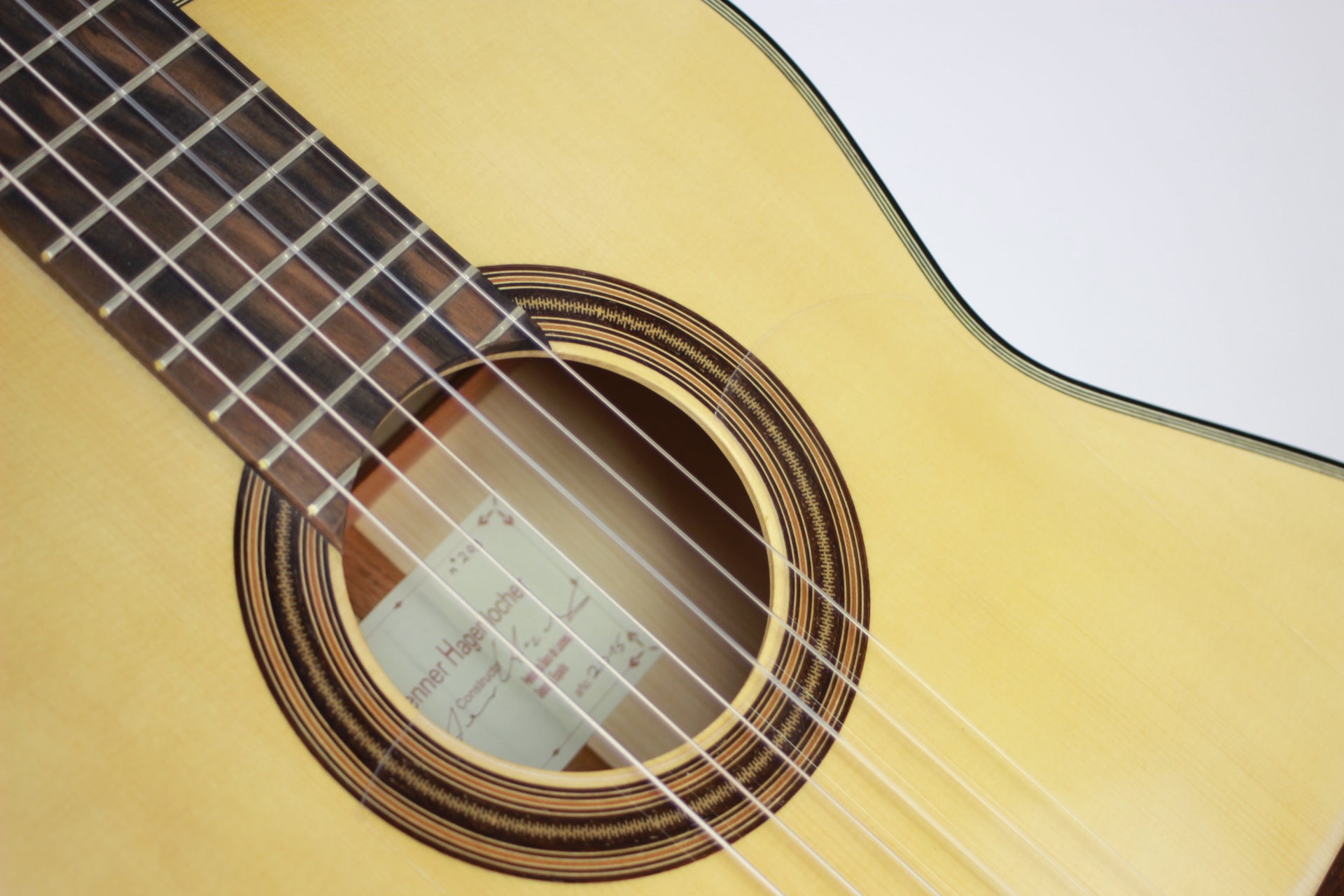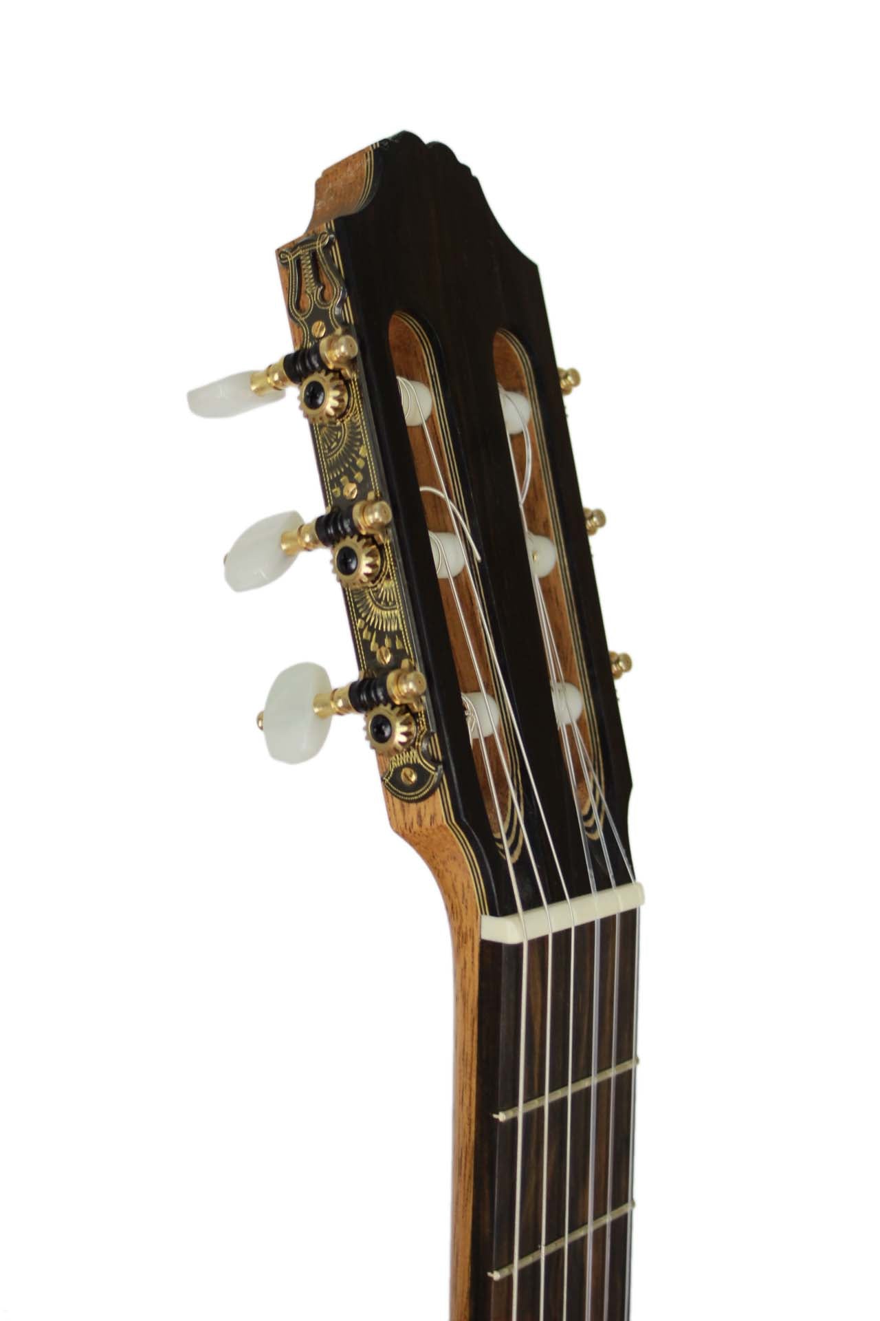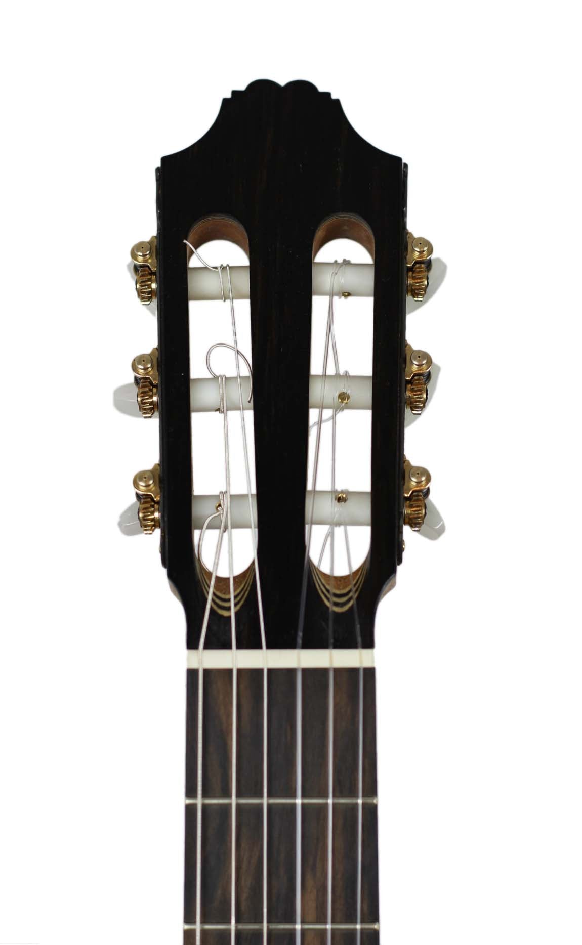 Henner Hagenlocher began building guitars in Hamburg in 1990 in the workshop of luthier Michael Wichmann. When he started his main focus was to study guitars by Torres and Hermann Hauser I. During this time he focused to build copies of these maker but also to develop his own models. After this period in Hamburg, he studied Music-Technology at the Guildhall University in London, where he studied the construction of Spanish guitars but also other stringed instruments. After he had completed his studies, he remained another year in London until he moved to Granada. In 1996 he opened there, in Calle Guadarrama 3, his own workshop. There he studied a lot about the Granadian style of guitar construction and learned a lot from other luthiers like Antonio Marin Montero. This brand-new guitar was brought last week by Henner in our shop. The top is made of finest spruce, the back and sides are made of cypress. The sound is very clear and crip and it reacts very fast. Body resonance is around F#. The tuning machines are by Fustero.