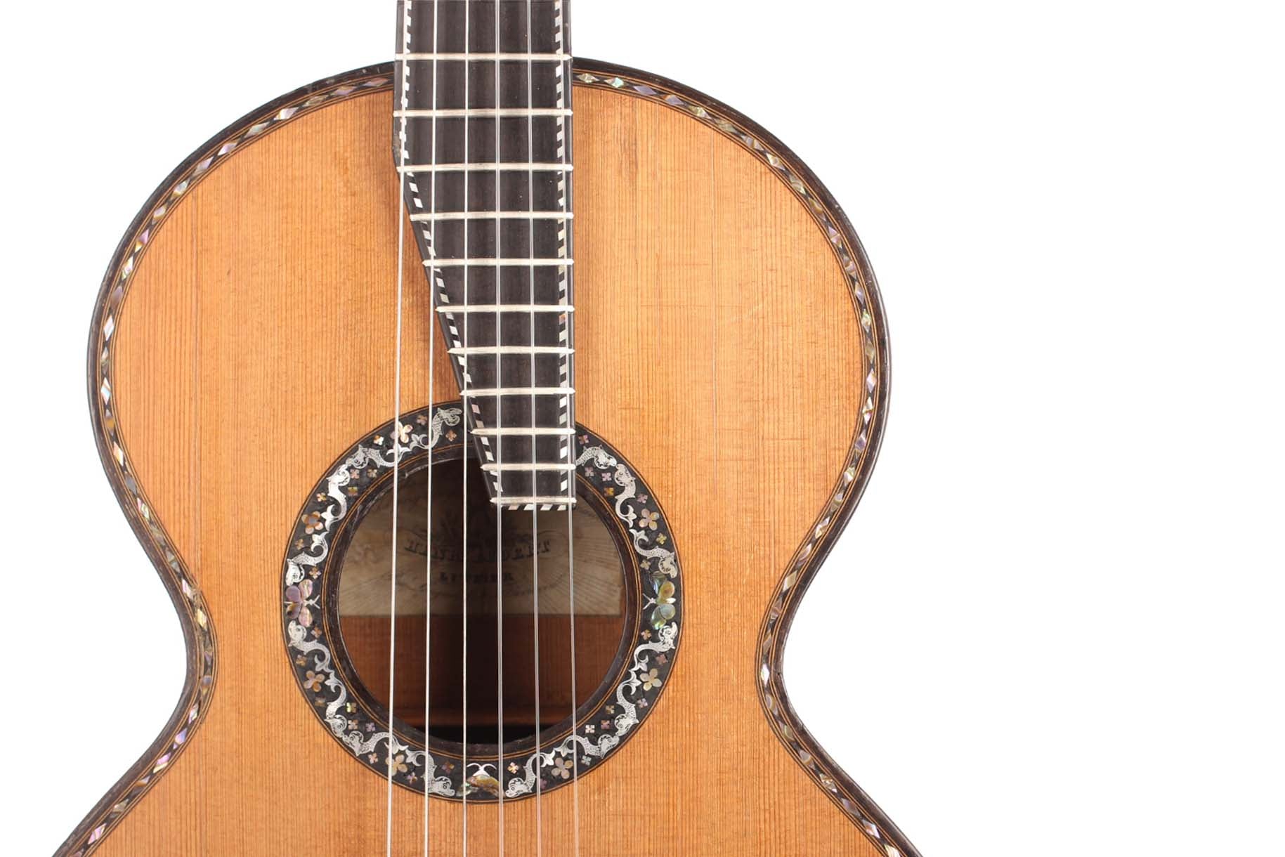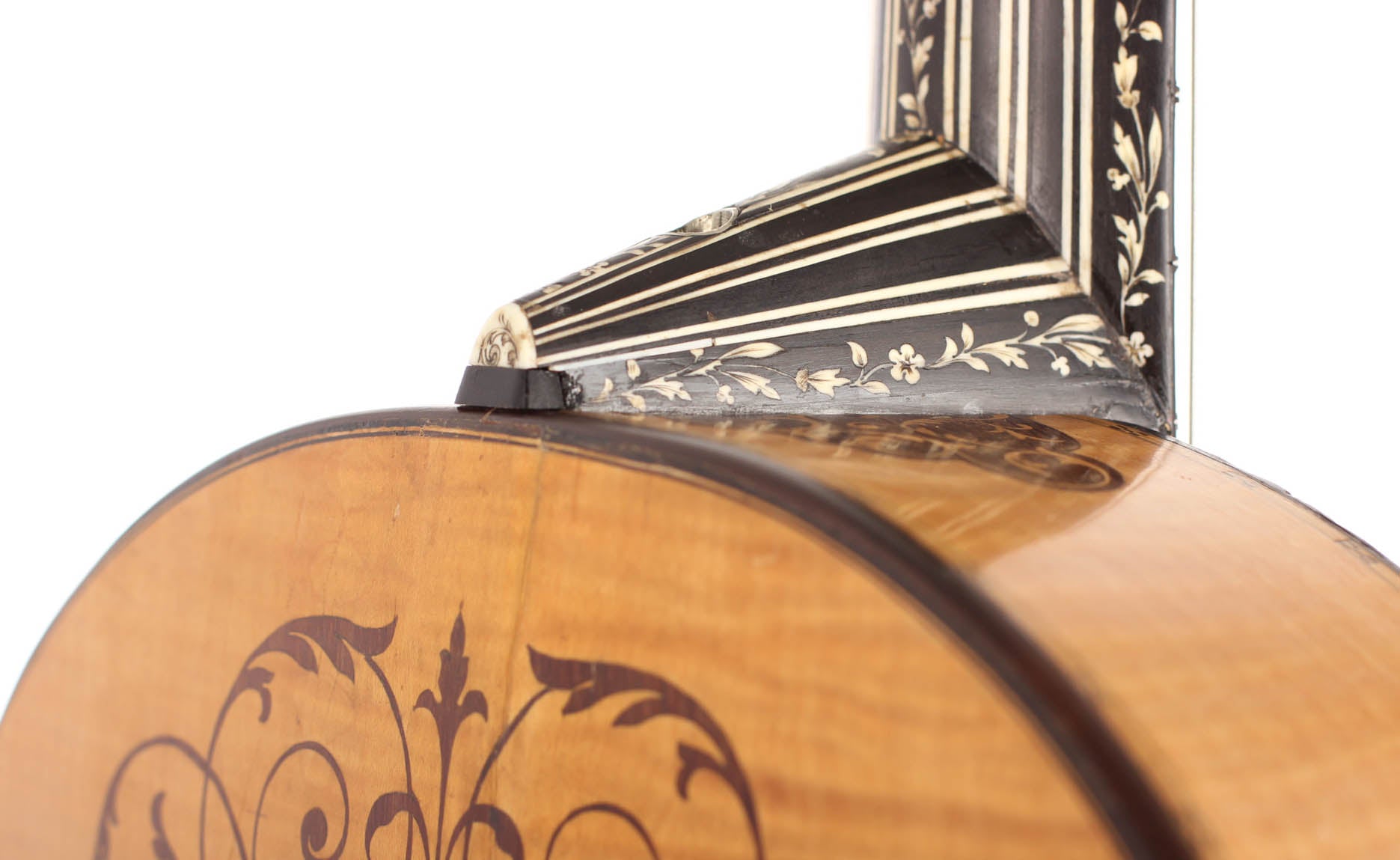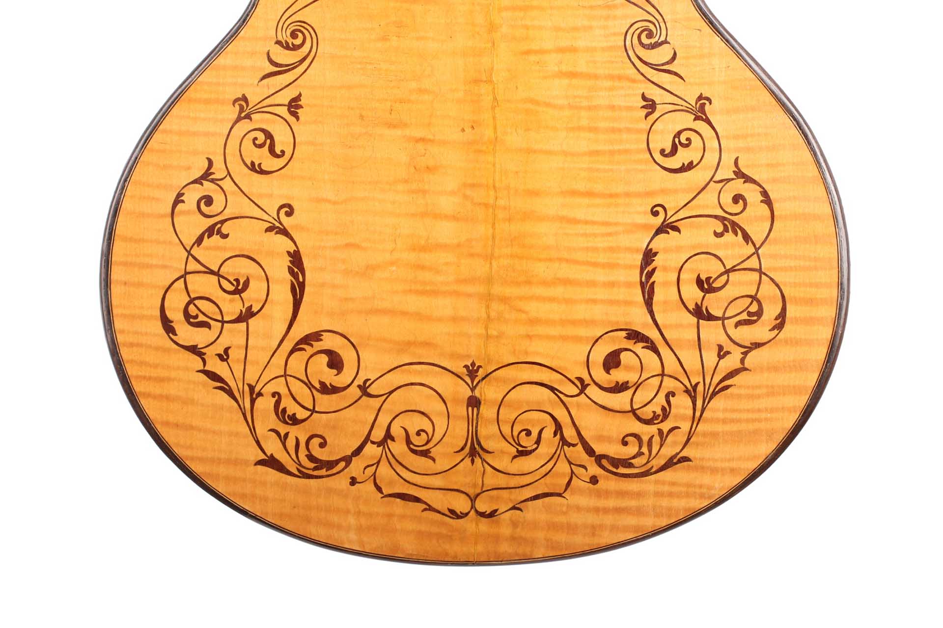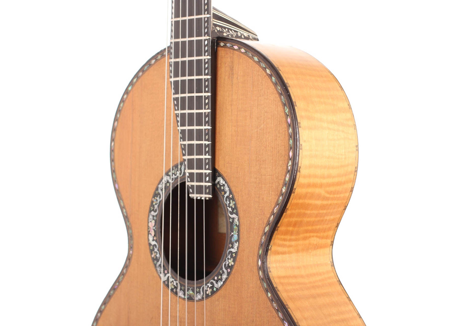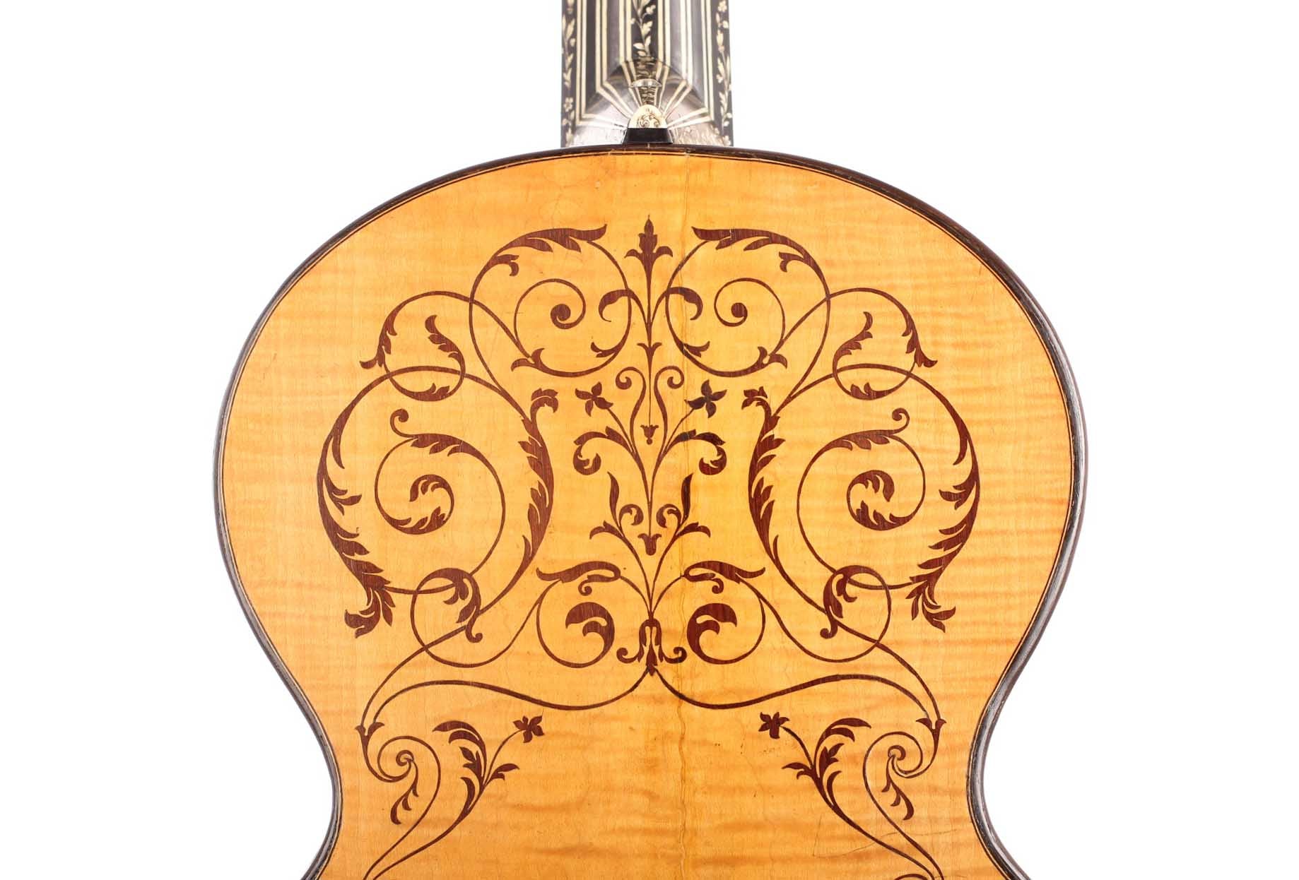 Henri Rudert wurde von 1810 geboren - das genaue Geburtsdatum ist nicht bekannt - und verstarb 1888 in Warschau, Polen. Rudert ist bekannt für seine außerordentlichen Fähigkeiten als Zupf- und Streichinstrumentenbauer. Für seine Arbeit wurde er im Jahre 1857 in Warschau mit einer Goldmedaille ausgezeichnet. Diese Gitarre aus dem Jahr 1841 ist eine der seltenen erhaltenen Instrumente, die meisten seiner Meisterwerke wurden im Zweiten Weltkrieg zerstört. Die Decke ist aus Fichte - Boden/Zargen sind aus Ahorn das Innen mit Fichte laminiert wurden. Reichlich verziert wurde die Gitarre an praktisch allen äußeren Bauteilen mit Perlmutt, Knochen und feinen Holzeinlagen. Die Gitarre befindet sich in einem sehr guten restaurierten Zustand. Ein Hartschalenkoffer ist inklusive.