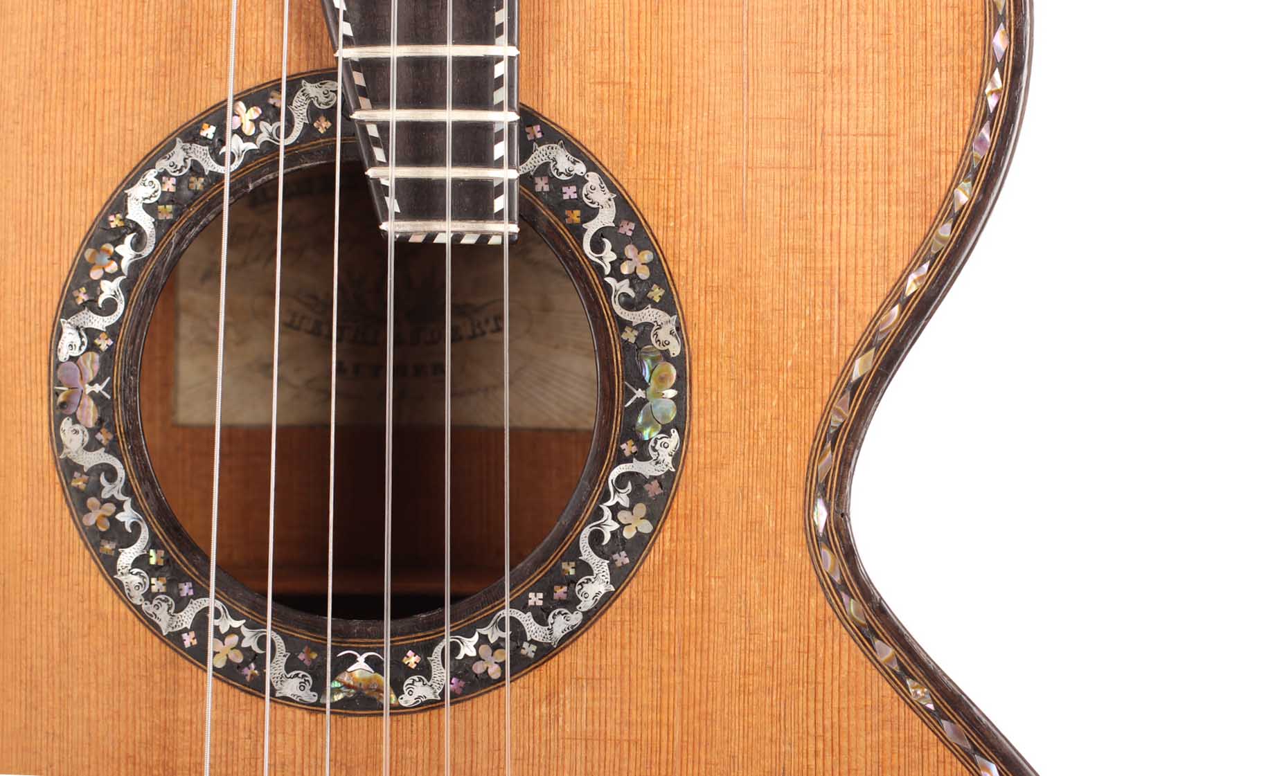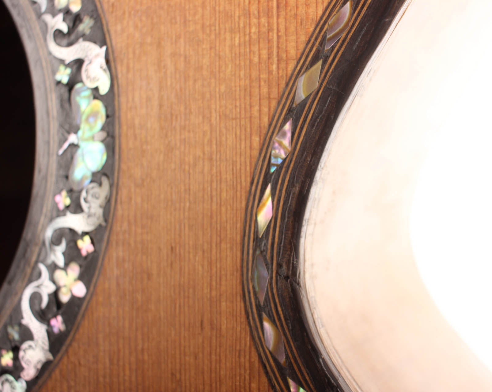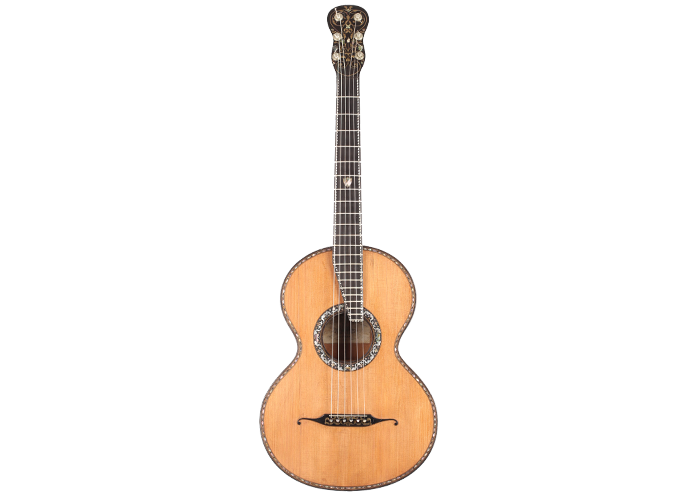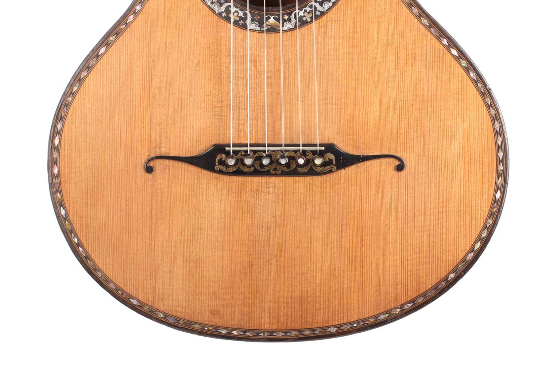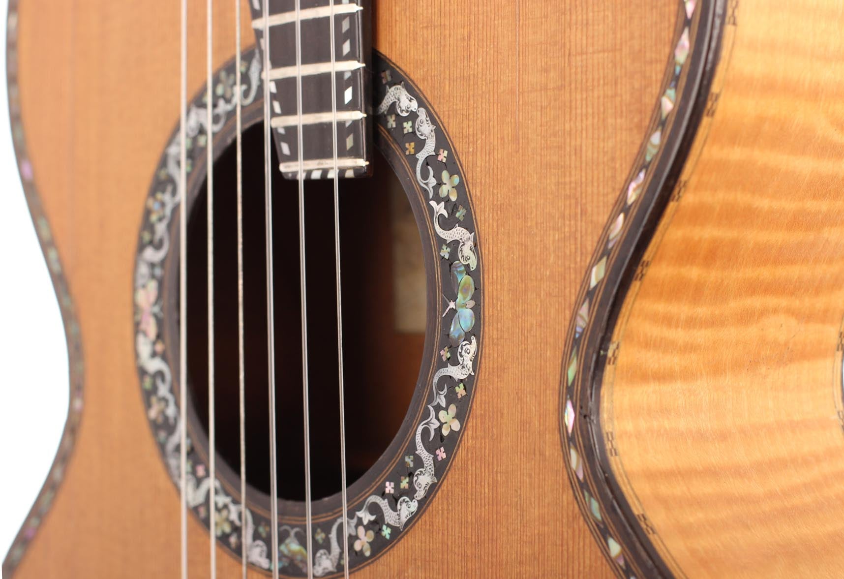 Henri Rudert wurde von 1810 geboren - das genaue Geburtsdatum ist nicht bekannt - und verstarb 1888 in Warschau, Polen. Rudert ist bekannt für seine außerordentlichen Fähigkeiten als Zupf- und Streichinstrumentenbauer. Für seine Arbeit wurde er im Jahre 1857 in Warschau mit einer Goldmedaille ausgezeichnet. Diese Gitarre aus dem Jahr 1841 ist eine der seltenen erhaltenen Instrumente, die meisten seiner Meisterwerke wurden im Zweiten Weltkrieg zerstört. Die Decke ist aus Fichte - Boden/Zargen sind aus Ahorn das Innen mit Fichte laminiert wurden. Reichlich verziert wurde die Gitarre an praktisch allen äußeren Bauteilen mit Perlmutt, Knochen und feinen Holzeinlagen. Die Gitarre befindet sich in einem sehr guten restaurierten Zustand. Ein Hartschalenkoffer ist inklusive.