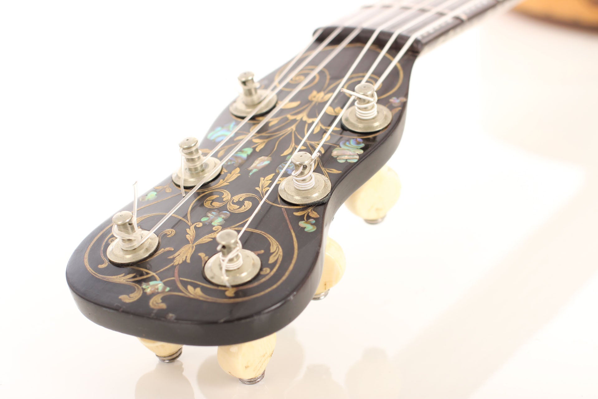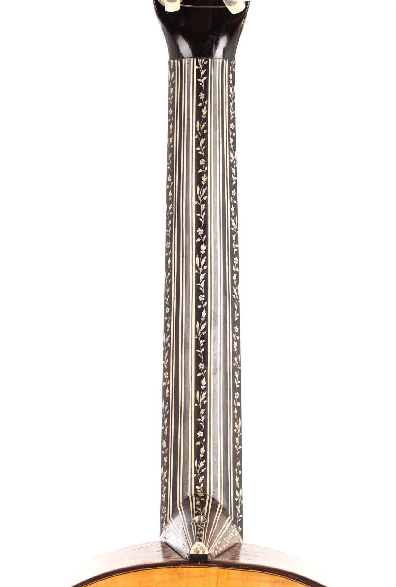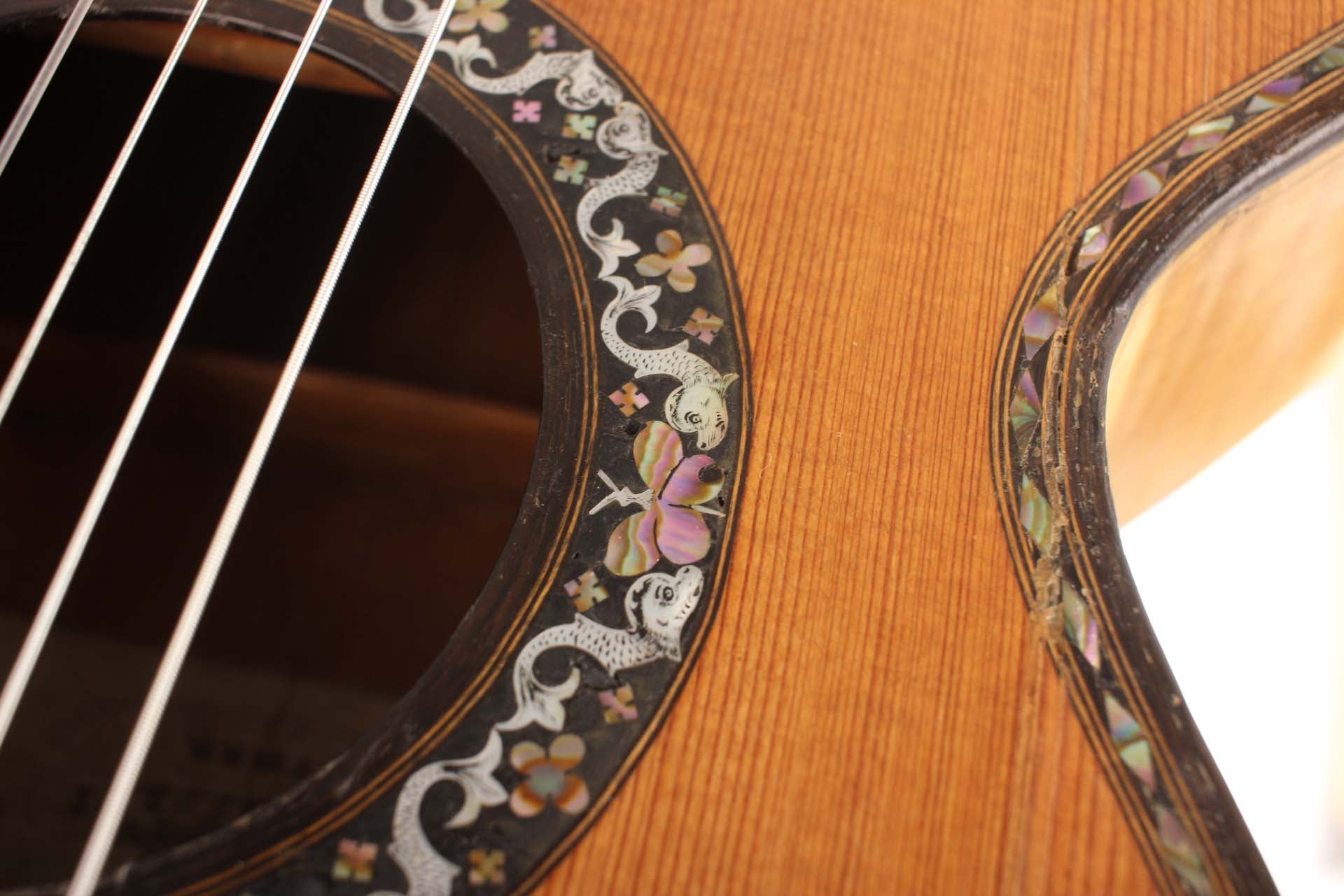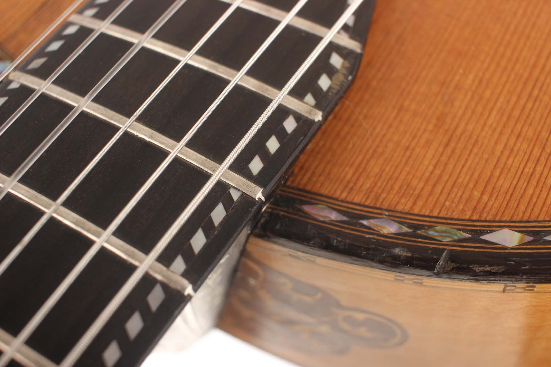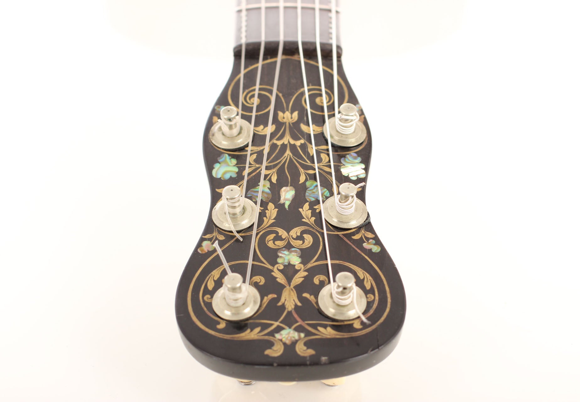 Henri Rudert wurde von 1810 geboren - das genaue Geburtsdatum ist nicht bekannt - und verstarb 1888 in Warschau, Polen. Rudert ist bekannt für seine außerordentlichen Fähigkeiten als Zupf- und Streichinstrumentenbauer. Für seine Arbeit wurde er im Jahre 1857 in Warschau mit einer Goldmedaille ausgezeichnet. Diese Gitarre aus dem Jahr 1841 ist eine der seltenen erhaltenen Instrumente, die meisten seiner Meisterwerke wurden im Zweiten Weltkrieg zerstört. Die Decke ist aus Fichte - Boden/Zargen sind aus Ahorn das Innen mit Fichte laminiert wurden. Reichlich verziert wurde die Gitarre an praktisch allen äußeren Bauteilen mit Perlmutt, Knochen und feinen Holzeinlagen. Die Gitarre befindet sich in einem sehr guten restaurierten Zustand. Ein Hartschalenkoffer ist inklusive.