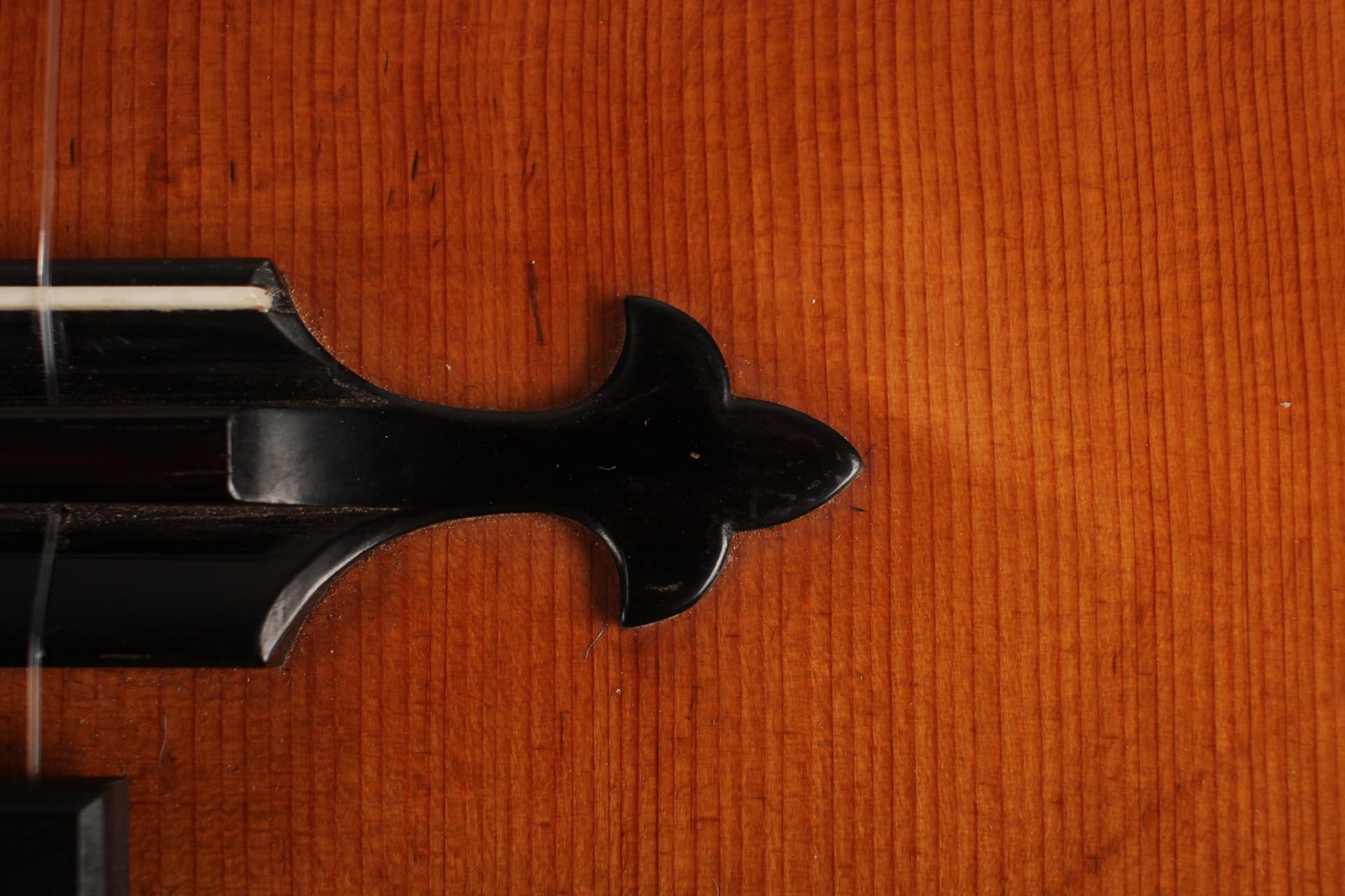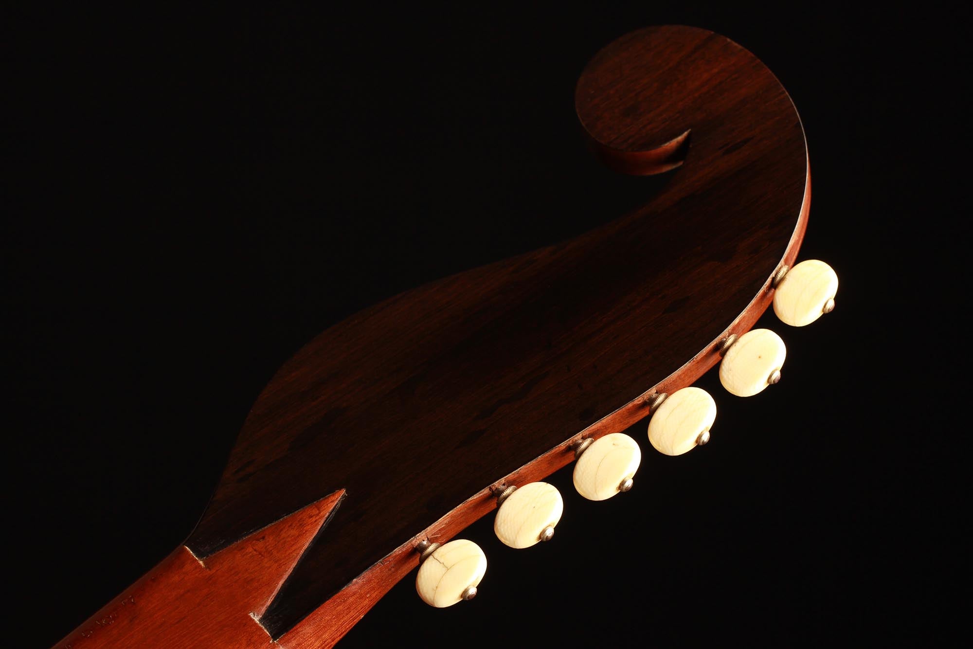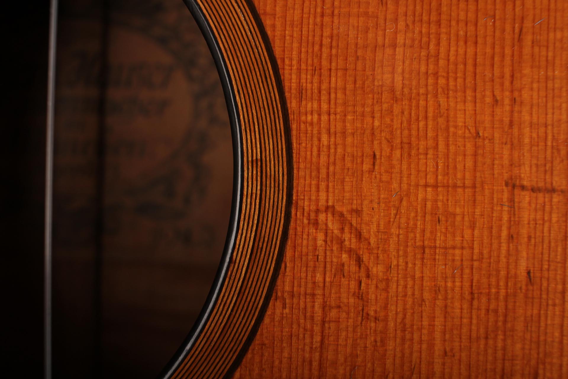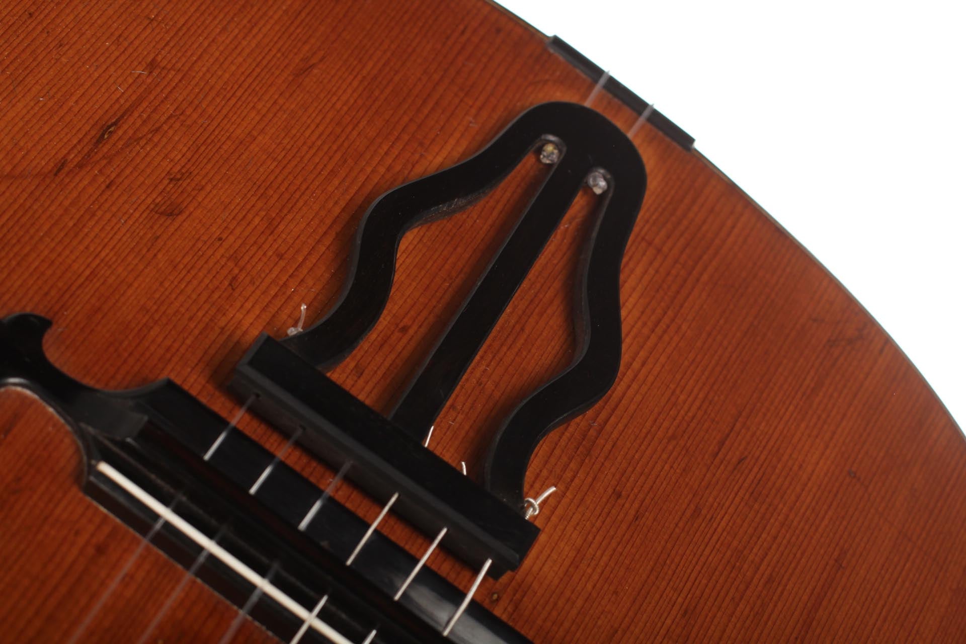 The inboard tuners, made by Landsdorfer, provide comfortable tuning of the instrument. The big body has the measurements of a concert guitar similar to big Spanish concert models. The top is made of German Alpine Spruce, while the back and sides are made of maple. Another feature is the tailpiece. The guitar is in good condition for its age, and has only few repaired and stable cracks on the top. Only minor signs of playing are visible. A hard-shell case is included.