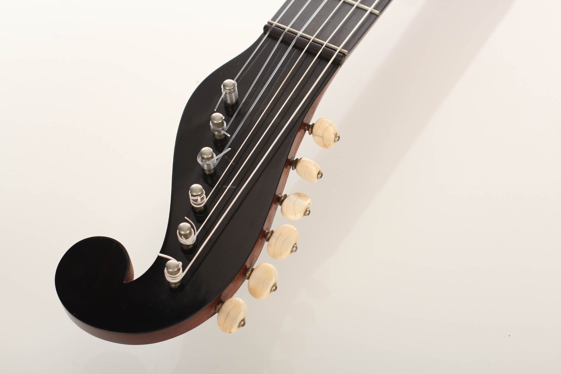 The head of this guitar has a Stauffer head silhouette, which is elegantly curved. This Stauffer motive can also be found here with this replica of a Stauffer model by Herman Hauser ® II.