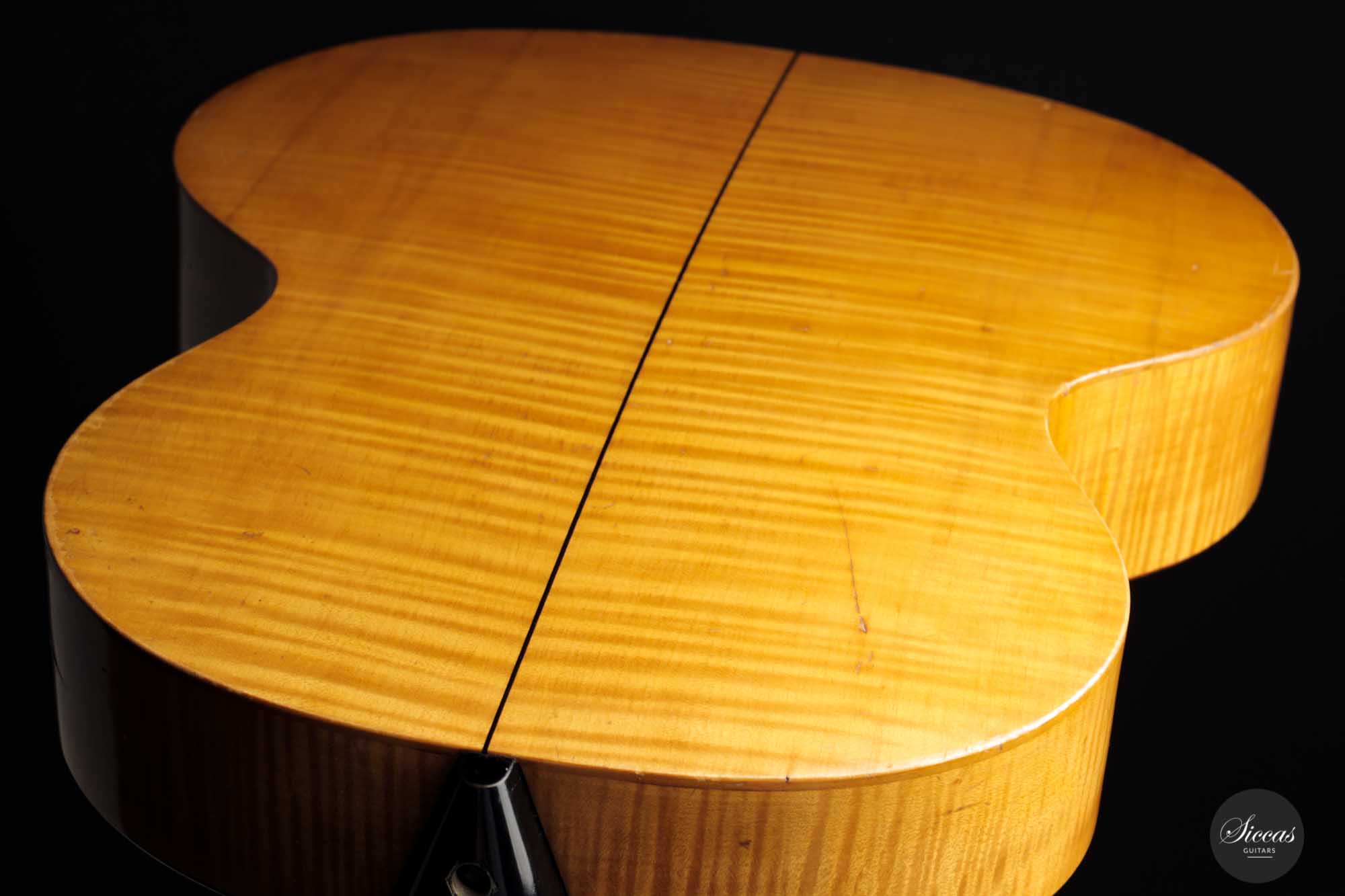 Diese Gitarre ist in einem fantastischen Zustand für ihr Alter. Sie hat eine schöne Patina und eine wunderbare Honigfarbenen Kopus. Spielspuren und oberflächliche Kratzer sind auf dem gesamten Instrument zu erkennen. Dennoch hat sie nur einen winzigen Riss an der Seite und eine Reparatur unter dem Griffbrett, die unauffällig und strukturell unbedenklich ist. Am Halsfuß sind zwei Linien zu sehen, wo der Lack in die Fuge der beiden Bodenteile gesunken ist, doch unser Experte hat dort kein strukturelles Problem festgestellt. Dieses Instrument ist vollständig original, einschließlich der einwandfrei funktionierenden originalen Landstorfer Mechaniken.