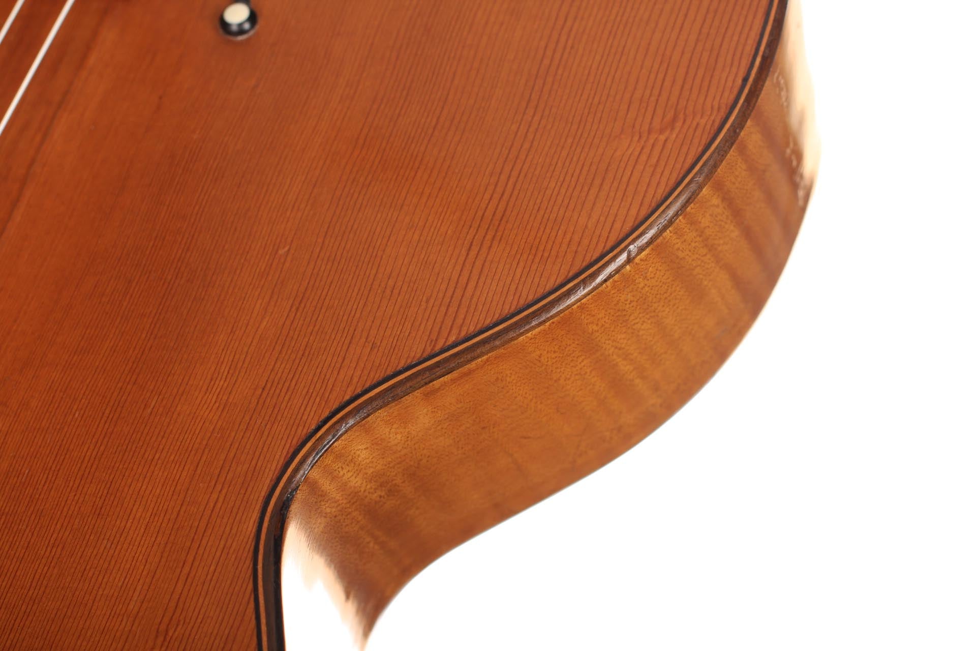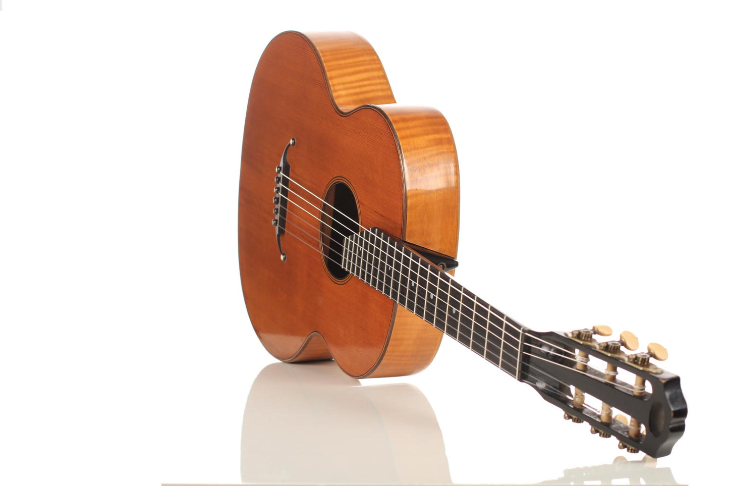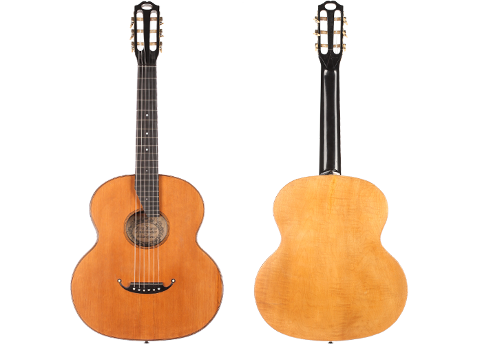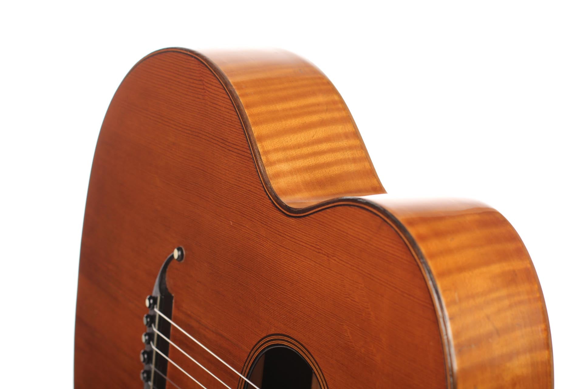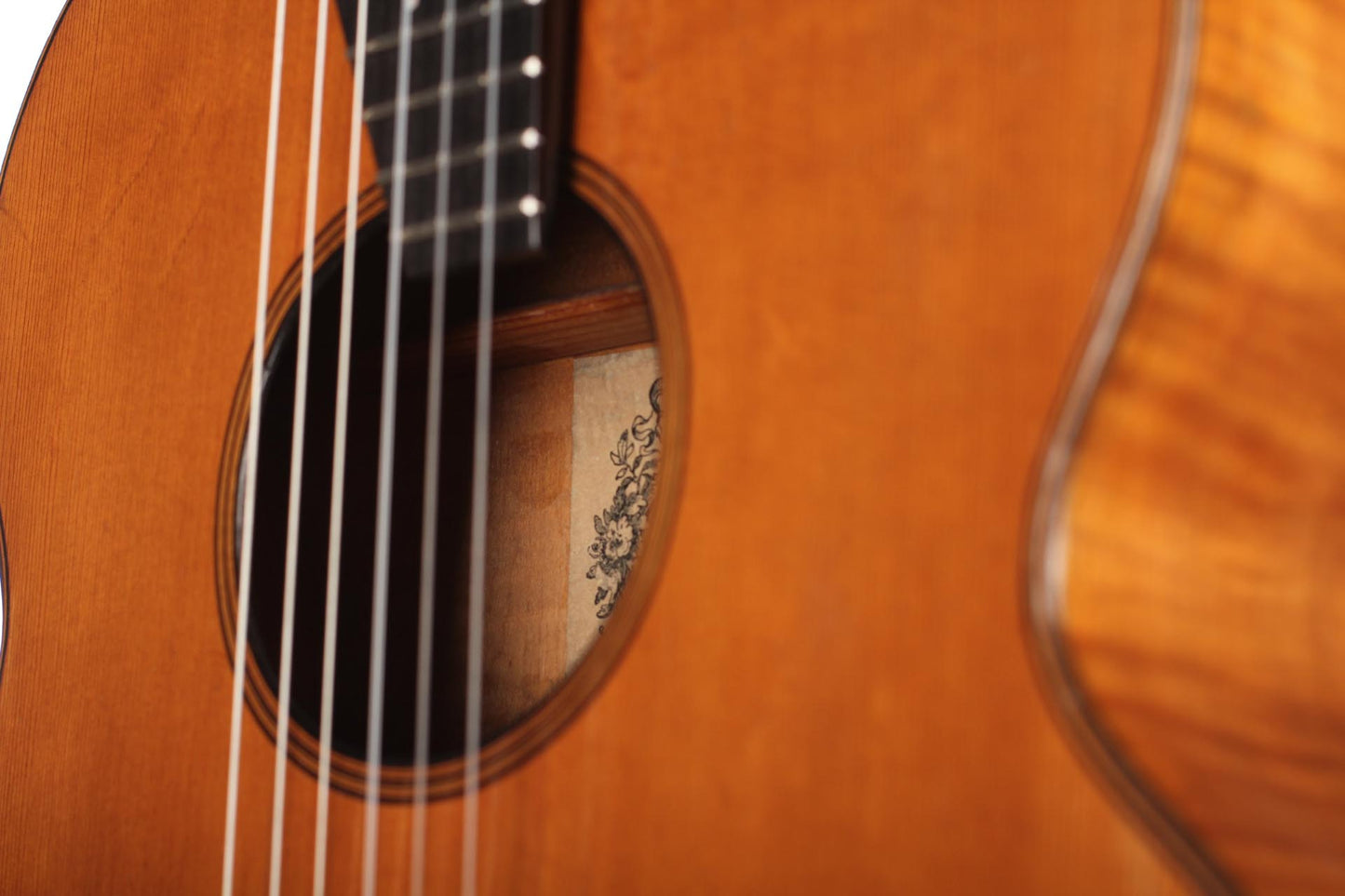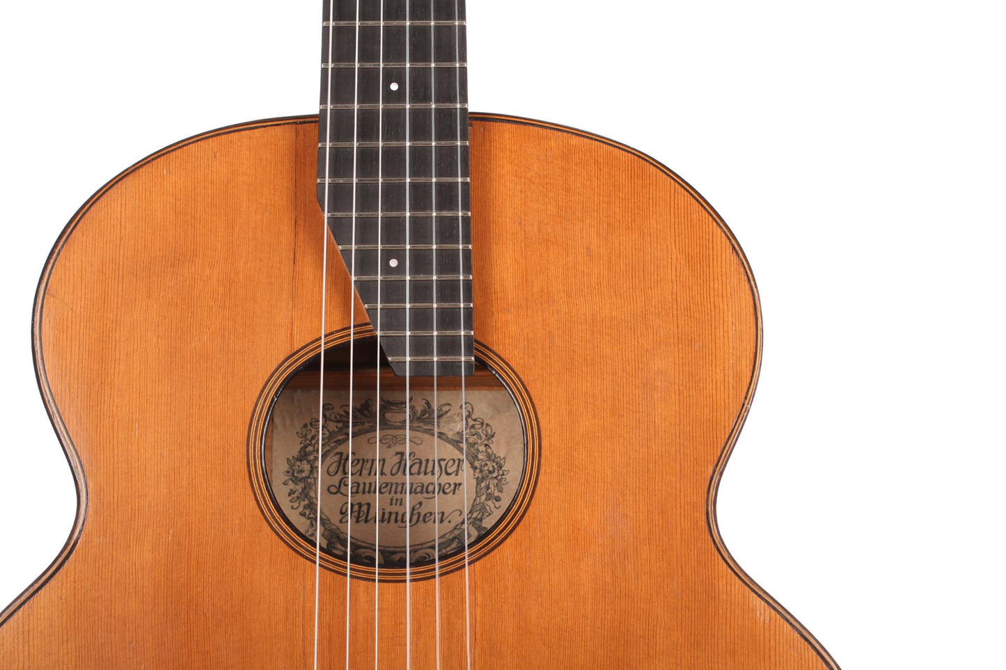 Diese Terz-Gitarre wurde im Jahr 1922 gebaut. Die Wiener Gitarren Hermann Hauser ® I zeichnen sich als besonders leicht zu spielende Instrumente aus. Sie haben einen kräftigen und langanhaltenden Klang. Durch seine Vielfältigkeit kann dieses Instrument sowohl als Soloinstrument als auch kammermusikalisch eingesetzt werden. Die einteilige Decke besteht aus Fichte die von dunklen und hellen Einlagen umrandet wird, ebenso wie auch das Schallloch. Der zweiteilige Boden sowie der aus zwei Teilen bestehende Zargen sind aus stark geflammtem Ahorn. Der Kopf ist mit einem deutschen Anschäfter mit dem Hals verbunden. Der Hals ist mit dem Korpus verschraubt und individuell einstellbar. Das Griffbrett besitzt einen Nullbund und reicht schwebend bis über das Schallloch. Die weist Reparturen auf der Decke und dem Boden auf. Die originalen Mechaniken sind von Reischl-Landstorfer.