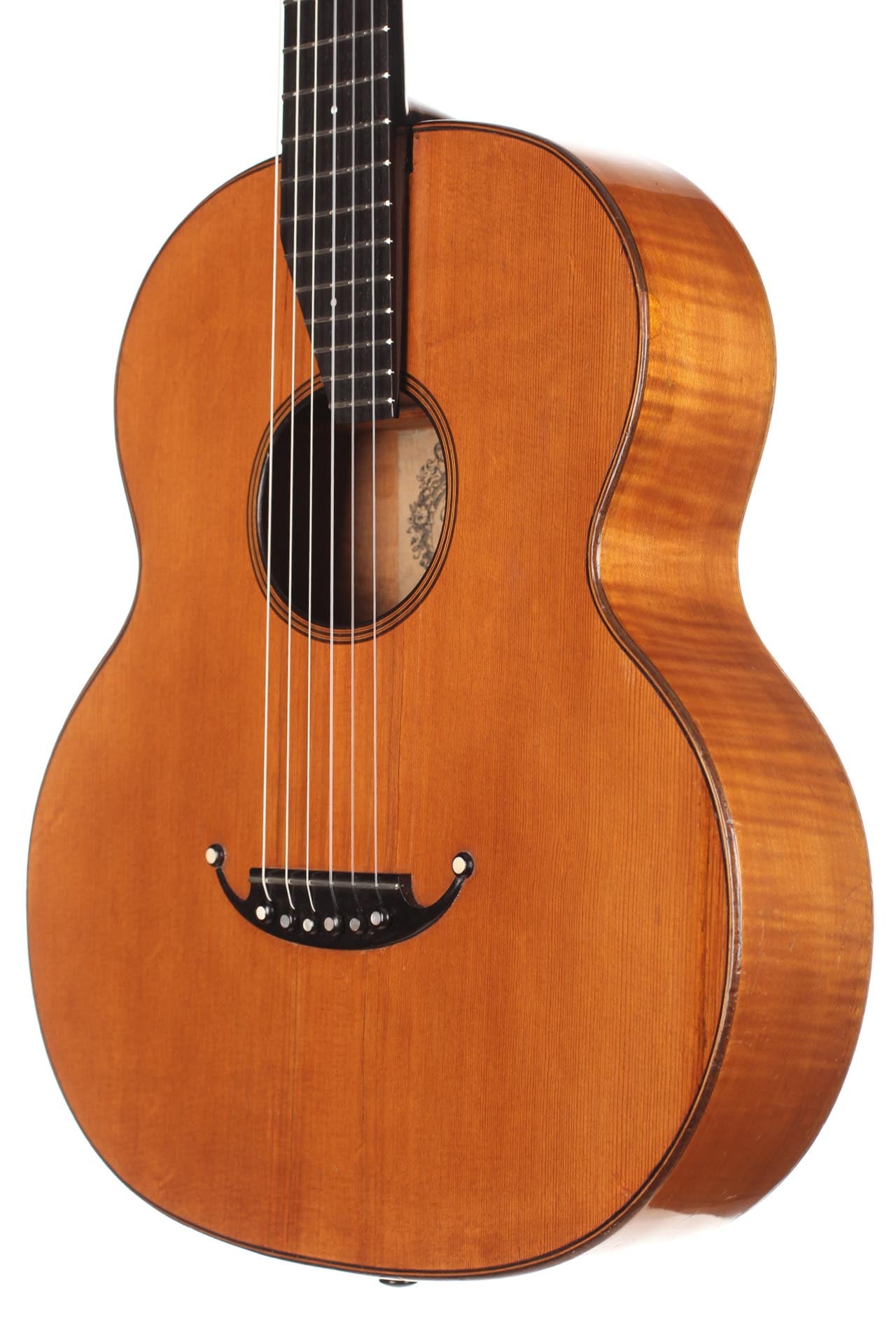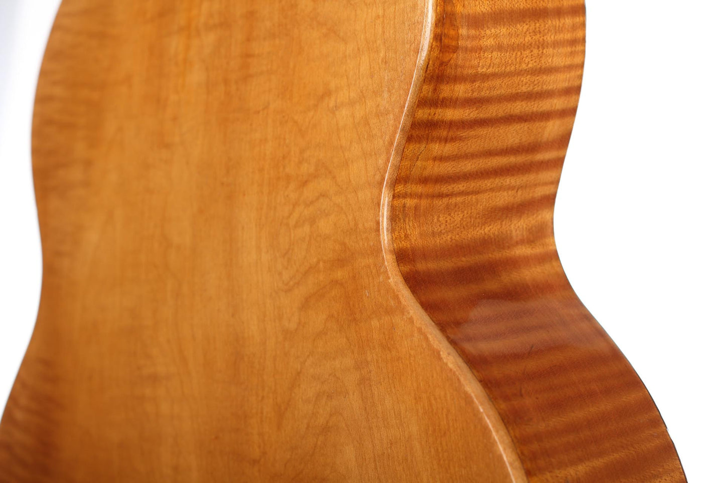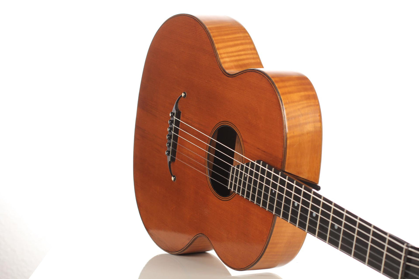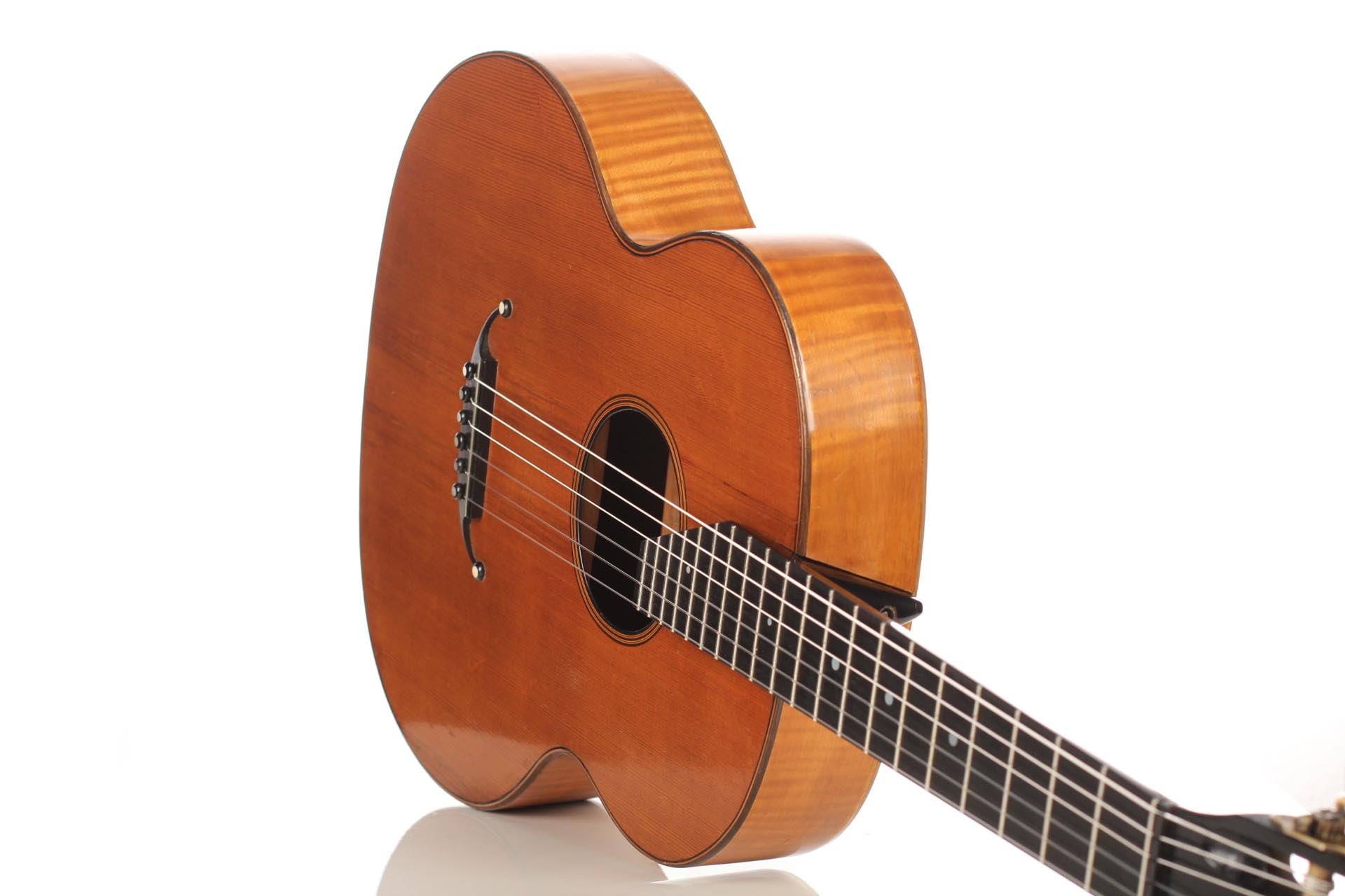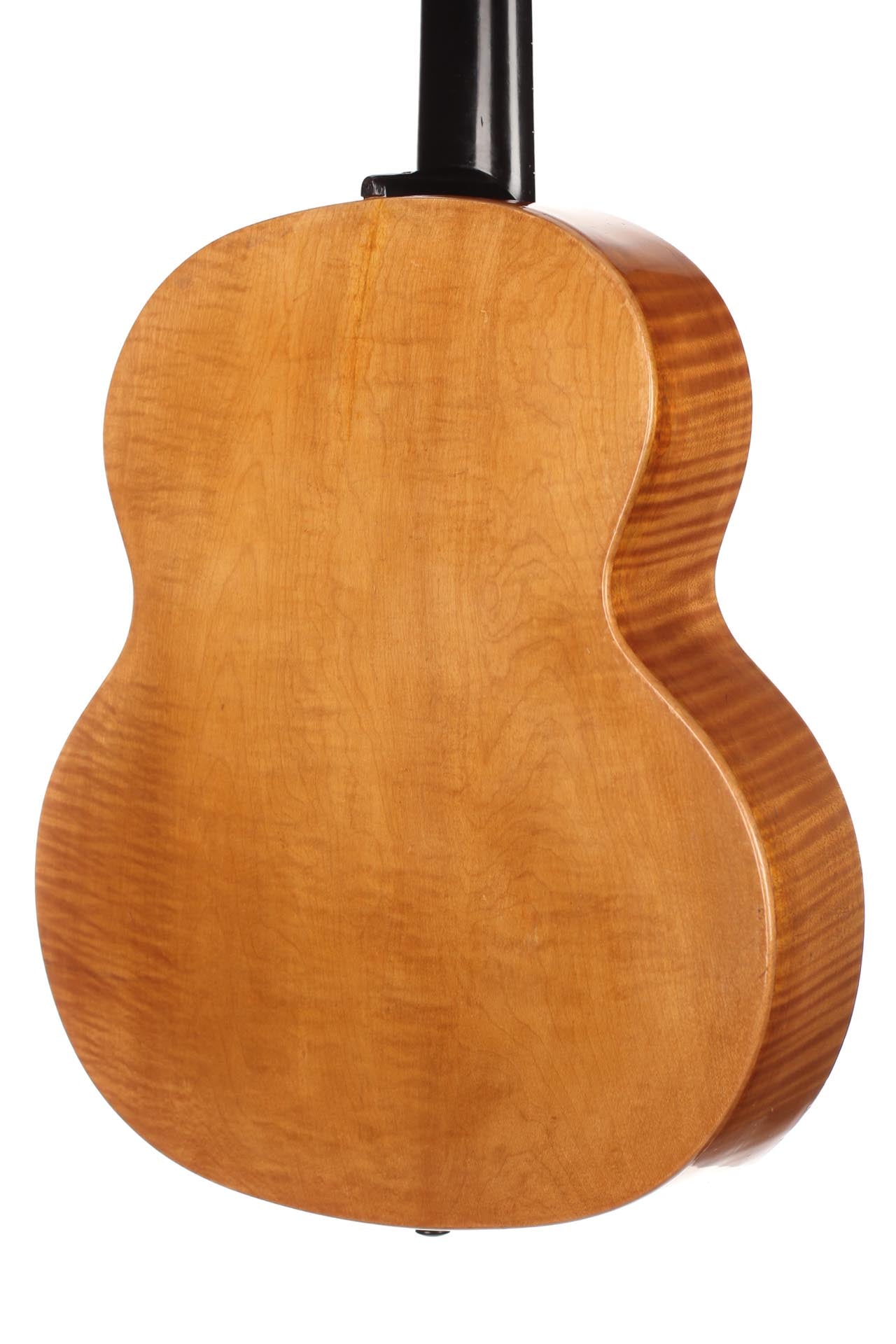 Diese Terz-Gitarre wurde im Jahr 1922 gebaut. Die Wiener Gitarren Hermann Hauser ® I zeichnen sich als besonders leicht zu spielende Instrumente aus. Sie haben einen kräftigen und langanhaltenden Klang. Durch seine Vielfältigkeit kann dieses Instrument sowohl als Soloinstrument als auch kammermusikalisch eingesetzt werden. Die einteilige Decke besteht aus Fichte die von dunklen und hellen Einlagen umrandet wird, ebenso wie auch das Schallloch. Der zweiteilige Boden sowie der aus zwei Teilen bestehende Zargen sind aus stark geflammtem Ahorn. Der Kopf ist mit einem deutschen Anschäfter mit dem Hals verbunden. Der Hals ist mit dem Korpus verschraubt und individuell einstellbar. Das Griffbrett besitzt einen Nullbund und reicht schwebend bis über das Schallloch. Die weist Reparturen auf der Decke und dem Boden auf. Die originalen Mechaniken sind von Reischl-Landstorfer.