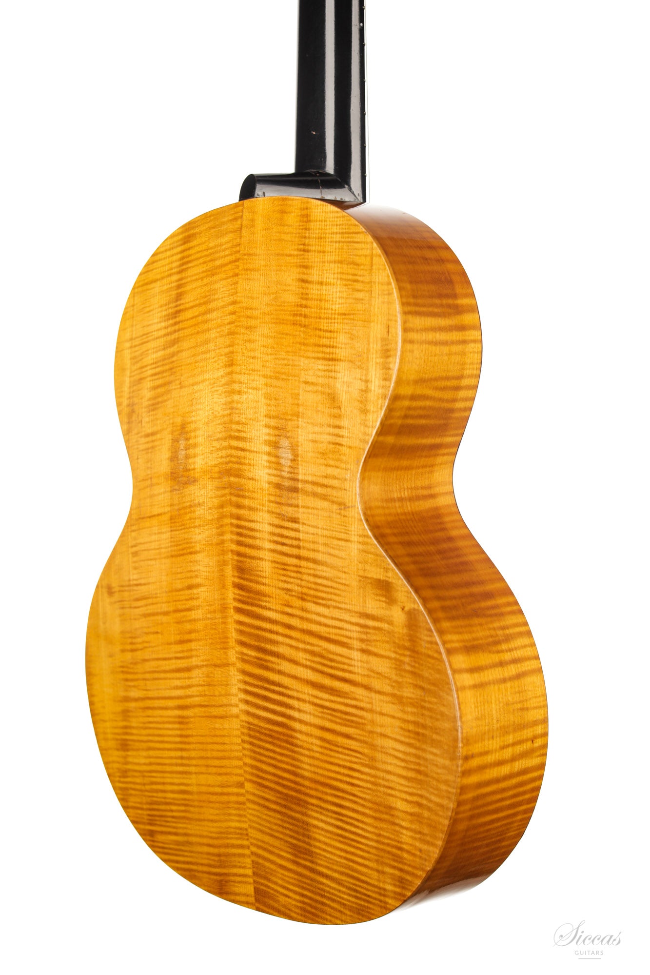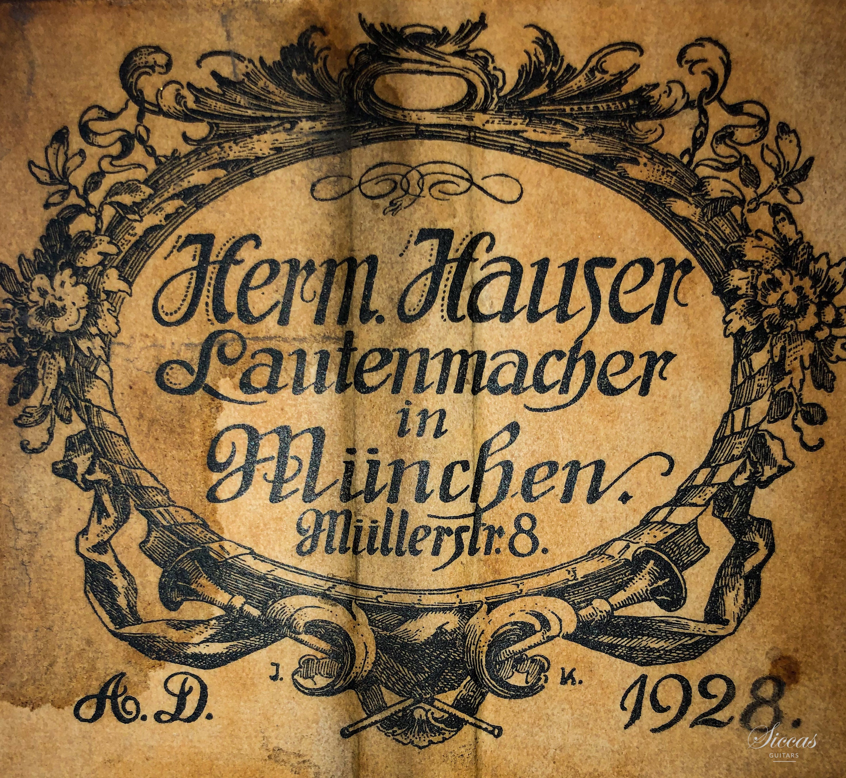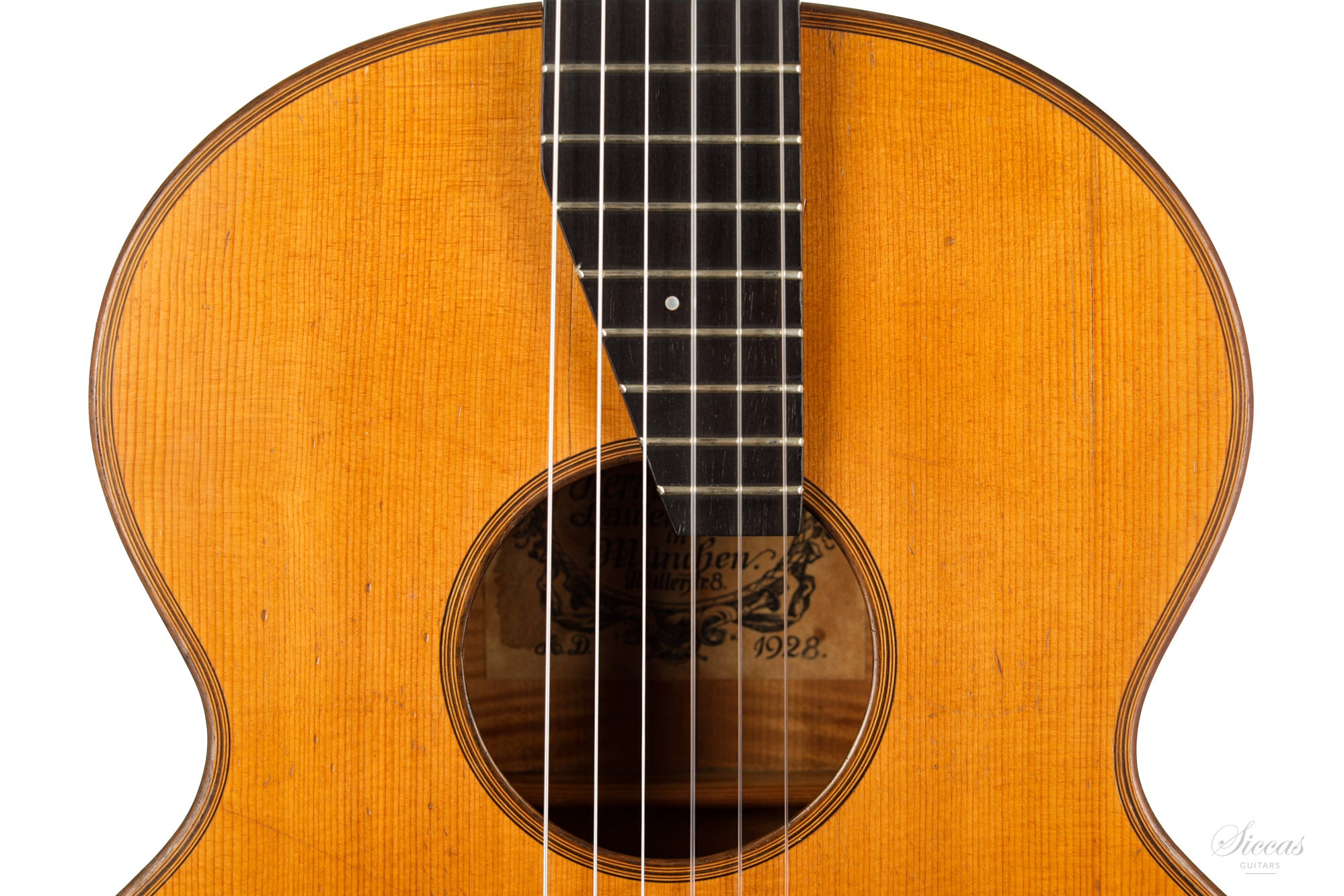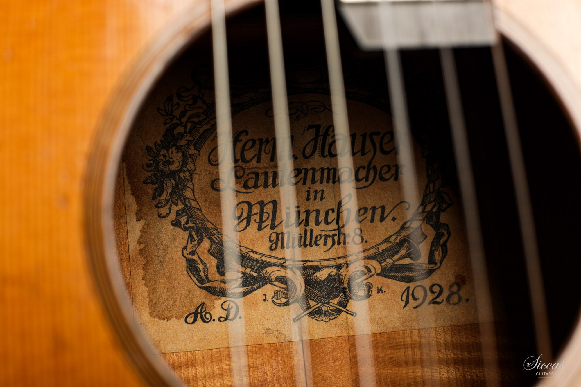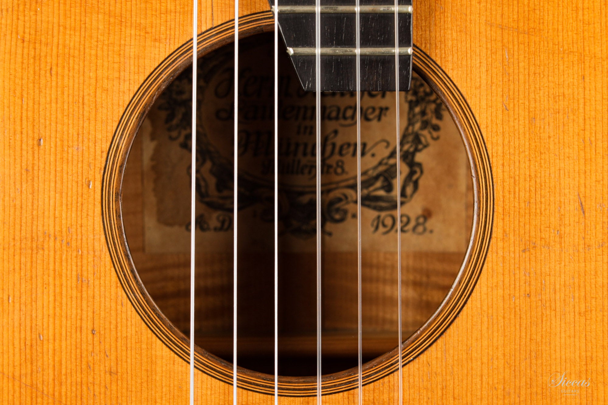 This fantastic 1928 guitar is a wonderful example of Hermann Hauser ® I’s excellence in Viennese guitar making. It is in great condition and very attractive for collectors as well as for active players. A hand full of very well repaired cracks are to be reported and small playing marks are visible. Back and sides are free of crack and display a gorgeous, flamed maple.