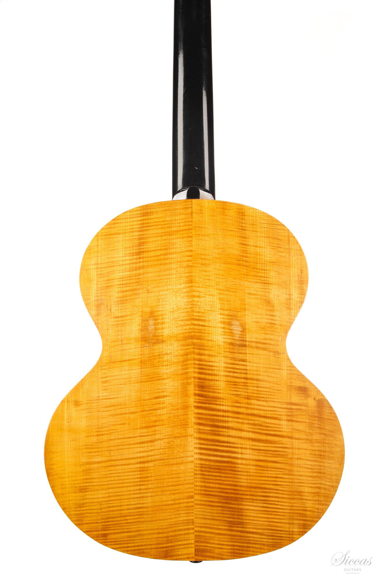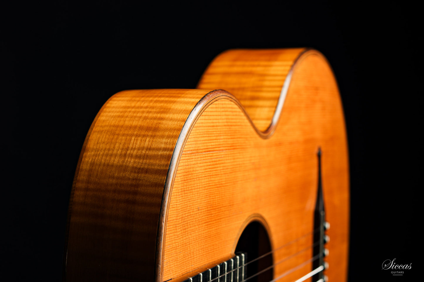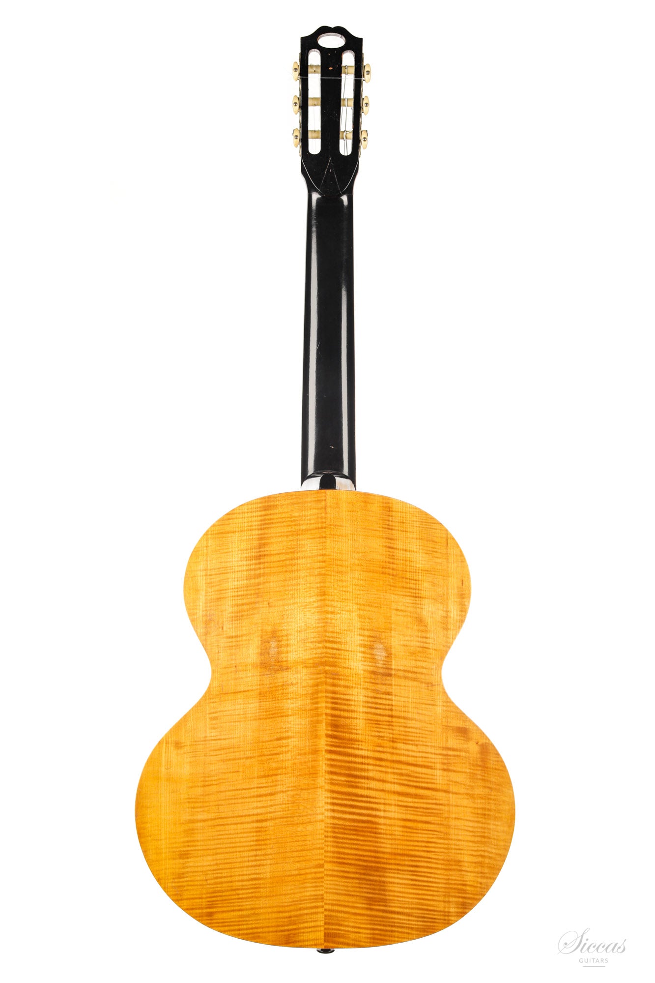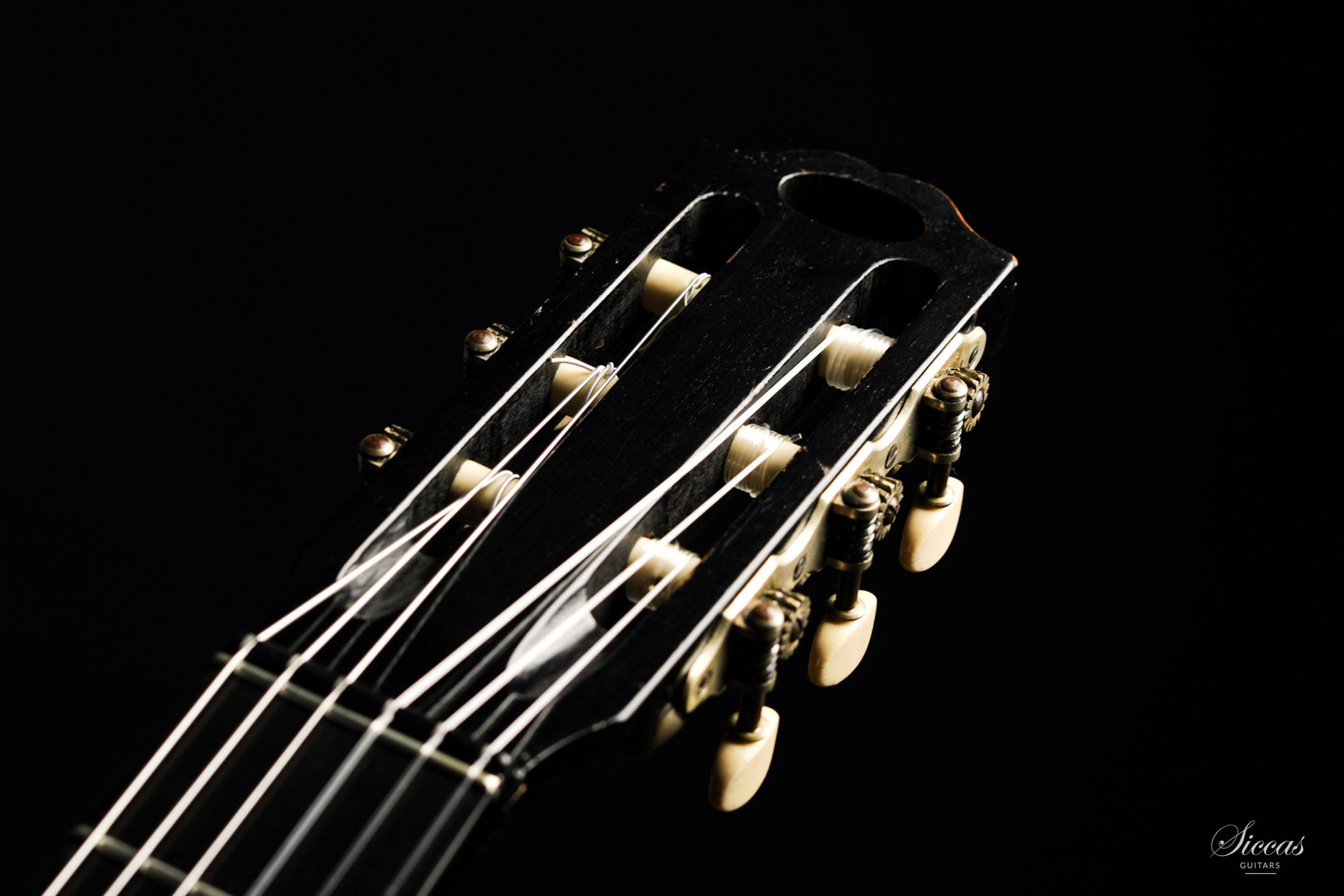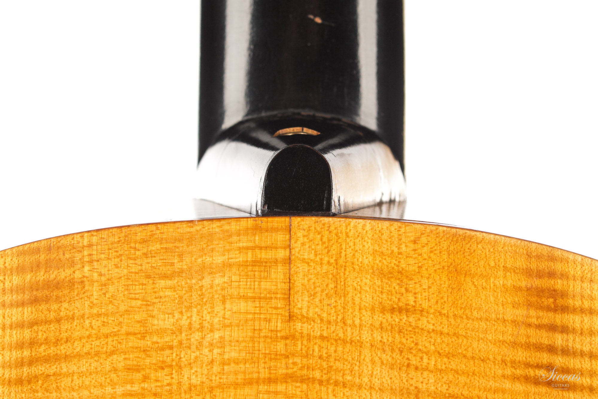 This fantastic 1928 guitar is a wonderful example of Hermann Hauser ® I’s excellence in Viennese guitar making. It is in great condition and very attractive for collectors as well as for active players. A hand full of very well repaired cracks are to be reported and small playing marks are visible. Back and sides are free of crack and display a gorgeous, flamed maple.