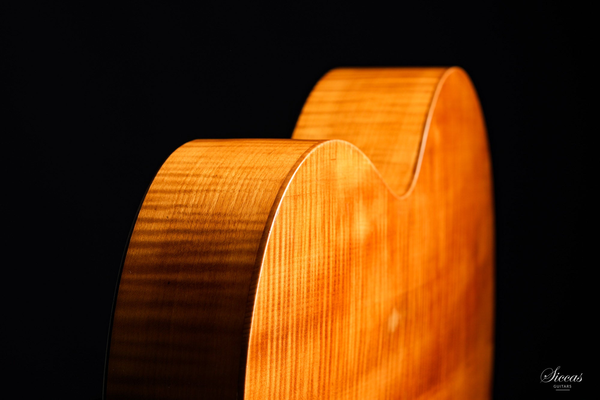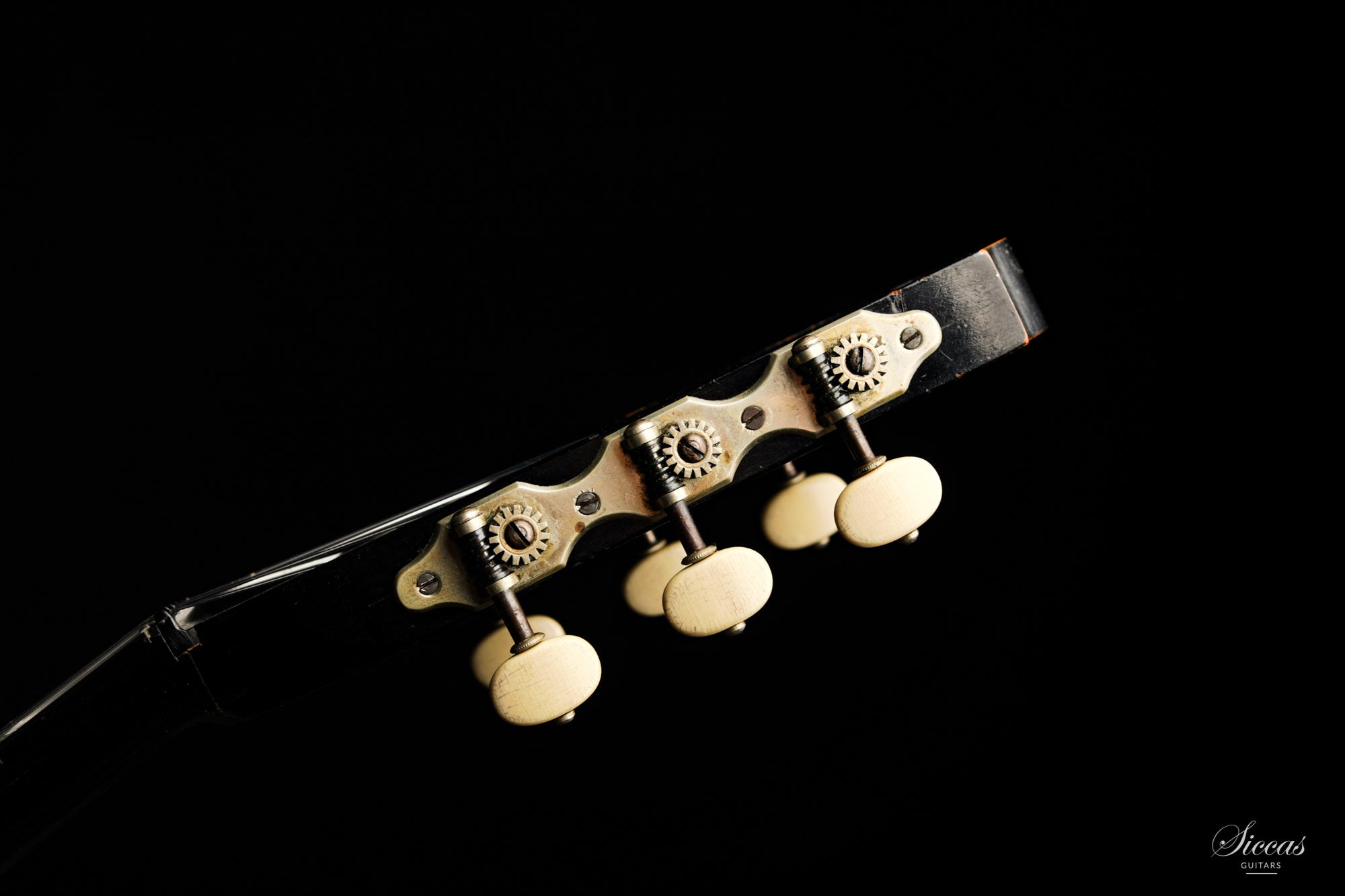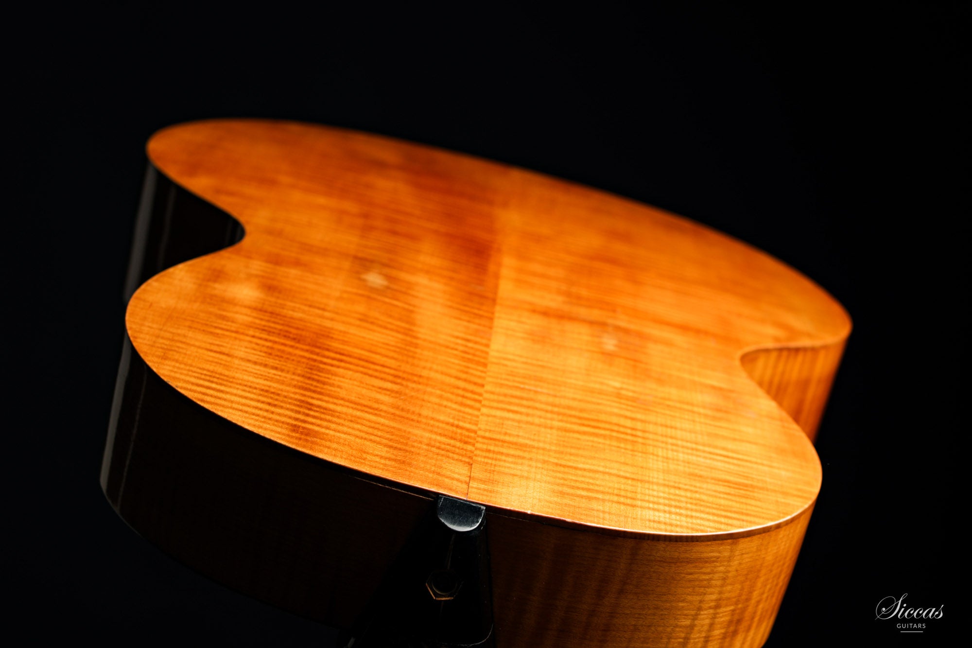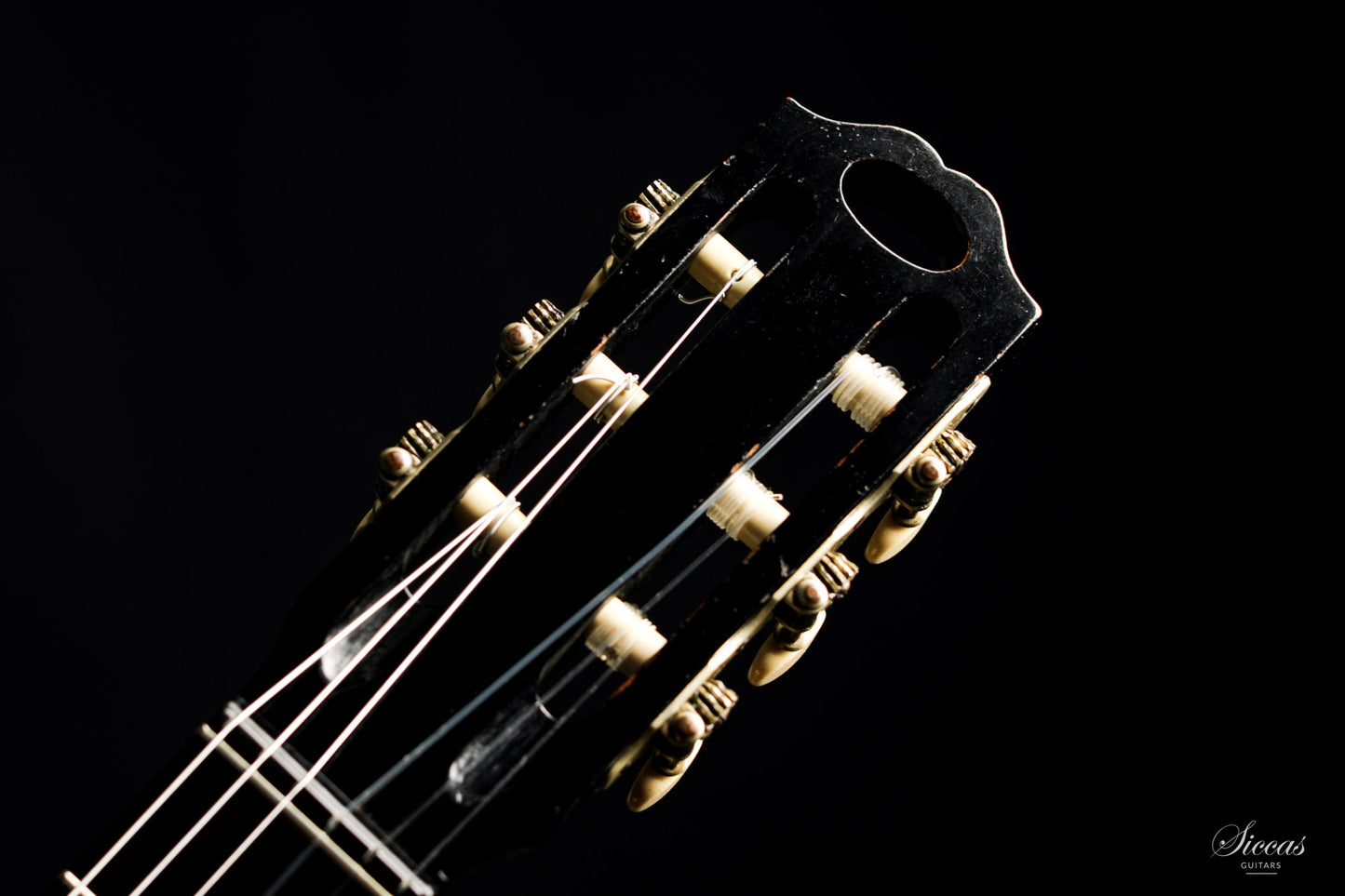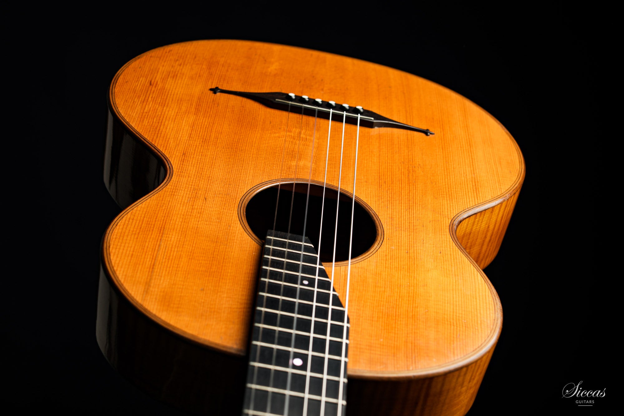 This fantastic 1928 guitar is a wonderful example of Hermann Hauser ® I’s excellence in Viennese guitar making. It is in great condition and very attractive for collectors as well as for active players. A hand full of very well repaired cracks are to be reported and small playing marks are visible. Back and sides are free of crack and display a gorgeous, flamed maple.