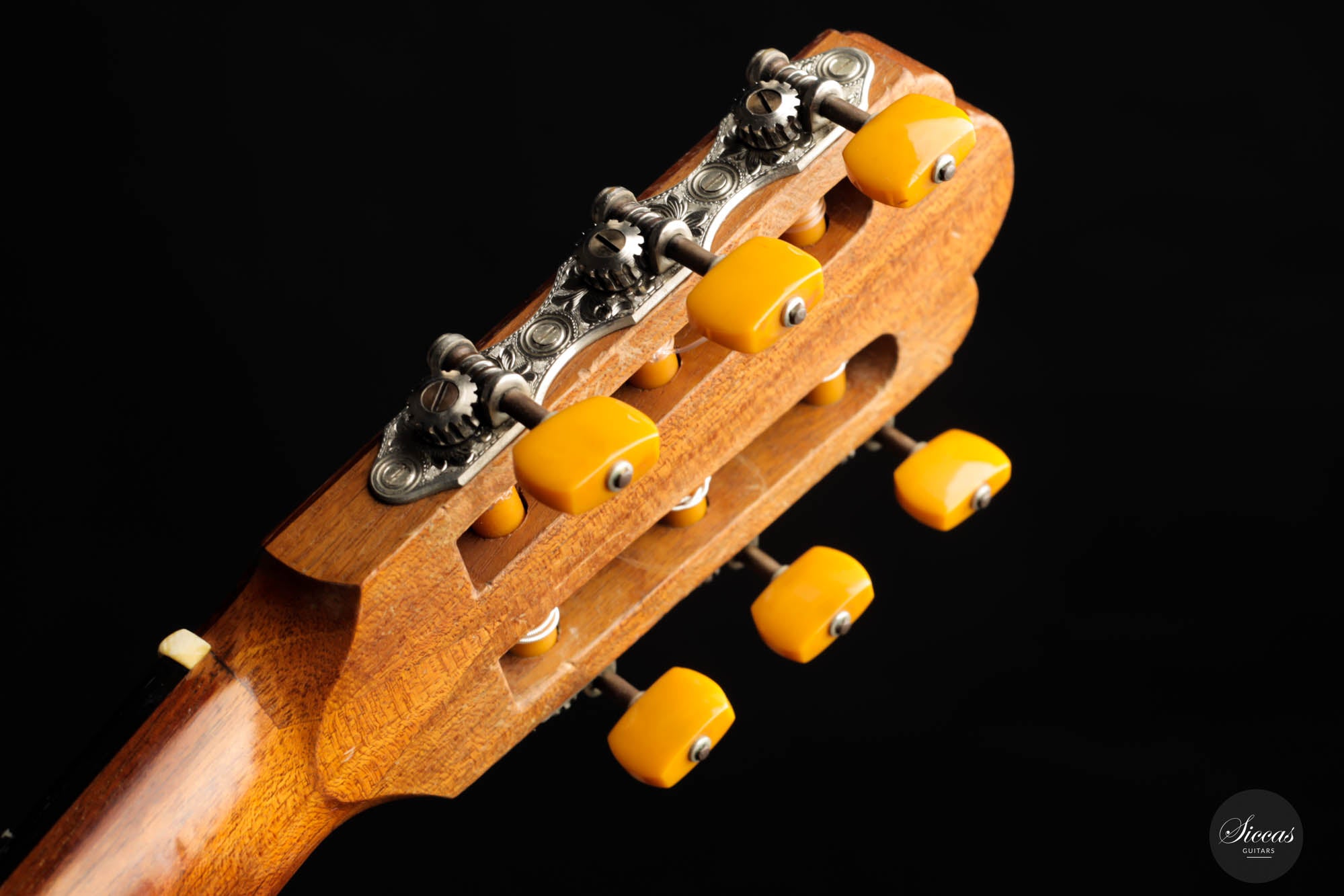 This 1954 model was owned by a Greek professional guitarist and professor, Charalambos Ekmetzoglou. It has only a small professionally repaired crack on the fingerboard. The spruce top shows only some playing wear and is completely free of cracks and repairs, as are its back and sides. The width of the neck was adapted to the needs of Charalambos Ekmetzoglou, so that the nut width is now 49 mm. In the course of this work, the fingerboard was also renewed and newly fretted. The varnish was freshened up. This is a remarkable guitar in very good condition from 1954, two years after Hermann Hauser II took over his father's workshop, and is a great and rare opportunity to acquire a guitar that is both historically and tonally interesting and exceptional.