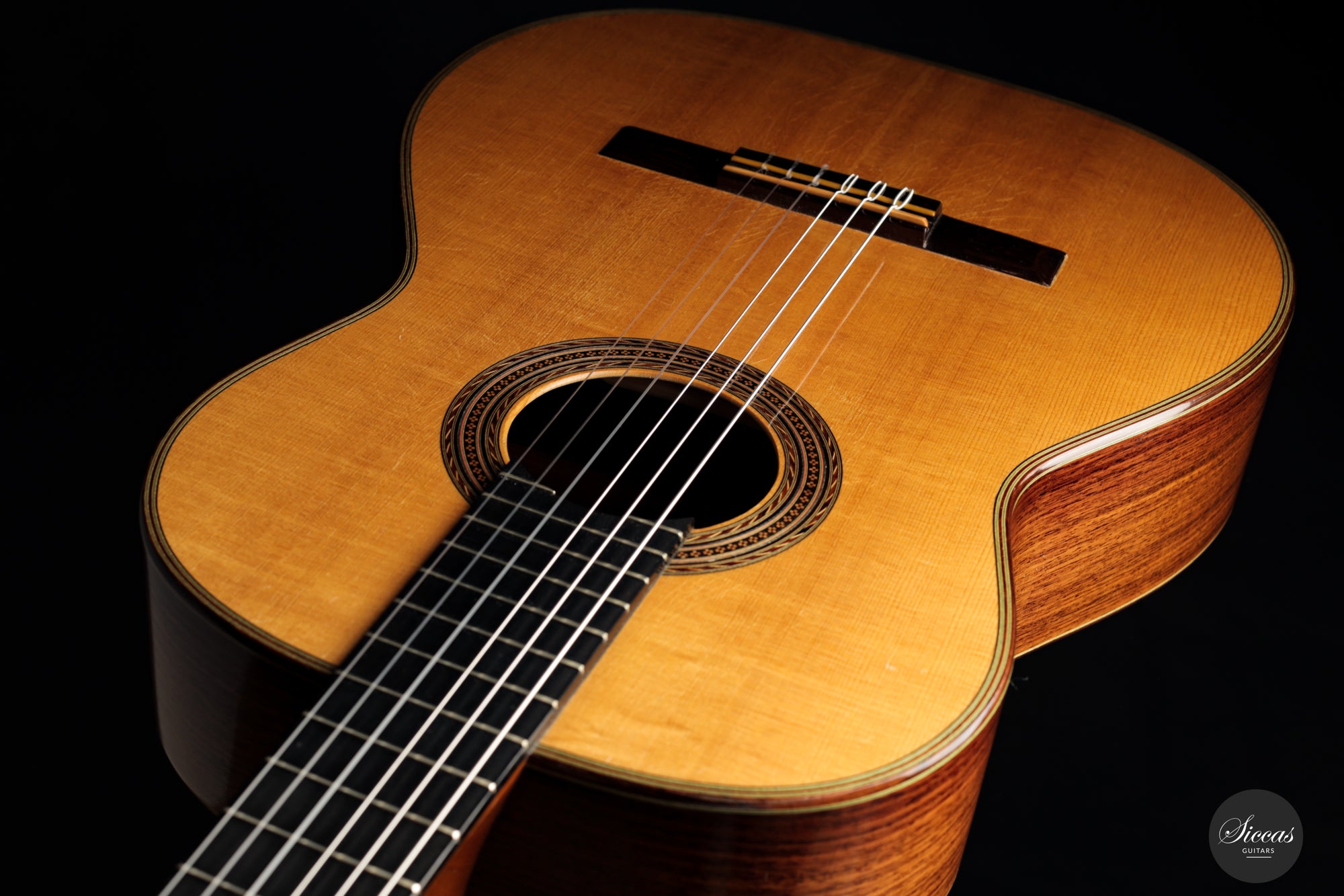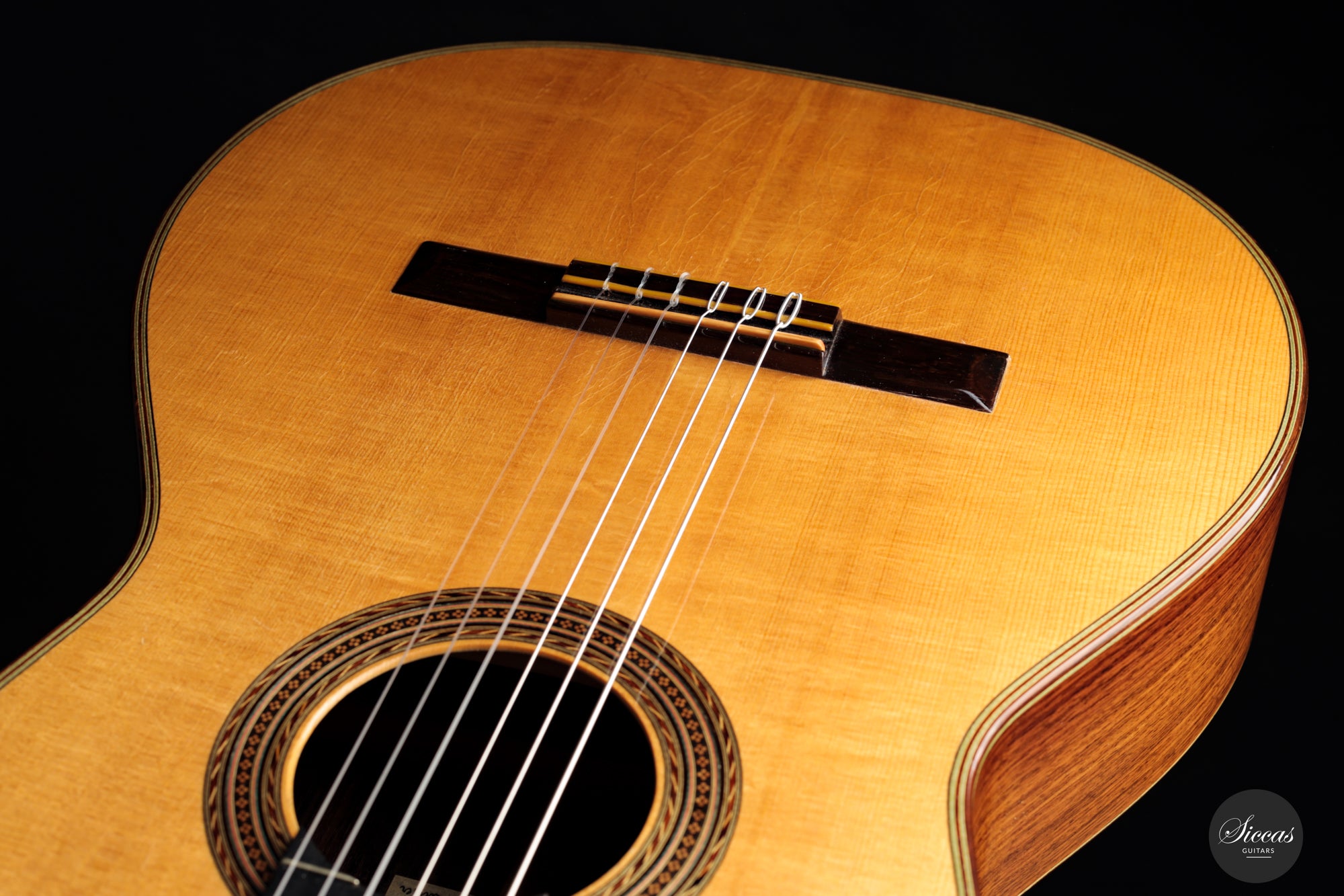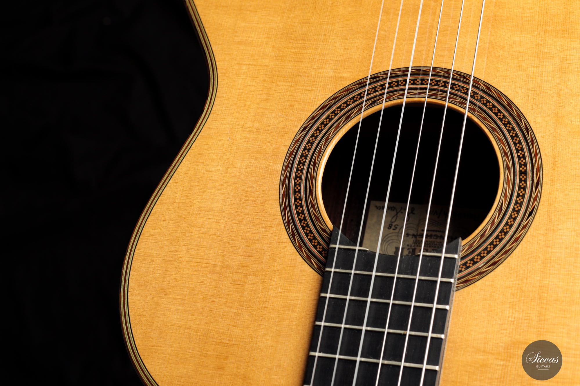 Diese außergewöhnliche Gitarre, gefertigt von Hermann Hauser II, einem der angesehensten Luthiers des zwanzigsten Jahrhunderts, ist eine wahre Darstellung seines unvergleichlichen Könnens und seiner Kunstfertigkeit. Sie verkörpert den Höhepunkt des Gitarrenbaus und zeigt Hausers Fähigkeit, traditionelles Handwerk mit seiner einzigartigen Note zu verbinden. Das Instrument zeichnet sich durch seinen klaren, glockenähnlichen Grundklang aus, der durch eine außergewöhnlich gute Trennung gekennzeichnet ist, wodurch jeder Ton deutlich und resonant wird. Zu seiner akustischen Anziehungskraft tragen auch die lyrischen, warmen und charmanten Höhen der Gitarre bei, die wunderschön mit den tiefen und fokussierten Bässen harmonieren und einen Klang erzeugen, der sowohl reich als auch komplex ausgewogen ist.