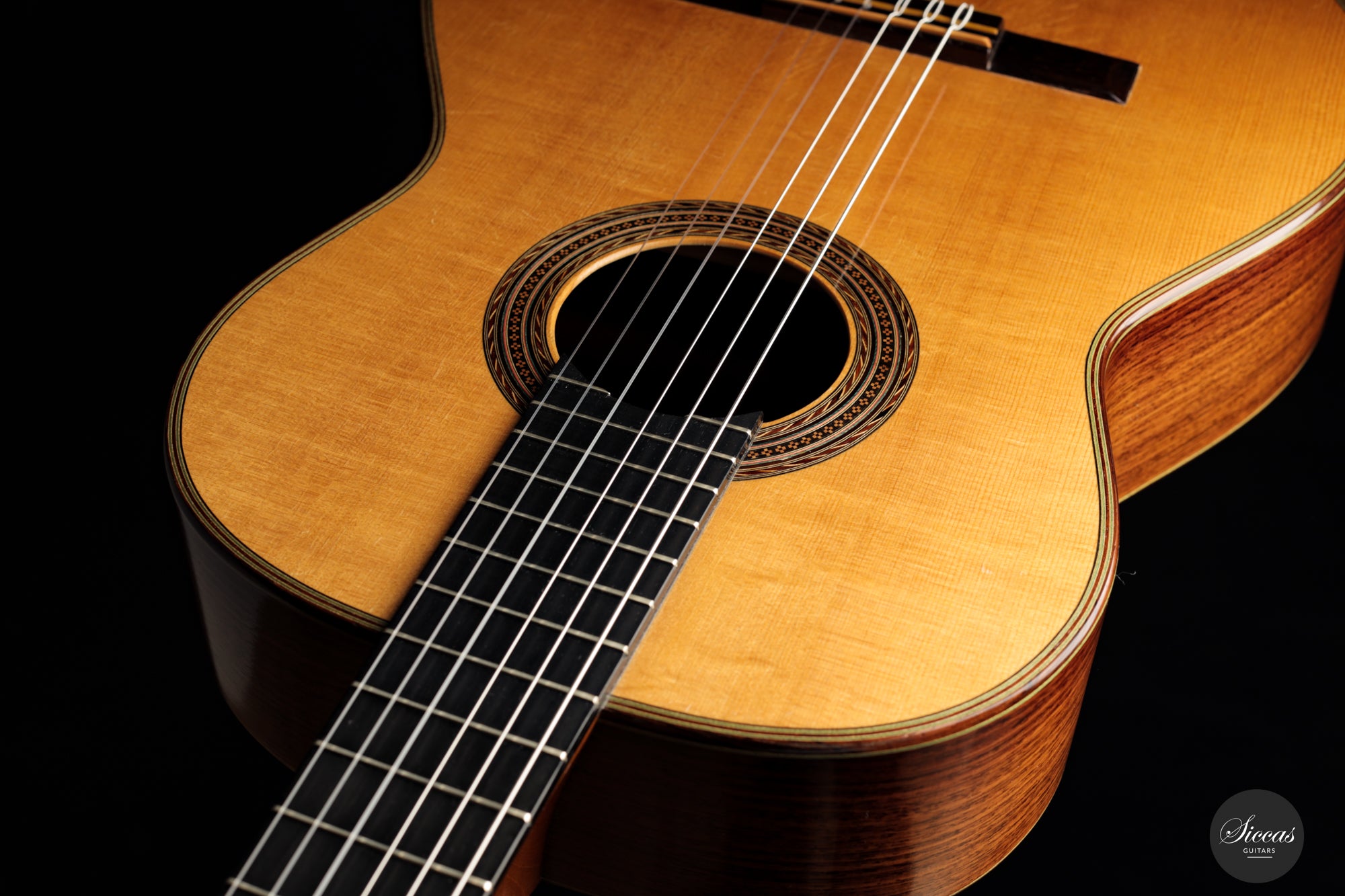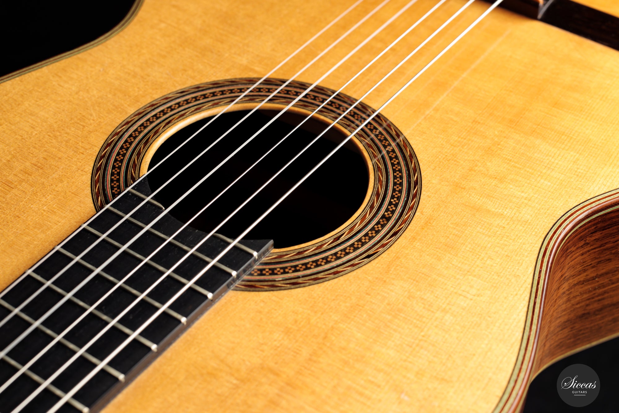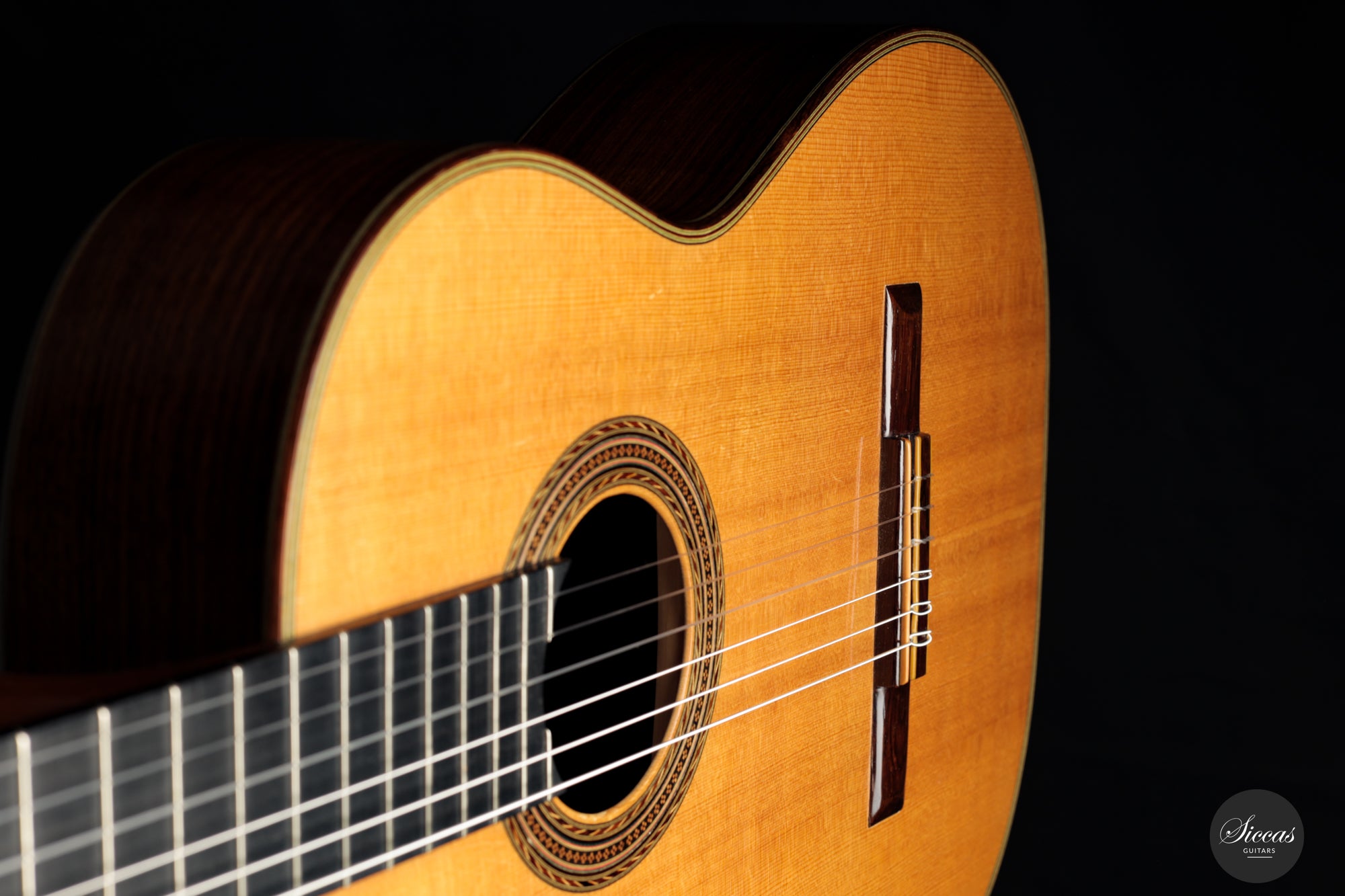 Diese außergewöhnliche Gitarre, gefertigt von Hermann Hauser II, einem der angesehensten Luthiers des zwanzigsten Jahrhunderts, ist eine wahre Darstellung seines unvergleichlichen Könnens und seiner Kunstfertigkeit. Sie verkörpert den Höhepunkt des Gitarrenbaus und zeigt Hausers Fähigkeit, traditionelles Handwerk mit seiner einzigartigen Note zu verbinden. Das Instrument zeichnet sich durch seinen klaren, glockenähnlichen Grundklang aus, der durch eine außergewöhnlich gute Trennung gekennzeichnet ist, wodurch jeder Ton deutlich und resonant wird. Zu seiner akustischen Anziehungskraft tragen auch die lyrischen, warmen und charmanten Höhen der Gitarre bei, die wunderschön mit den tiefen und fokussierten Bässen harmonieren und einen Klang erzeugen, der sowohl reich als auch komplex ausgewogen ist.
