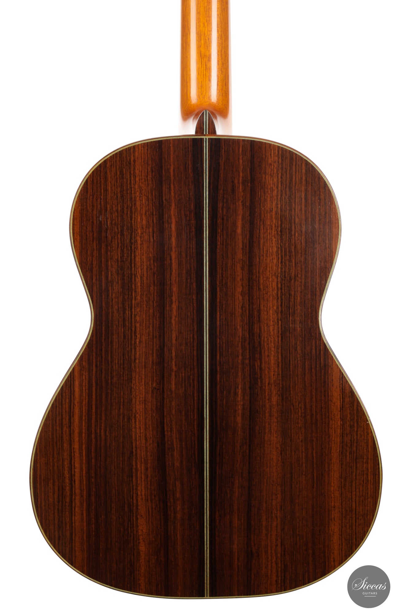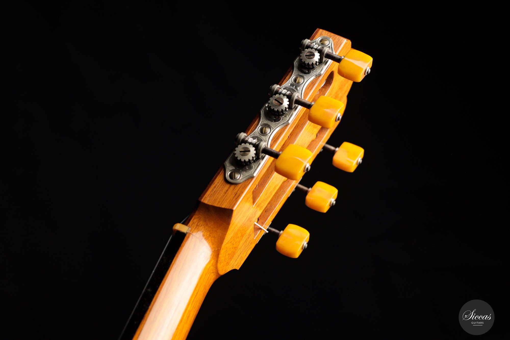 Ästhetisch strahlt die Gitarre klassische Eleganz aus, mit einer honigfarbenen Fichtenschalldecke, die nicht nur zu ihrer bemerkenswerten Klangqualität beiträgt, sondern auch ihre visuelle Anziehungskraft erhöht. Rücken und Seiten, aus feinstem indischen Palisander gefertigt, ergänzen die Fichtenschalldecke und tragen zur Gesamtsophistikation des Erscheinungsbilds der Gitarre bei. Bemerkenswerterweise wurde diese Gitarre in einem erstaunlich originalen Zustand erhalten, ein Zeugnis für die Qualität ihrer Konstruktion und die Pflege, die sie im Laufe der Jahre erhalten hat. Diese Hermann Hauser II Gitarre ist nicht nur ein Instrument; sie ist ein Stück Musikgeschichte und bietet ein außergewöhnliches Spiel- und Hörerlebnis, das sowohl Musiker als auch Sammler zweifellos fesseln wird.