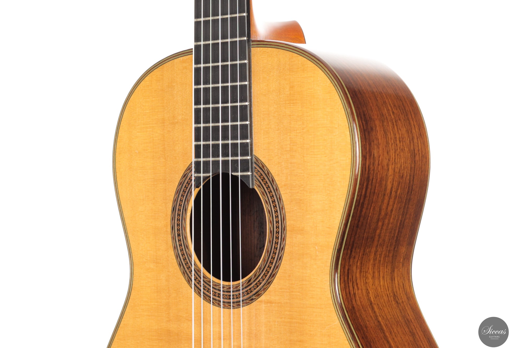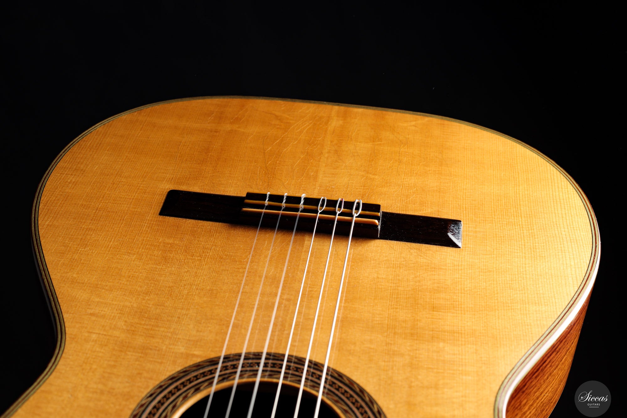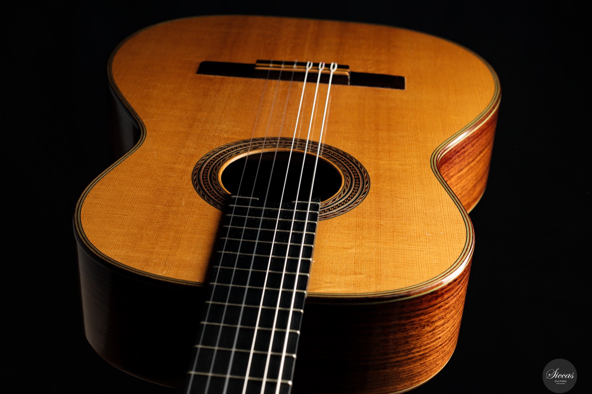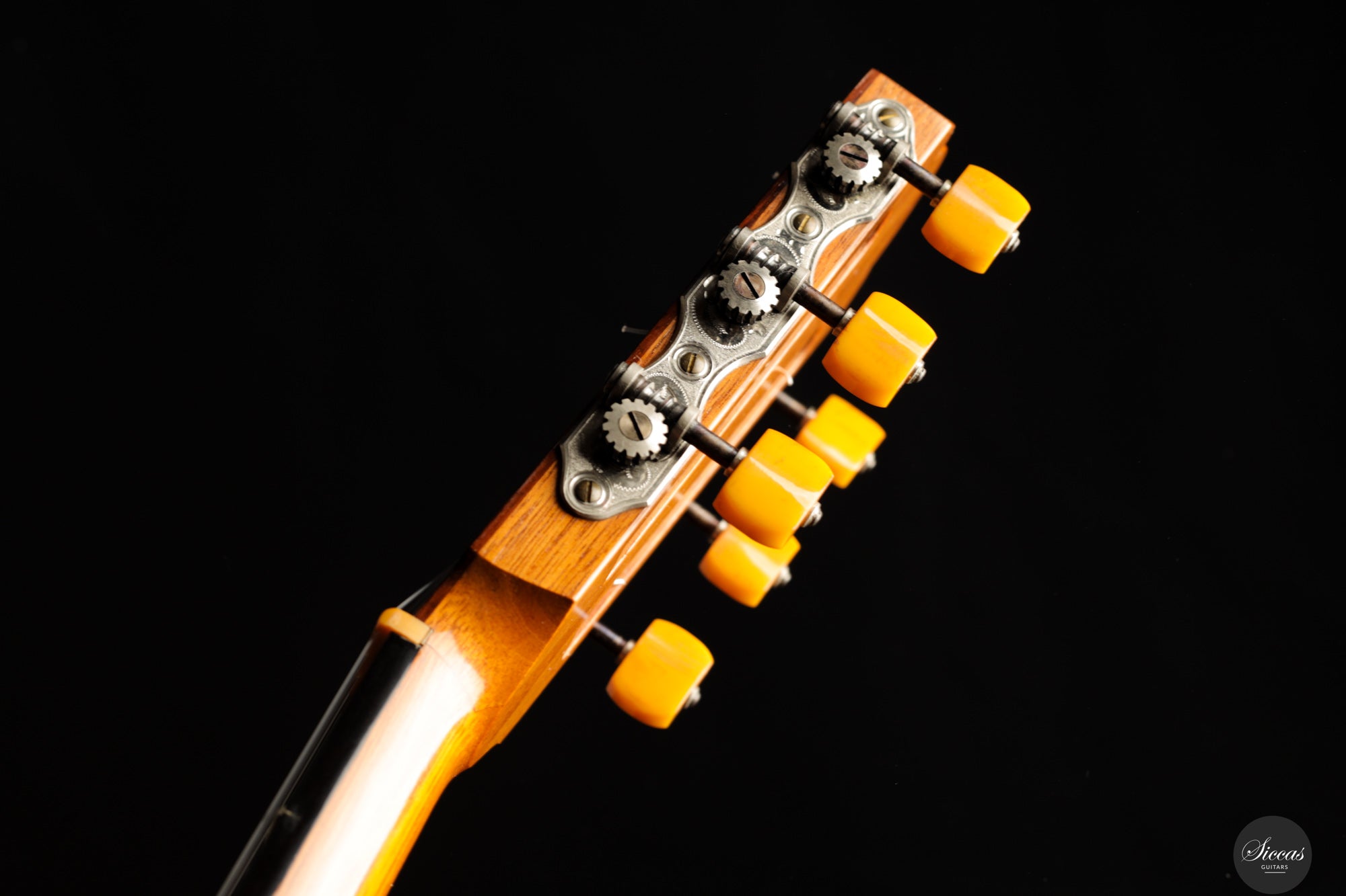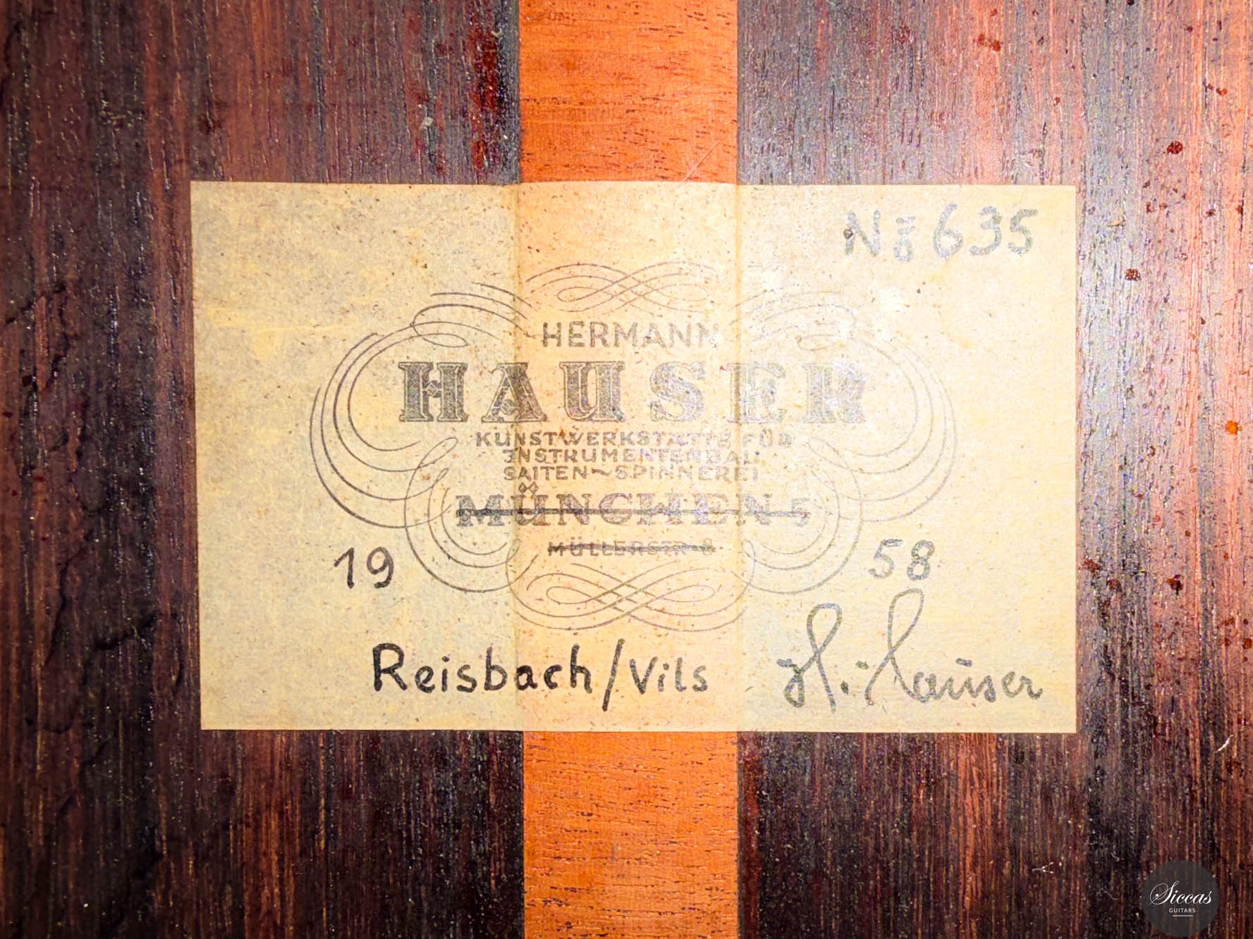 Dieses Instrument aus dem Jahr 1958 mit der Nummer 635 ist ein herausragendes Beispiel für die traditionelle Bauweise von Hermann Hauser II. Die honigfarbene Fichtendecke besitzt außergewöhnliche Qualität und wird durch einen Korpus aus indischem Palisander ergänzt. Die Nitrozelluloselackierung ist sehr fein ausgeführt und ermöglicht eine leichte und frei schwingende Konstruktion. Mit nur 1360 Gramm zeigt die Gitarre jene schlanke und reaktionsfreudige Bauart die für die besten Arbeiten von Hauser II kennzeichnend ist. Landstorfer Mechaniken sorgen für präzises und zuverlässiges Stimmen.
