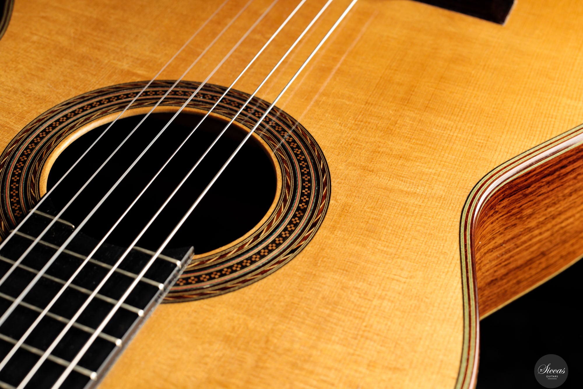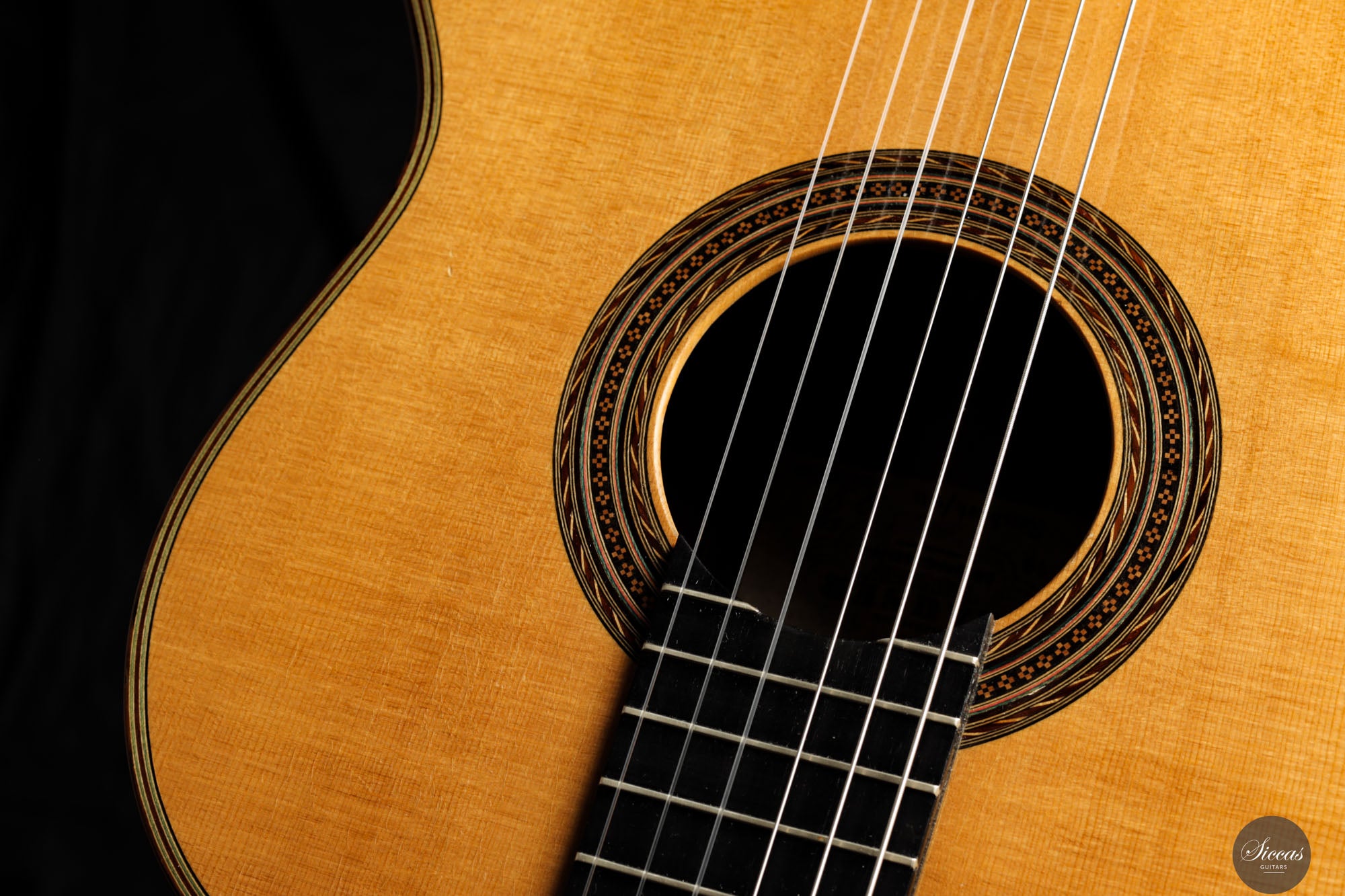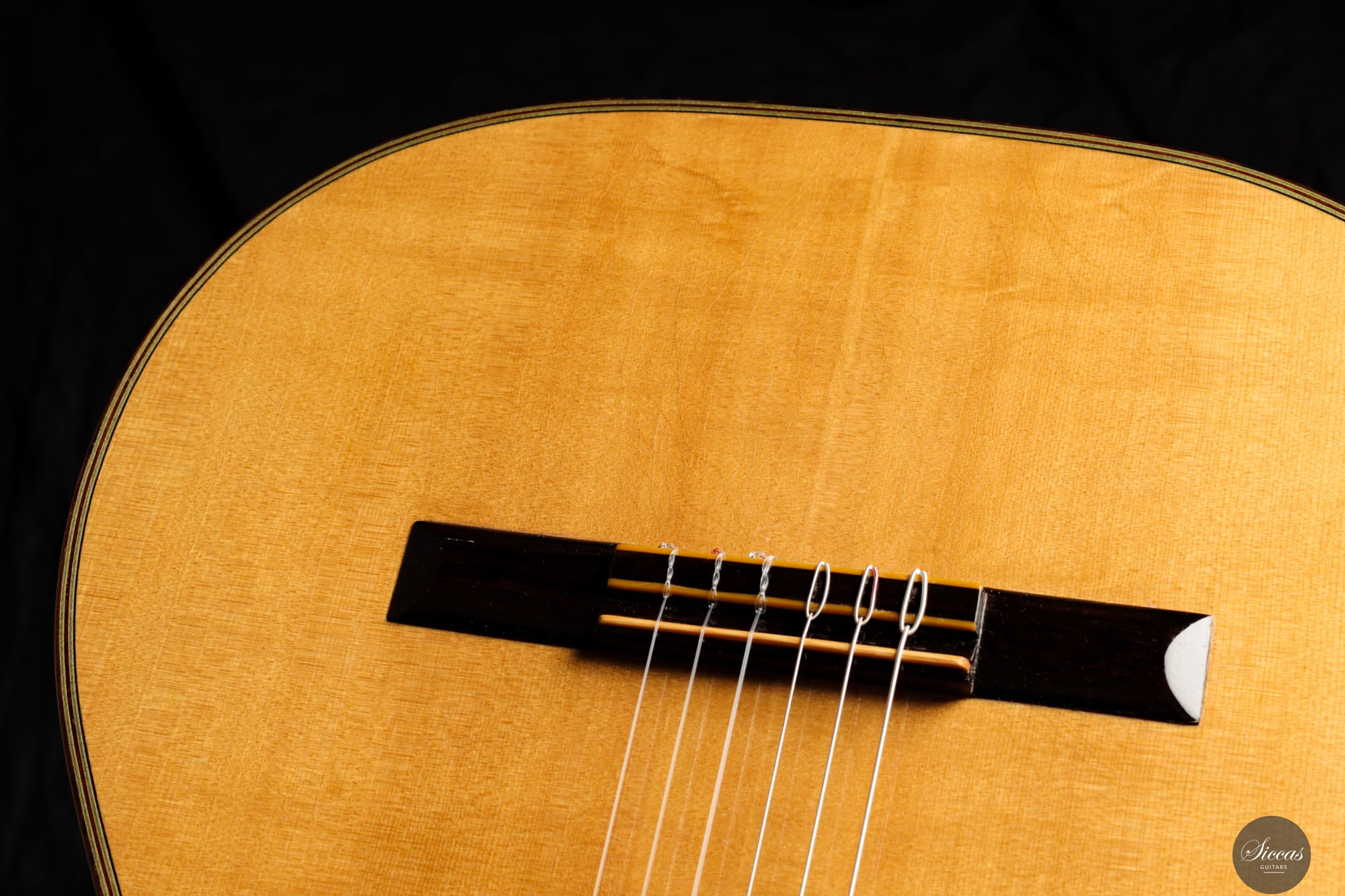 Der Klang ist außergewöhnlich ausgewogen und klar. Alle Register besitzen eine vergleichbare Intensität was den Eindruck einer durchgehenden singenden Linie vermittelt. Das Grundspekt der Töne zeigt eine glockenartige Reinheit und die Trennung der Stimmen ist bemerkenswert. Die Höhen klingen warm, lyrisch und charmant während die Bässe tief und zugleich fokussiert wirken. Der Nachklang ist lang und stabil und selbst feinste Anschläge entfalten sich farbig und anmutig. Die farbliche Bandbreite ist groß und das Instrument erleichtert das Formen von Stimmen und das Erzeugen komplexer musikalischer Strukturen. Die Kohärenz des Tons bleibt in allen Lagen bestehen und die Gitarre bewahrt ihre Ausdruckstiefe in jeder Dynamik. Es handelt sich um ein seltenes Konzertinstrument das Geschichte und lebendige musikalische Präsenz vereint.