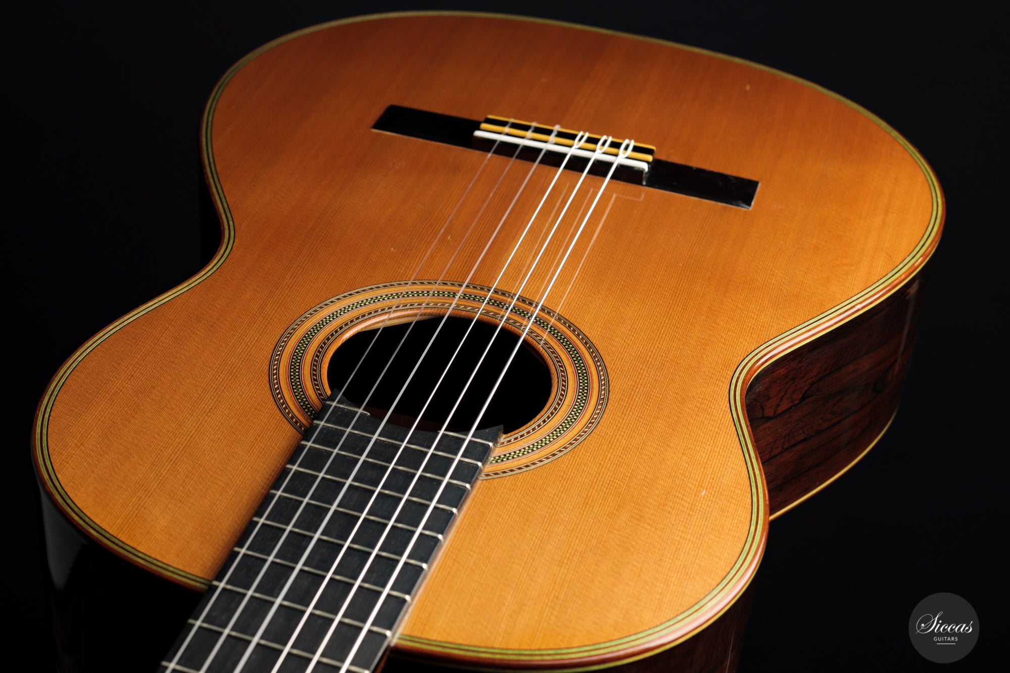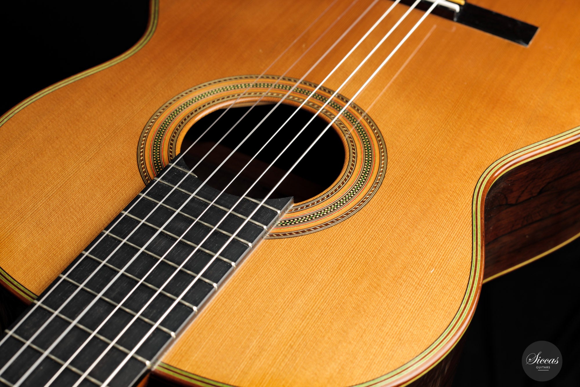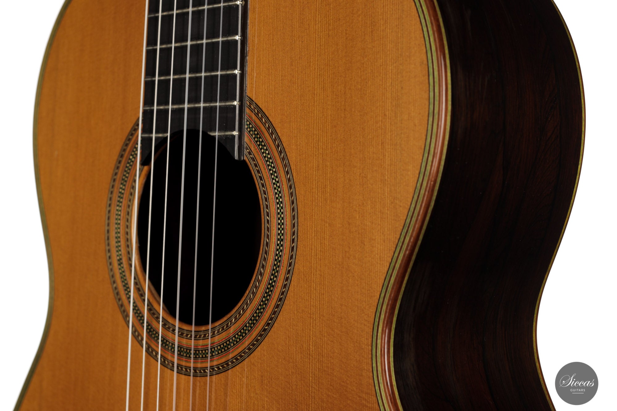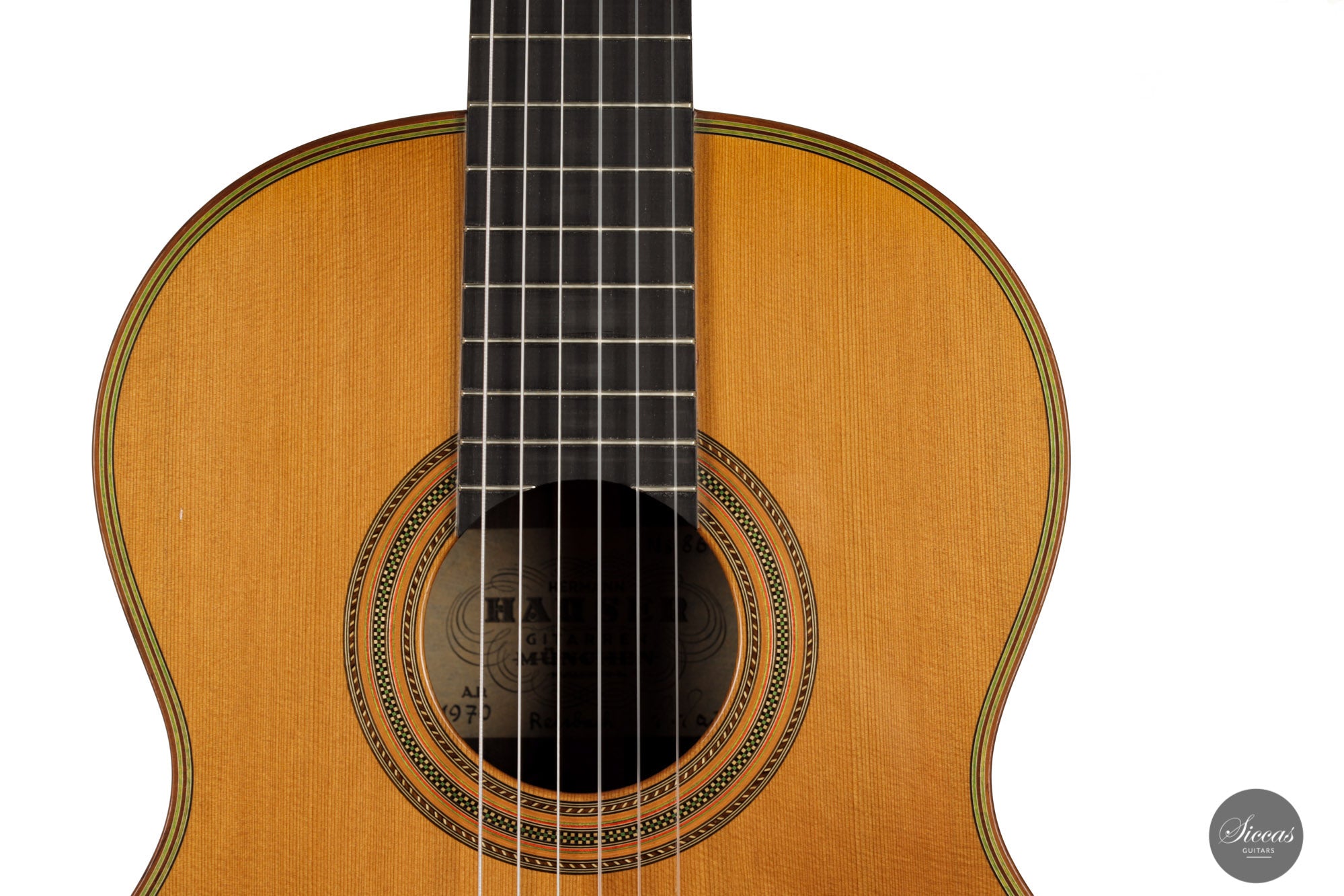 Diese wunderbare im Jahr 1970 gebaute Gitarre mit der Nummer 869 ist in vielerlei Hinsicht ein ganz besonderes Instrument. Am auffälligsten ist die Zederndecke, die innerhalb der Herstellung von Hermann Hauser II eine extreme Seltenheit darstellt. Man muss sich vorstellen, dass die Verwendung von Zedernholz zu jener Zeit noch am Anfang stand und erst einige spanische Gitarrenbauer wie José Ramirez III es ab 1965 vermehrt eingesetzt haben. Es handelt sich hierbei also um ein absolutes Vorreiterinstrument. Ein zweites auffälliges Merkmal ist der fantastische Zustand: Diese Gitarre sieht wirklich aus, als wäre sie gerade erst gebaut worden. Nur sehr wenige Spielspuren und ein reparierter Haarriss auf dem CITES-zertifizierten Rio-Palisanderboden sind zu verzeichnen. Die Stimmfarbe dieser Gitarre ist ebenso einzigartig wie ihre bemerkenswerte Offenheit und Klangstärke. Das lange Sustain, die intensiven, farbenreichen Höhen und die insgesamt tadellose Ausgewogenheit machen sie zu einer Traumgitarre und wahren Highlight für sowohl Liebhaber als auch professionelle Gitarristen.