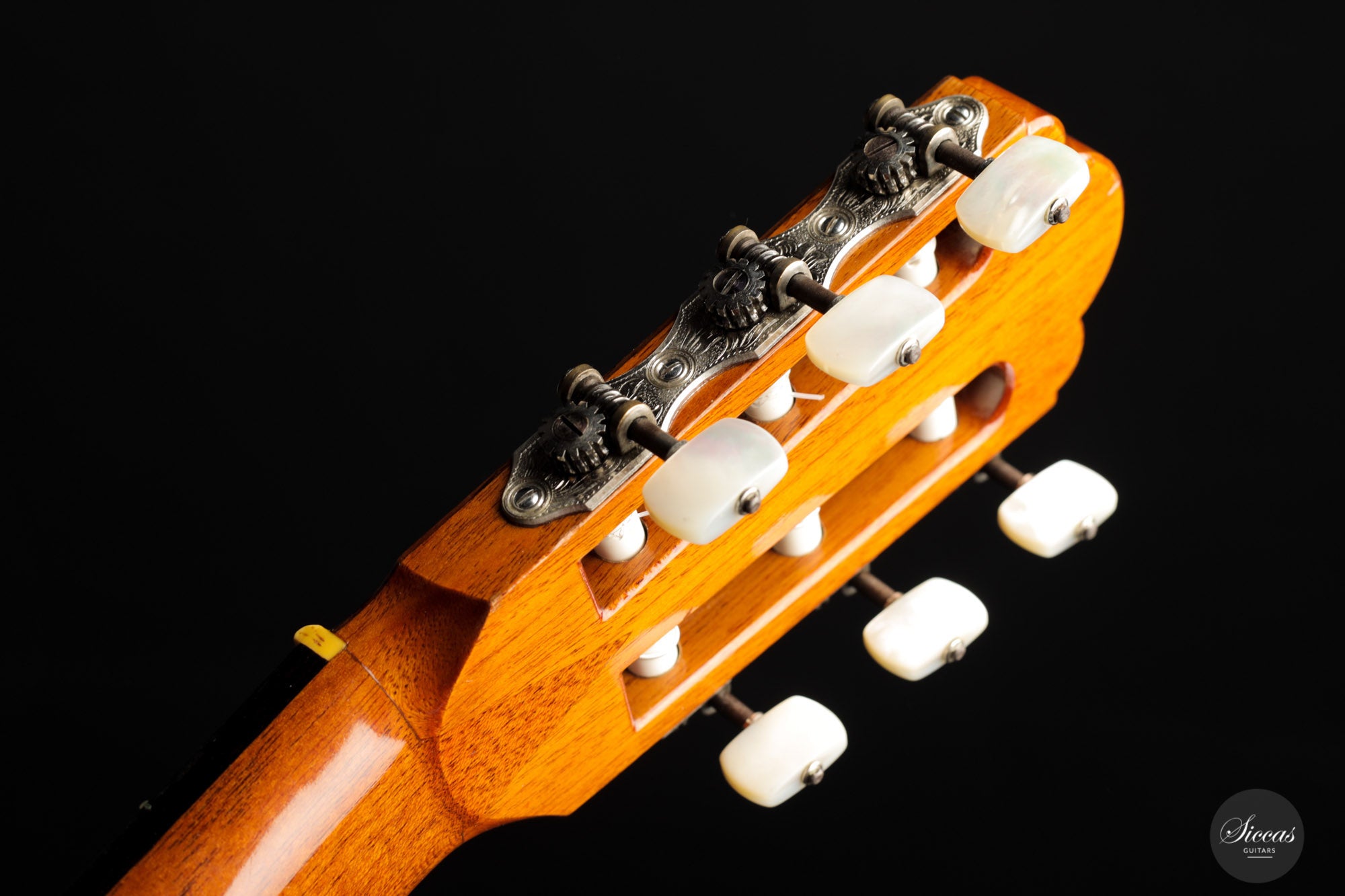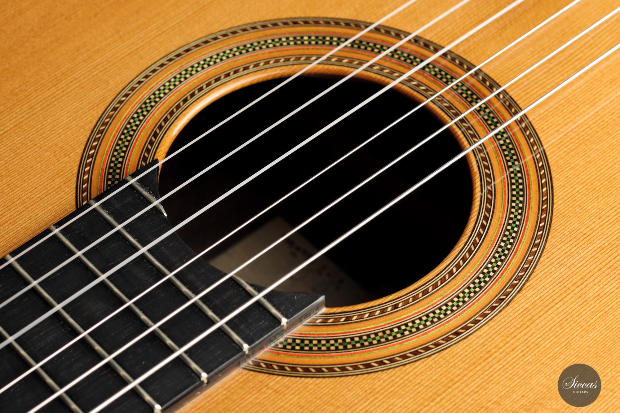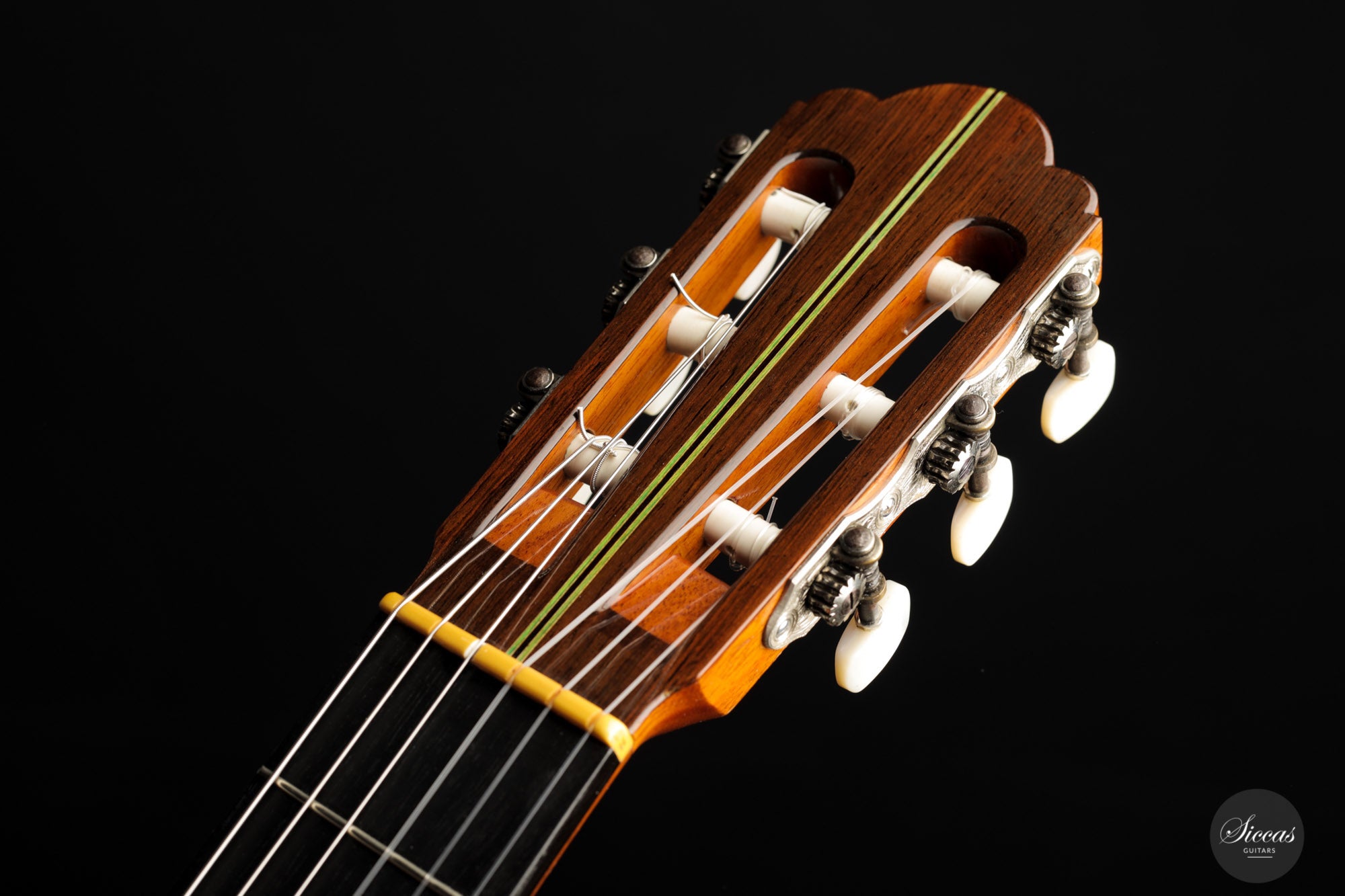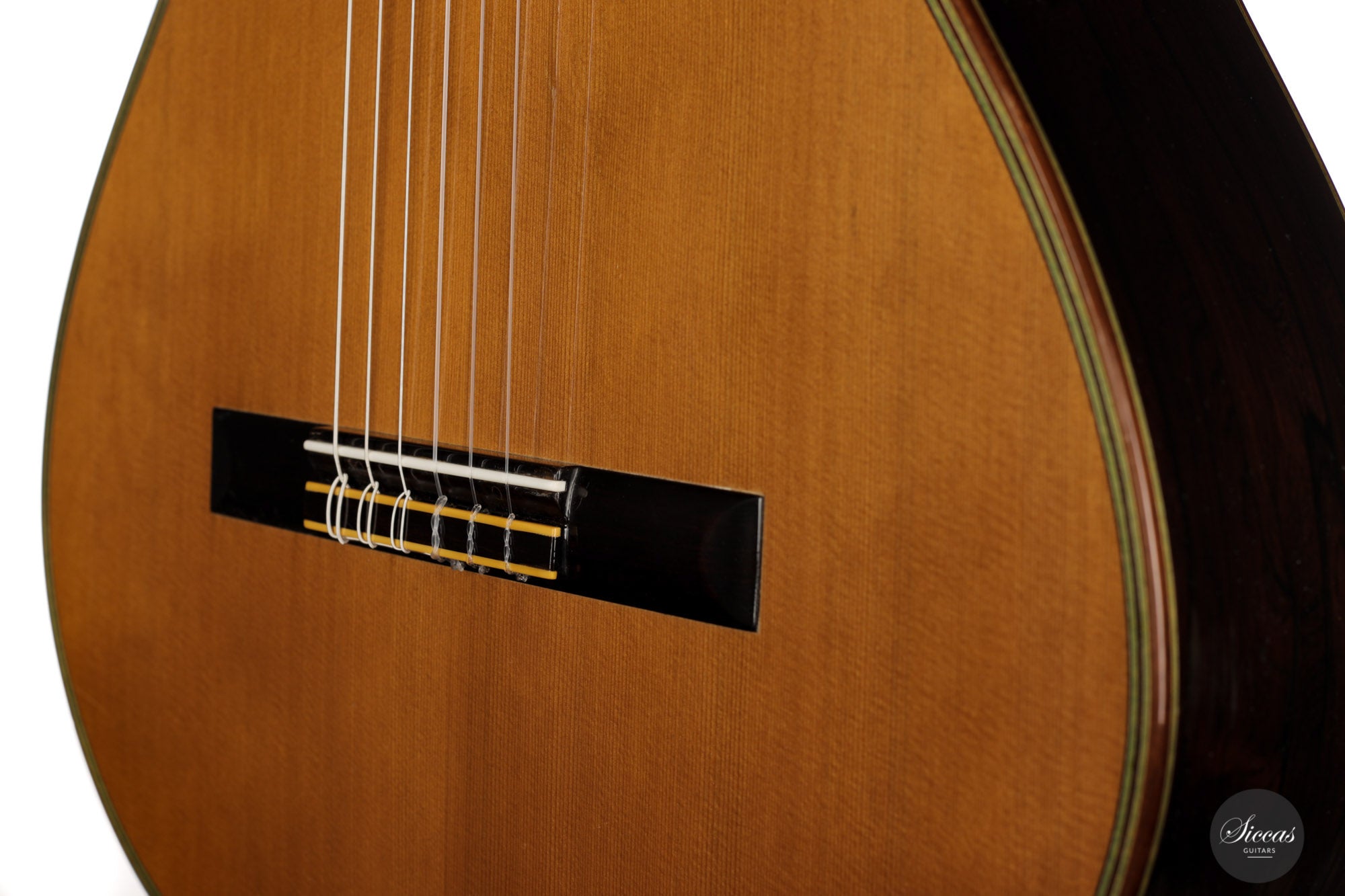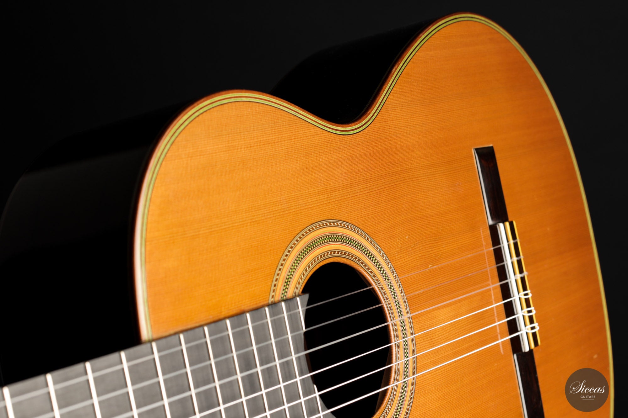 Diese wunderbare im Jahr 1970 gebaute Gitarre mit der Nummer 869 ist in vielerlei Hinsicht ein ganz besonderes Instrument. Am auffälligsten ist die Zederndecke, die innerhalb der Herstellung von Hermann Hauser II eine extreme Seltenheit darstellt. Man muss sich vorstellen, dass die Verwendung von Zedernholz zu jener Zeit noch am Anfang stand und erst einige spanische Gitarrenbauer wie José Ramirez III es ab 1965 vermehrt eingesetzt haben. Es handelt sich hierbei also um ein absolutes Vorreiterinstrument. Ein zweites auffälliges Merkmal ist der fantastische Zustand: Diese Gitarre sieht wirklich aus, als wäre sie gerade erst gebaut worden. Nur sehr wenige Spielspuren und ein reparierter Haarriss auf dem CITES-zertifizierten Rio-Palisanderboden sind zu verzeichnen. Die Stimmfarbe dieser Gitarre ist ebenso einzigartig wie ihre bemerkenswerte Offenheit und Klangstärke. Das lange Sustain, die intensiven, farbenreichen Höhen und die insgesamt tadellose Ausgewogenheit machen sie zu einer Traumgitarre und wahren Highlight für sowohl Liebhaber als auch professionelle Gitarristen.