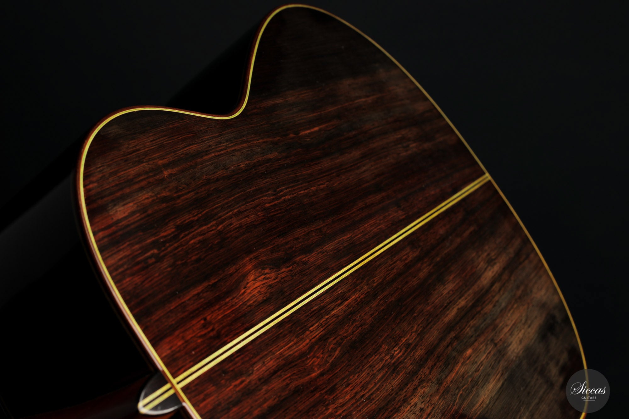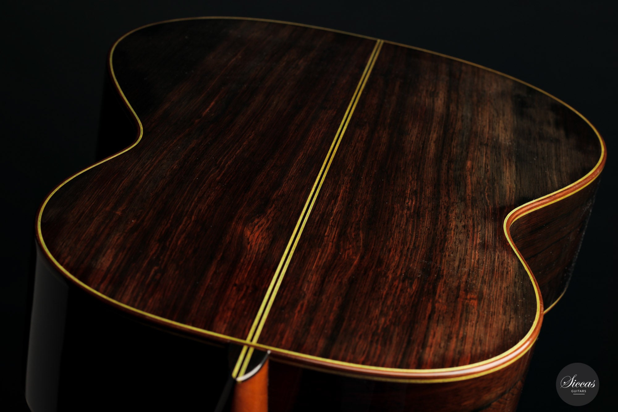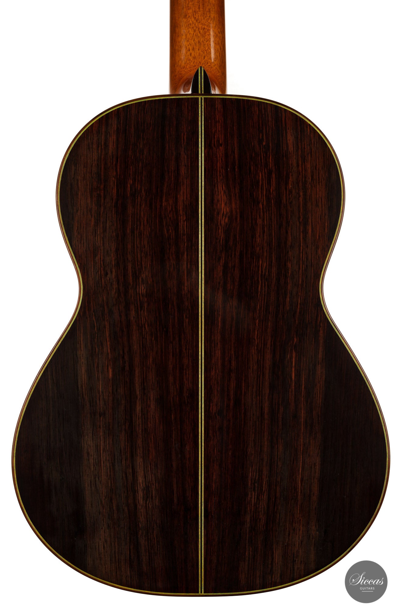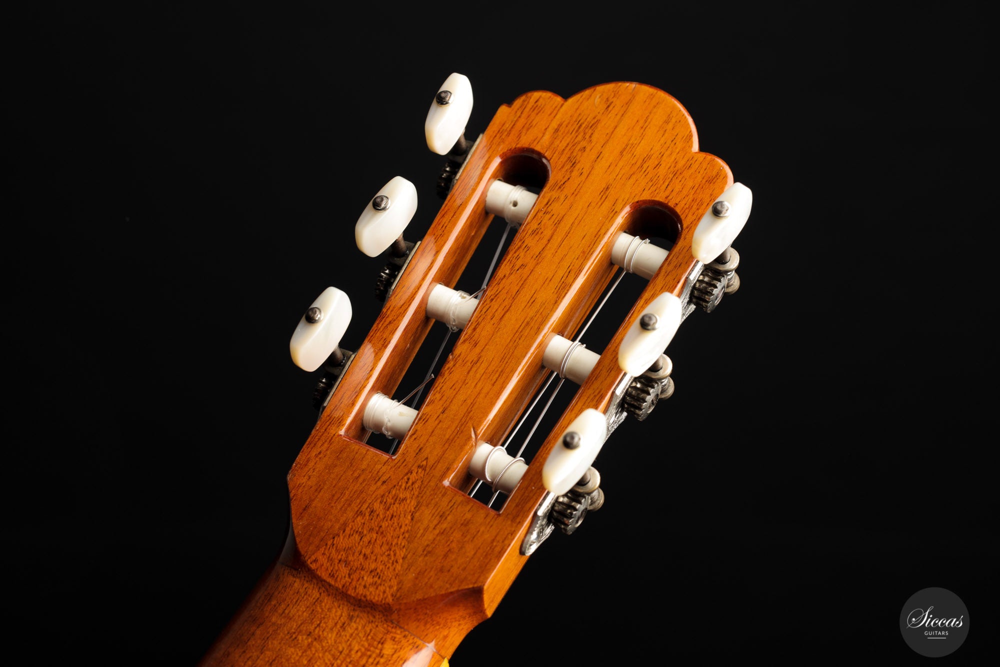 Diese wunderbare im Jahr 1970 gebaute Gitarre mit der Nummer 869 ist in vielerlei Hinsicht ein ganz besonderes Instrument. Am auffälligsten ist die Zederndecke, die innerhalb der Herstellung von Hermann Hauser II eine extreme Seltenheit darstellt. Man muss sich vorstellen, dass die Verwendung von Zedernholz zu jener Zeit noch am Anfang stand und erst einige spanische Gitarrenbauer wie José Ramirez III es ab 1965 vermehrt eingesetzt haben. Es handelt sich hierbei also um ein absolutes Vorreiterinstrument. Ein zweites auffälliges Merkmal ist der fantastische Zustand: Diese Gitarre sieht wirklich aus, als wäre sie gerade erst gebaut worden. Nur sehr wenige Spielspuren und ein reparierter Haarriss auf dem CITES-zertifizierten Rio-Palisanderboden sind zu verzeichnen. Die Stimmfarbe dieser Gitarre ist ebenso einzigartig wie ihre bemerkenswerte Offenheit und Klangstärke. Das lange Sustain, die intensiven, farbenreichen Höhen und die insgesamt tadellose Ausgewogenheit machen sie zu einer Traumgitarre und wahren Highlight für sowohl Liebhaber als auch professionelle Gitarristen.