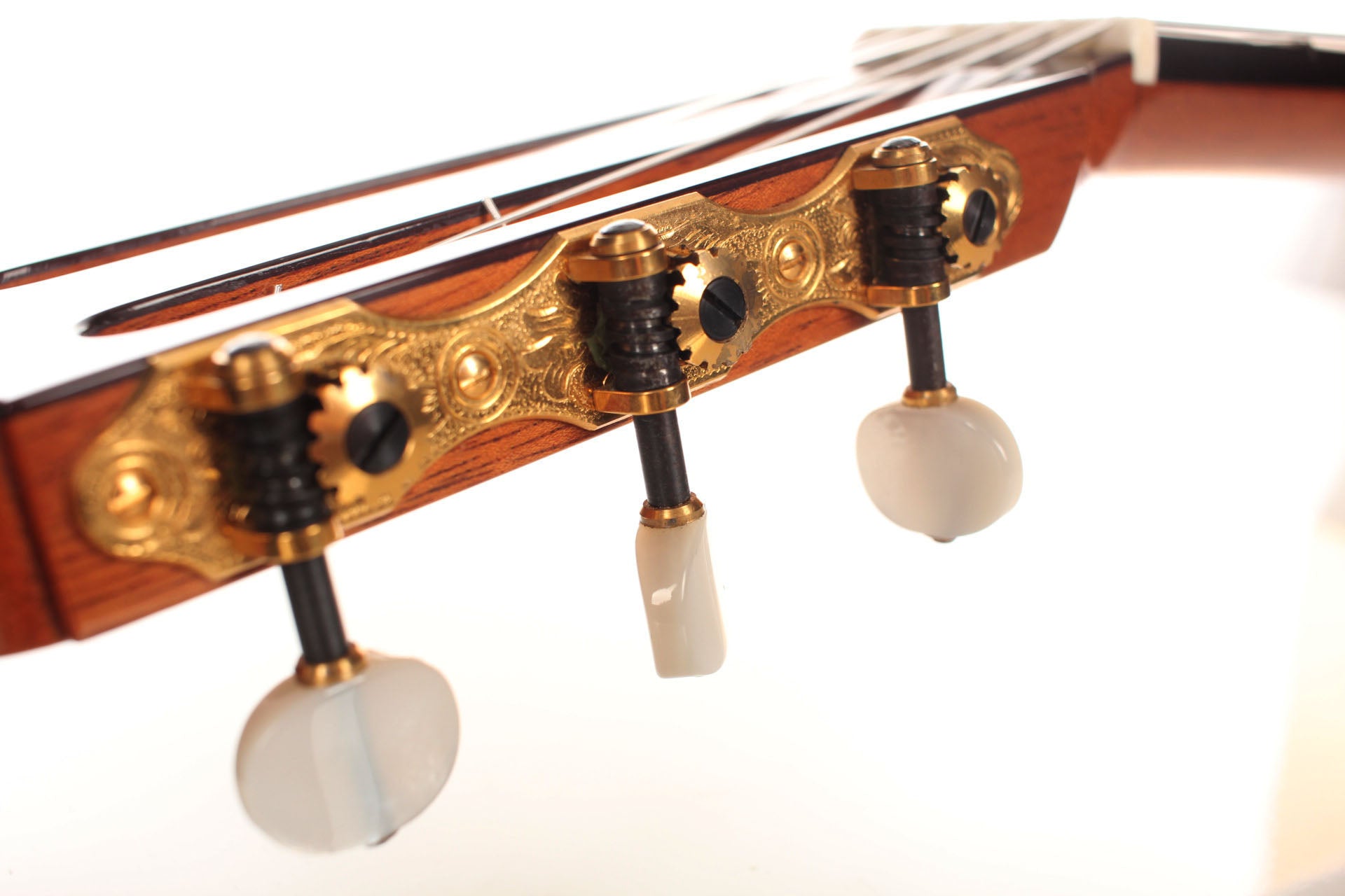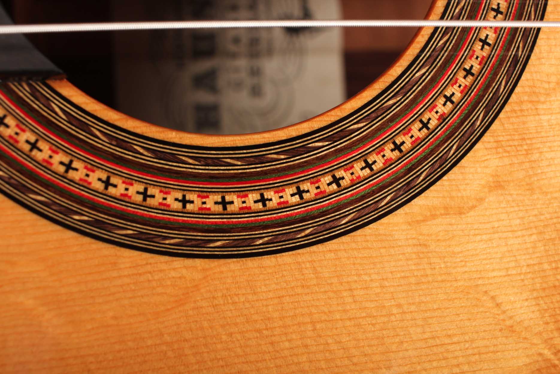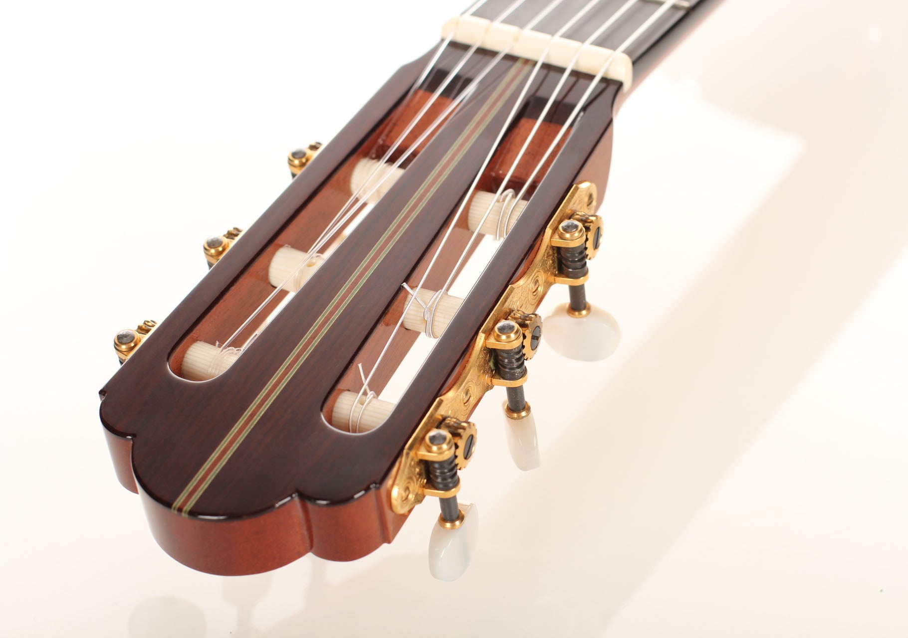 Dieses Segovia Modell von 2010 ist ein wahres Schmuckstück mit auffällig schöner Haselfichten-Decke und Boden und Zargen aus großartigem rötlichen Palisander. Die Bauform ist traditionell und hat eine sieben-Fächer-Beleistung. Das grüne, von Palisander eingerahmte Binding und die entsprechende Verzierung der Kopfplatte bilden einen komplementären Kontrast zu den roten Einlagen in der Rosette. Klanglich überzeugt sie uns durch ihre Ausgeglichenheit zwischen warmen Mitten, kräftigen Bässen und süßen Höhen. Der Zustand kann als exzellent bezeichnet werden. Die Mechaniken sind von Reischl. Ein Hartschalenkoffer ist inklusive.