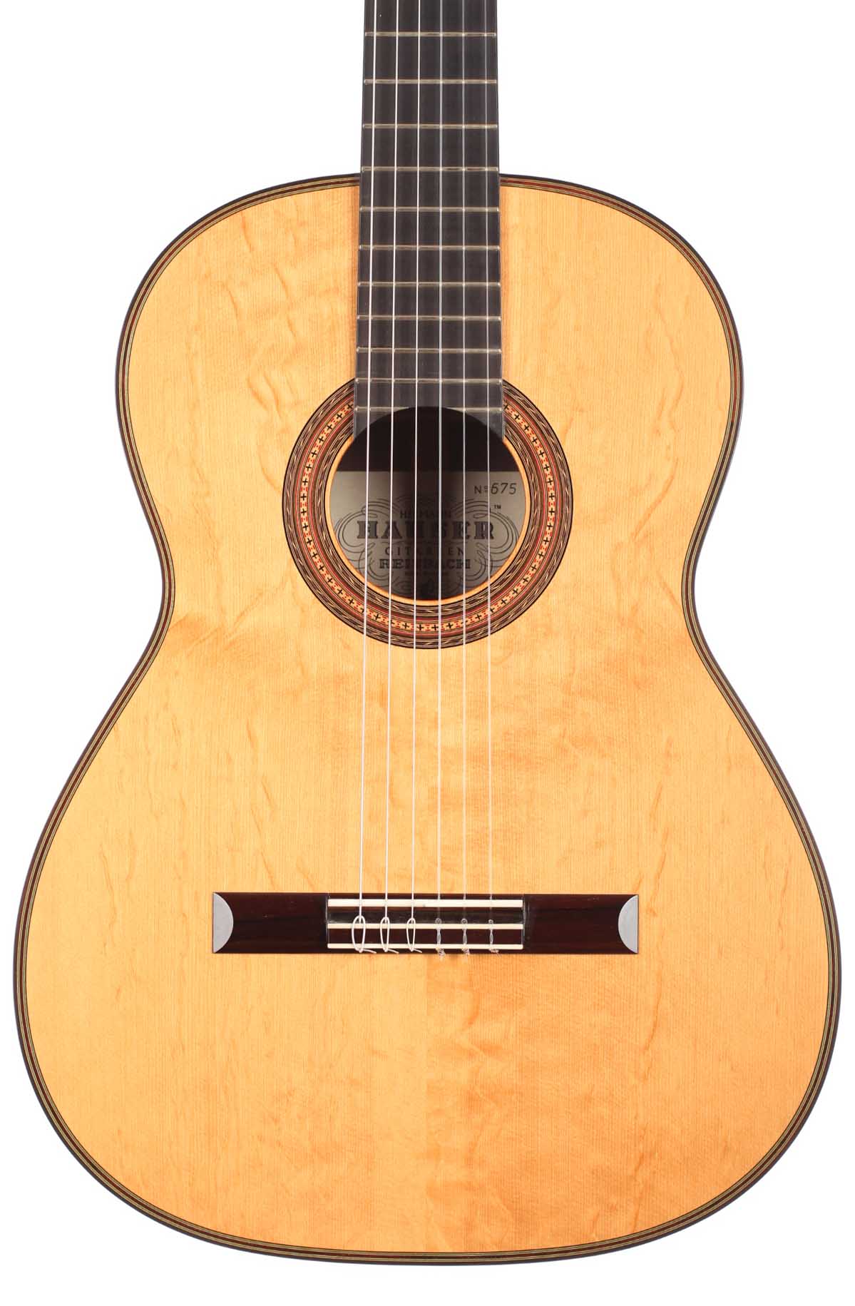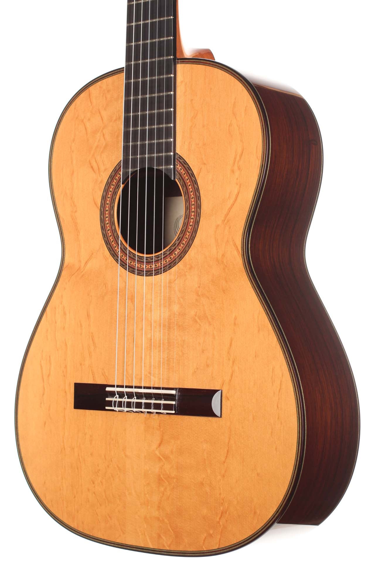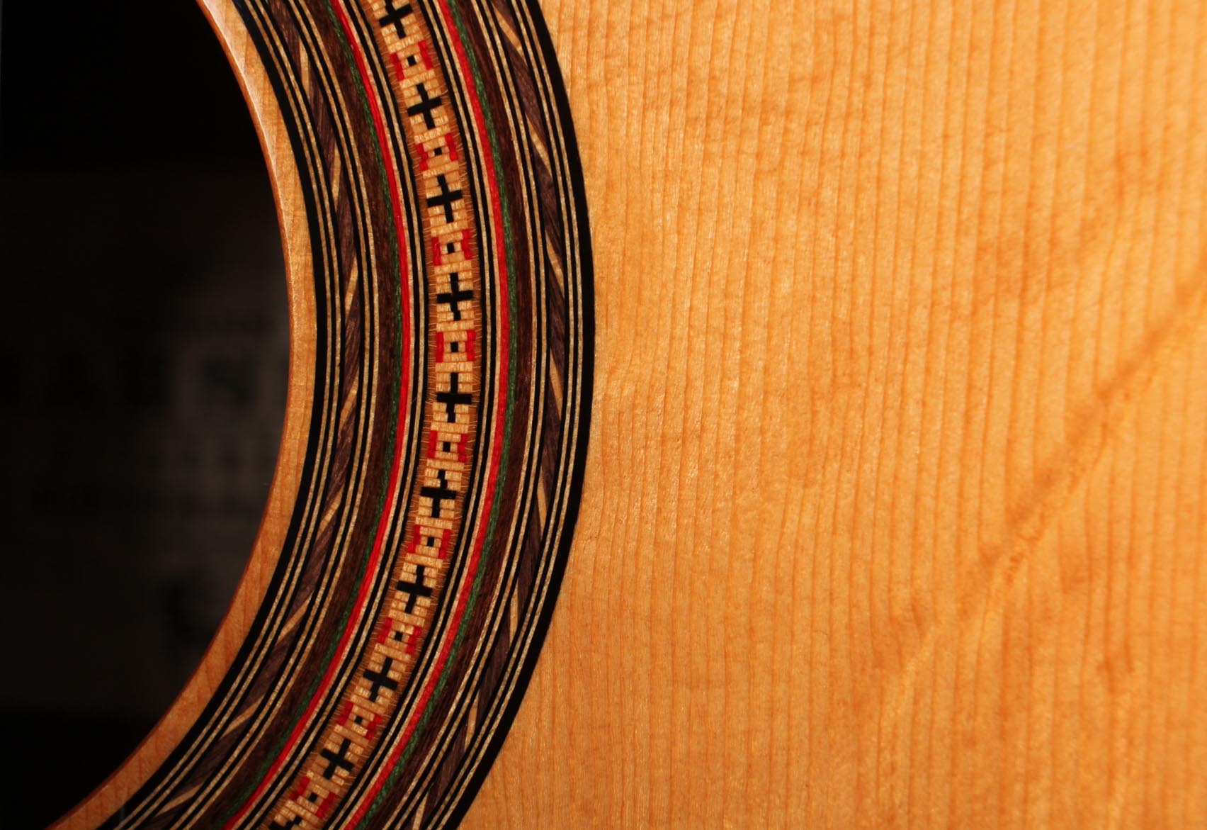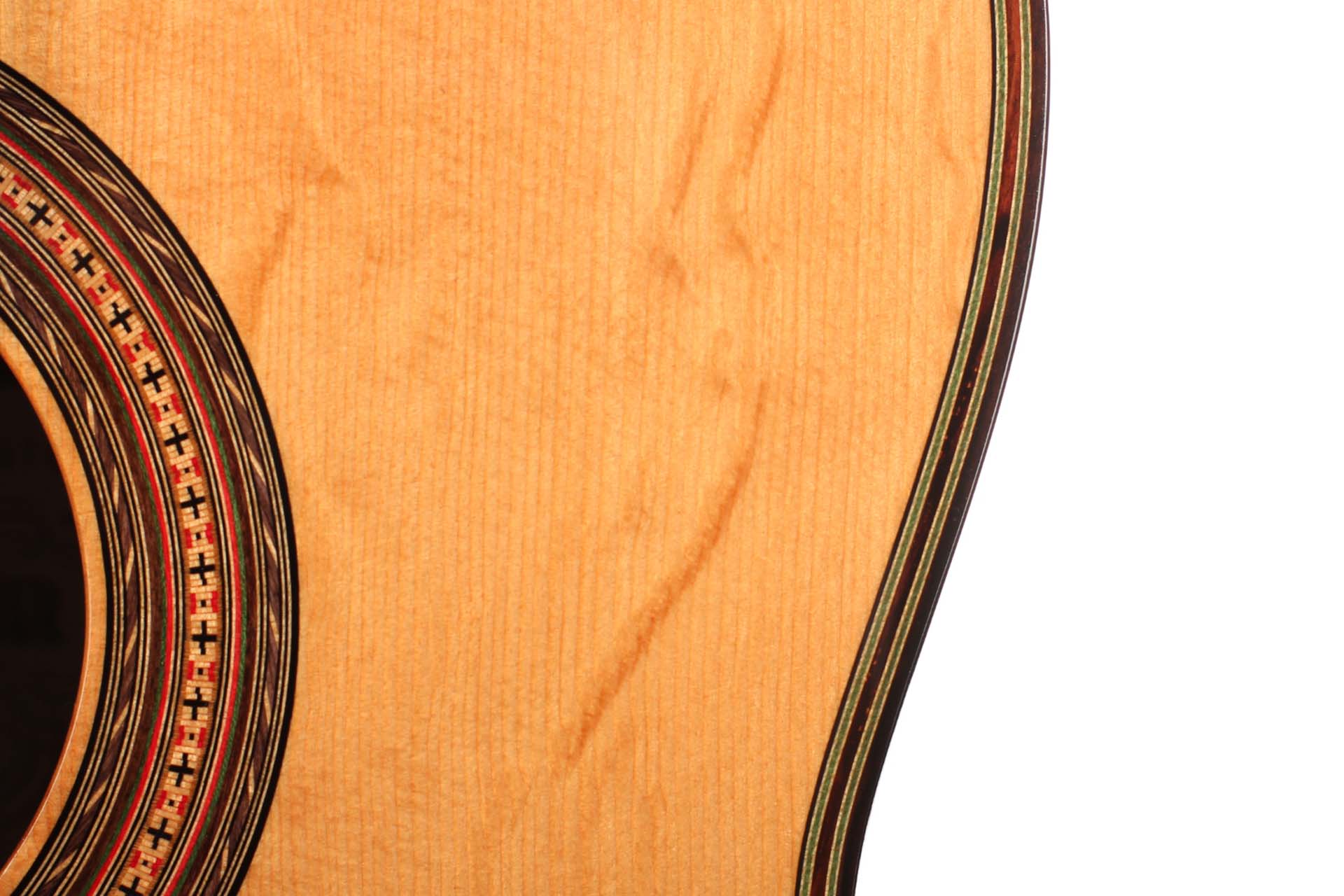 Dieses Segovia Modell von 2010 ist ein wahres Schmuckstück mit auffällig schöner Haselfichten-Decke und Boden und Zargen aus großartigem rötlichen Palisander. Die Bauform ist traditionell und hat eine sieben-Fächer-Beleistung. Das grüne, von Palisander eingerahmte Binding und die entsprechende Verzierung der Kopfplatte bilden einen komplementären Kontrast zu den roten Einlagen in der Rosette. Klanglich überzeugt sie uns durch ihre Ausgeglichenheit zwischen warmen Mitten, kräftigen Bässen und süßen Höhen. Der Zustand kann als exzellent bezeichnet werden. Die Mechaniken sind von Reischl. Ein Hartschalenkoffer ist inklusive.