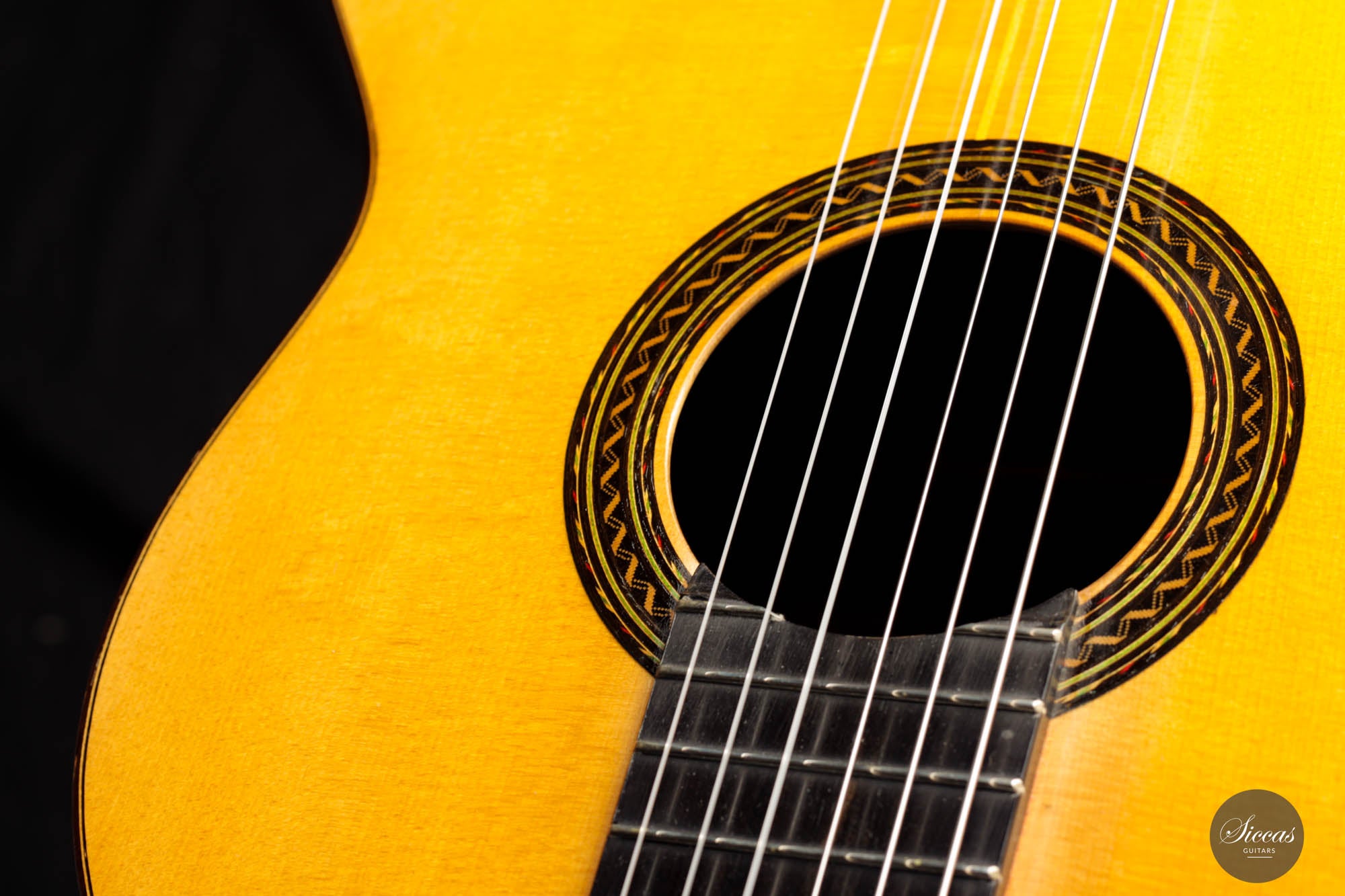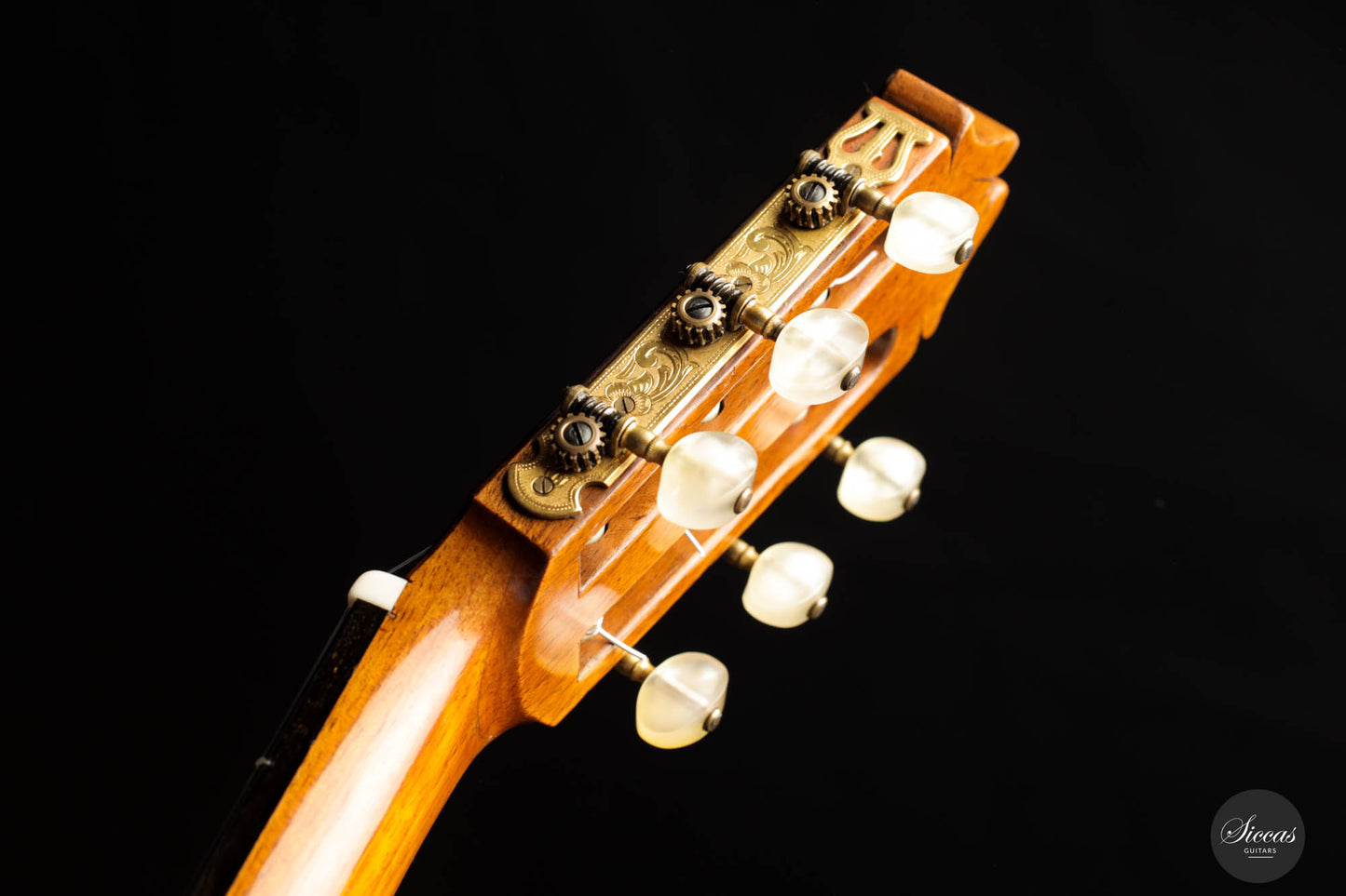 Obwohl sie sich bereits über ein halbes Jahrhundert hinweg anmutig altert, behält diese Gitarre ihre Erhabenheit und zeugt von ihrer zeitgeprüften Qualität. Während sie zwei fachmännisch restaurierte Risse auf ihrer Schalldecke aufweist, wurde ein zarter 2mm breiter Holzstreifen nahtlos dort eingefügt, wo die Decke zusammenläuft, wodurch ihr ursprünglicher Charme erhalten bleibt. Die Rückseite bleibt makellos, frei von jeglichen Makeln, während die Seite einen minimalen, fast unsichtbaren 2cm Riss an der Basis zeigt.