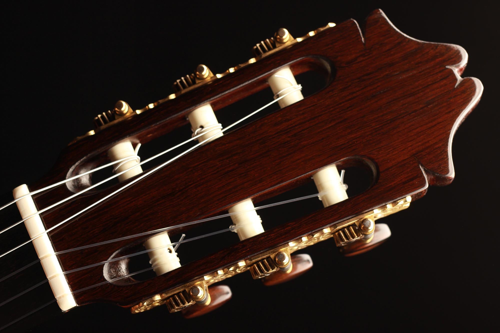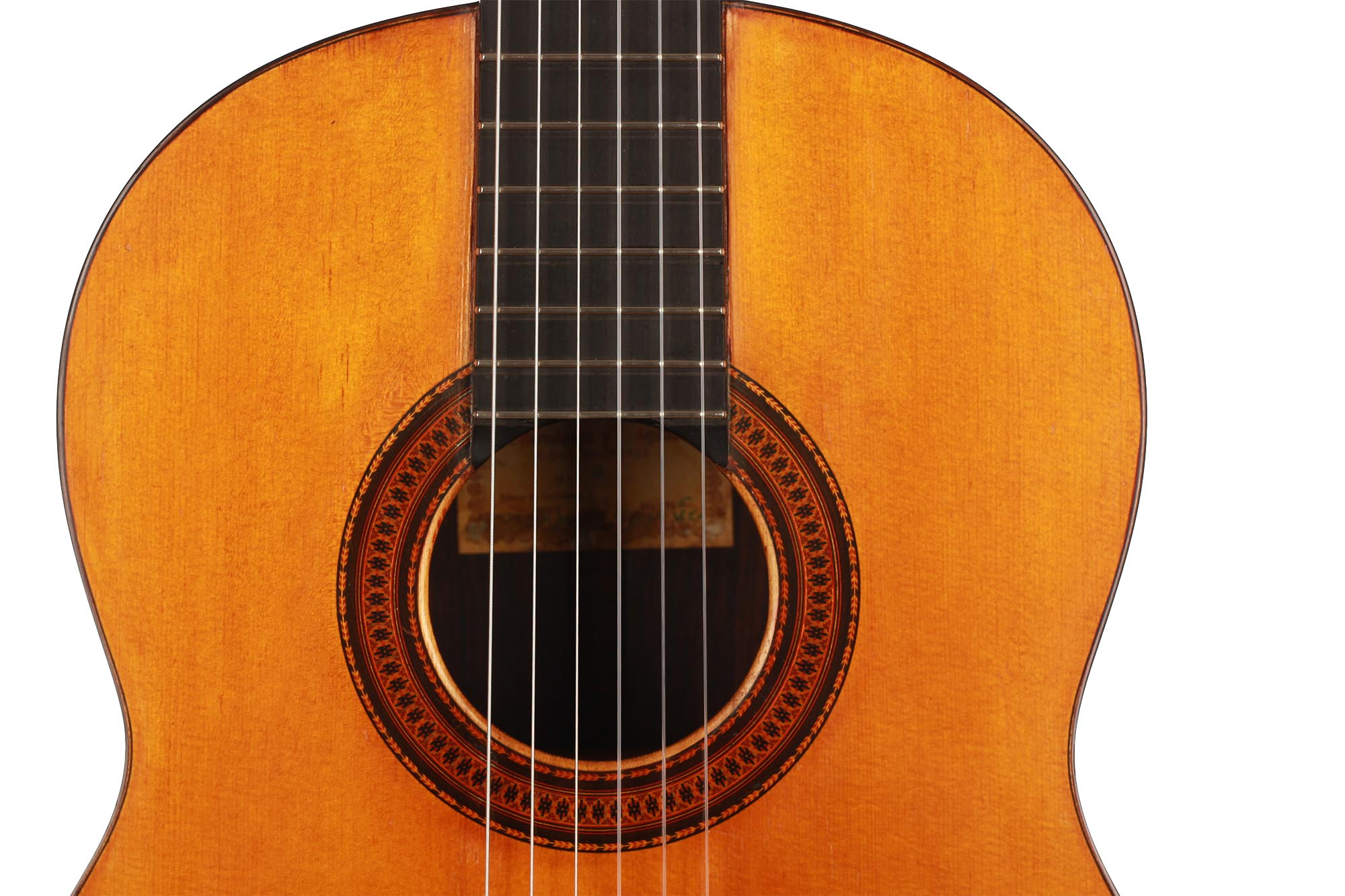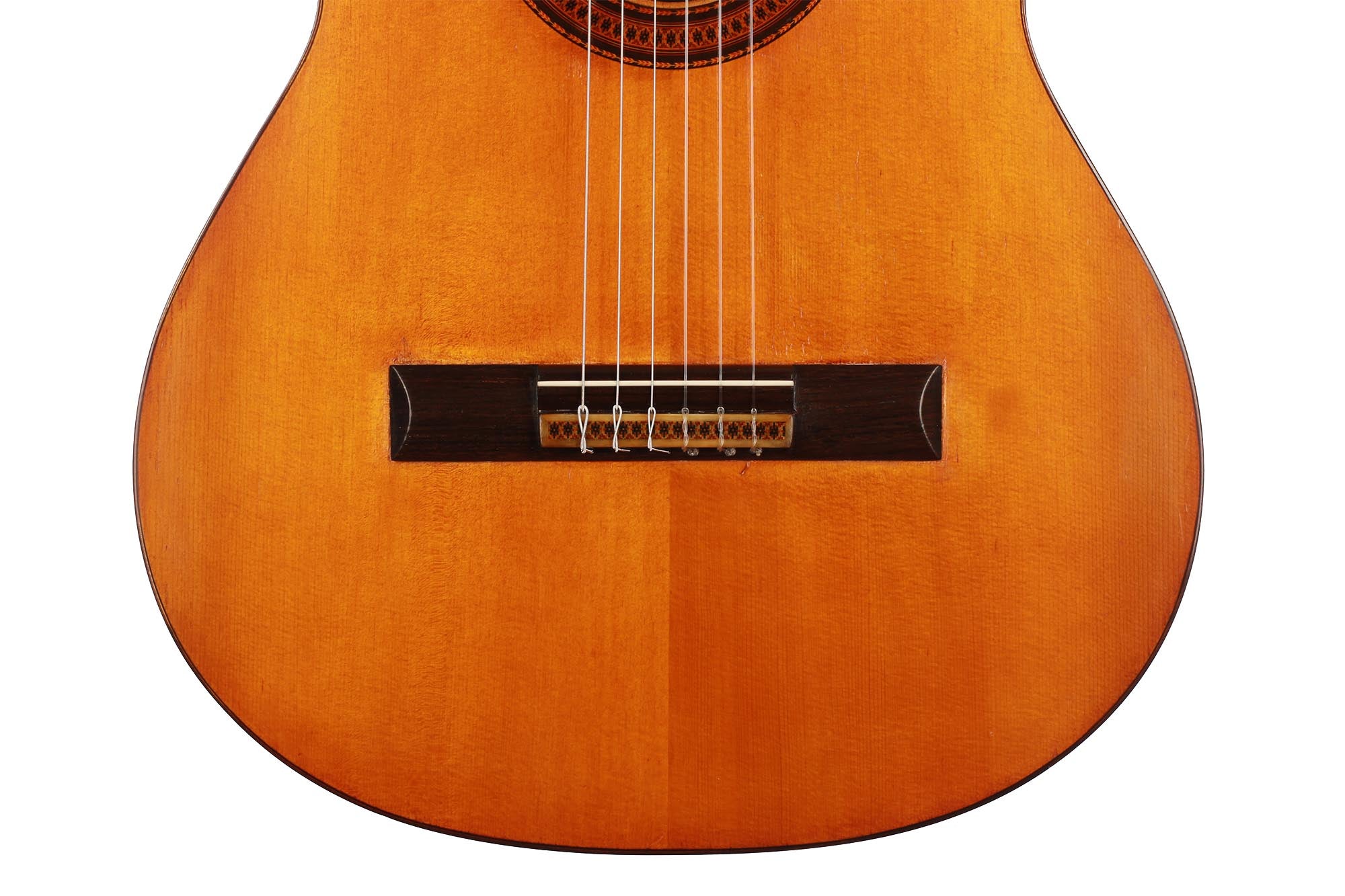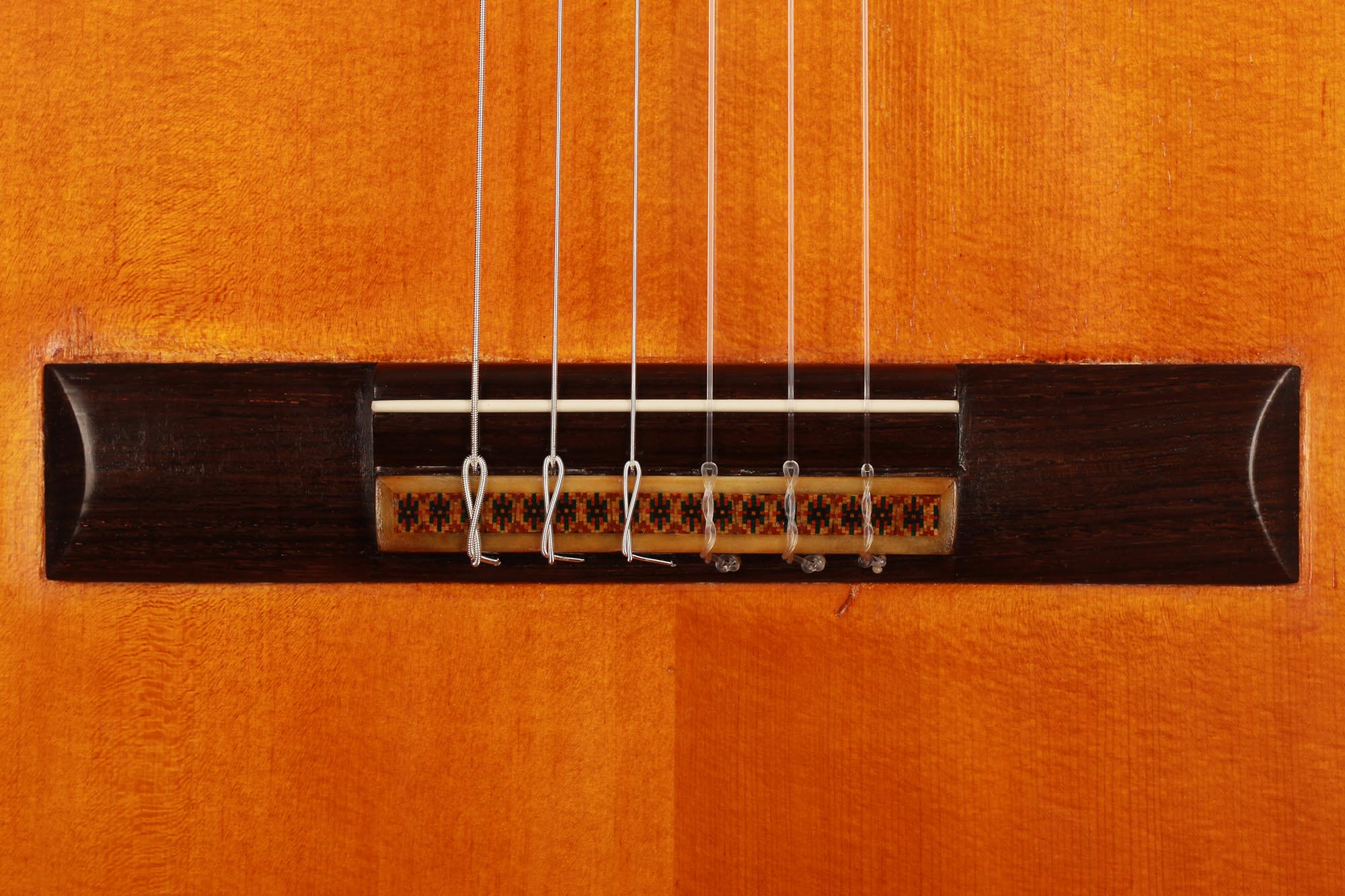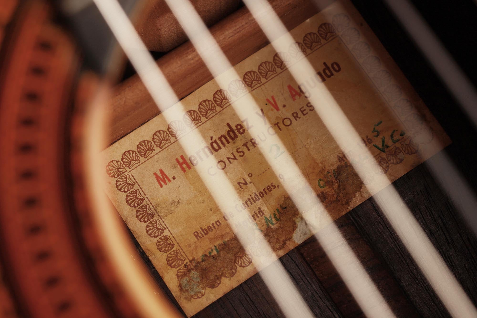 This beautiful guitar built in 1965 has an incredibly beautiful sound. It was built by the then workshop foreman under the supervision and according to the guidelines of Hernandez y Aguado, which is recognizable by the inscription "Construida por nuestro oficial" on the label. It is surprisingly light, and its responsiveness is outstanding. If one is looking for a guitar with a purely Spanish sound and an immediate sound production, this guitar is the right one. In addition, the setup is perfect and the playability for both right and left hands is at its best. This guitar has no cracks and is in very good condition. It has been re-varnished, and the bridge has been replaced, preserving the original decorative plate on the tying block. This instrument is equipped with Rodgers tuners and has a pure Spanish sound typical of the guitars from the workshop of the masters Hernandez y Aguado.