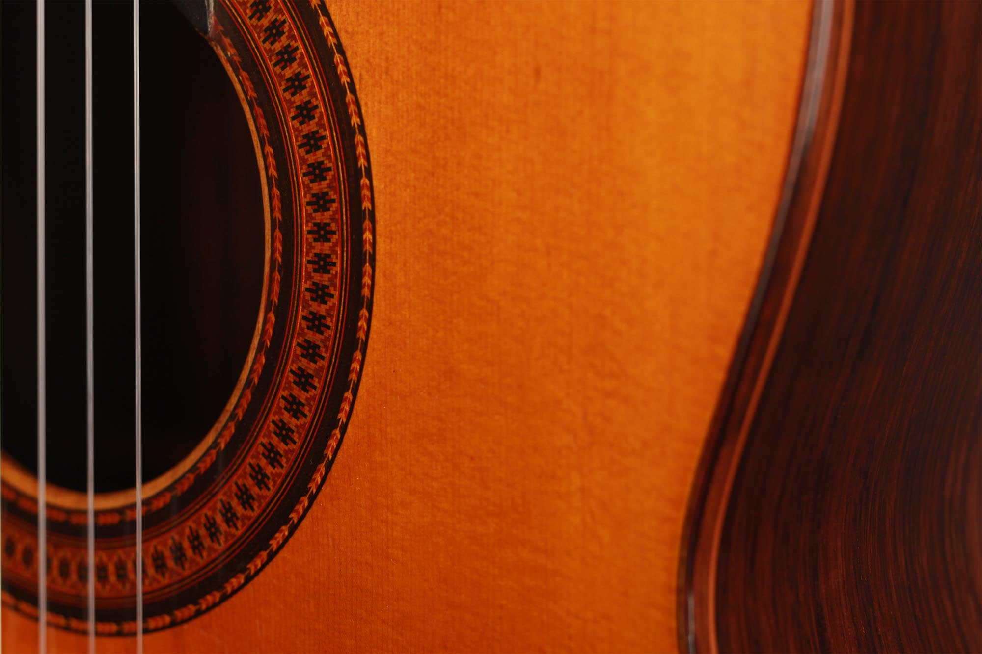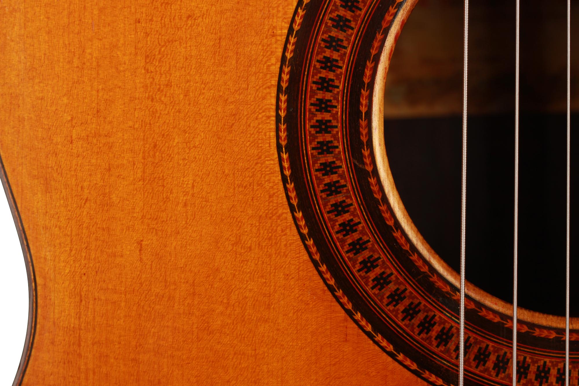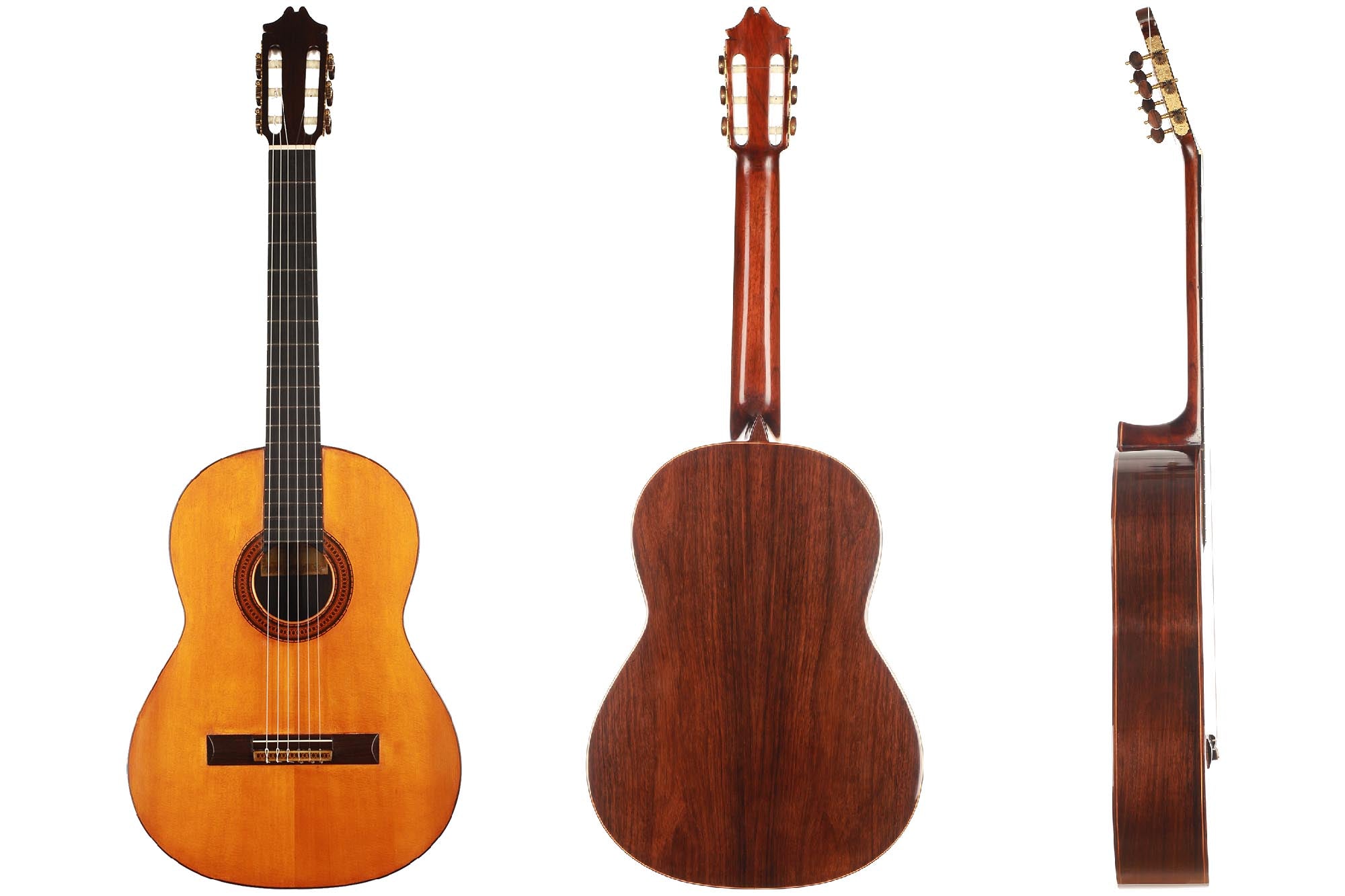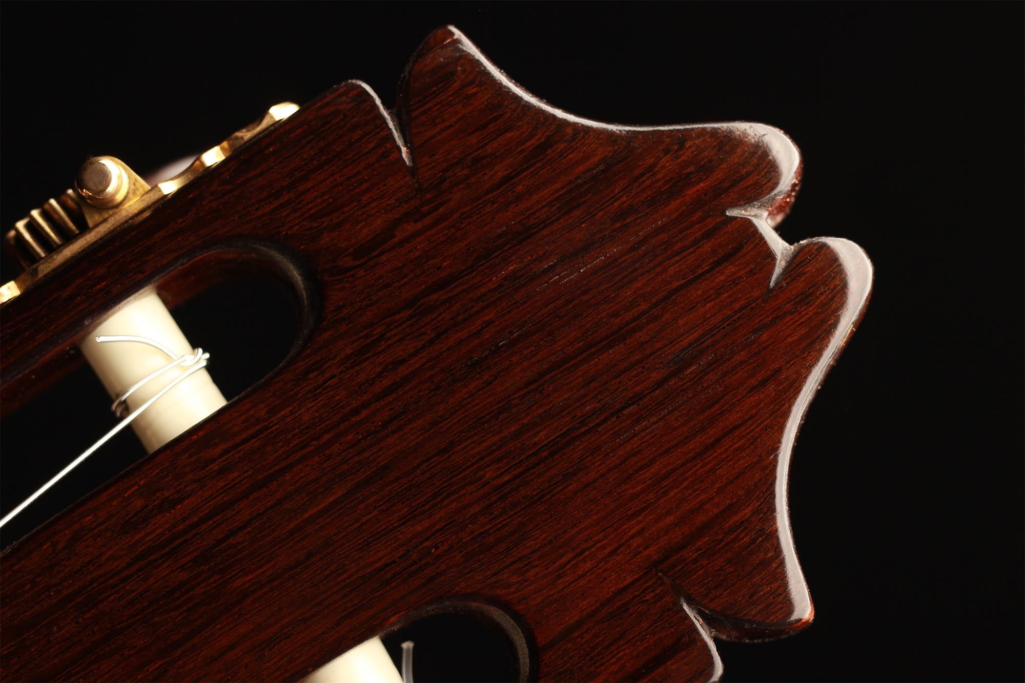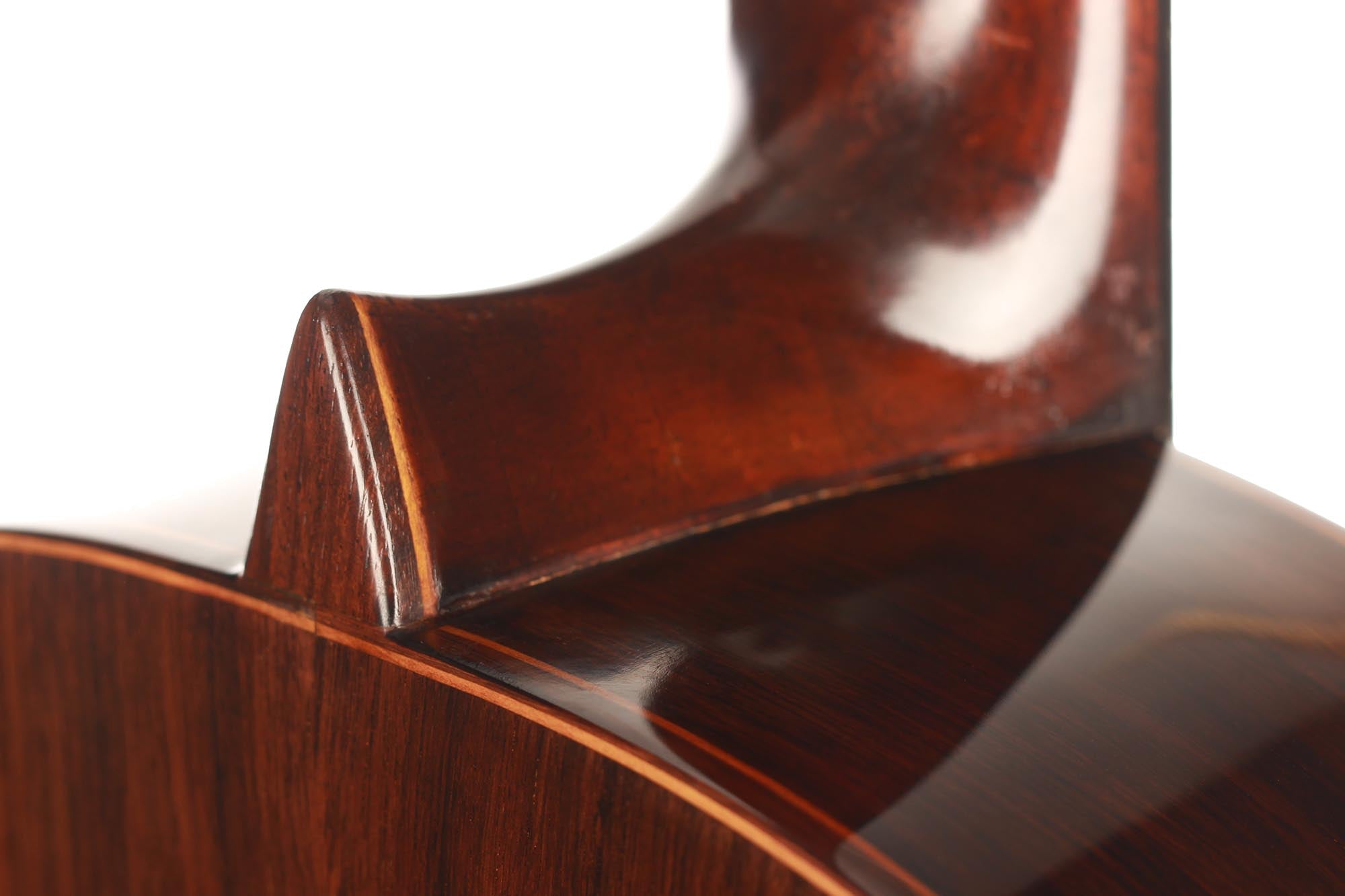This beautiful guitar built in 1965 has an incredibly beautiful sound. It was built by the then workshop foreman under the supervision and according to the guidelines of Hernandez y Aguado, which is recognizable by the inscription "Construida por nuestro oficial" on the label. It is surprisingly light, and its responsiveness is outstanding. If one is looking for a guitar with a purely Spanish sound and an immediate sound production, this guitar is the right one. In addition, the setup is perfect and the playability for both right and left hands is at its best. This guitar has no cracks and is in very good condition. It has been re-varnished, and the bridge has been replaced, preserving the original decorative plate on the tying block. This instrument is equipped with Rodgers tuners and has a pure Spanish sound typical of the guitars from the workshop of the masters Hernandez y Aguado.