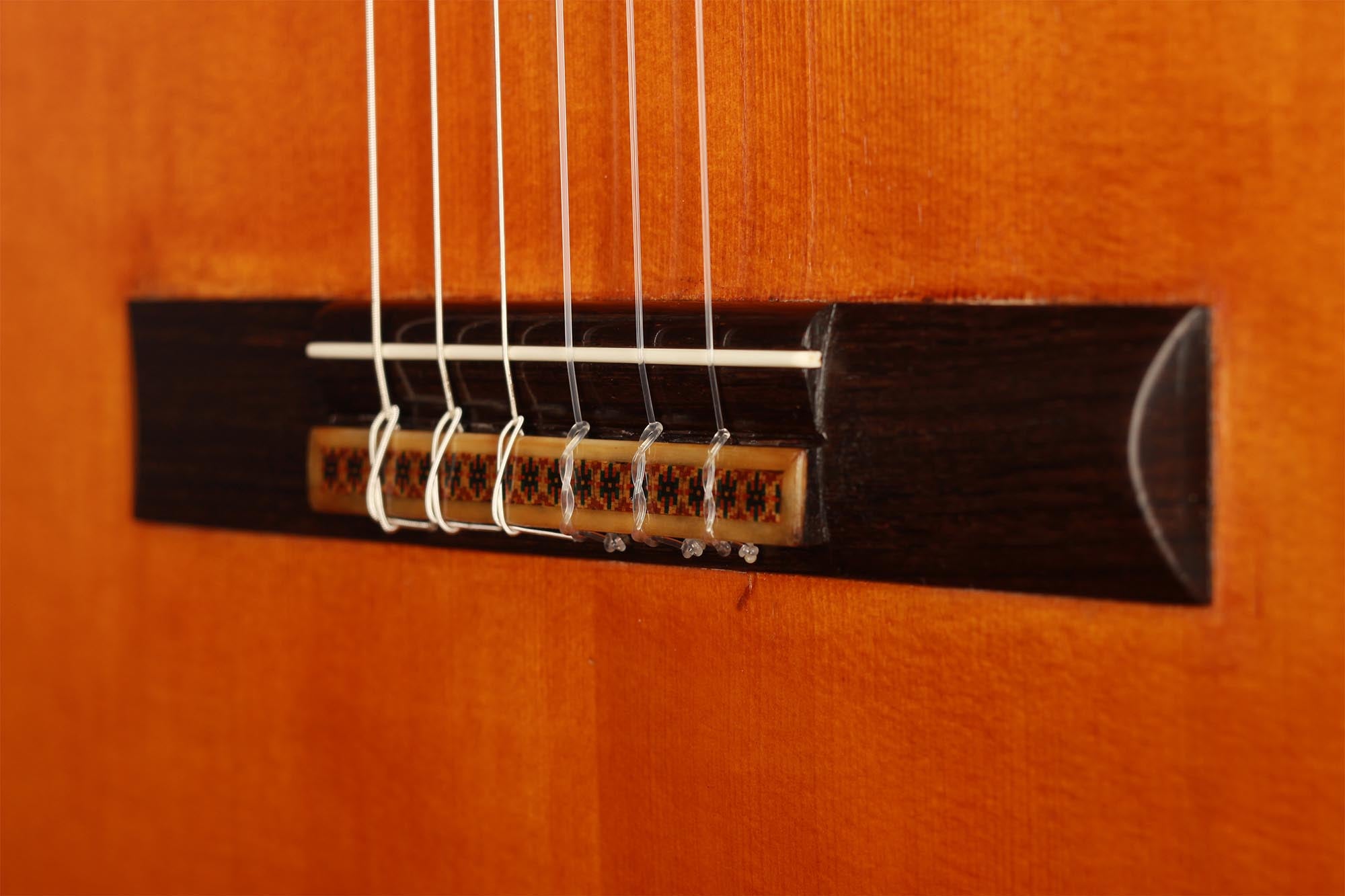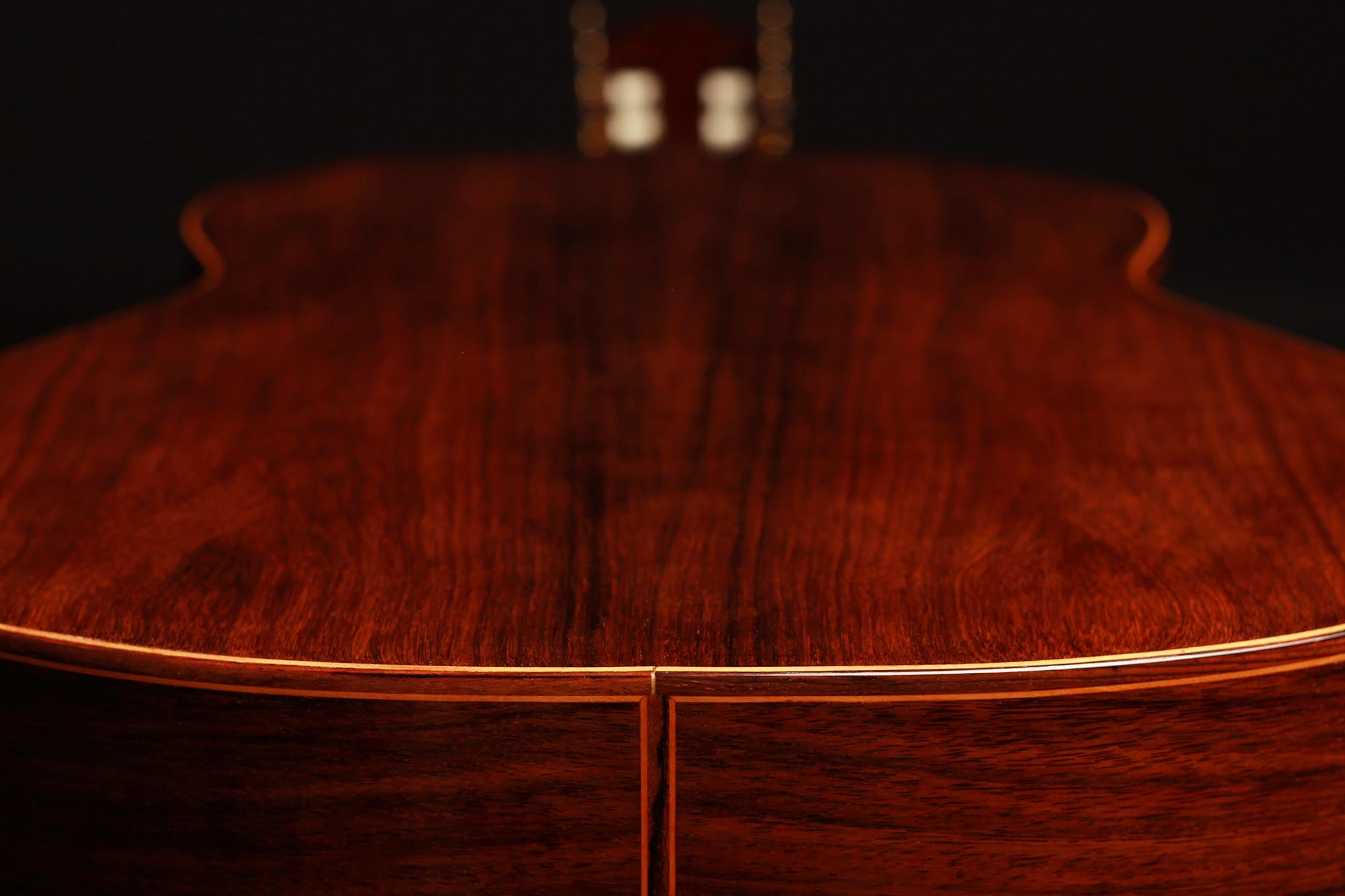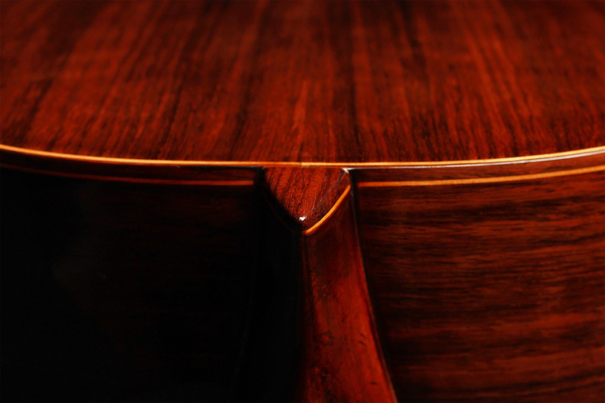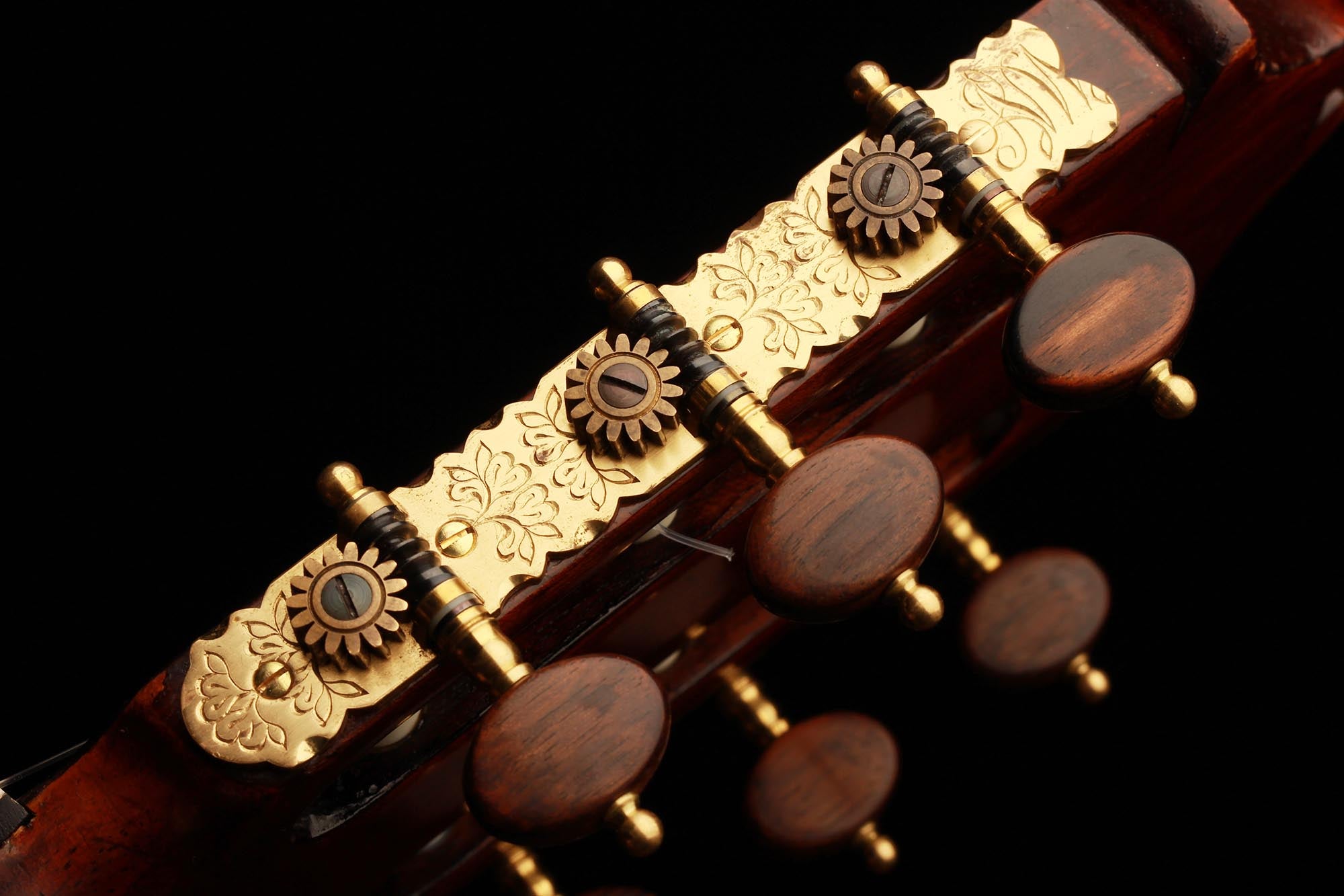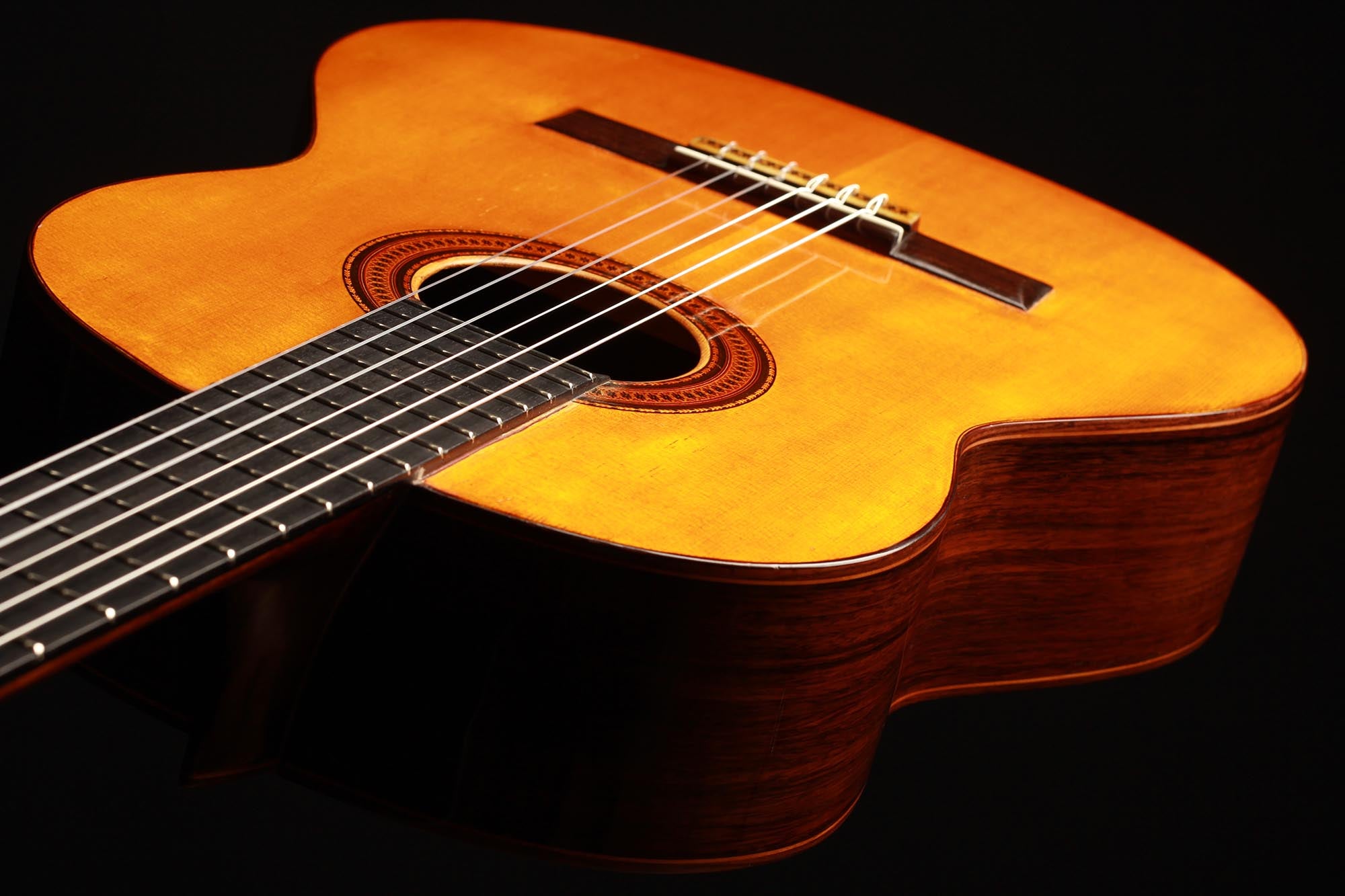 This beautiful guitar built in 1965 has an incredibly beautiful sound. It was built by the then workshop foreman under the supervision and according to the guidelines of Hernandez y Aguado, which is recognizable by the inscription "Construida por nuestro oficial" on the label. It is surprisingly light, and its responsiveness is outstanding. If one is looking for a guitar with a purely Spanish sound and an immediate sound production, this guitar is the right one. In addition, the setup is perfect and the playability for both right and left hands is at its best. This guitar has no cracks and is in very good condition. It has been re-varnished, and the bridge has been replaced, preserving the original decorative plate on the tying block. This instrument is equipped with Rodgers tuners and has a pure Spanish sound typical of the guitars from the workshop of the masters Hernandez y Aguado.