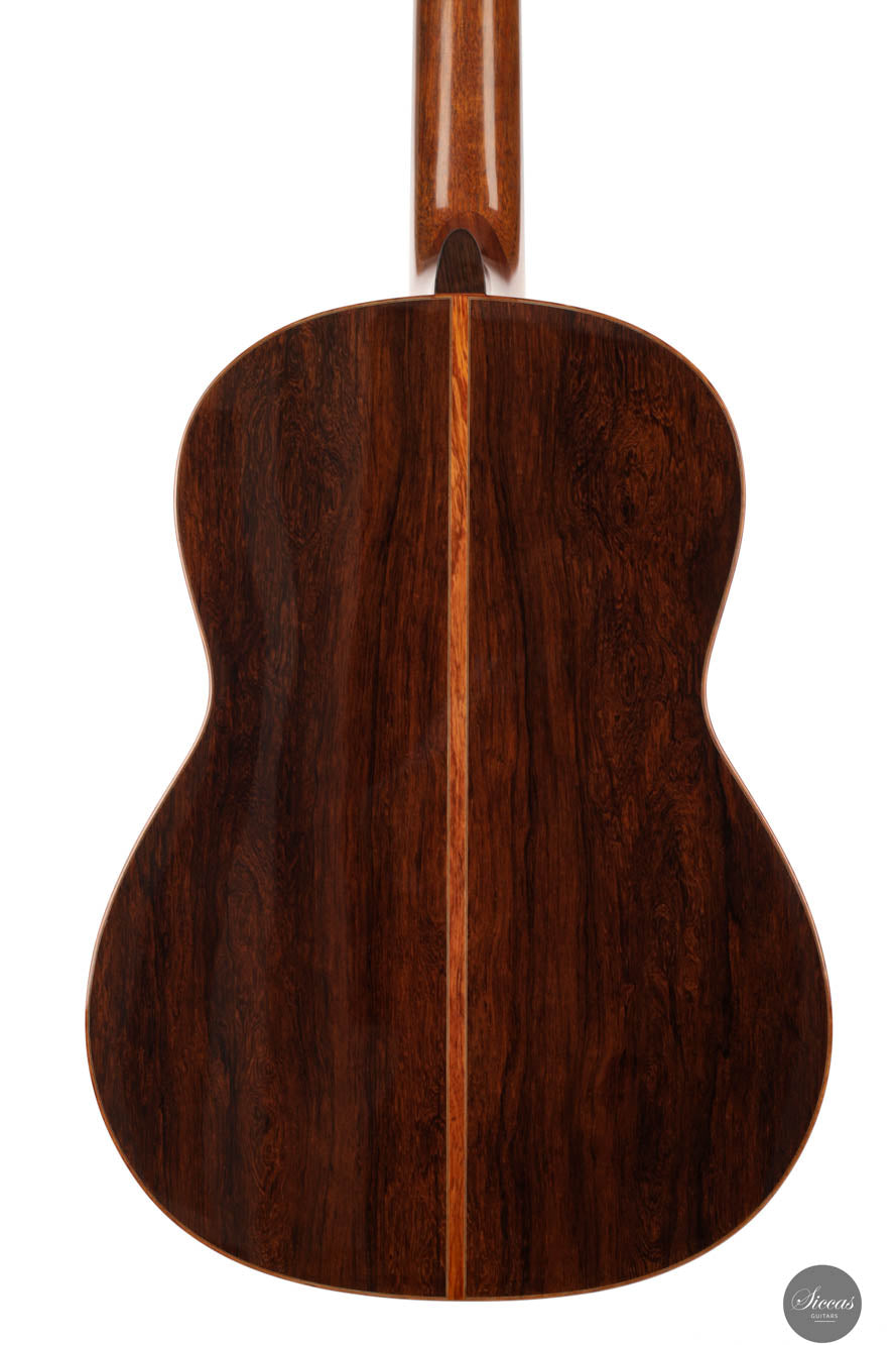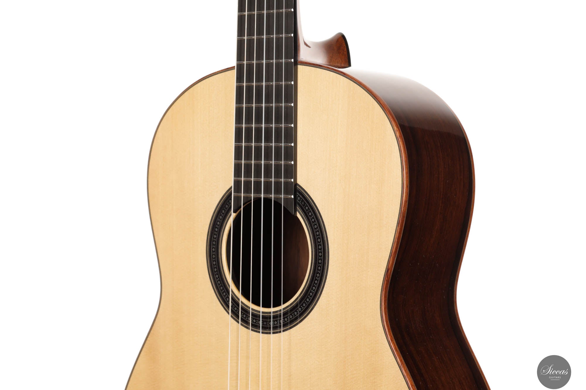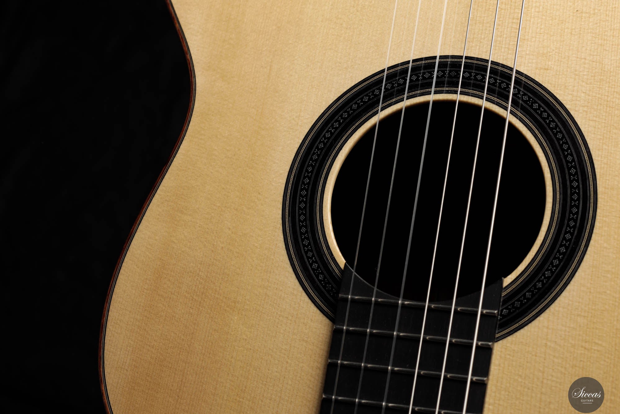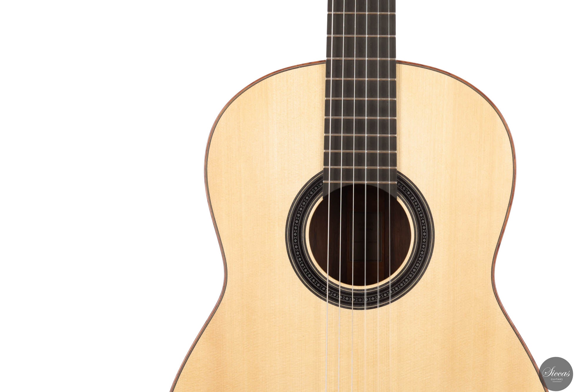 Diese brandneue Gitarre, gefertigt von Hugues Boivin, verkörpert die akribische Liebe zum Detail und die künstlerische Ausdruckskraft, die seine Arbeit auszeichnet. Hugues, bekannt für seine Präzision und seinen Perfektionismus, hat eine Gitarre geschaffen, die nicht nur geschmackvolle Verzierungen aufweist, sondern auch eine präzise Handwerkskunst. Sie ist traditionell mit 7 Fächerbeleistungen und einem Querbalken hinter dem Steg konstruiert. Die Rosette ist sorgfältig ausgewählt, um die Farbe der Fichtendecke zu ergänzen, was die ästhetische Anziehungskraft erhöht. Die Verwendung von auffälligem Madagaskar-Rosenholz steigert weiterhin den Luxus und Wert der Gitarre. Akustisch ist die Gitarre ausgewogen, mit den klaren, gleichmäßigen Höhen, die für französische Gitarren typisch sind, und liefert einen eleganten Klang, den Musiker zu schätzen wissen.