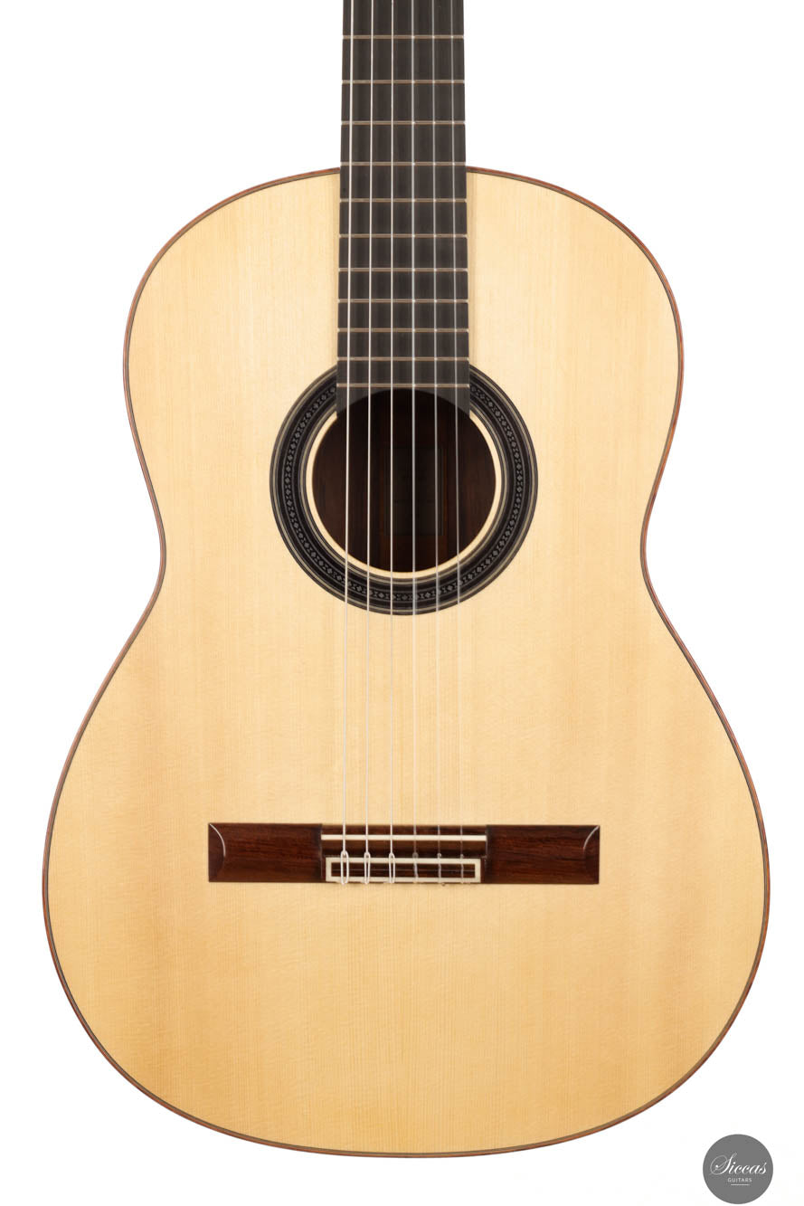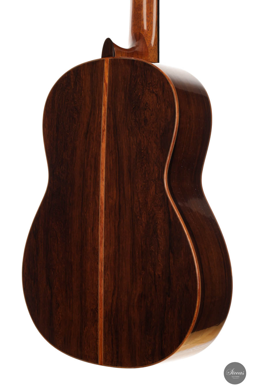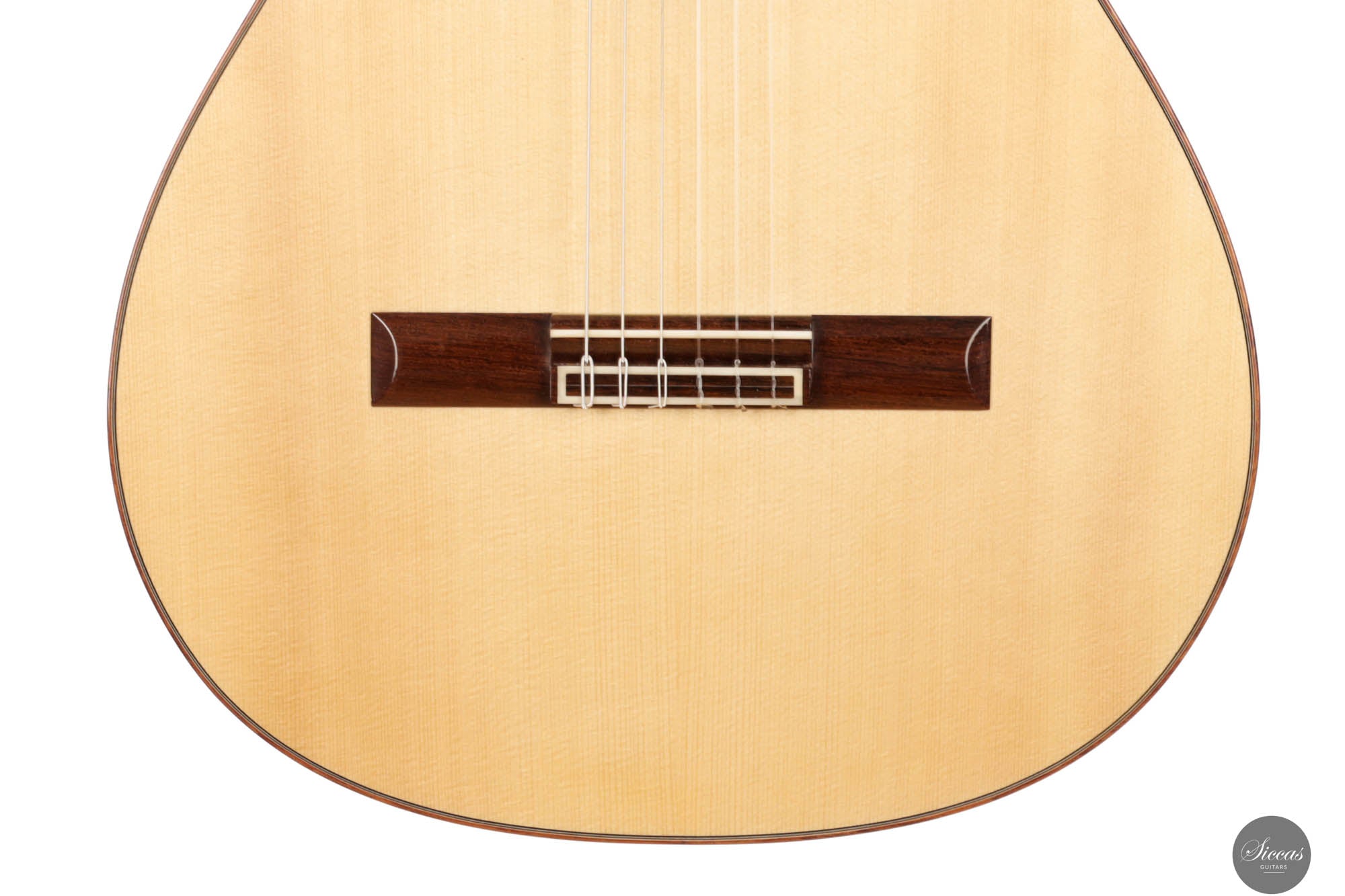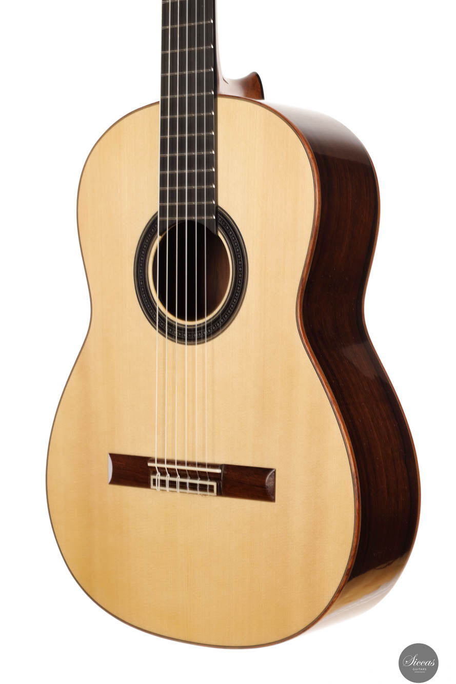 Diese brandneue Gitarre, gefertigt von Hugues Boivin, verkörpert die akribische Liebe zum Detail und die künstlerische Ausdruckskraft, die seine Arbeit auszeichnet. Hugues, bekannt für seine Präzision und seinen Perfektionismus, hat eine Gitarre geschaffen, die nicht nur geschmackvolle Verzierungen aufweist, sondern auch eine präzise Handwerkskunst. Sie ist traditionell mit 7 Fächerbeleistungen und einem Querbalken hinter dem Steg konstruiert. Die Rosette ist sorgfältig ausgewählt, um die Farbe der Fichtendecke zu ergänzen, was die ästhetische Anziehungskraft erhöht. Die Verwendung von auffälligem Madagaskar-Rosenholz steigert weiterhin den Luxus und Wert der Gitarre. Akustisch ist die Gitarre ausgewogen, mit den klaren, gleichmäßigen Höhen, die für französische Gitarren typisch sind, und liefert einen eleganten Klang, den Musiker zu schätzen wissen.