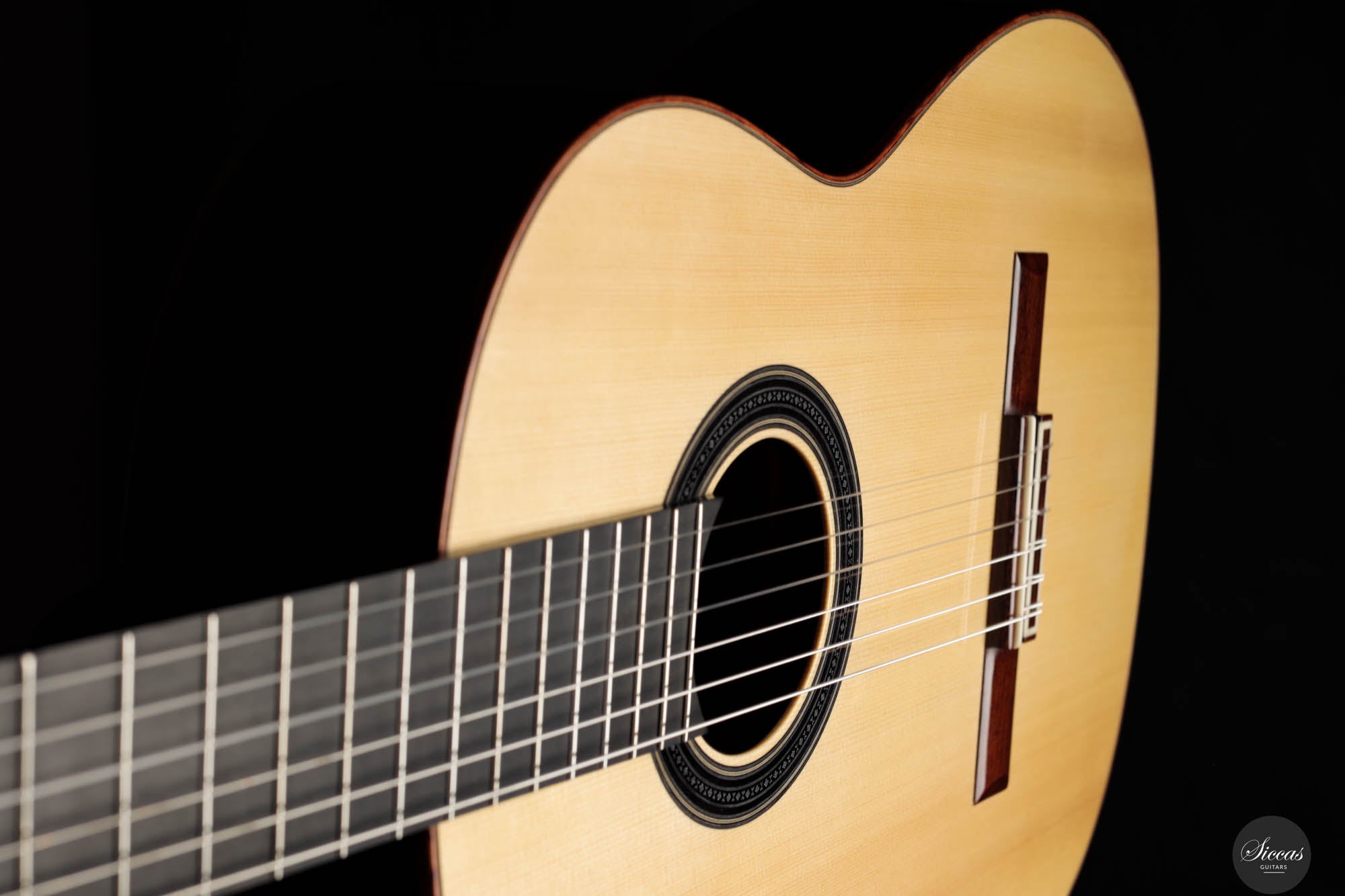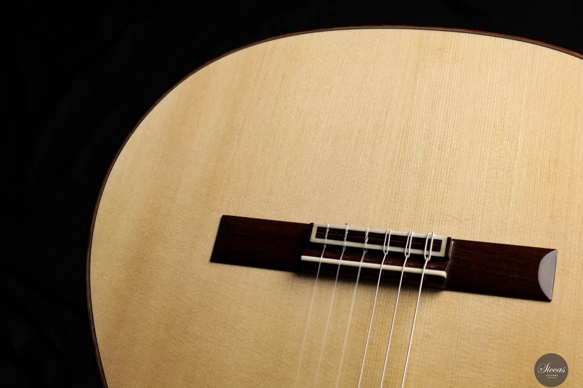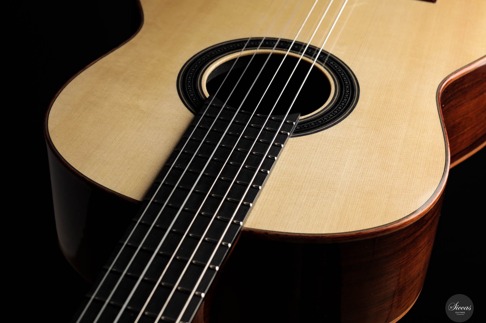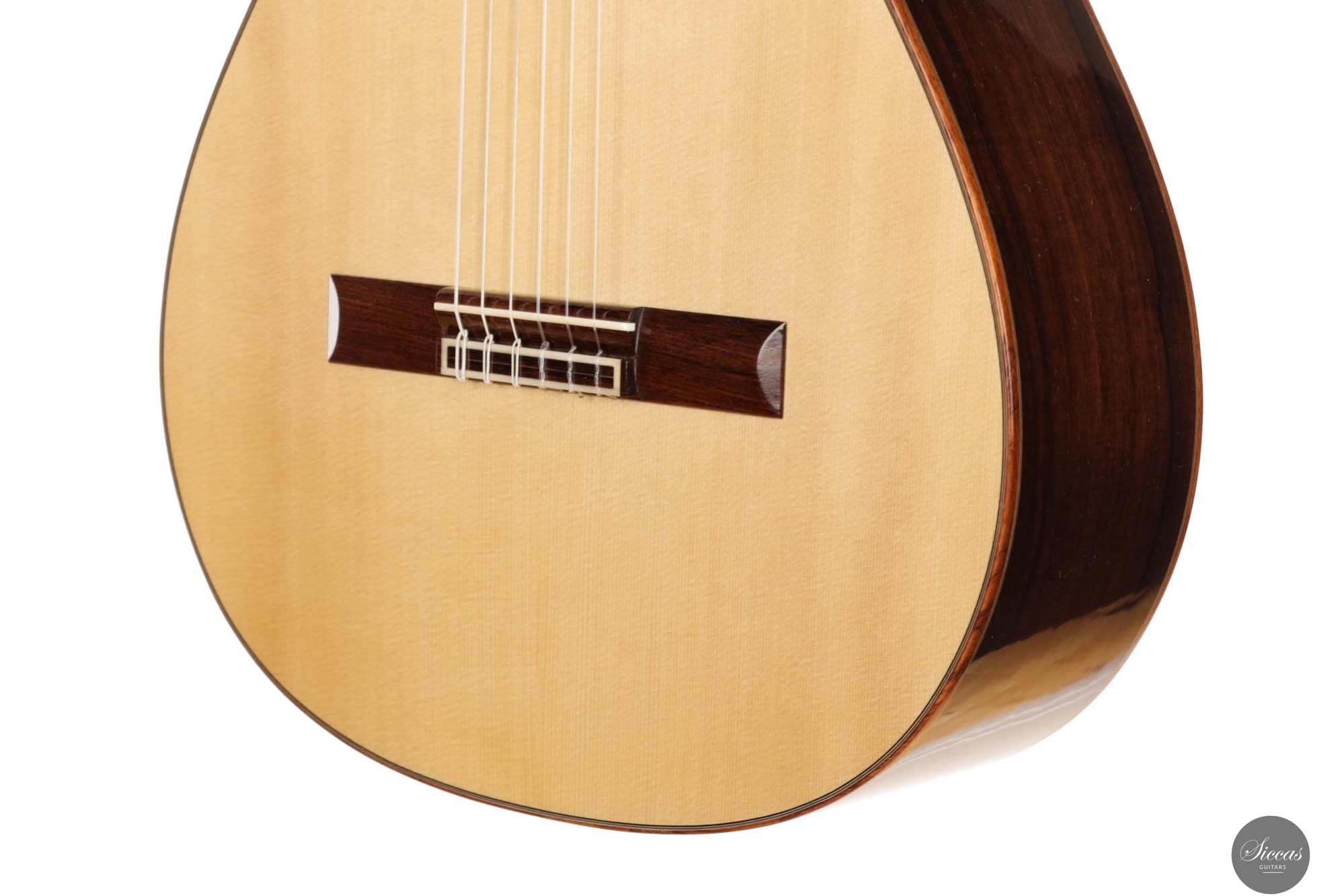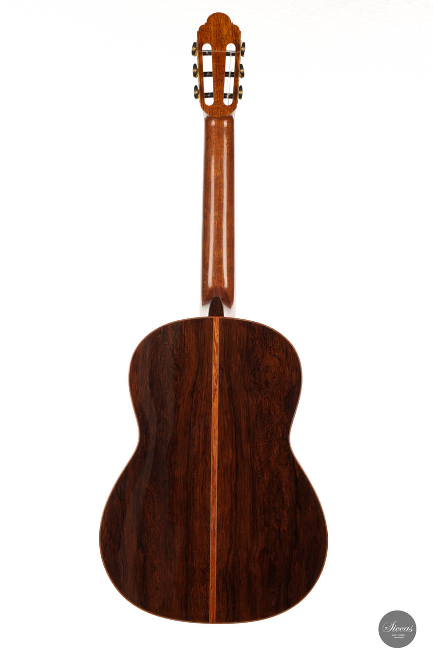 Diese brandneue Gitarre, gefertigt von Hugues Boivin, verkörpert die akribische Liebe zum Detail und die künstlerische Ausdruckskraft, die seine Arbeit auszeichnet. Hugues, bekannt für seine Präzision und seinen Perfektionismus, hat eine Gitarre geschaffen, die nicht nur geschmackvolle Verzierungen aufweist, sondern auch eine präzise Handwerkskunst. Sie ist traditionell mit 7 Fächerbeleistungen und einem Querbalken hinter dem Steg konstruiert. Die Rosette ist sorgfältig ausgewählt, um die Farbe der Fichtendecke zu ergänzen, was die ästhetische Anziehungskraft erhöht. Die Verwendung von auffälligem Madagaskar-Rosenholz steigert weiterhin den Luxus und Wert der Gitarre. Akustisch ist die Gitarre ausgewogen, mit den klaren, gleichmäßigen Höhen, die für französische Gitarren typisch sind, und liefert einen eleganten Klang, den Musiker zu schätzen wissen.