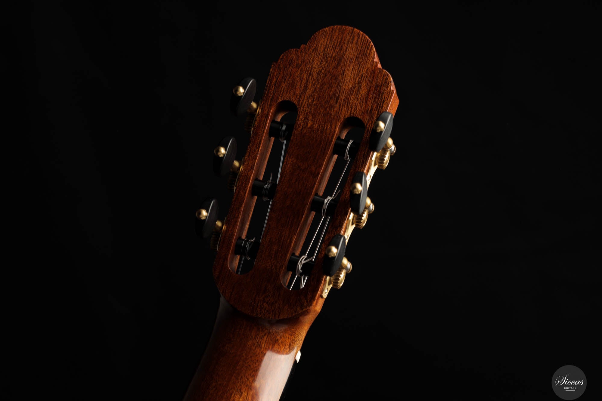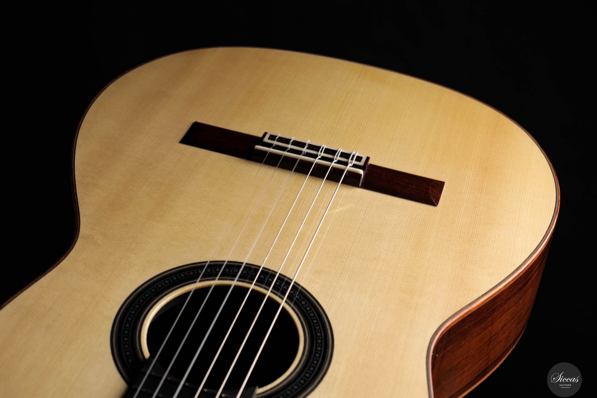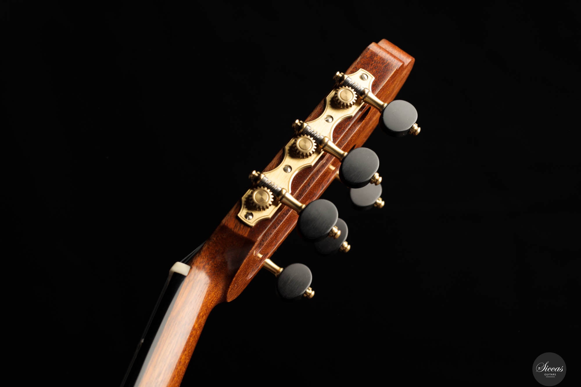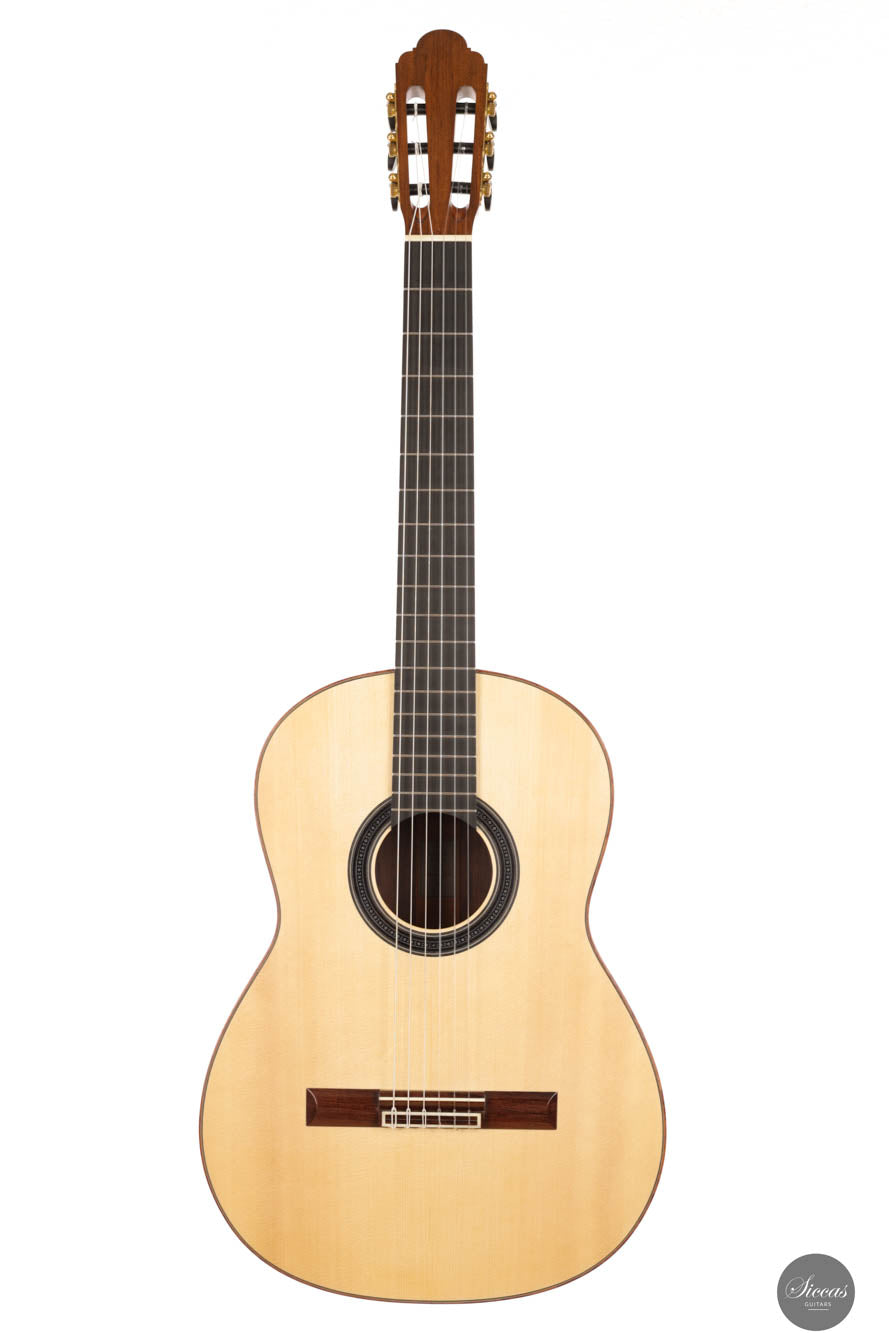 Diese brandneue Gitarre, gefertigt von Hugues Boivin, verkörpert die akribische Liebe zum Detail und die künstlerische Ausdruckskraft, die seine Arbeit auszeichnet. Hugues, bekannt für seine Präzision und seinen Perfektionismus, hat eine Gitarre geschaffen, die nicht nur geschmackvolle Verzierungen aufweist, sondern auch eine präzise Handwerkskunst. Sie ist traditionell mit 7 Fächerbeleistungen und einem Querbalken hinter dem Steg konstruiert. Die Rosette ist sorgfältig ausgewählt, um die Farbe der Fichtendecke zu ergänzen, was die ästhetische Anziehungskraft erhöht. Die Verwendung von auffälligem Madagaskar-Rosenholz steigert weiterhin den Luxus und Wert der Gitarre. Akustisch ist die Gitarre ausgewogen, mit den klaren, gleichmäßigen Höhen, die für französische Gitarren typisch sind, und liefert einen eleganten Klang, den Musiker zu schätzen wissen.